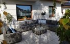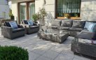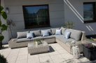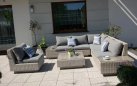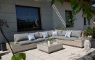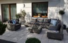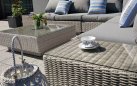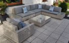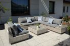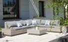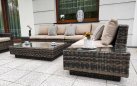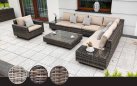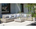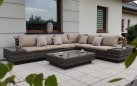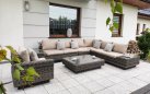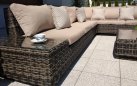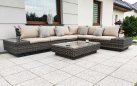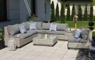 Meble ogrodowe z technorattanu: duży komplet wypoczynkowy z narożnikiem i stolikiem kawowym.