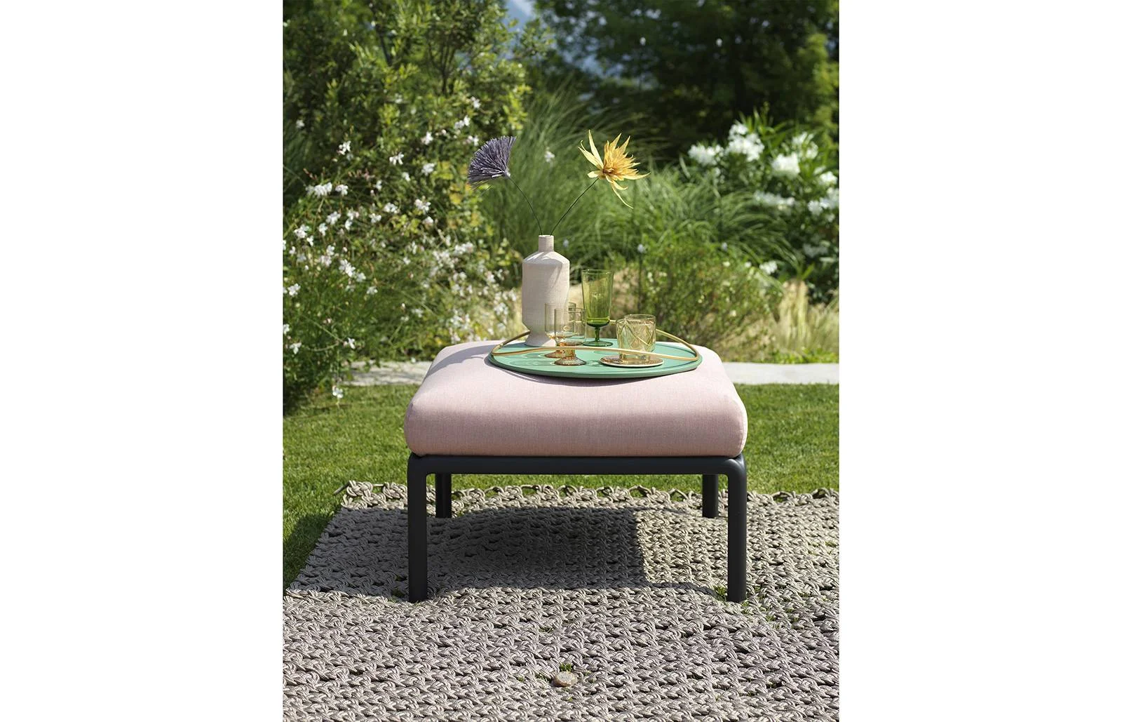Konstrukcja wykonana jest z polipropylenu wzmacnianego włóknem szklanym, odpornego na wilgoć, promieniowanie UV i zmiany temperatury. Pufa wyposażona jest w wygodną poduszkę outdoor dostępną w wersji Olefin lub Sunbrella. Pokrowce są zdejmowane, co ułatwia czyszczenie i pielęgnację.