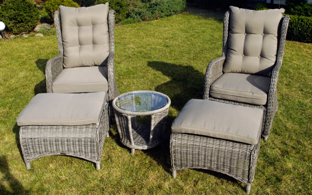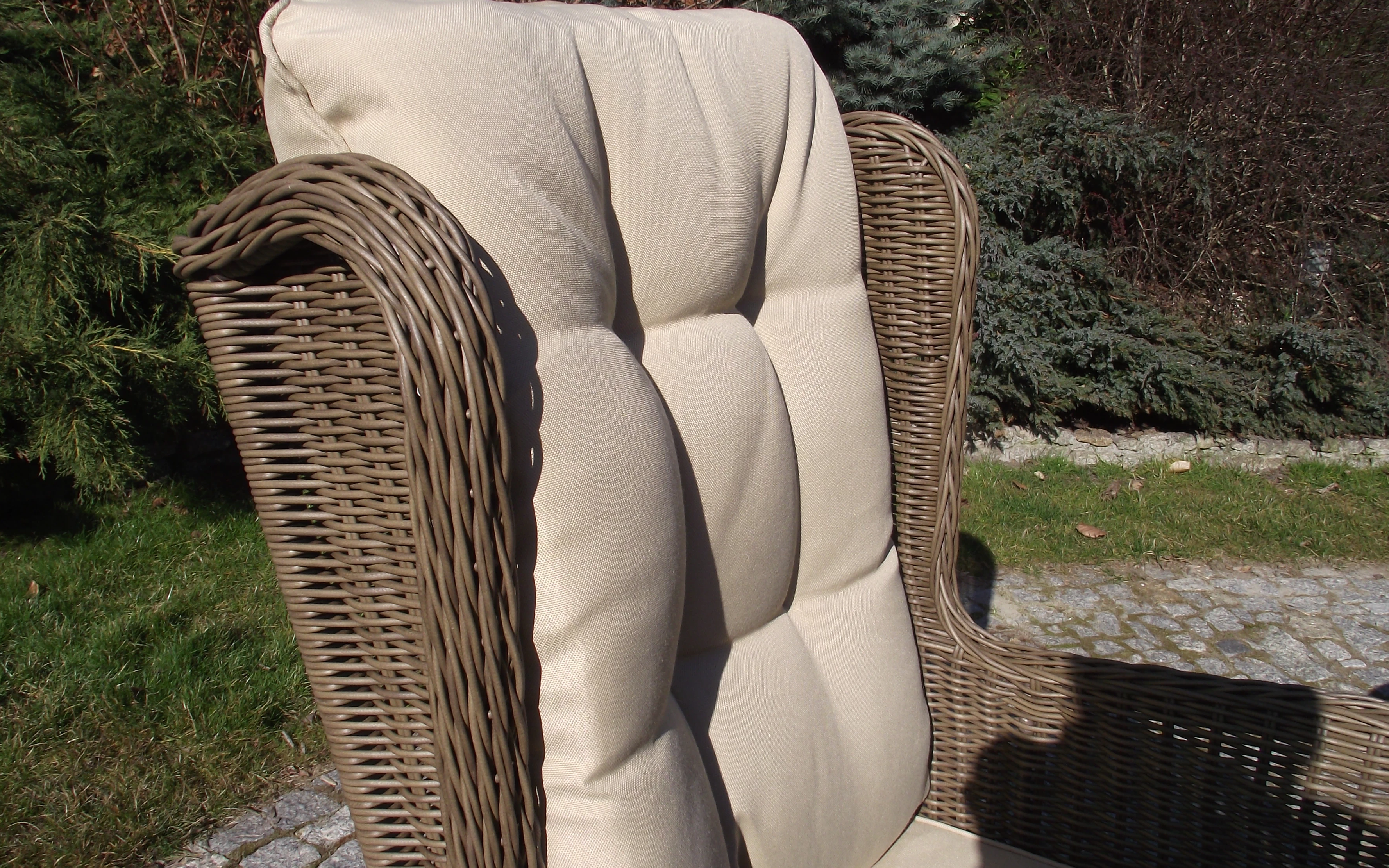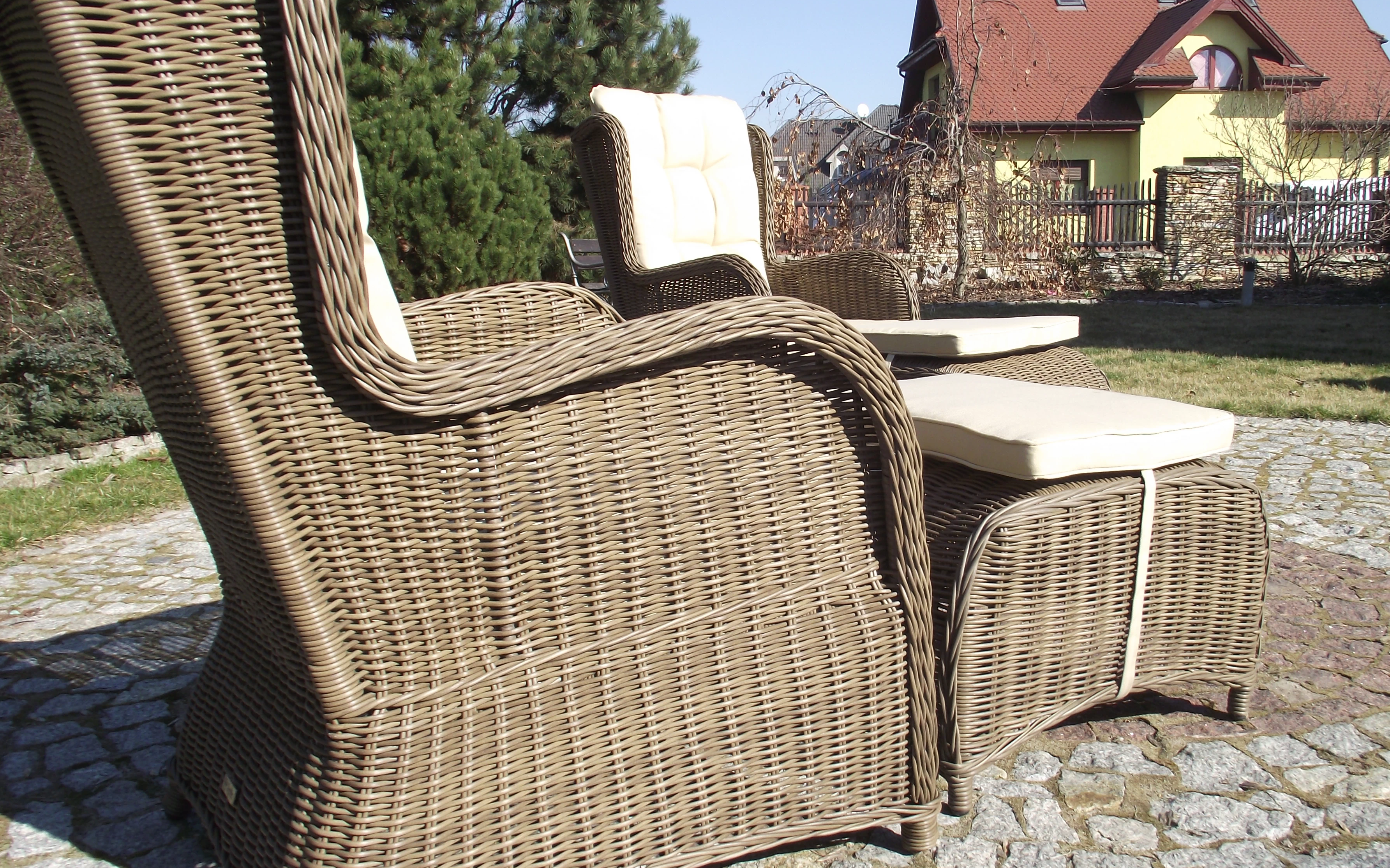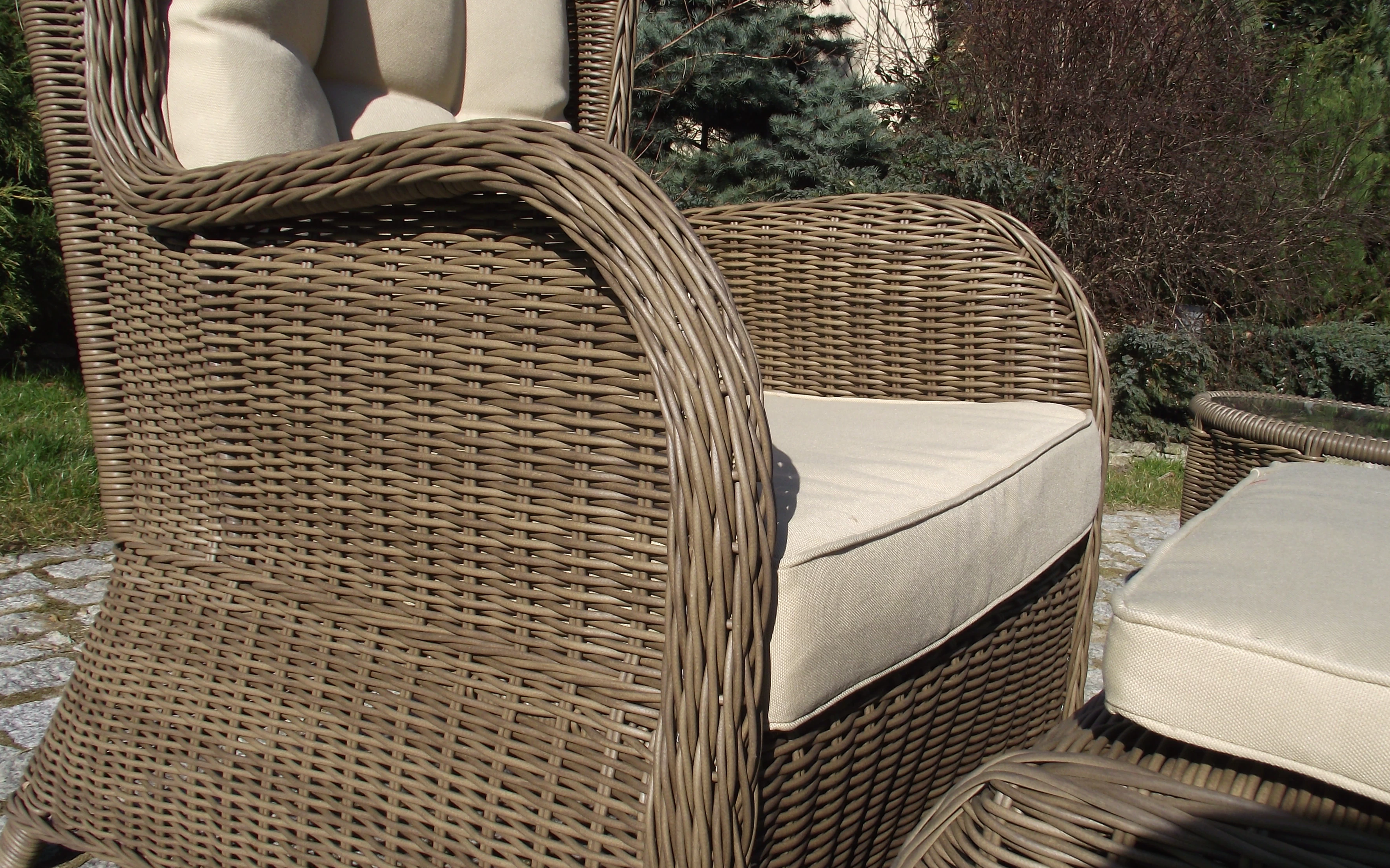 Klasyczne fotele ogrodowe z wysokimi oparciami, tzw. uszaki z grubymi i wygodnymi poduszkami wykonane z technorattanu. Wygodę zapewniają grube przytulne poduszki.