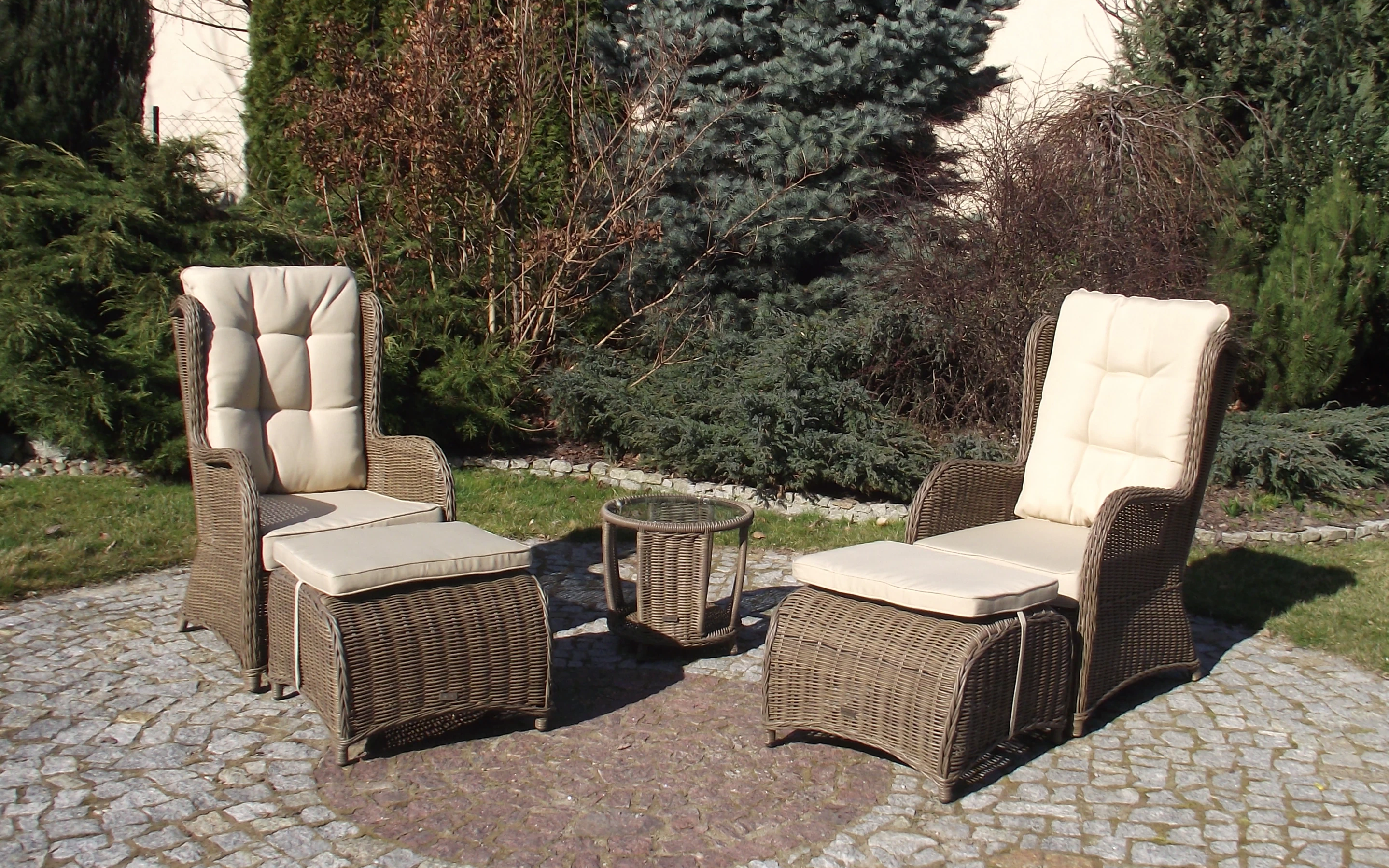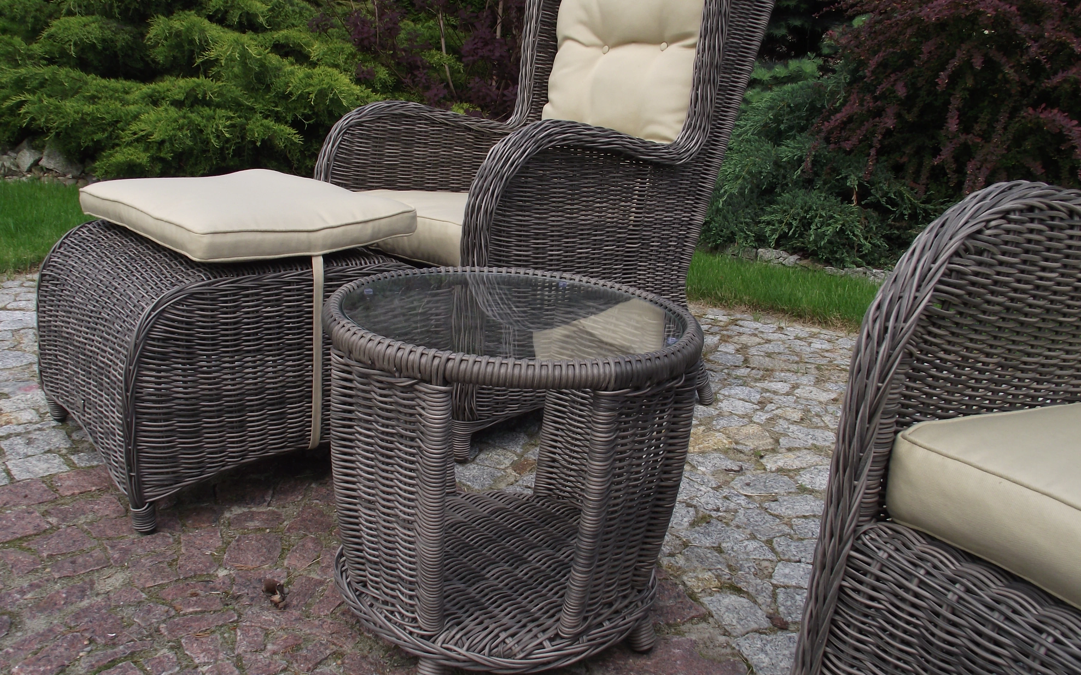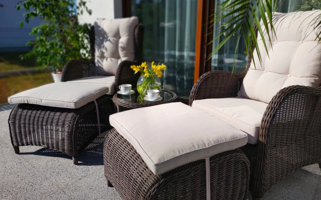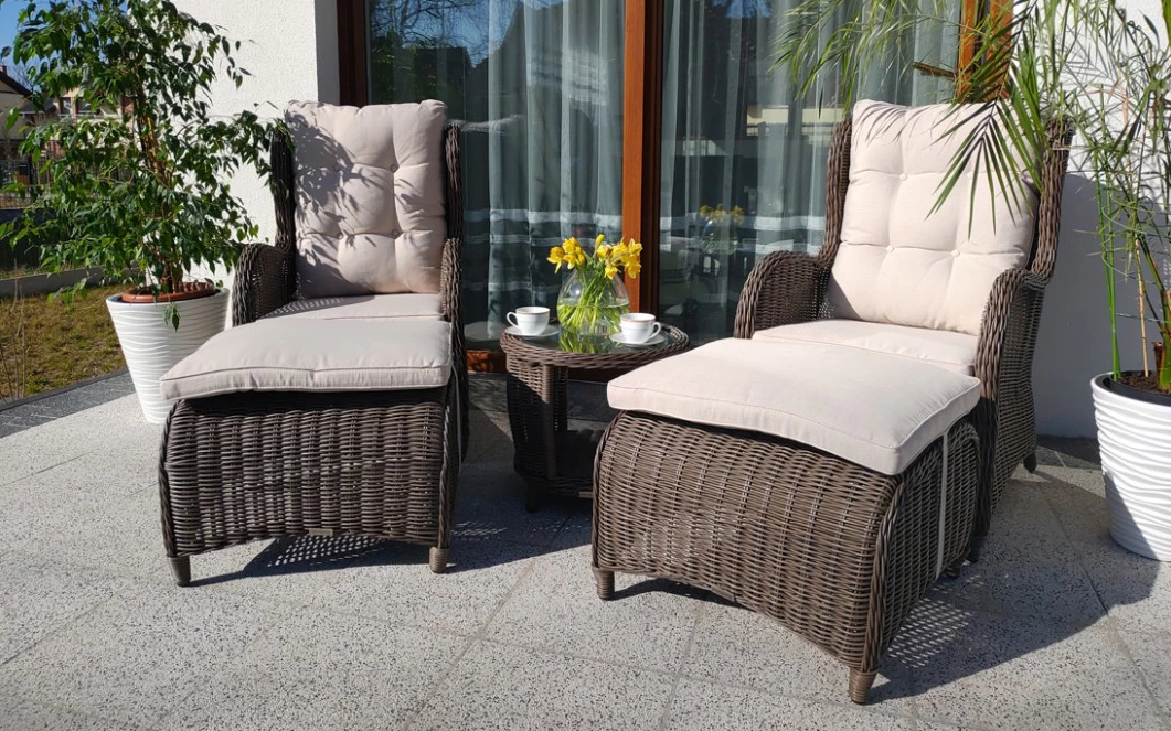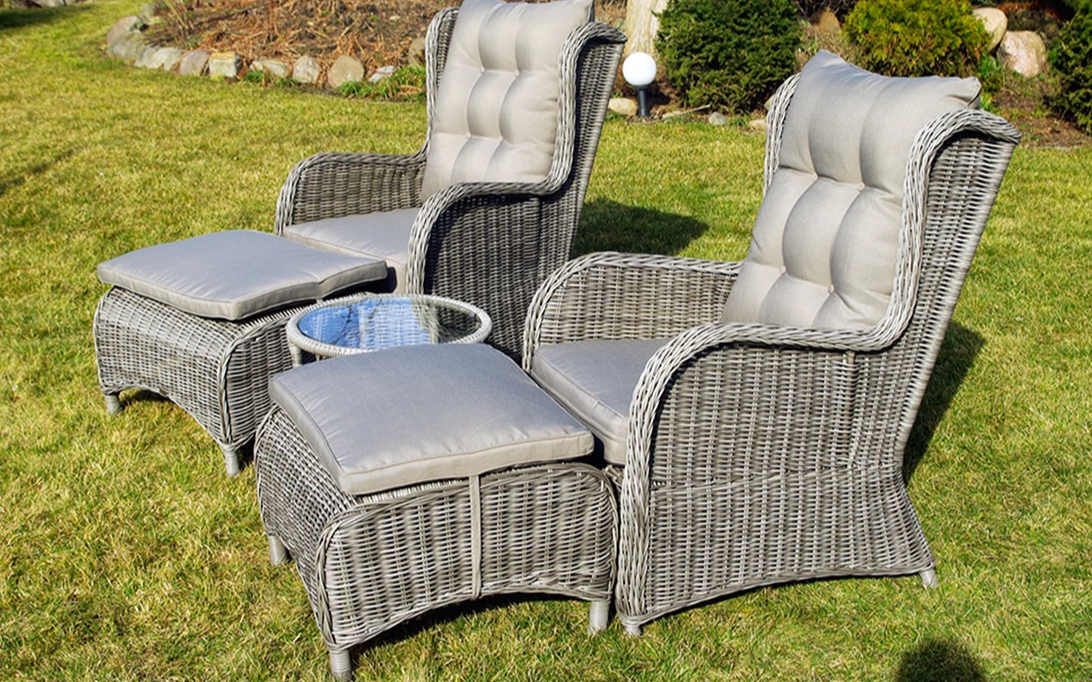 Klasyczne fotele ogrodowe z wysokimi oparciami, tzw. uszaki z grubymi i wygodnymi poduszkami wykonane z technorattanu. Wygodę zapewniają grube przytulne poduszki.