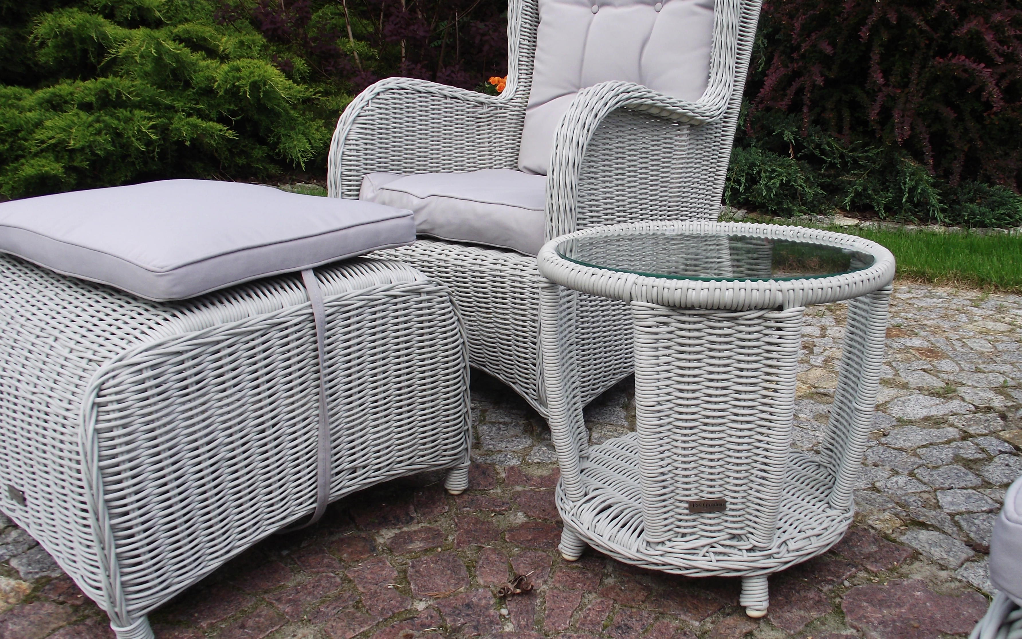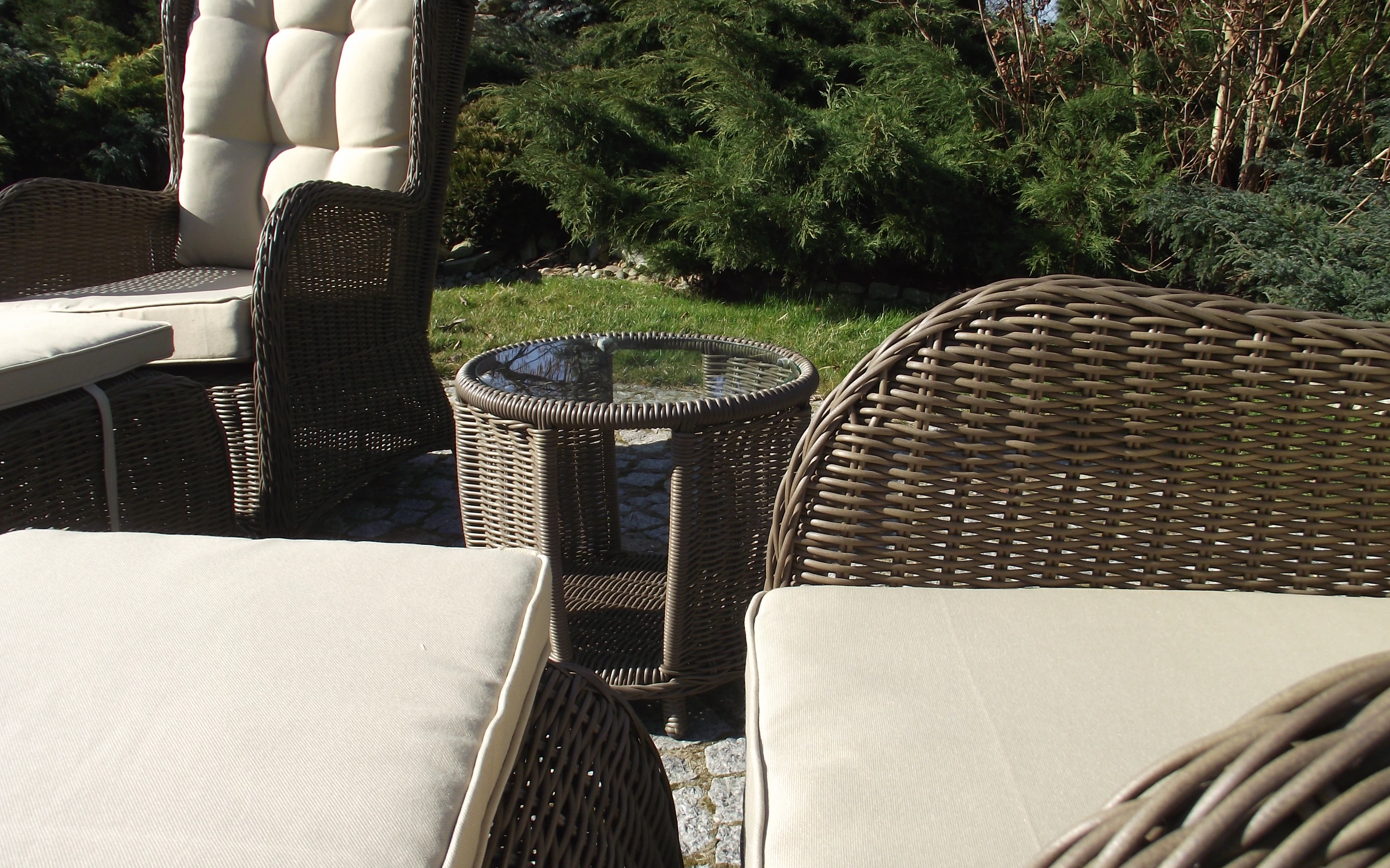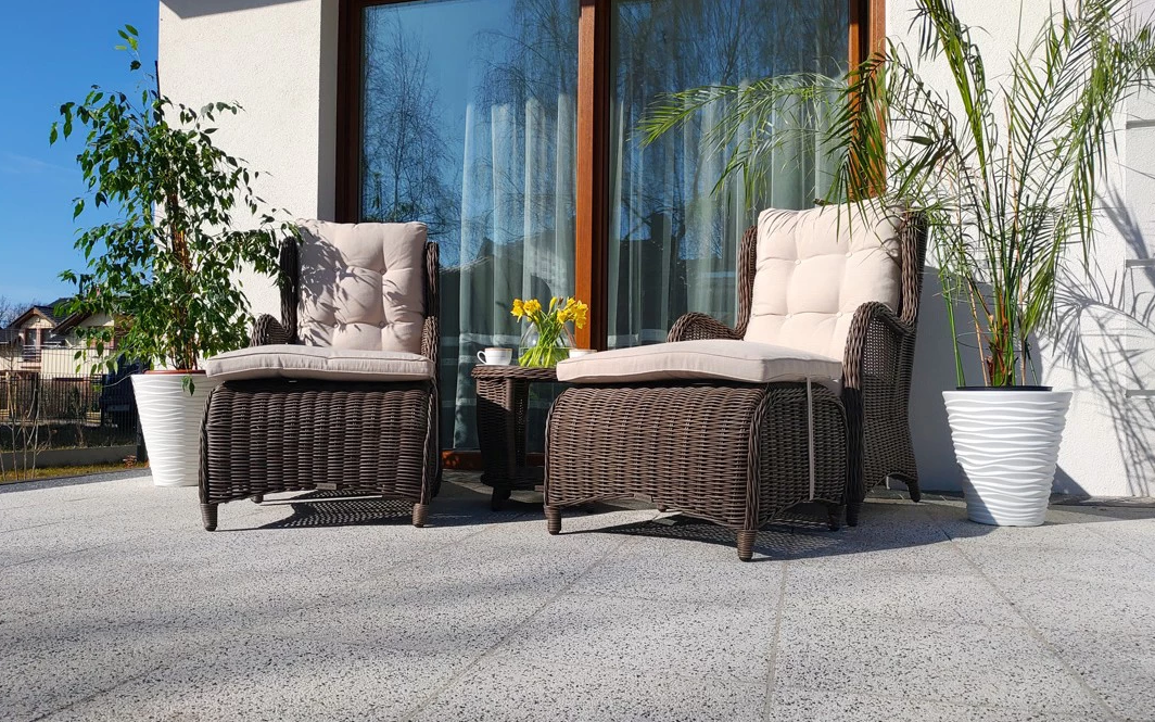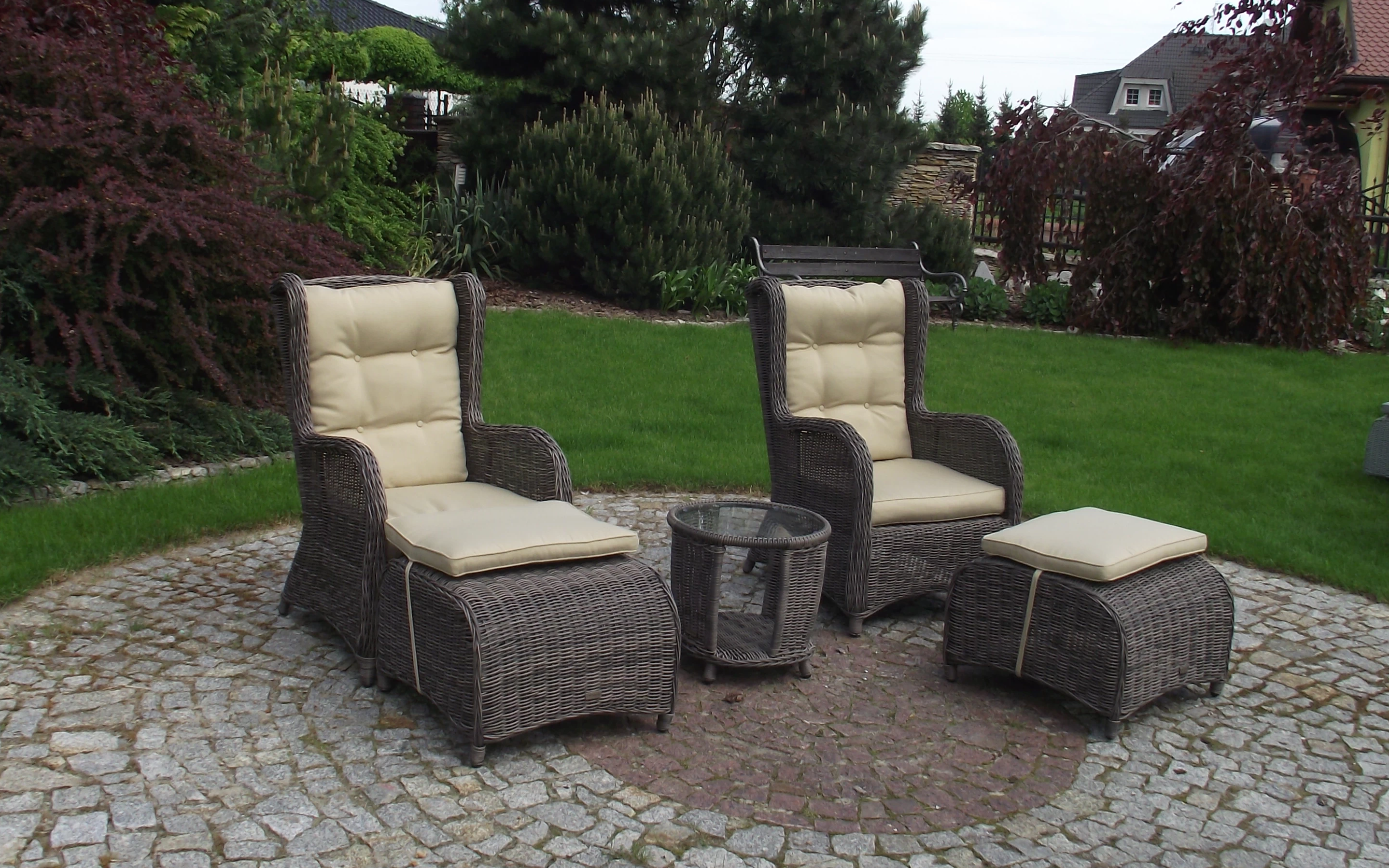 Klasyczne fotele ogrodowe z wysokimi oparciami, tzw. uszaki z grubymi i wygodnymi poduszkami wykonane z technorattanu. Wygodę zapewniają grube przytulne poduszki.