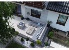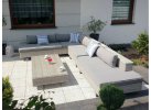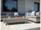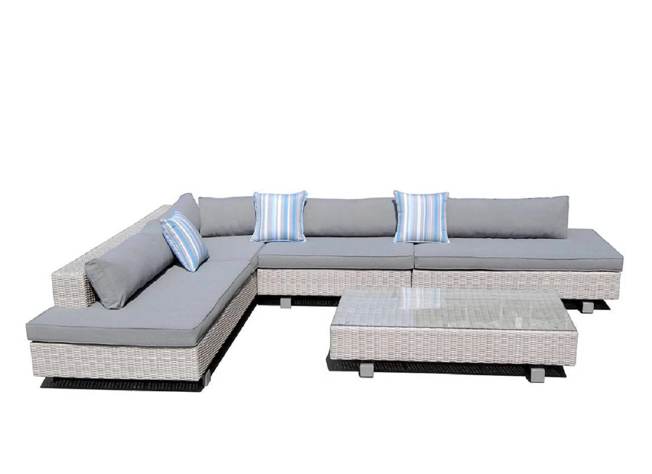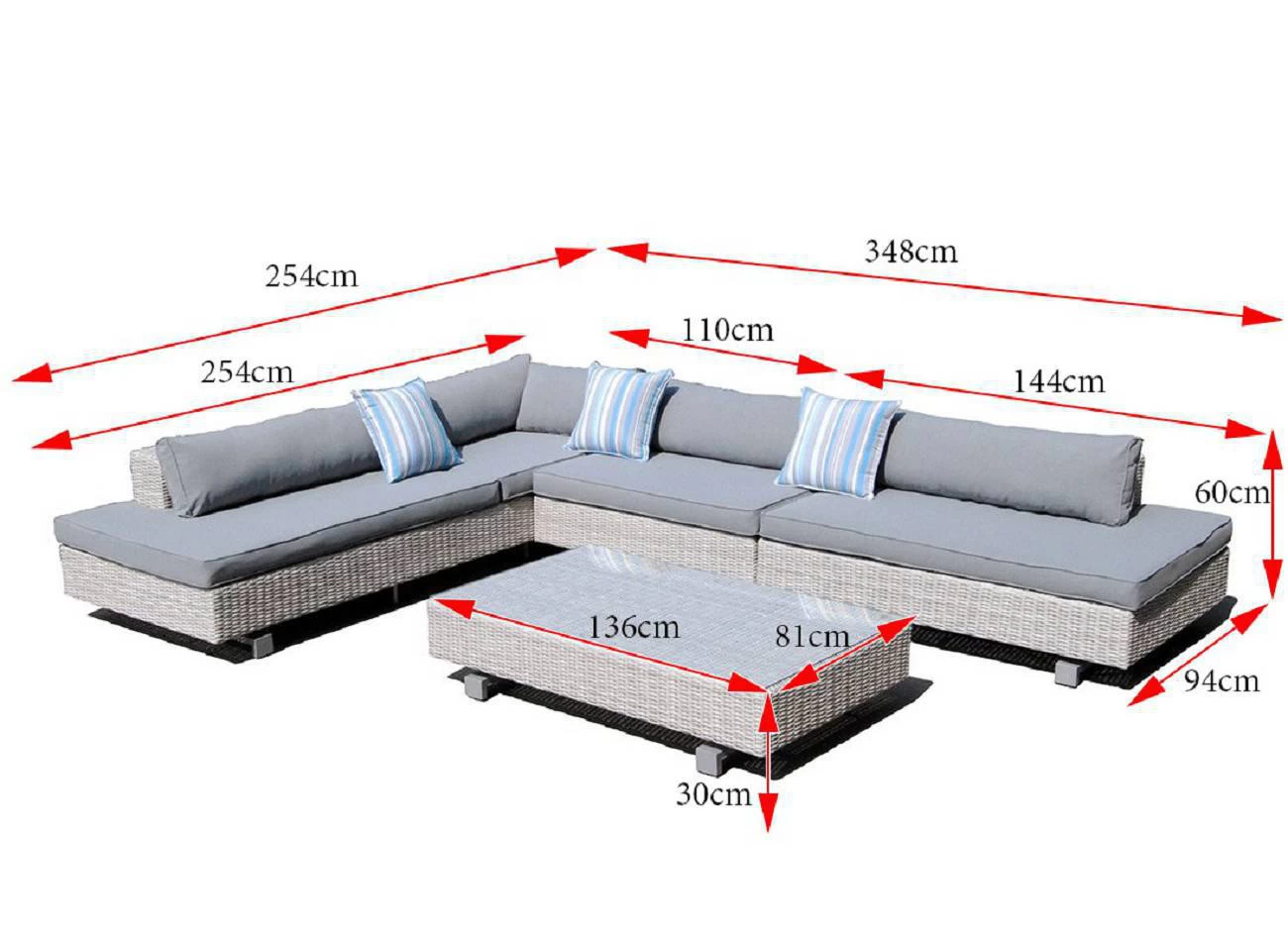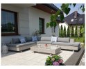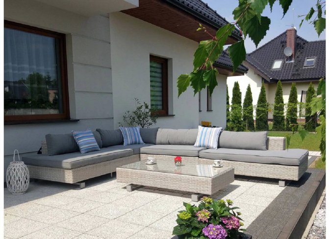 W komplecie znajduje się duży narożnik ogrodowy, złożony z 3 elementów, który pomieści 7-8 osób, oraz prostokątny stolik kawowy z hartowanym blatem szklanym, a także poduszki na siedziska i oparci oraz aluminiowe podstawy do każdego elementu, do samodzielnego przykręcenia.