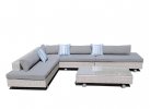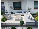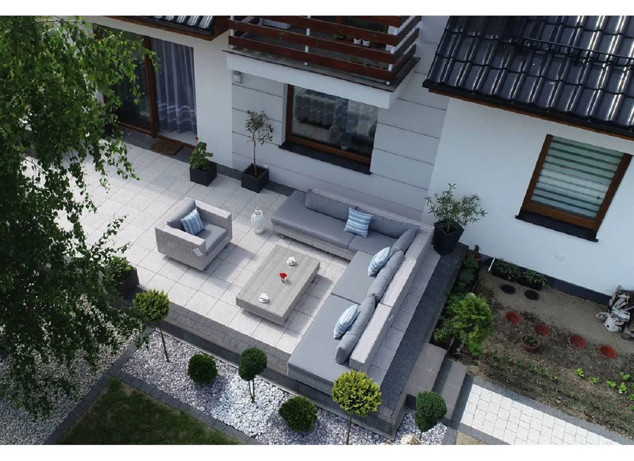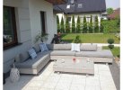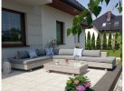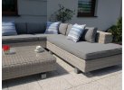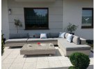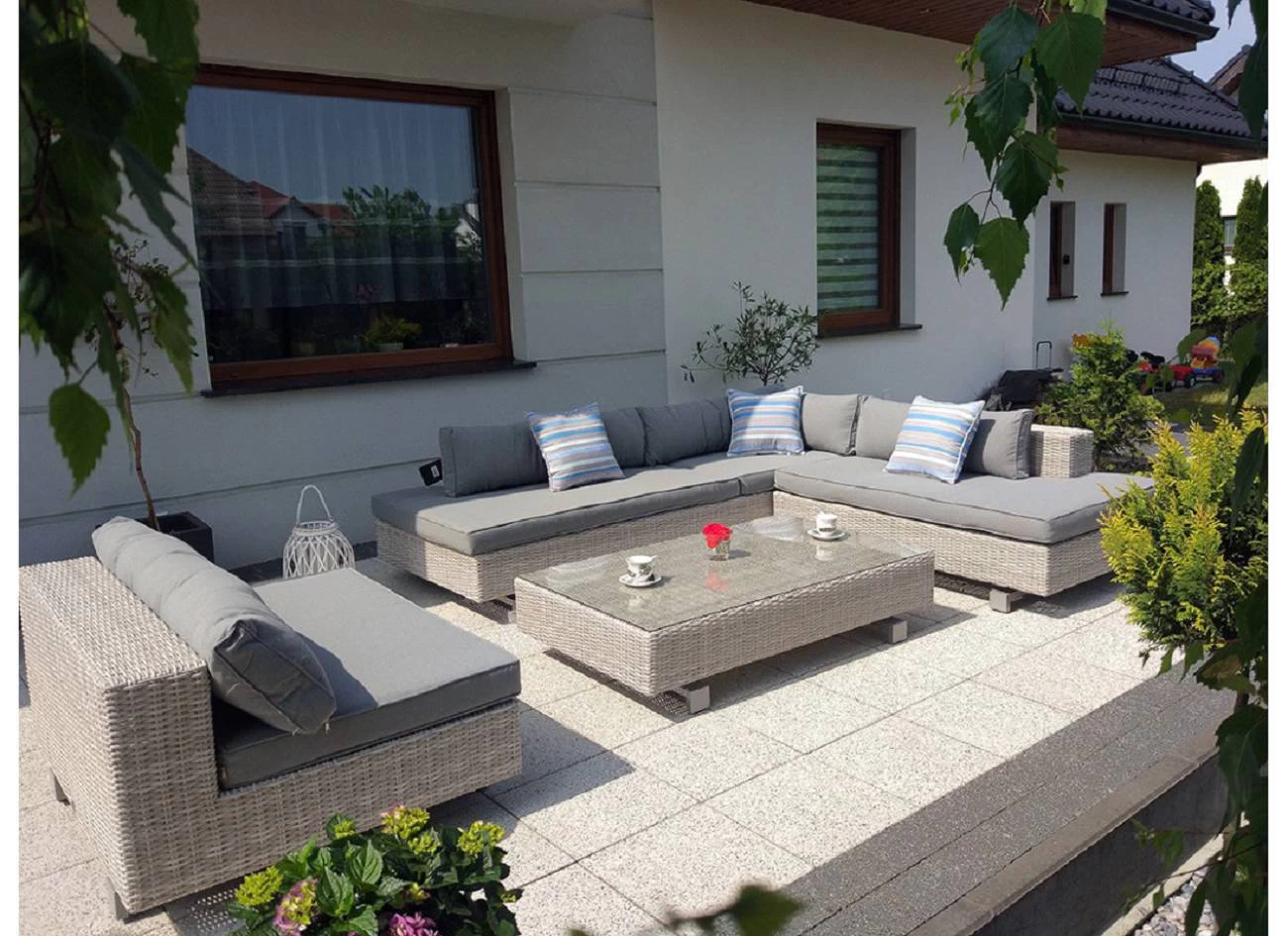 Meble ogrodowe z technorattanu: duży komplet wypoczynkowy z narożnikiem i stolikiem kawowym.