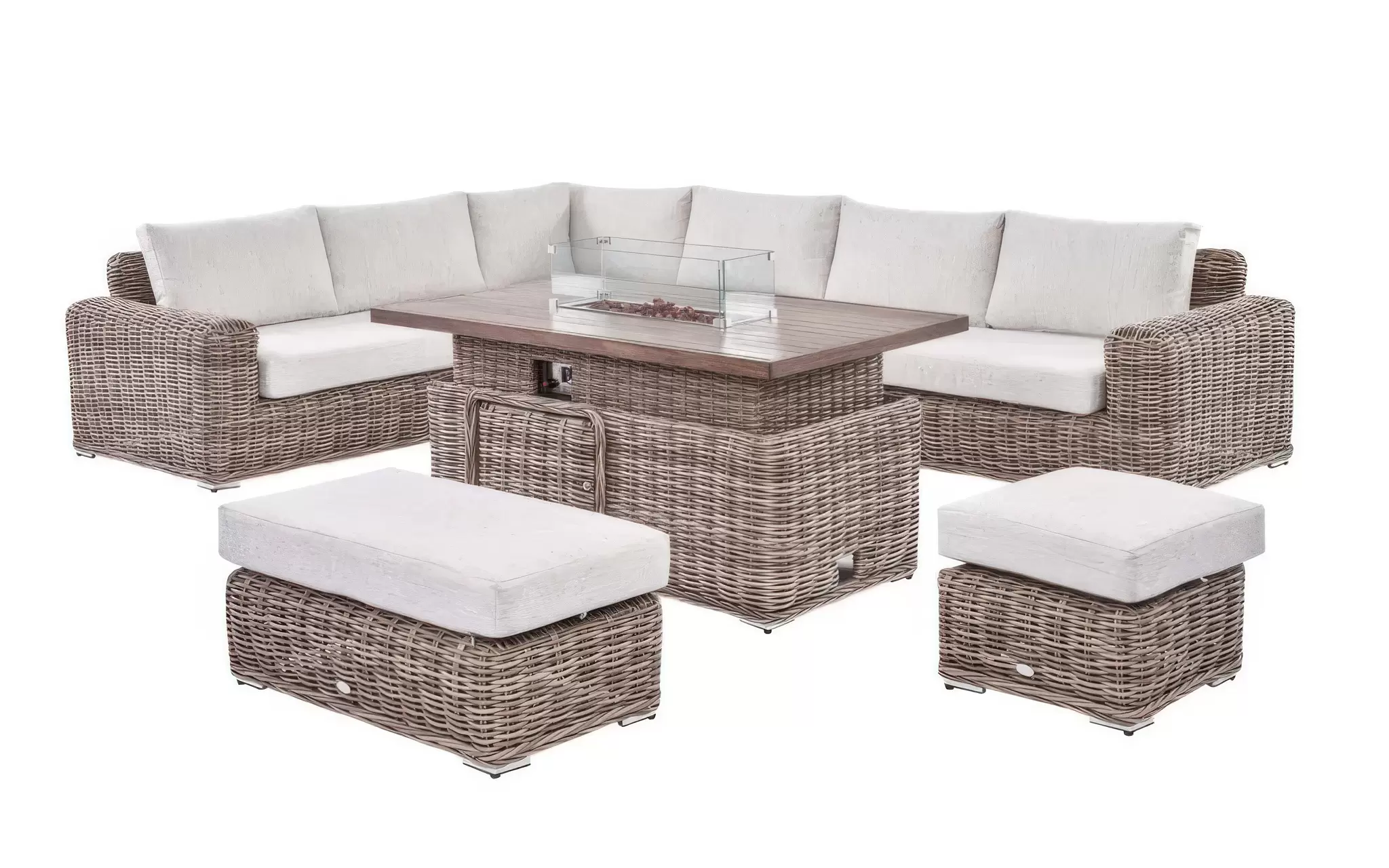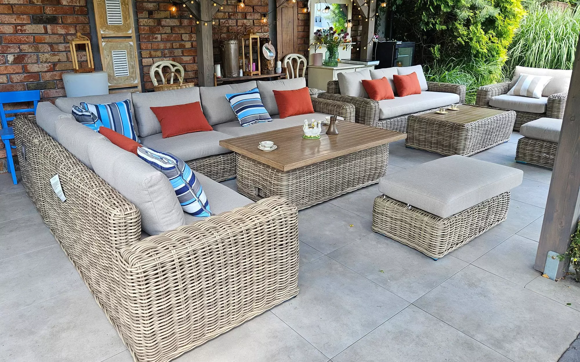 TORRES to duży zestaw wypoczynkowy, który tworzy kompletną strefę relaksu na tarasie, w ogrodzie lub oranżerii. Połączenie narożnika, sofy 3‑osobowej, fotela, dwóch stolików i dwóch puf zapewnia komfort dla wielu osób oraz pełną funkcjonalność na co dzień.