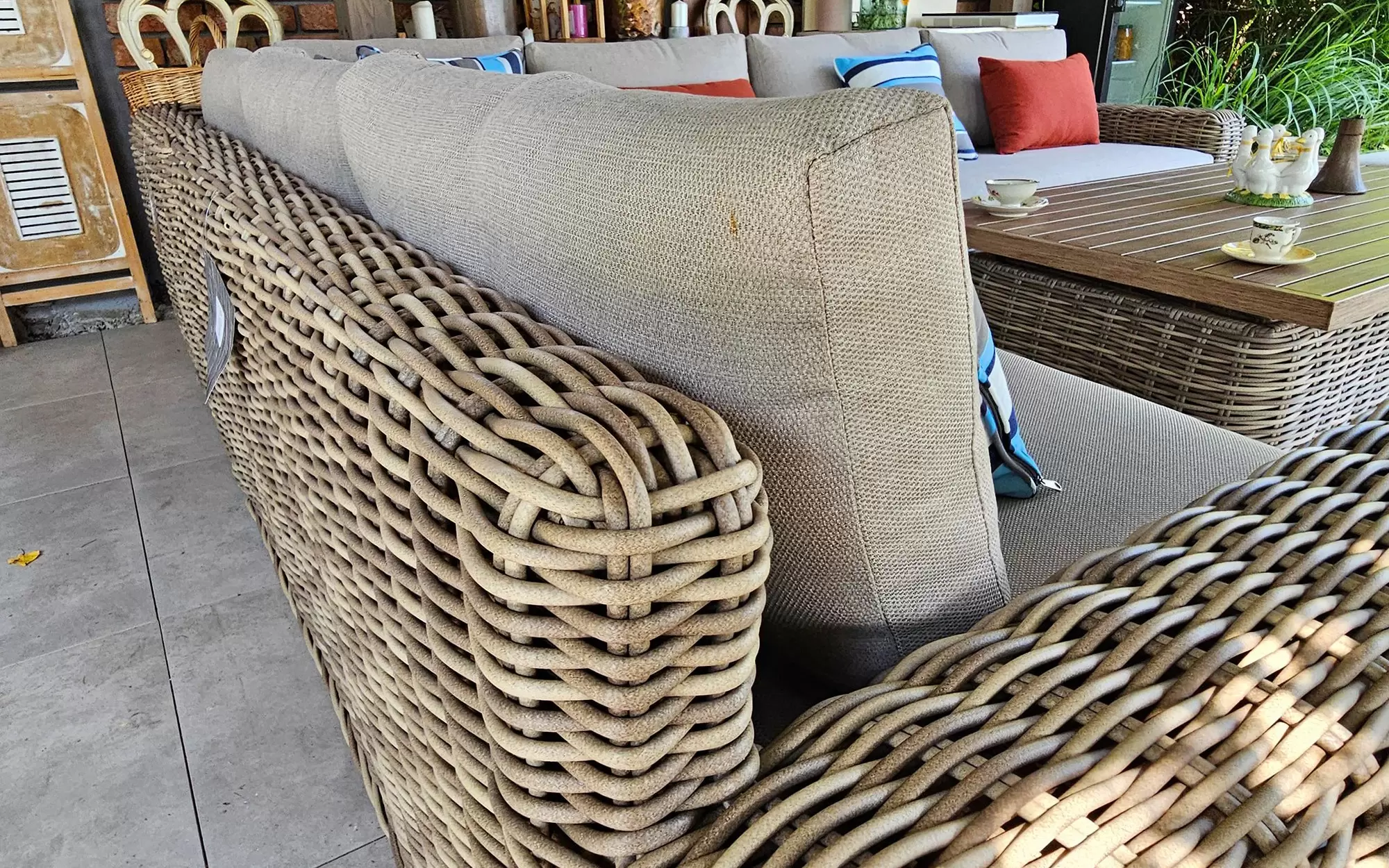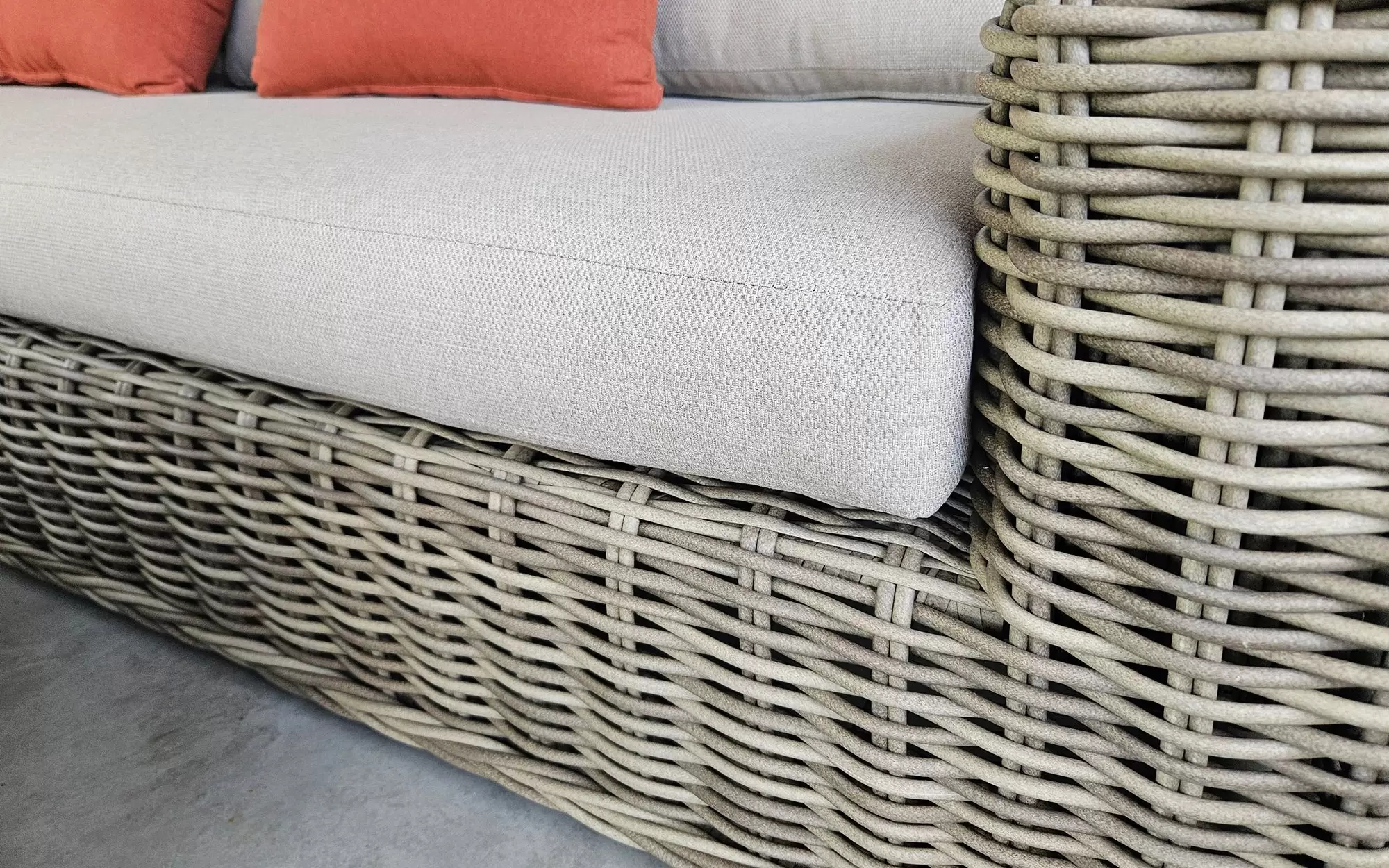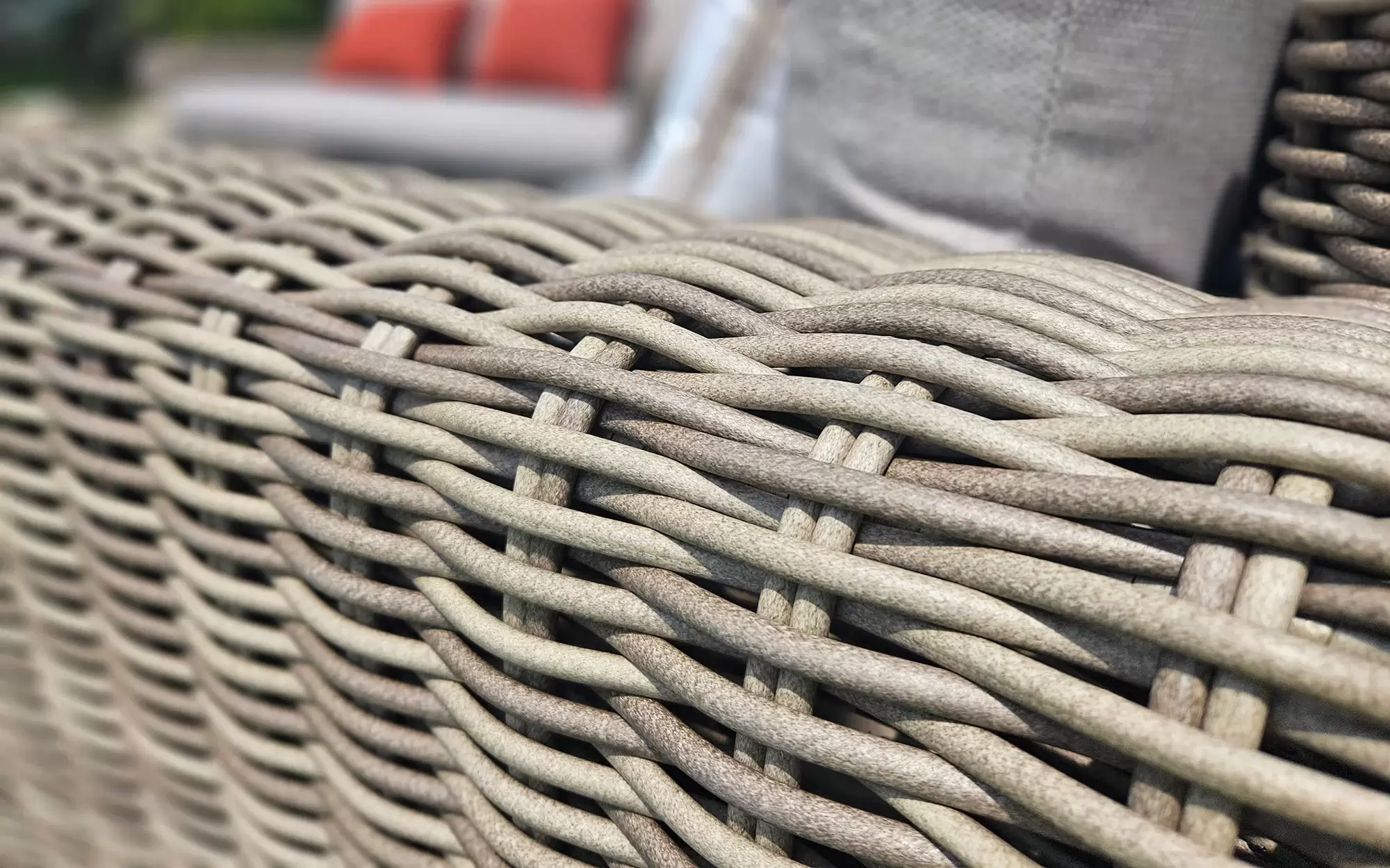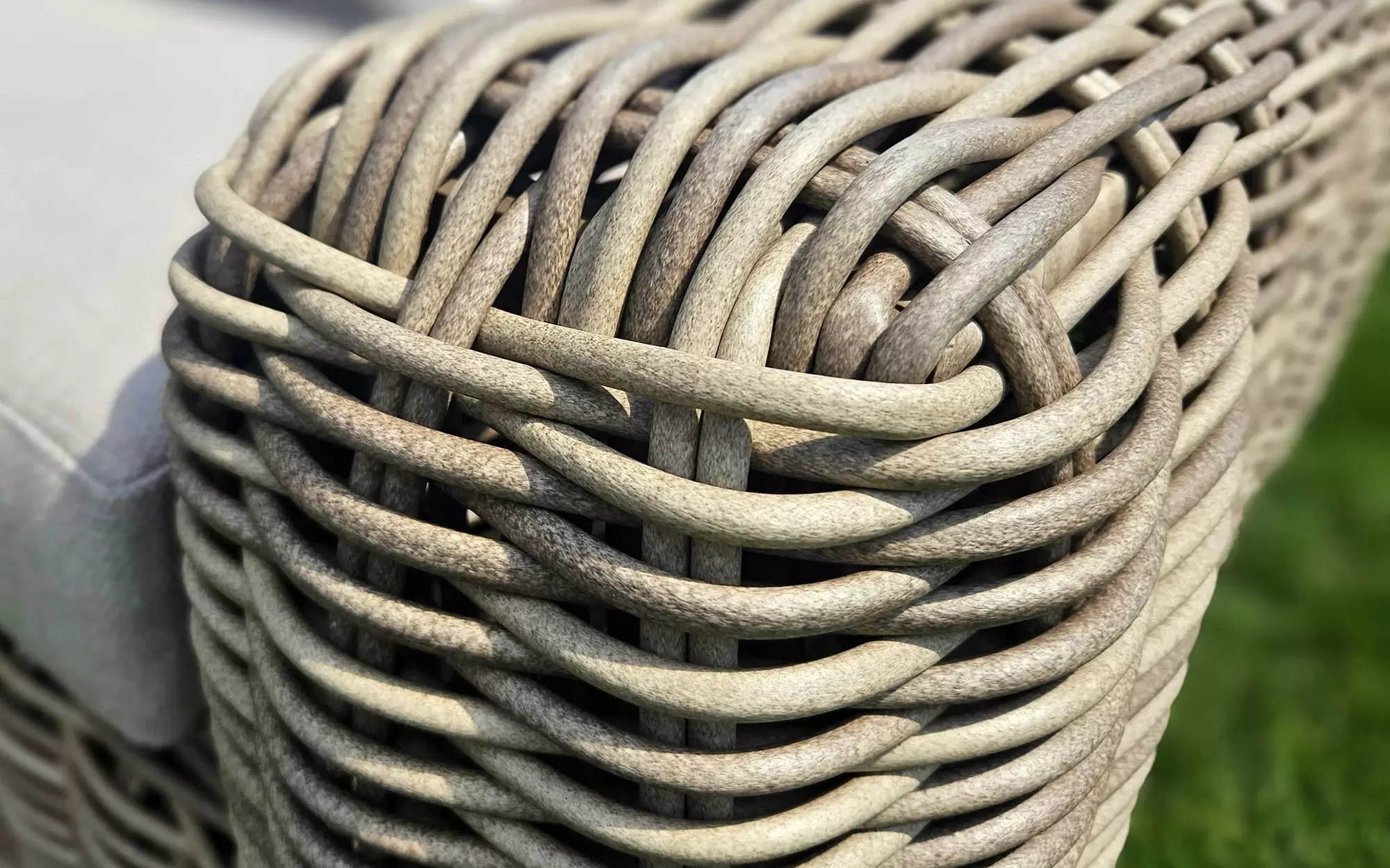 Meble wykonano z okrągłego technorattanu 8 mm, który nadaje zestawowi elegancki, masywny wygląd i doskonale imituje naturalny rattan. Konstrukcja aluminiowa gwarantuje stabilność, lekkość i odporność na korozję.
