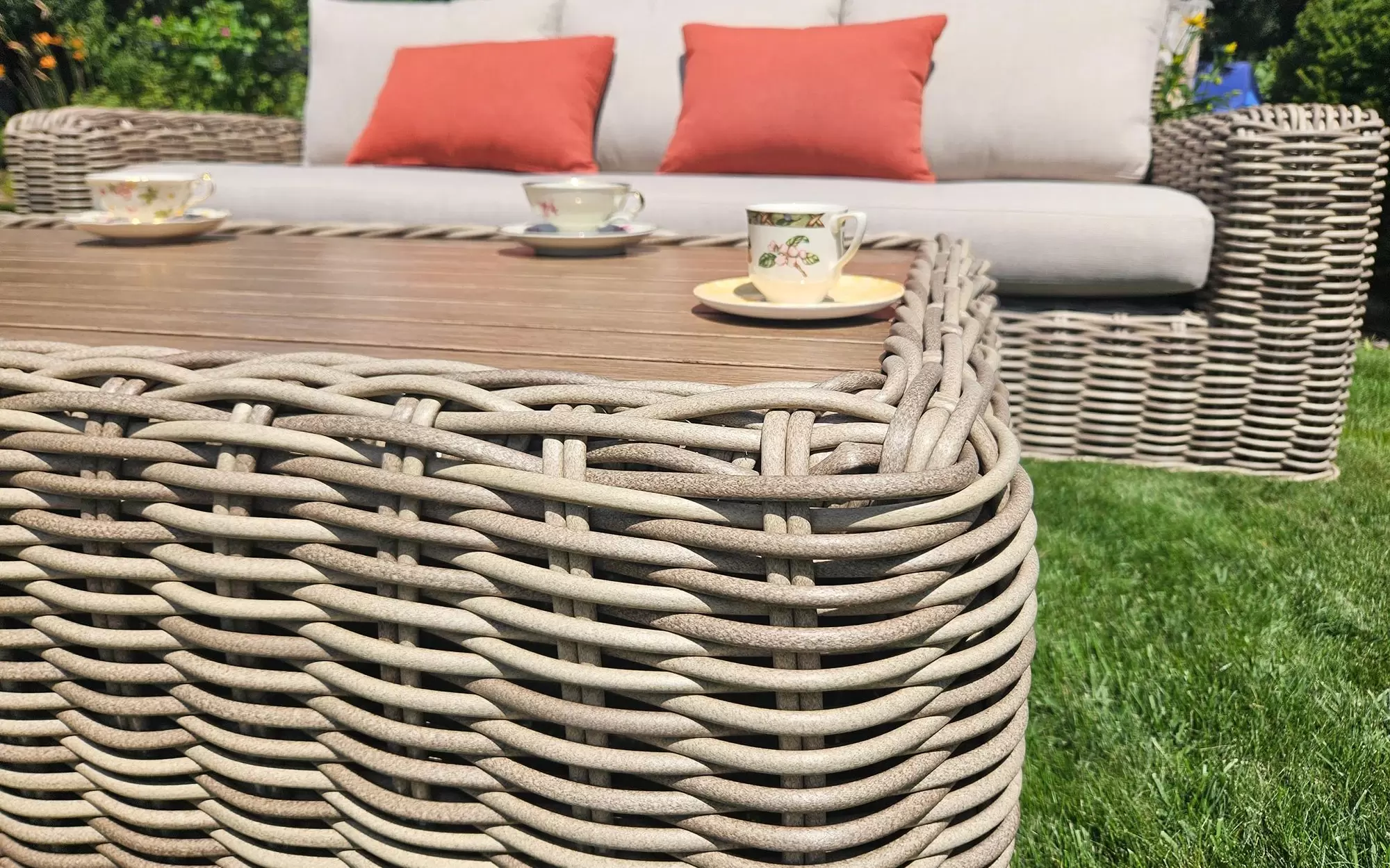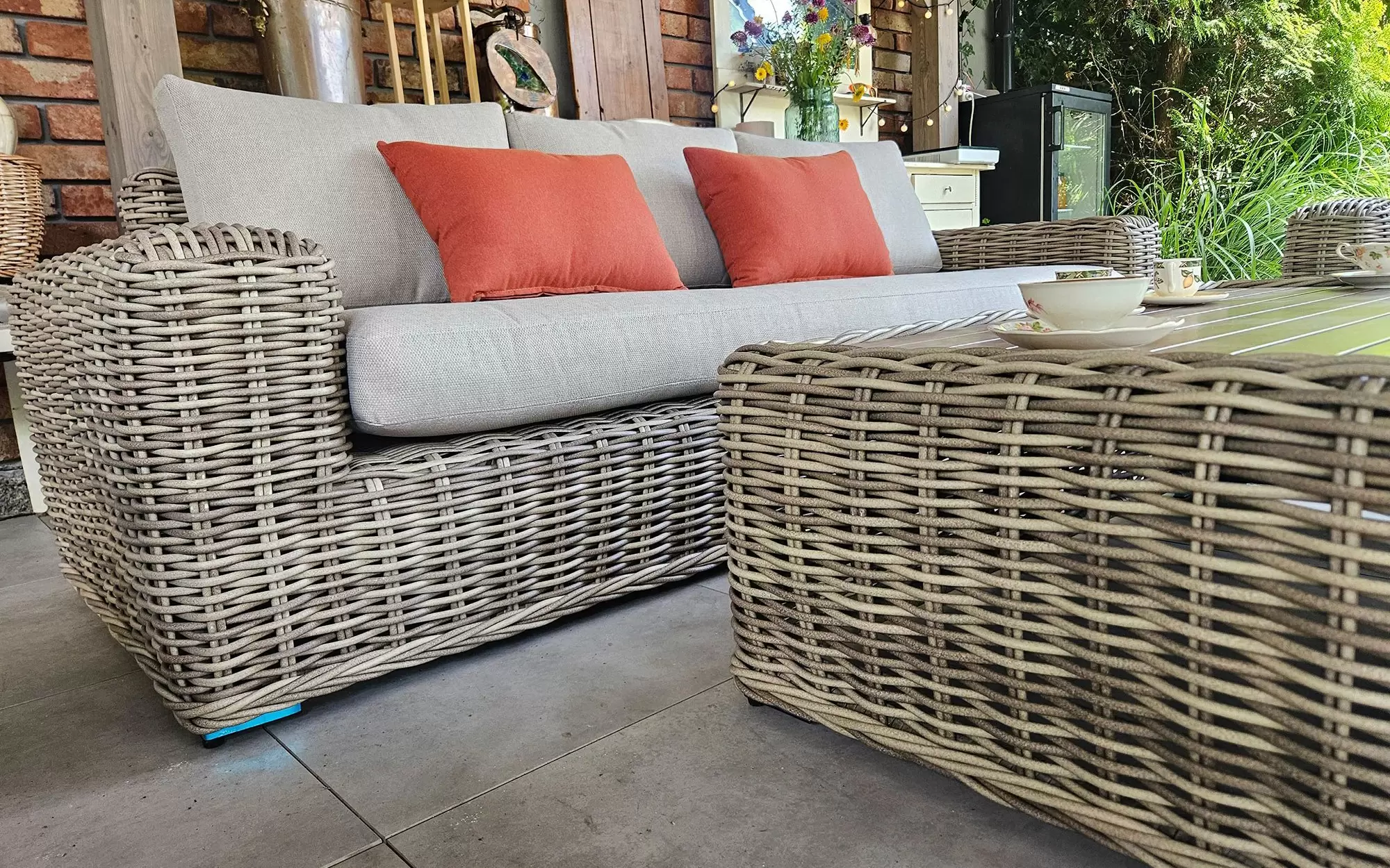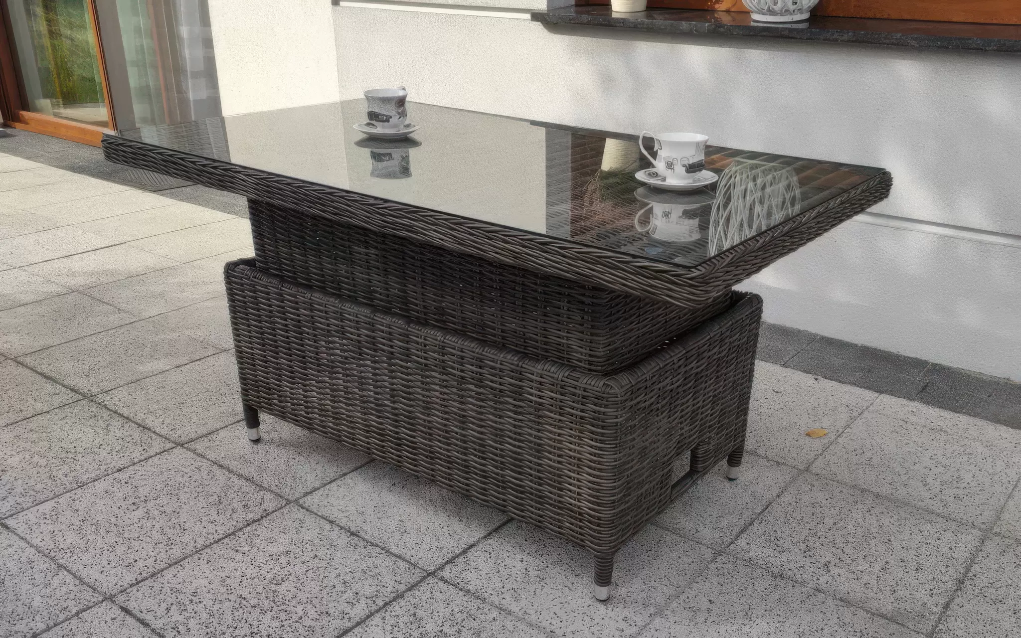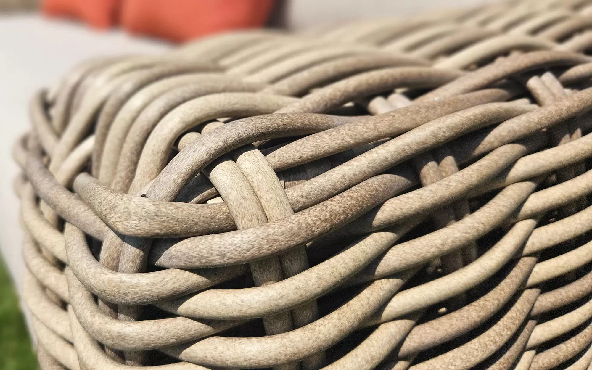Meble wykonano z okrągłego technorattanu 8 mm, który nadaje zestawowi elegancki, masywny wygląd i doskonale imituje naturalny rattan. Konstrukcja aluminiowa gwarantuje stabilność, lekkość i odporność na korozję.
