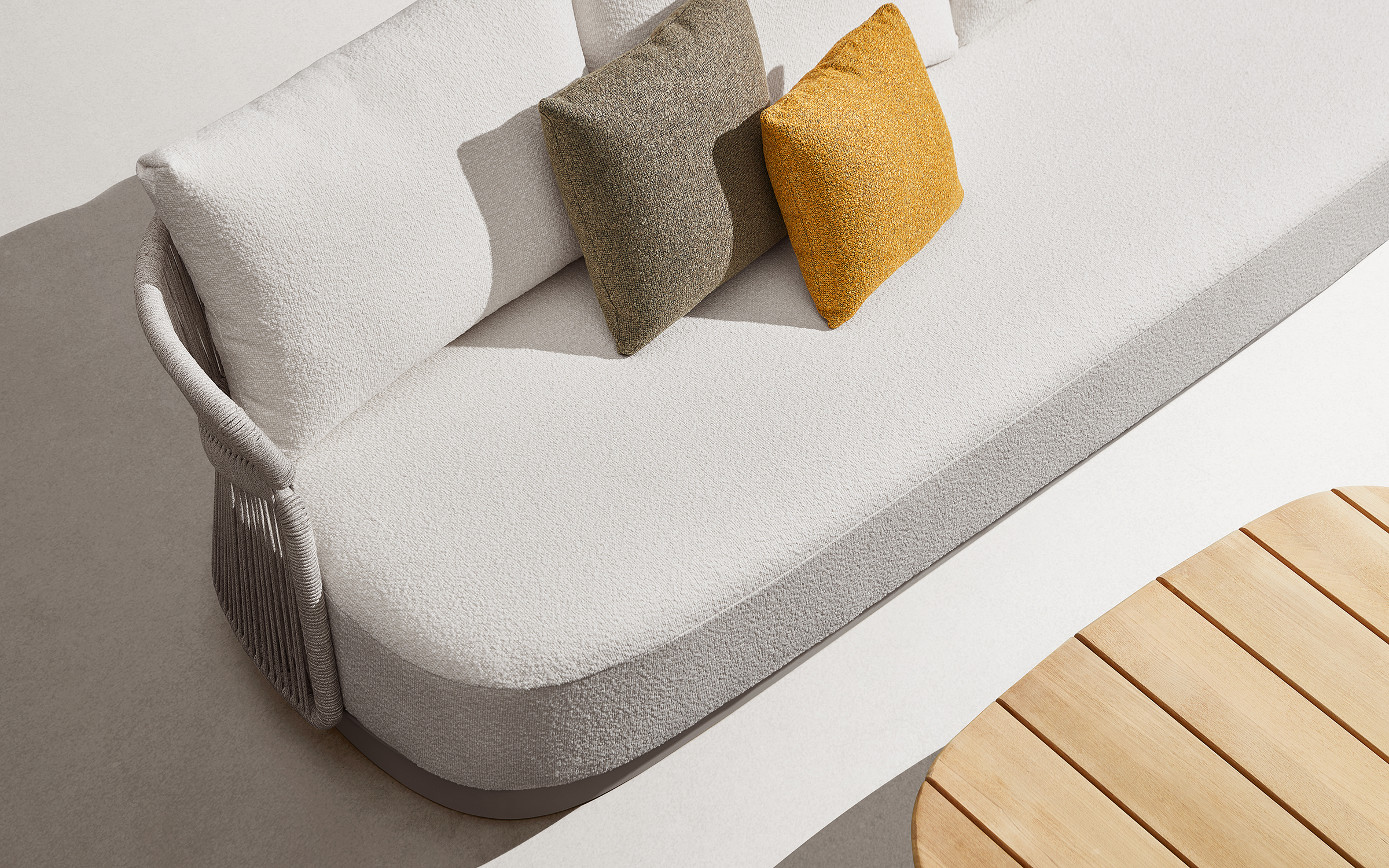 Meble w kolorze jasnobeżowym: poduszki odporne na warunki atmosferyczne ze specjalną pianką, która umożliwia przepływ wody i utrzymuje pierwotny kształt. Poszewki wykonane z materiału Boucle z włókien polipropylenowych odpornych na UV i wodę.