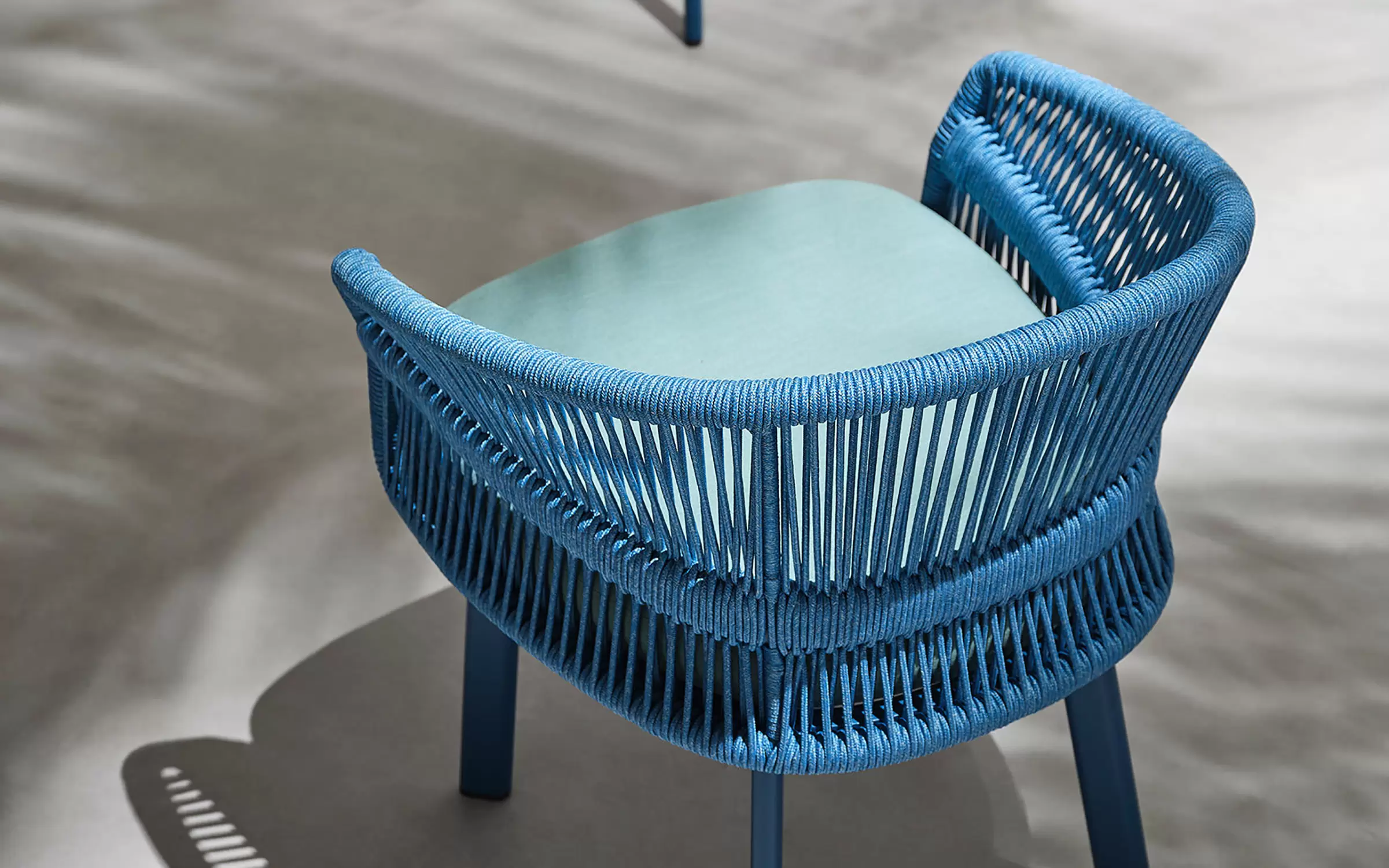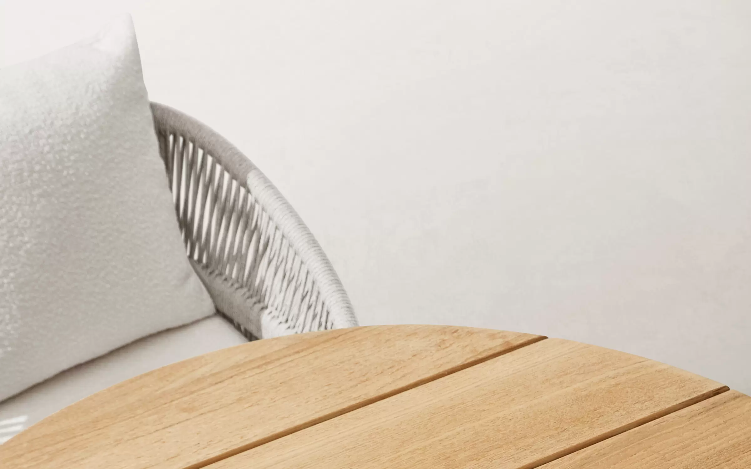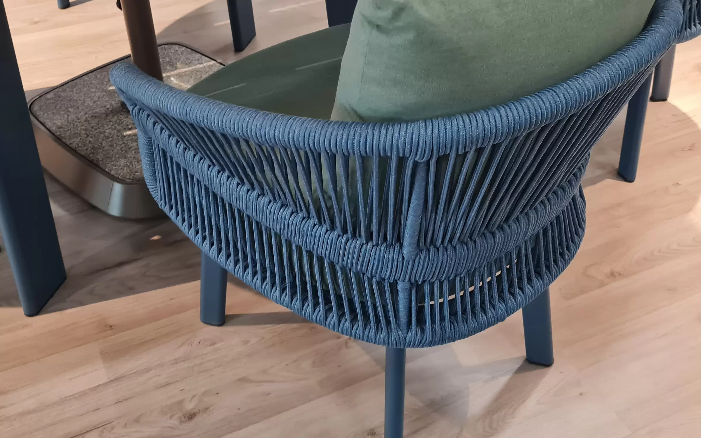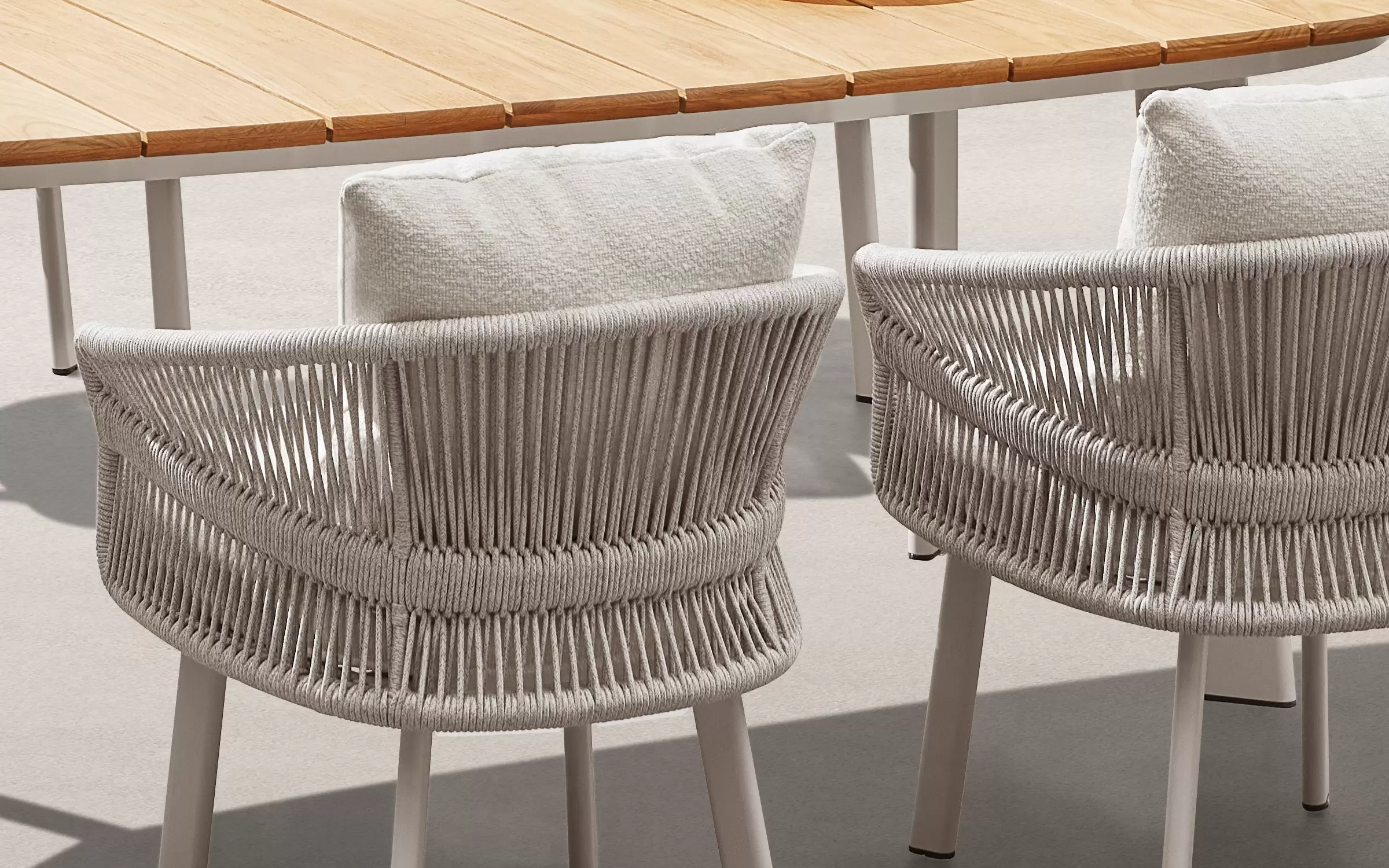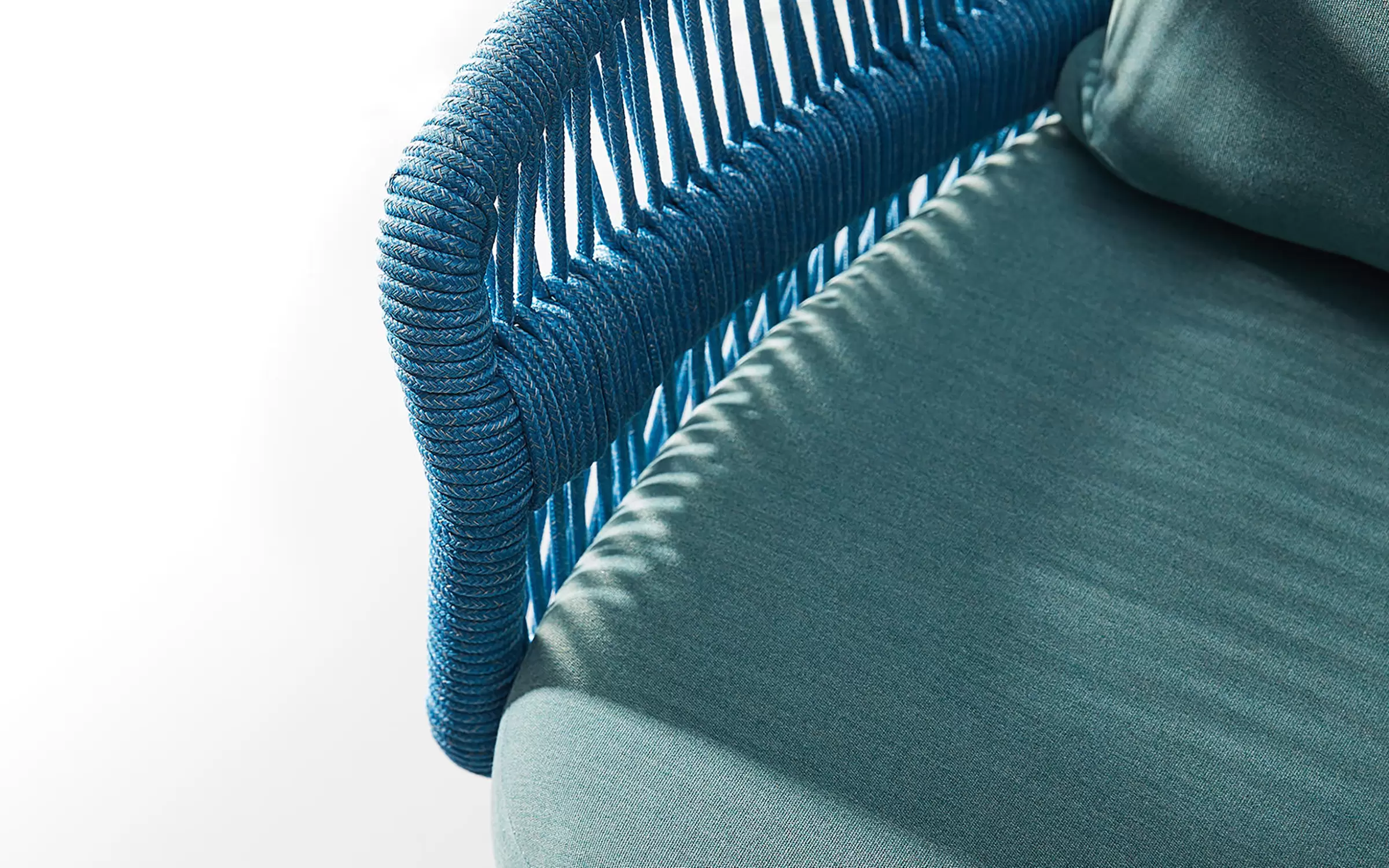 Charakterystyczna tożsamość Aio odzwierciedla unikalną plecionkę z liny i starannie wykonaną konstrukcję, która wspiera miękkie, zachęcające poduszki siedziska i oparcia. Kolekcja łączy linie z miękkimi, zakrzywionymi kształtami, tworząc zestaw elegancki, wygodny i pełen uroku życia na świeżym powietrzu.