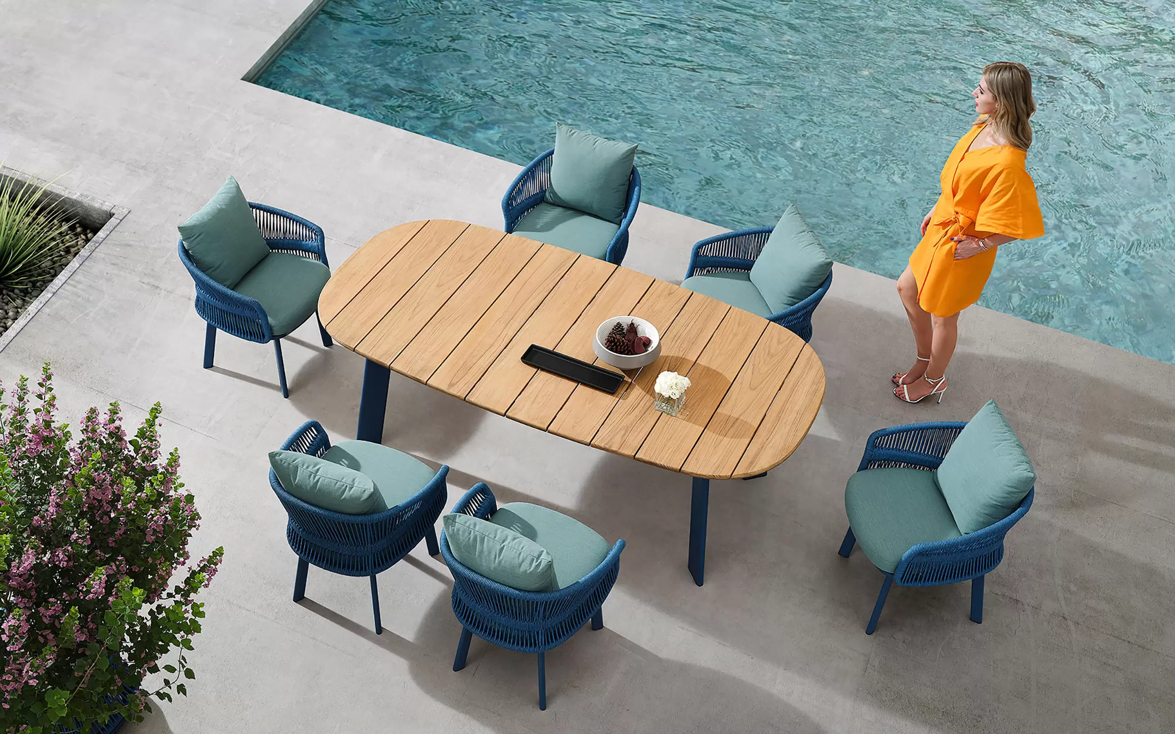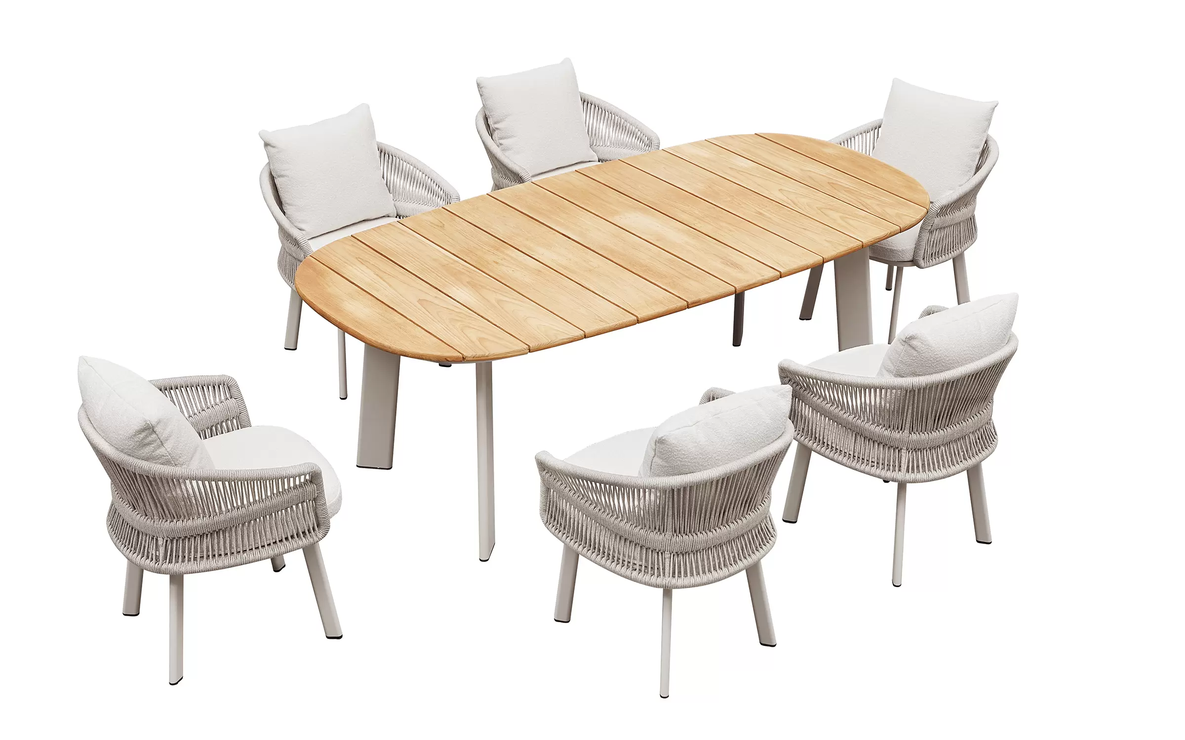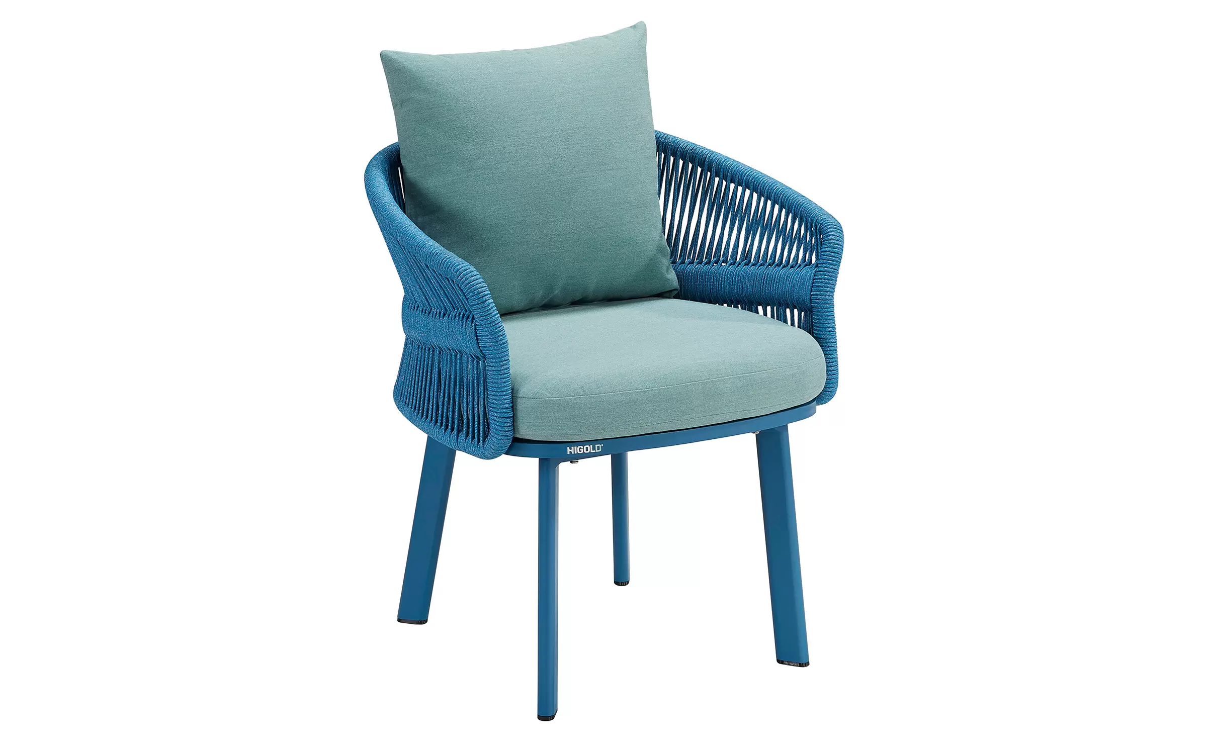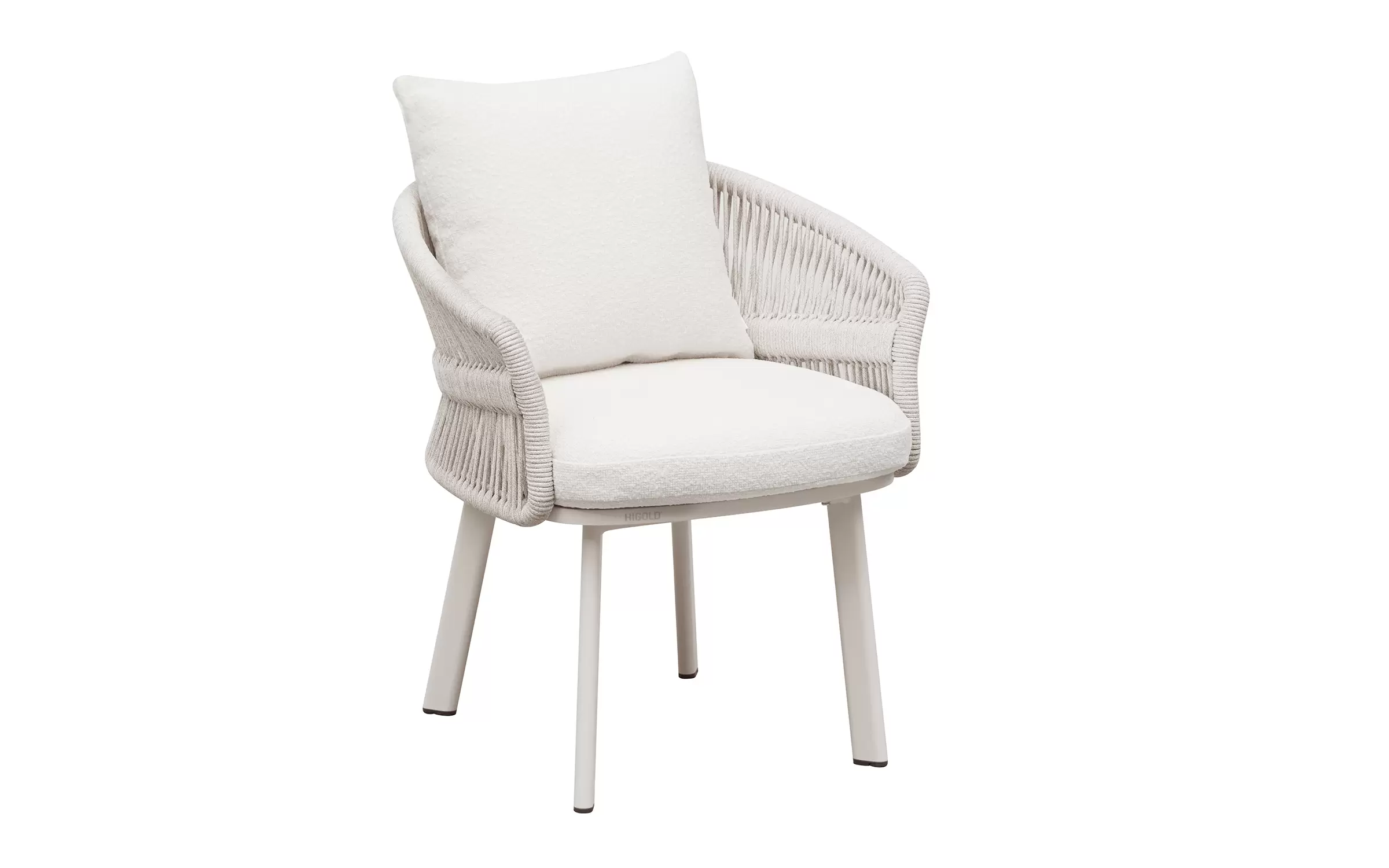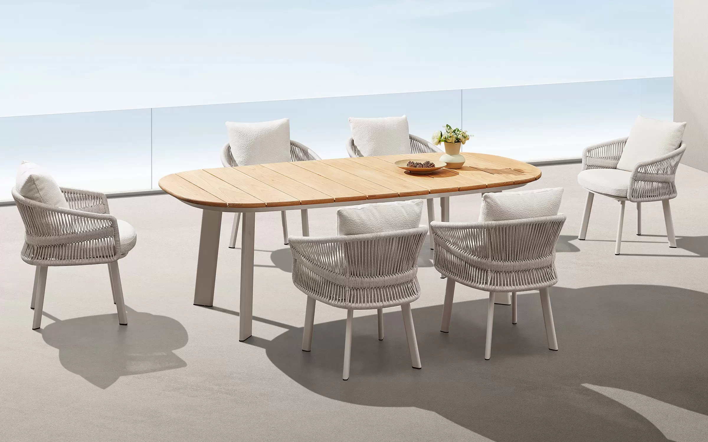 Charakterystyczna tożsamość Aio odzwierciedla unikalną plecionkę z liny i starannie wykonaną konstrukcję, która wspiera miękkie, zachęcające poduszki siedziska i oparcia. Kolekcja łączy linie z miękkimi, zakrzywionymi kształtami, tworząc zestaw elegancki, wygodny i pełen uroku życia na świeżym powietrzu.