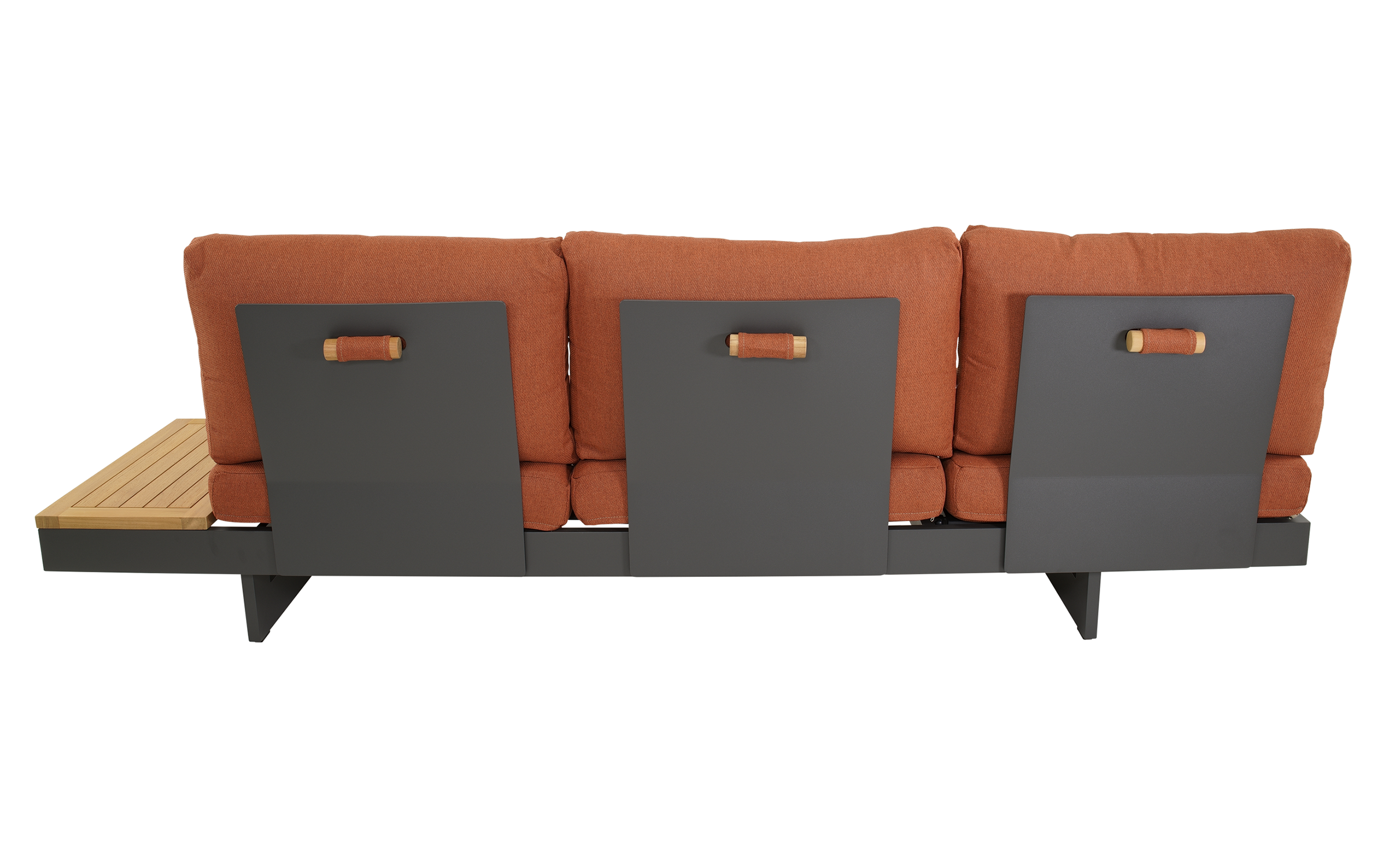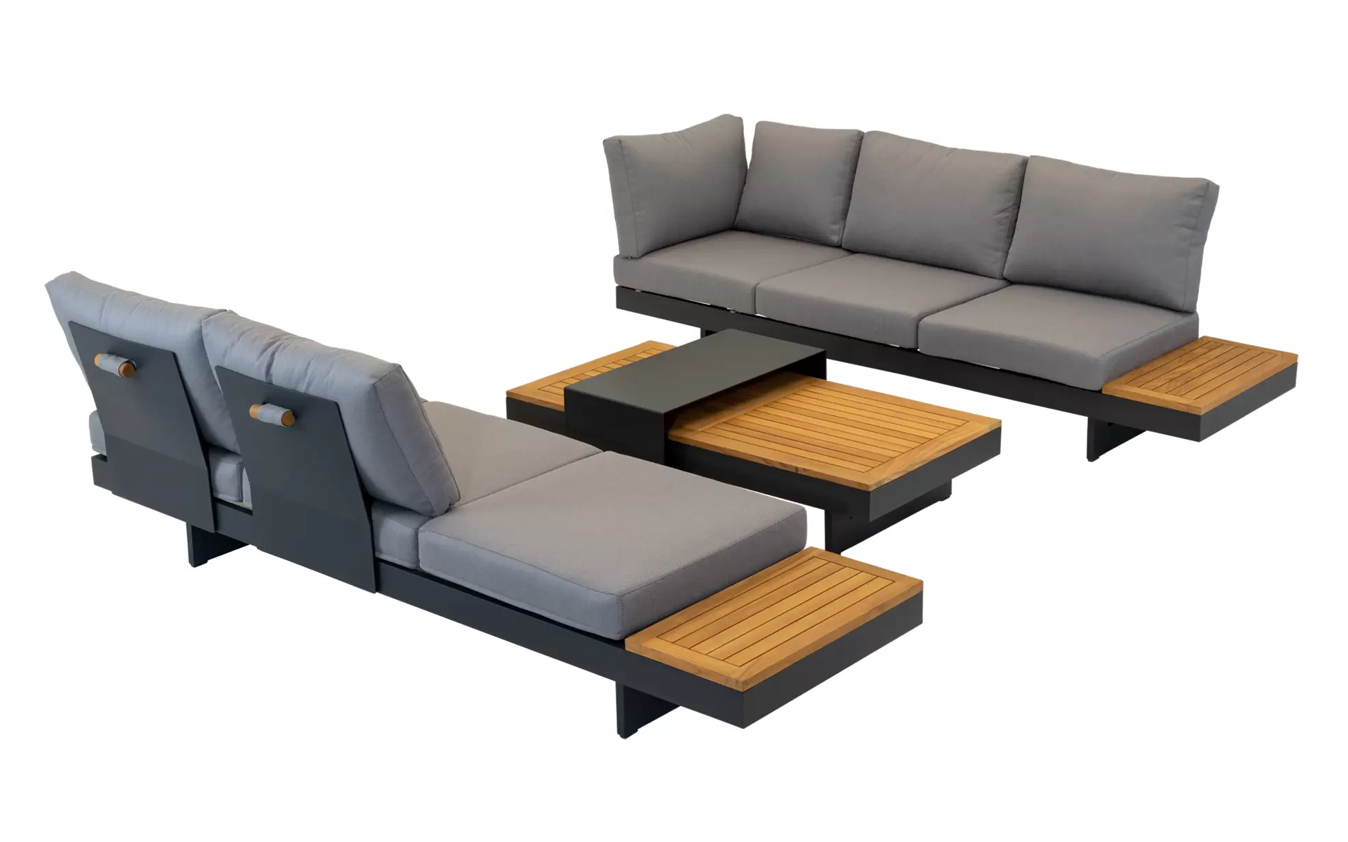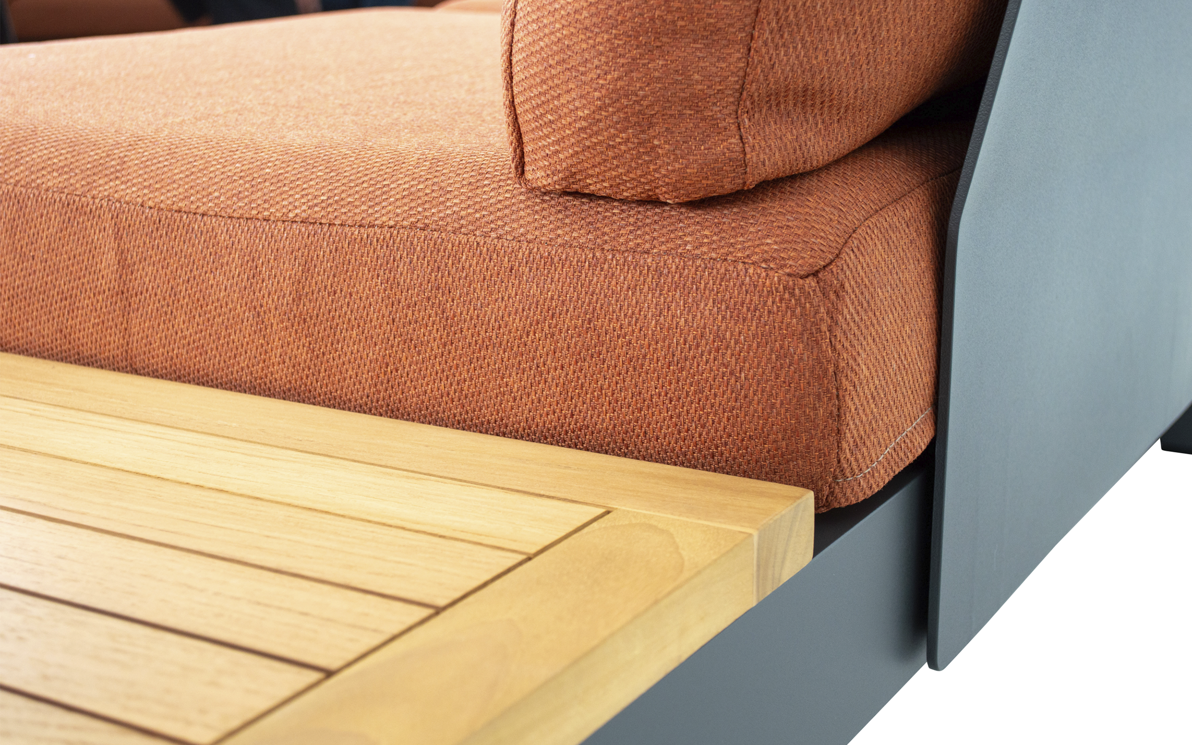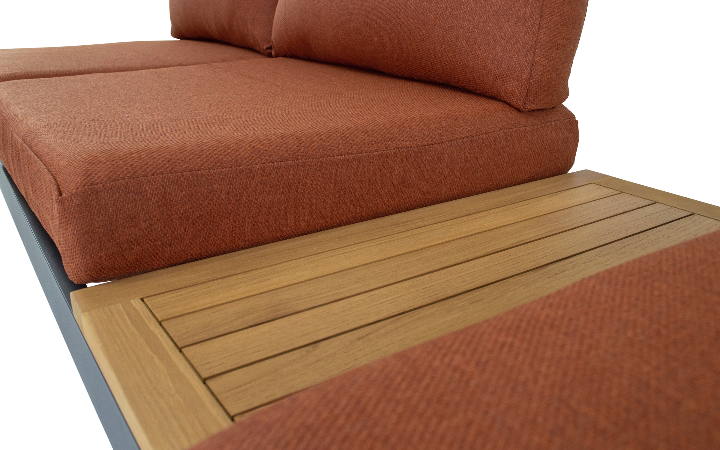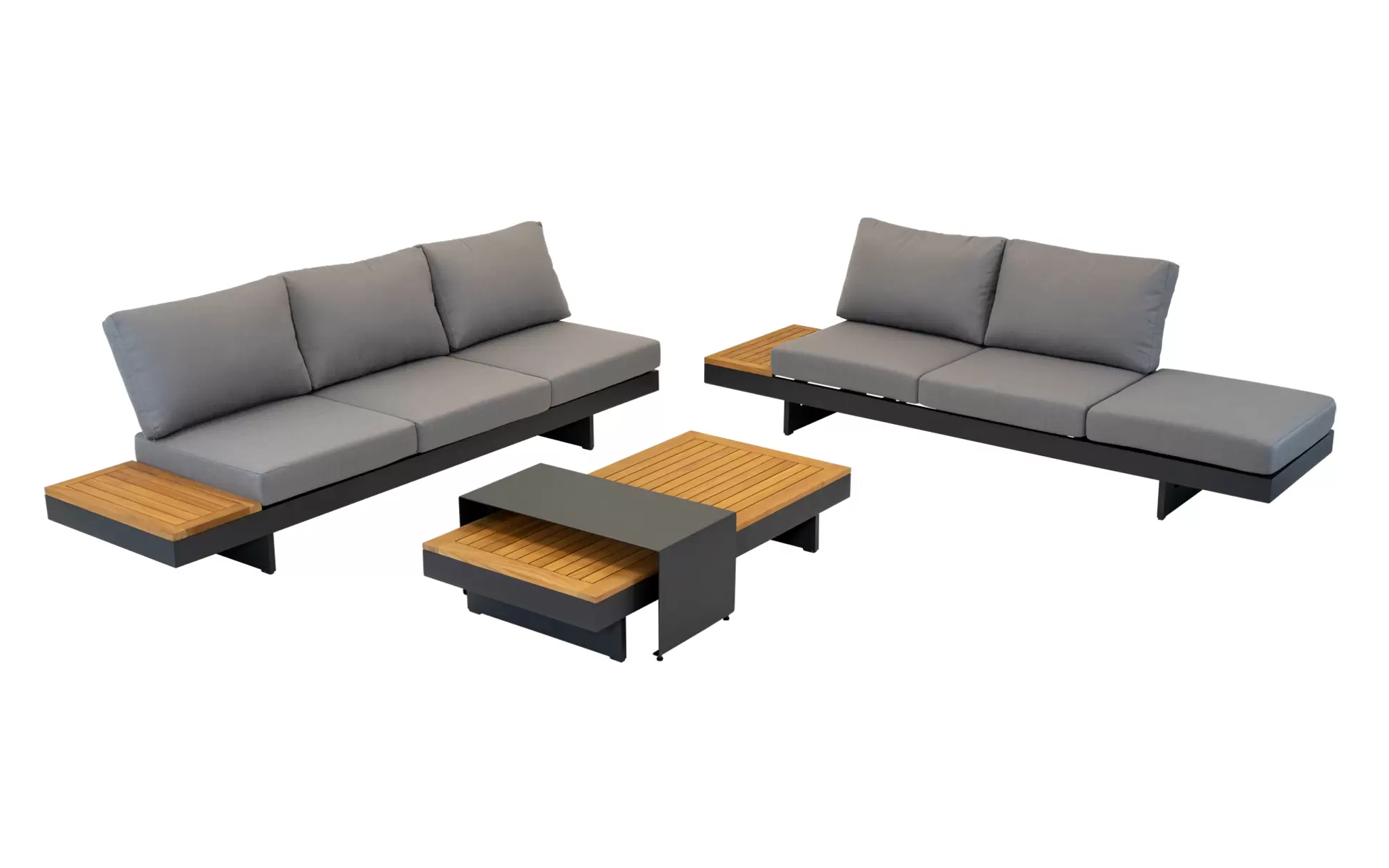 W komplecie stolik z pasującym do stolików bocznych sof blatem z drewna teakowego. W zestawie także dodatkowy metalowy stolik (nadstawka) w kolorze grafitowym. Każda z sof posiada podnoszone siedzisko z jednej strony.