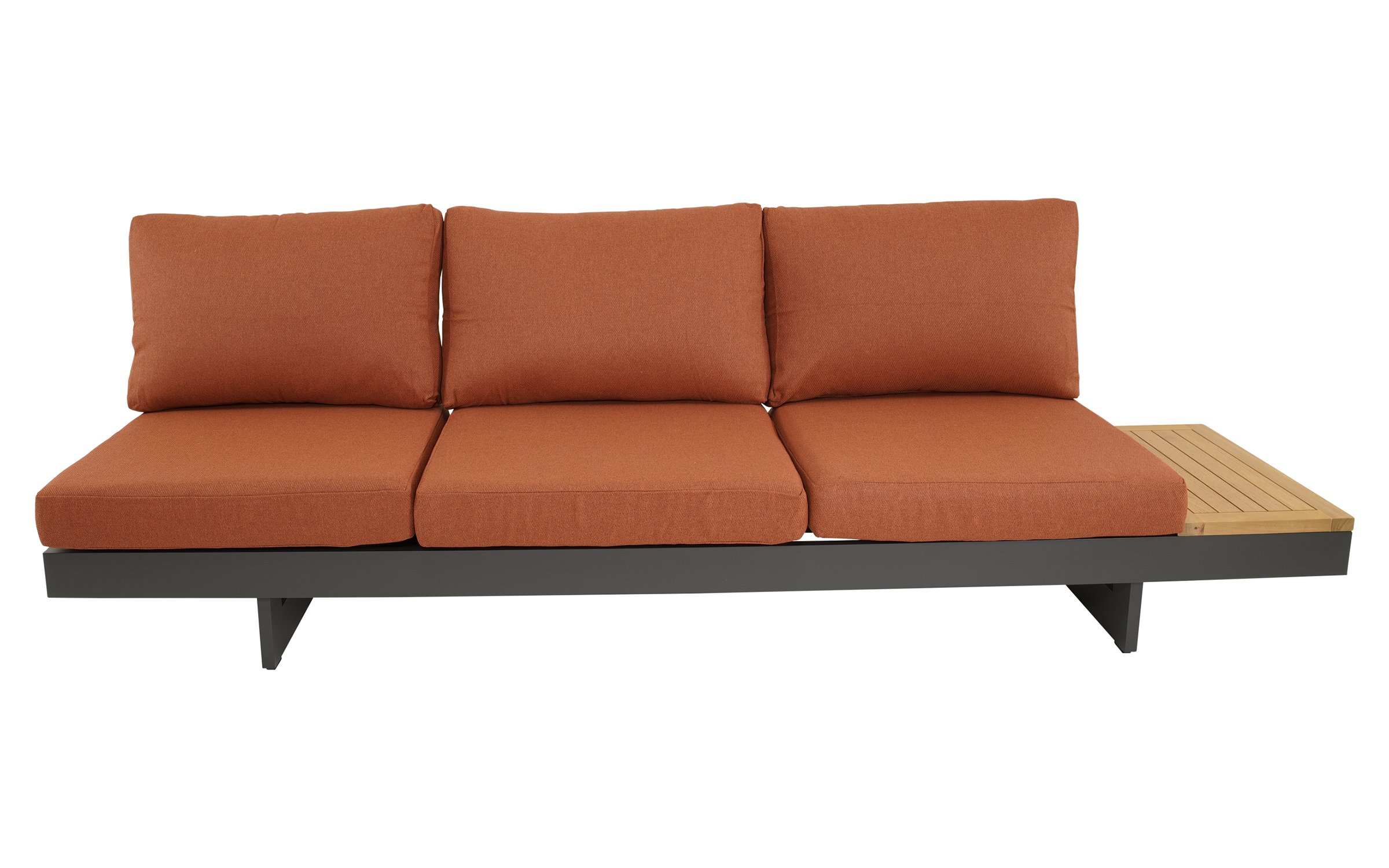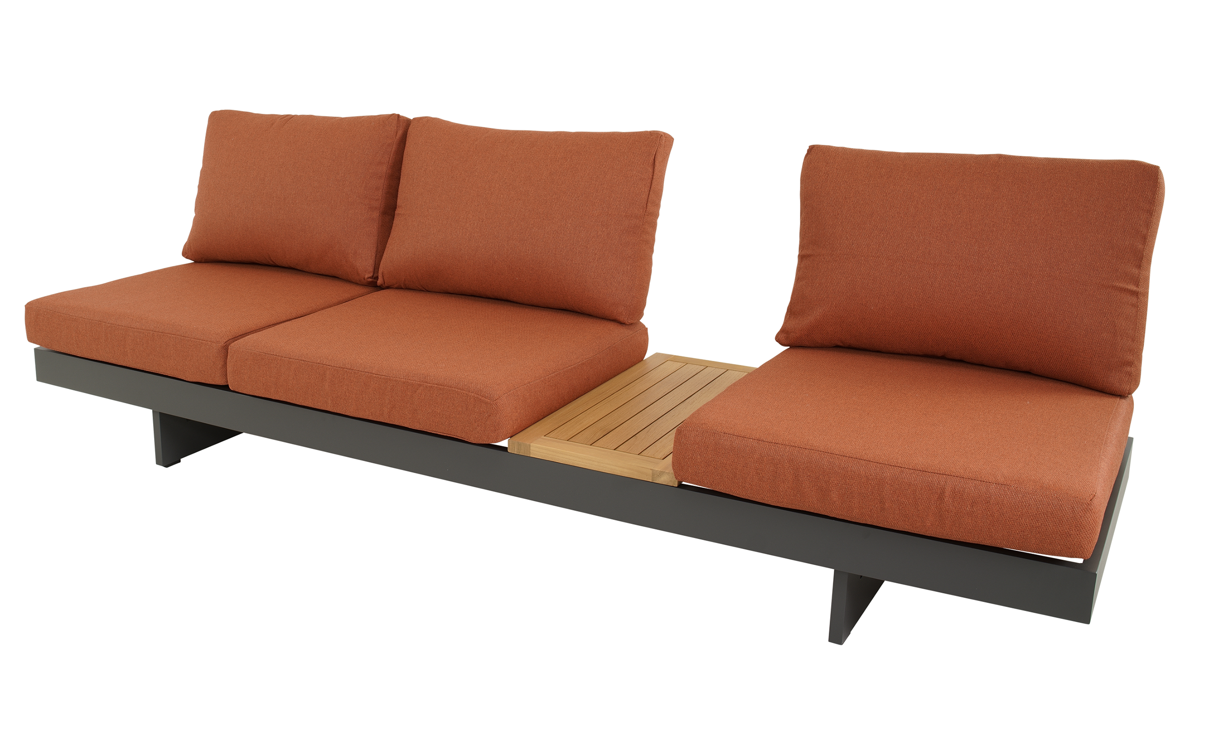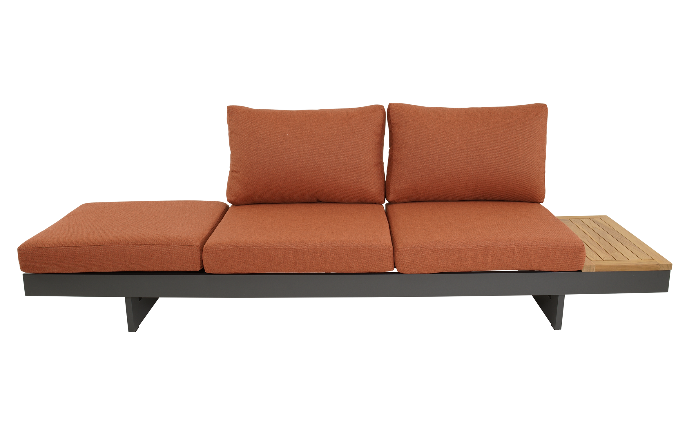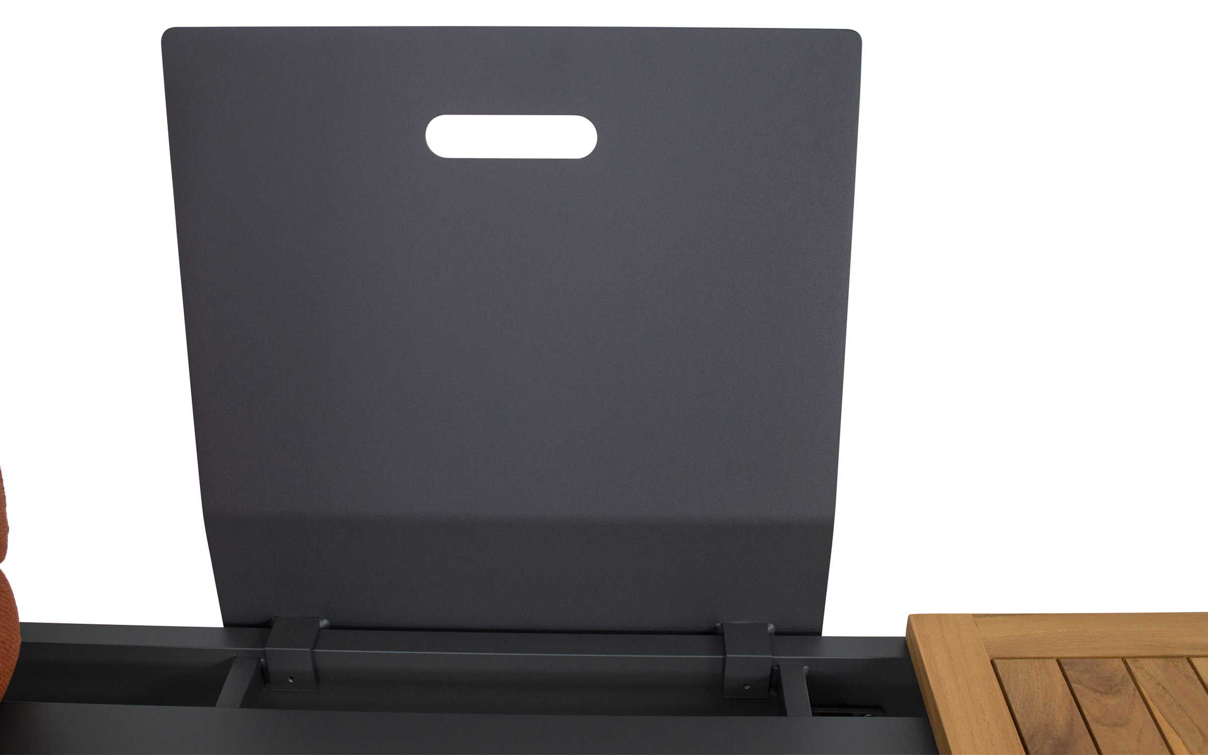 W komplecie stolik z pasującym do stolików bocznych sof blatem z drewna teakowego. W zestawie także dodatkowy metalowy stolik (nadstawka) w kolorze grafitowym. Każda z sof posiada podnoszone siedzisko z jednej strony.