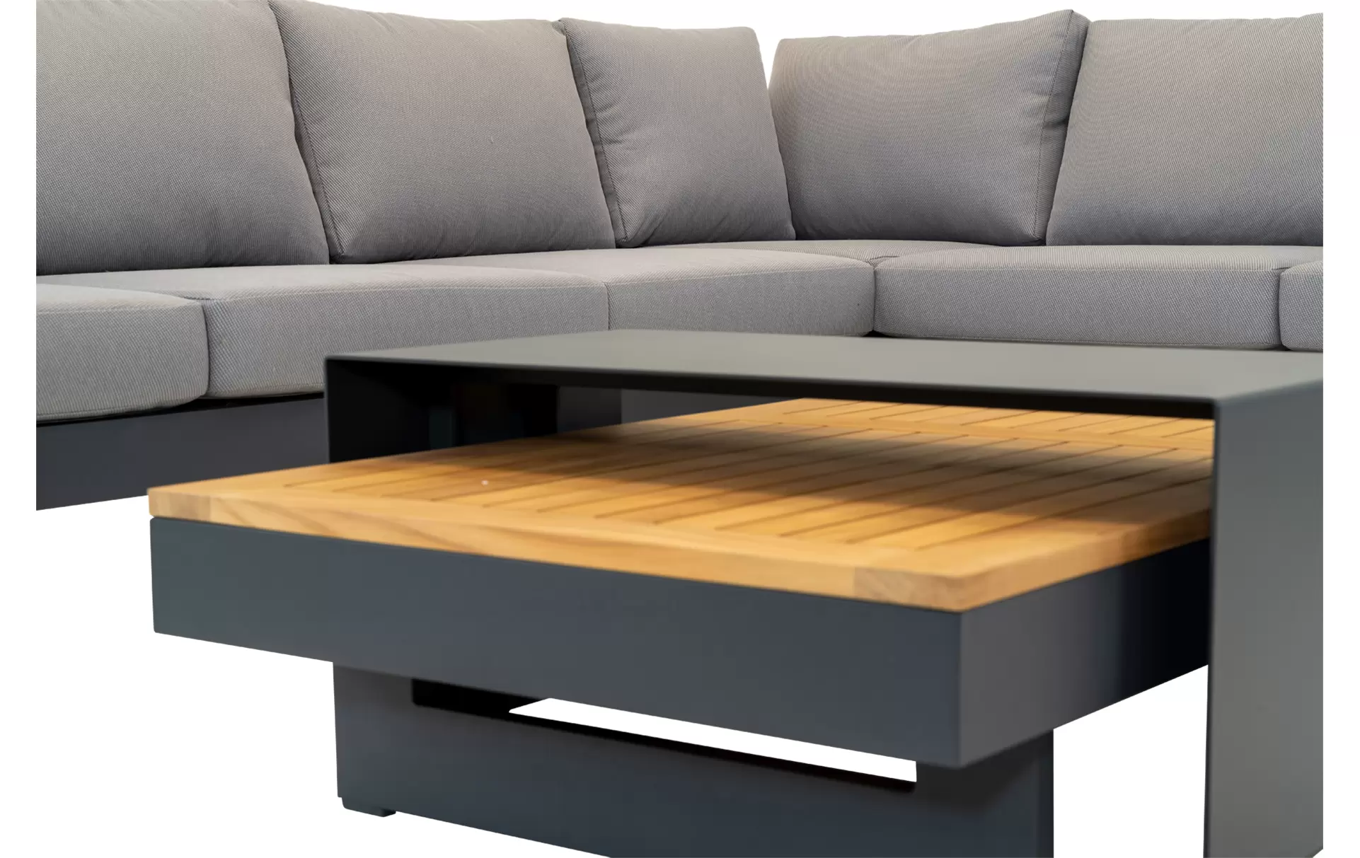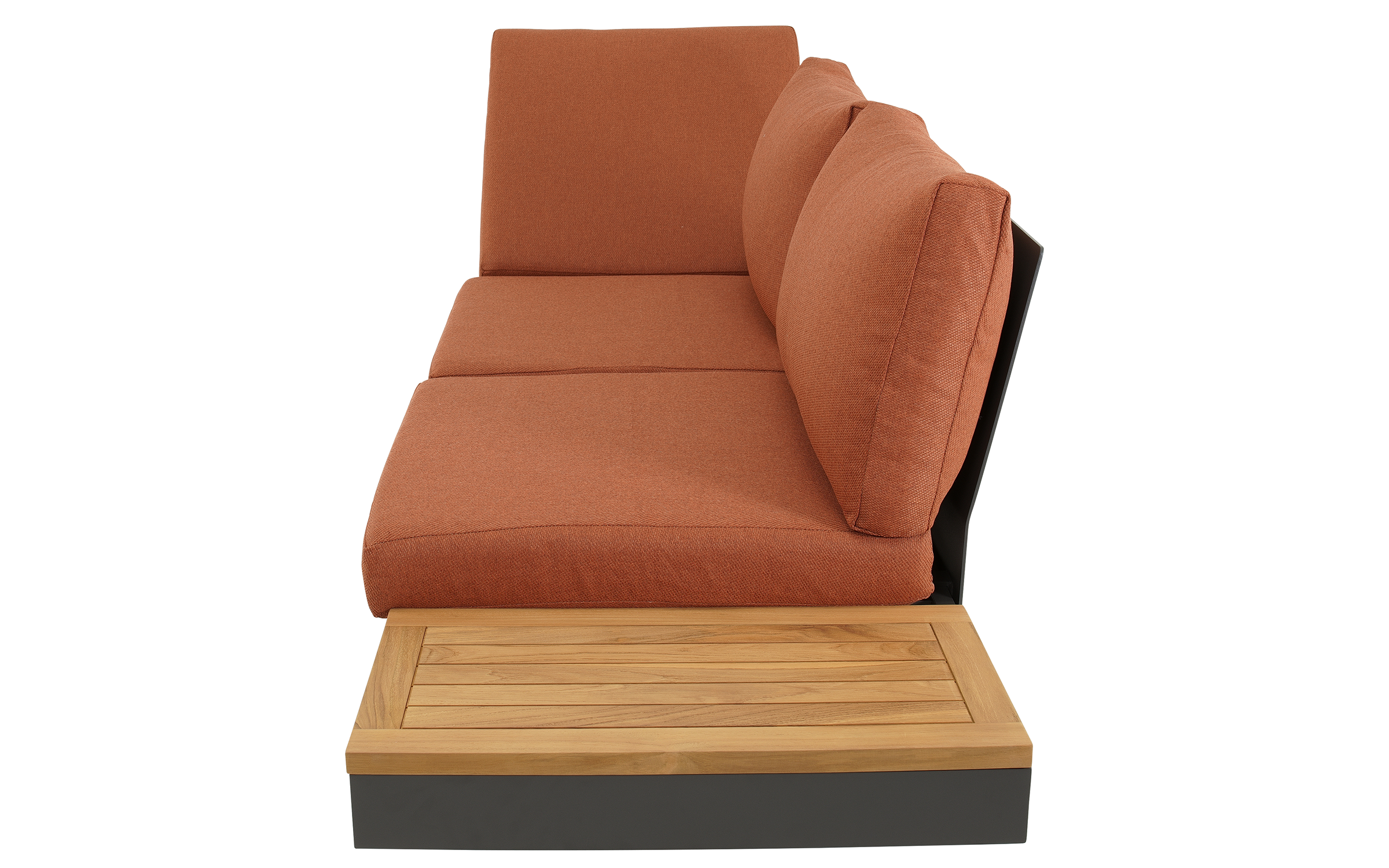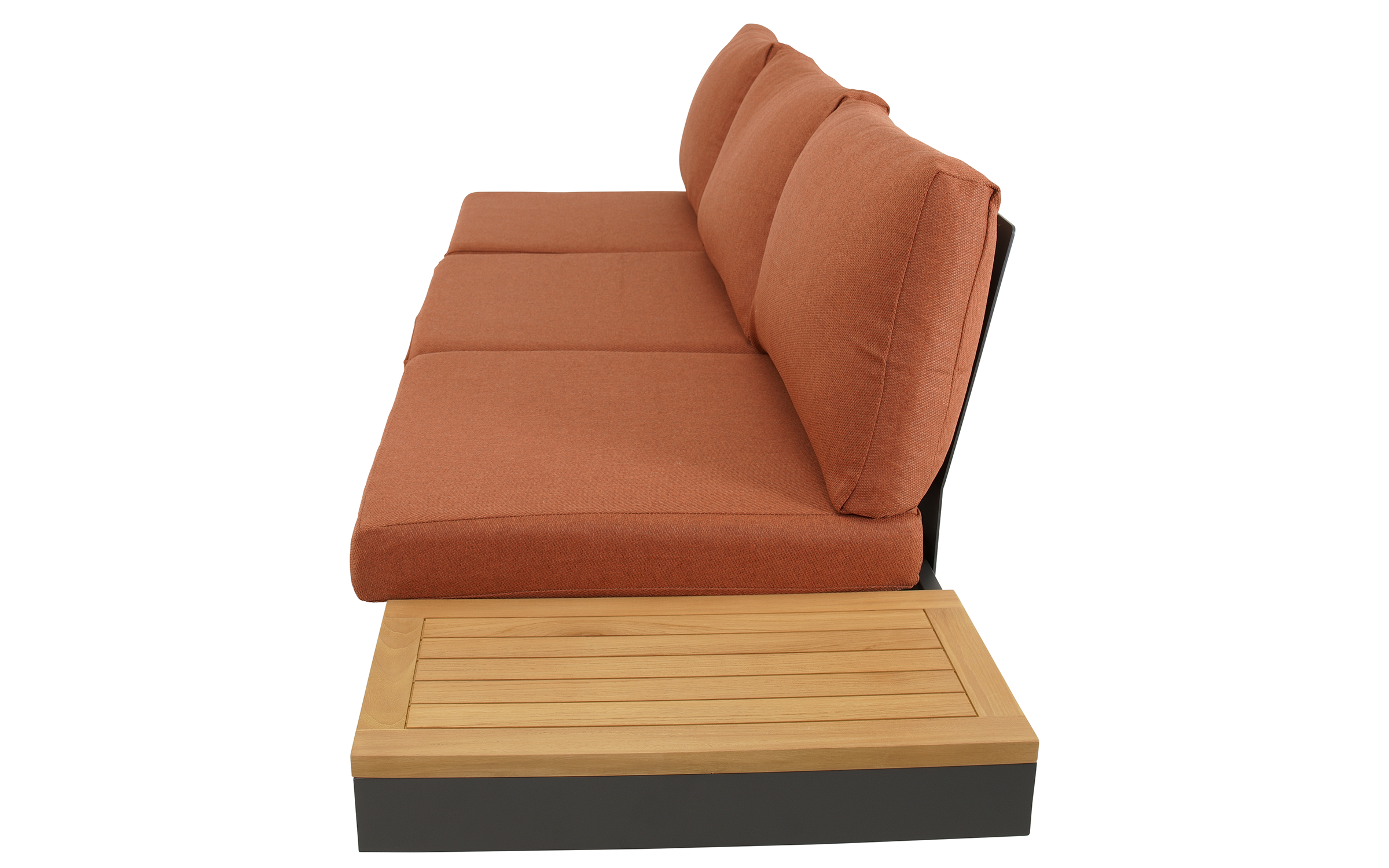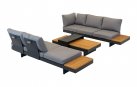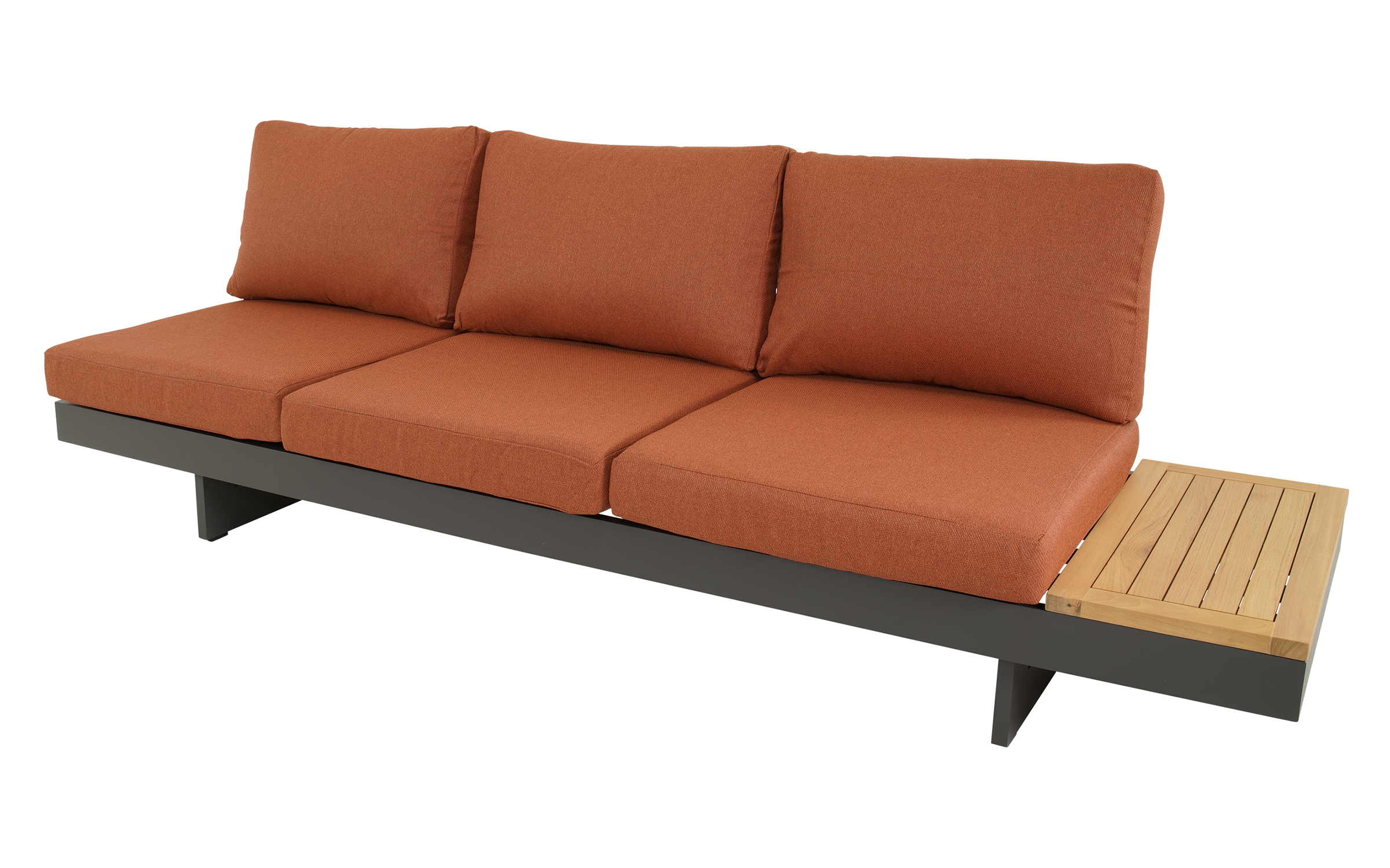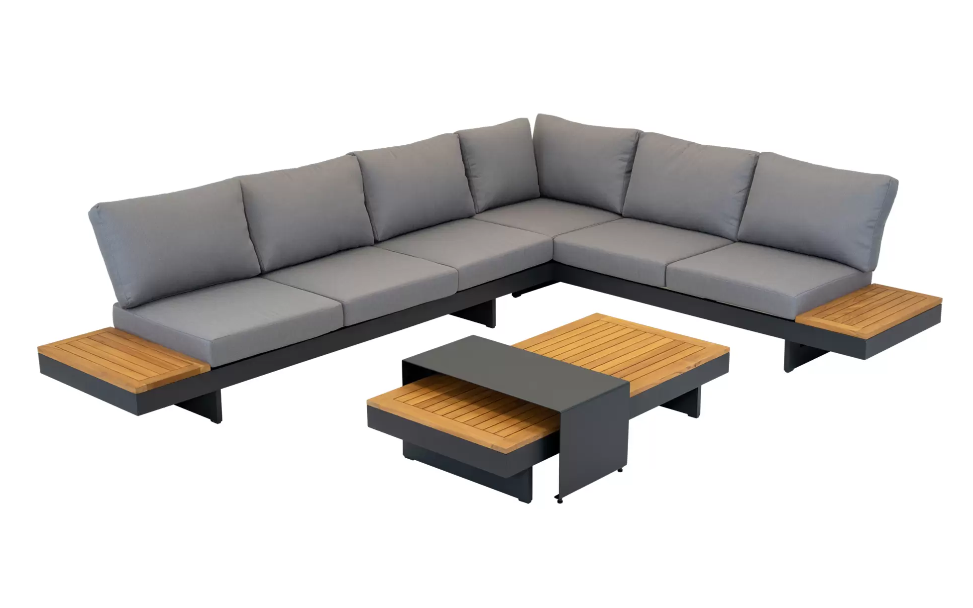 W komplecie stolik z pasującym do stolików bocznych sof blatem z drewna teakowego. W zestawie także dodatkowy metalowy stolik (nadstawka) w kolorze grafitowym. Każda z sof posiada podnoszone siedzisko z jednej strony.