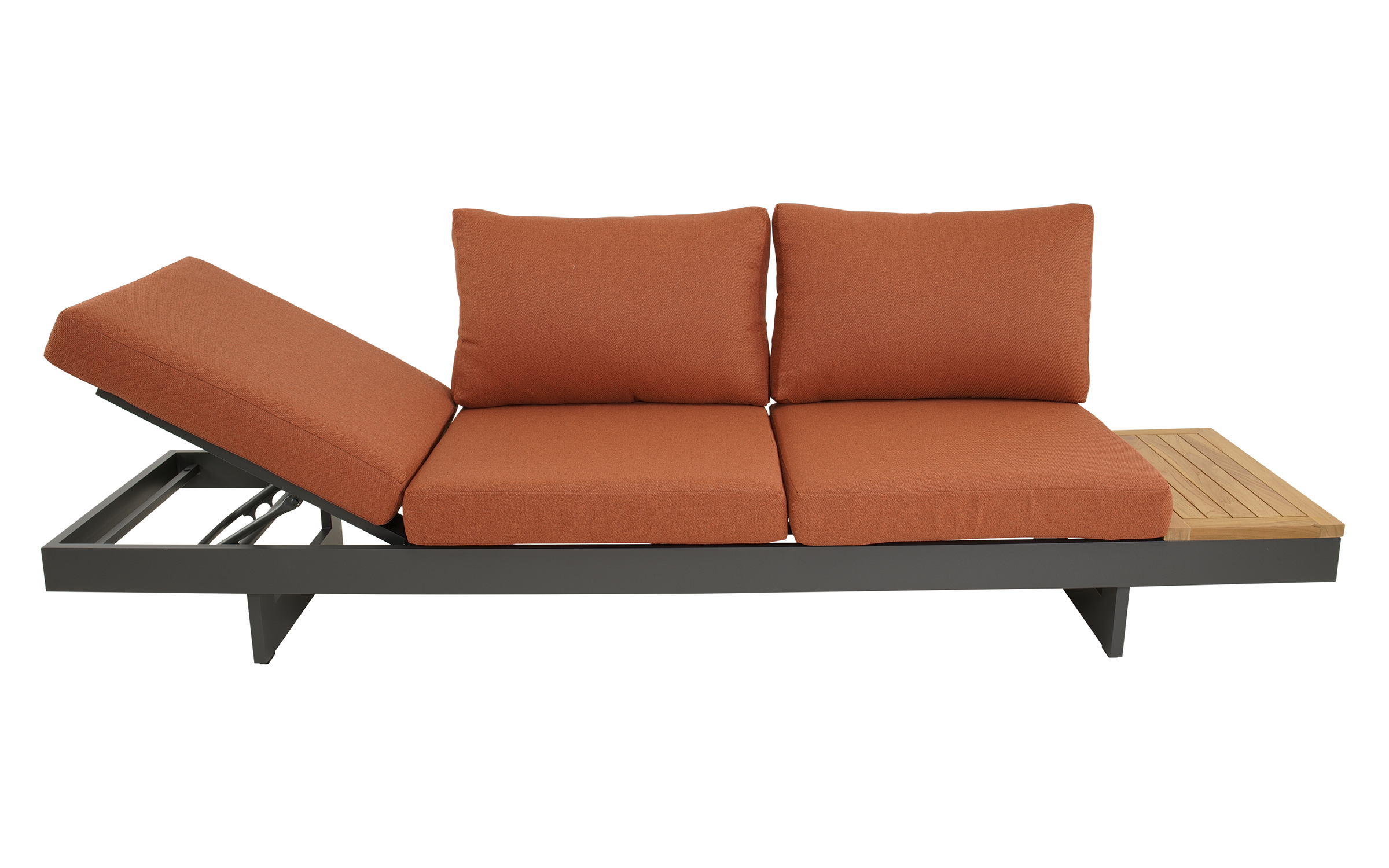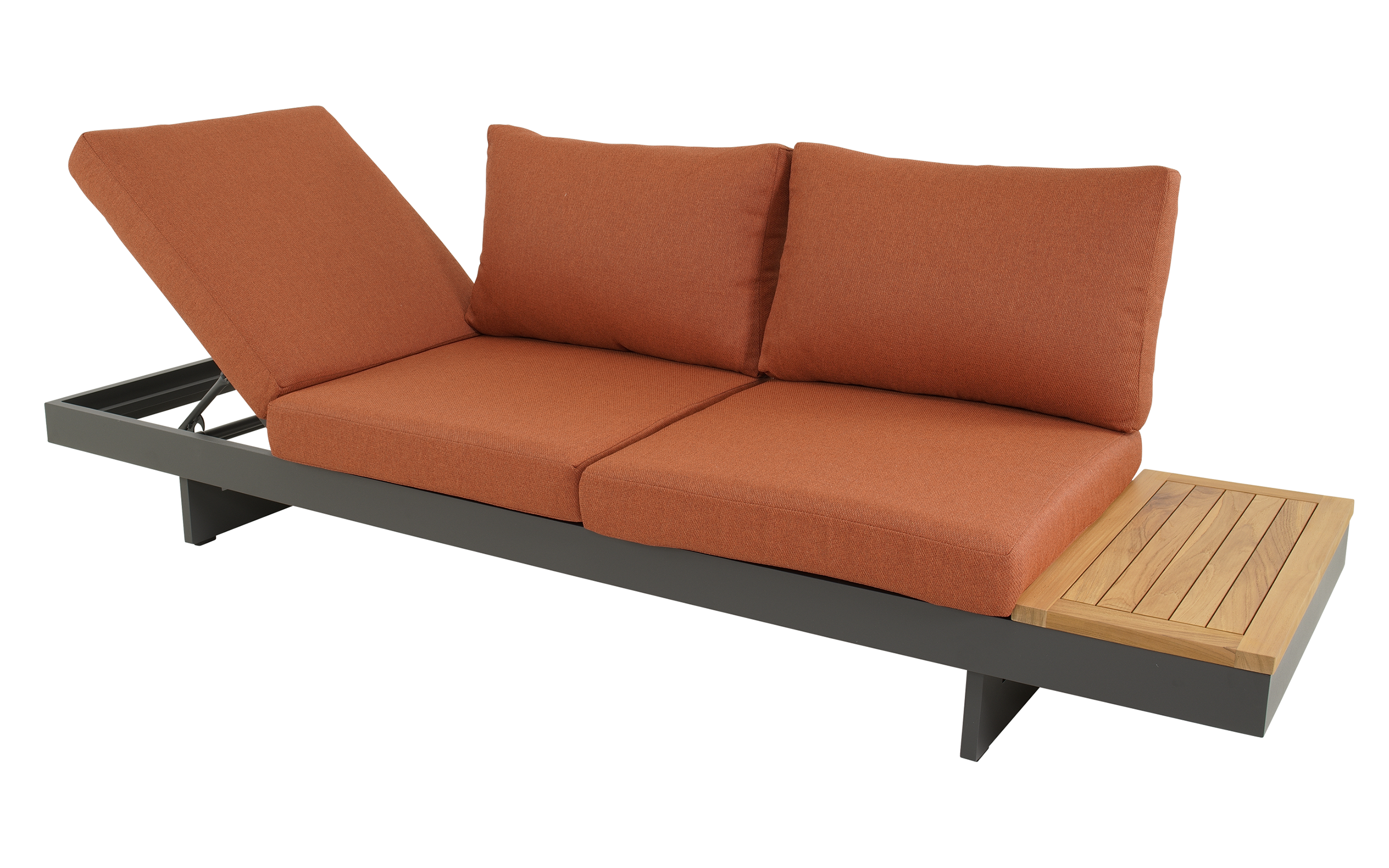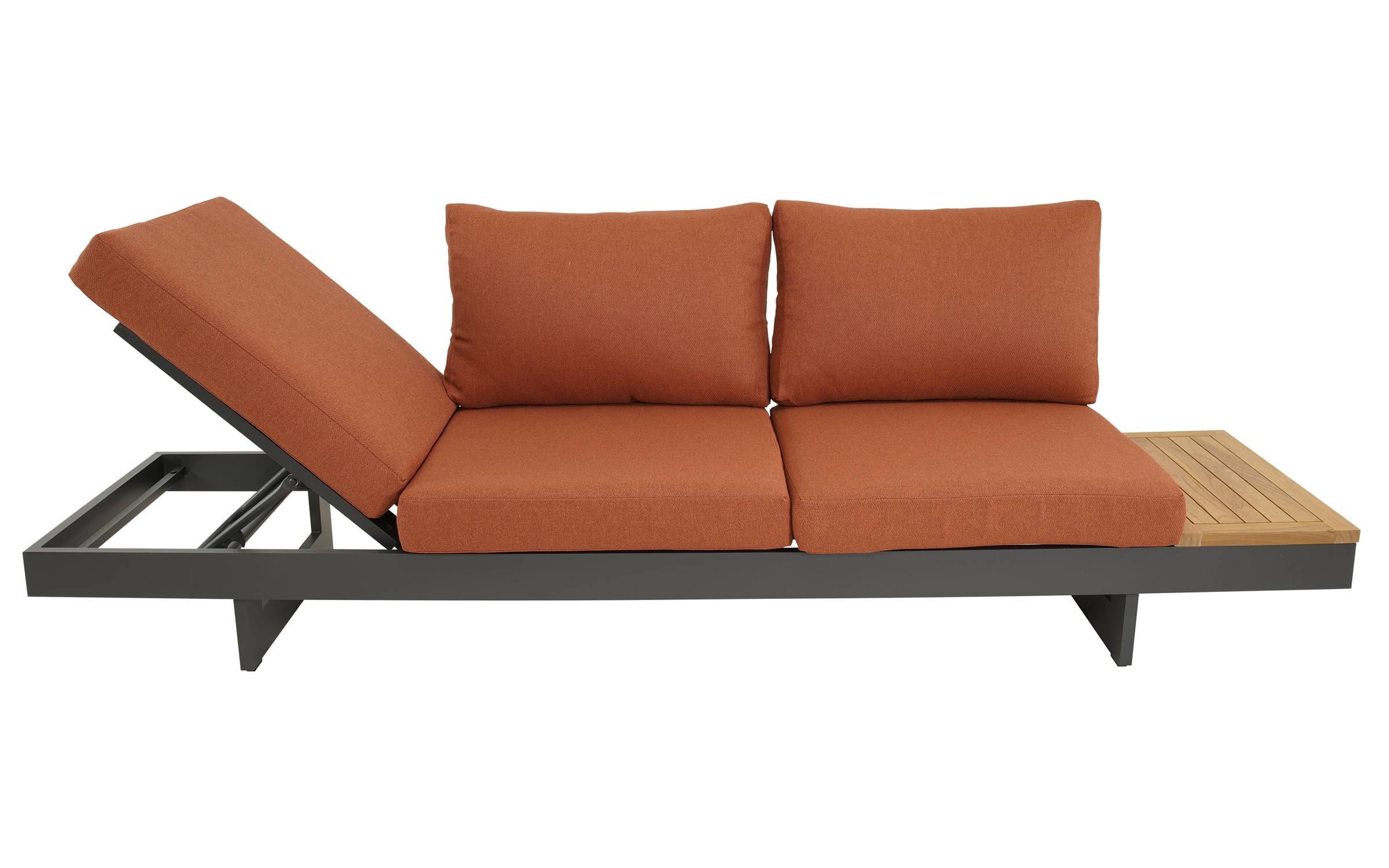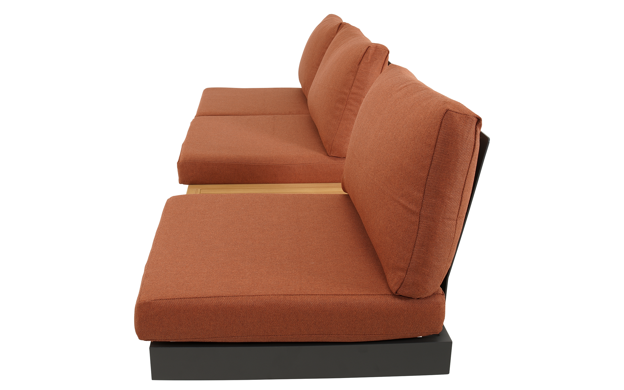 W komplecie stolik z pasującym do stolików bocznych sof blatem z drewna teakowego. W zestawie także dodatkowy metalowy stolik (nadstawka) w kolorze grafitowym. Każda z sof posiada podnoszone siedzisko z jednej strony.