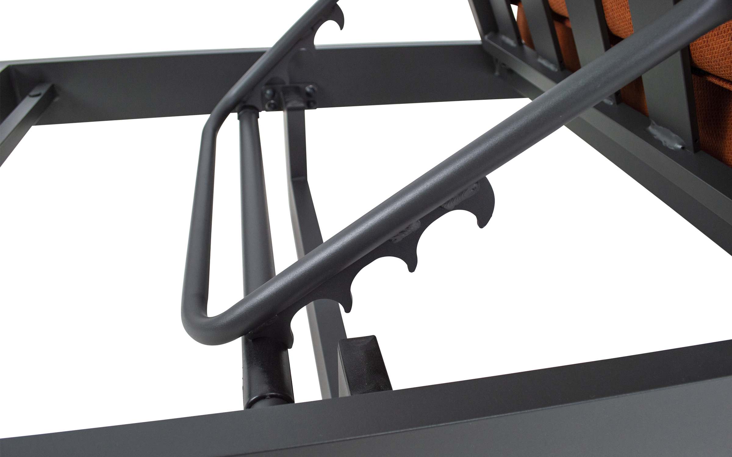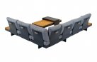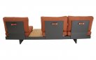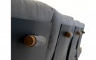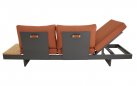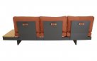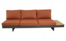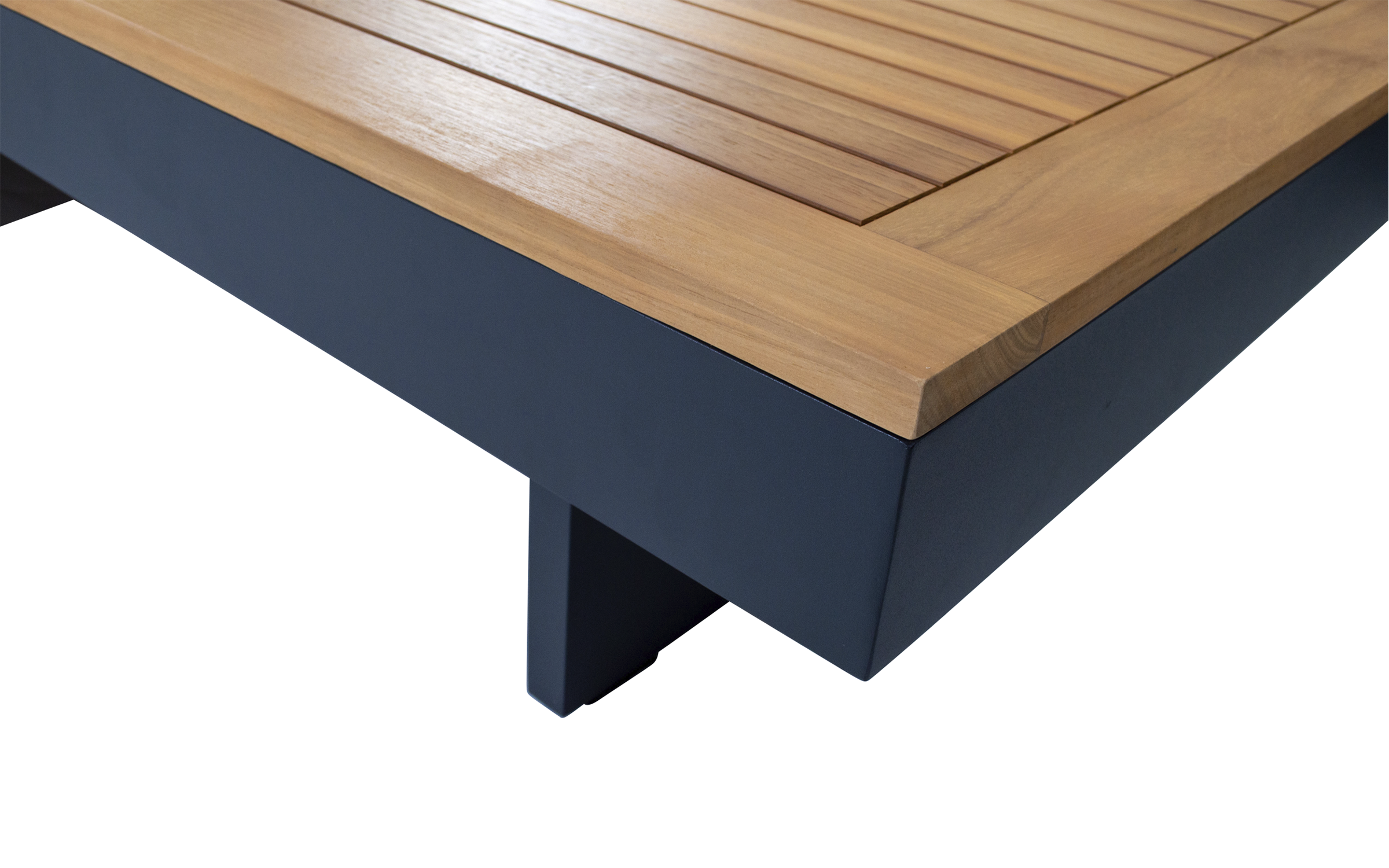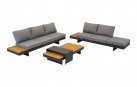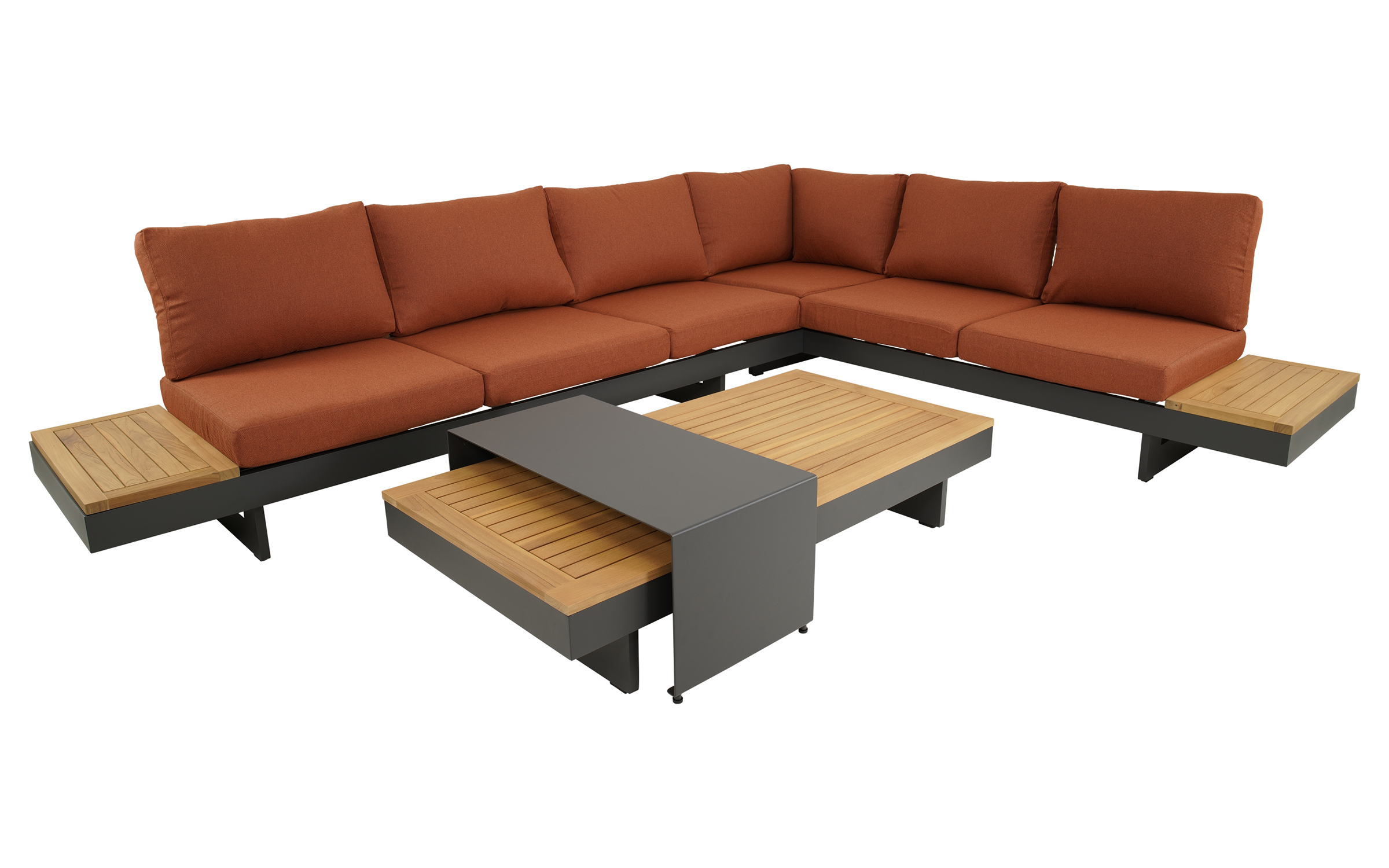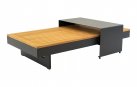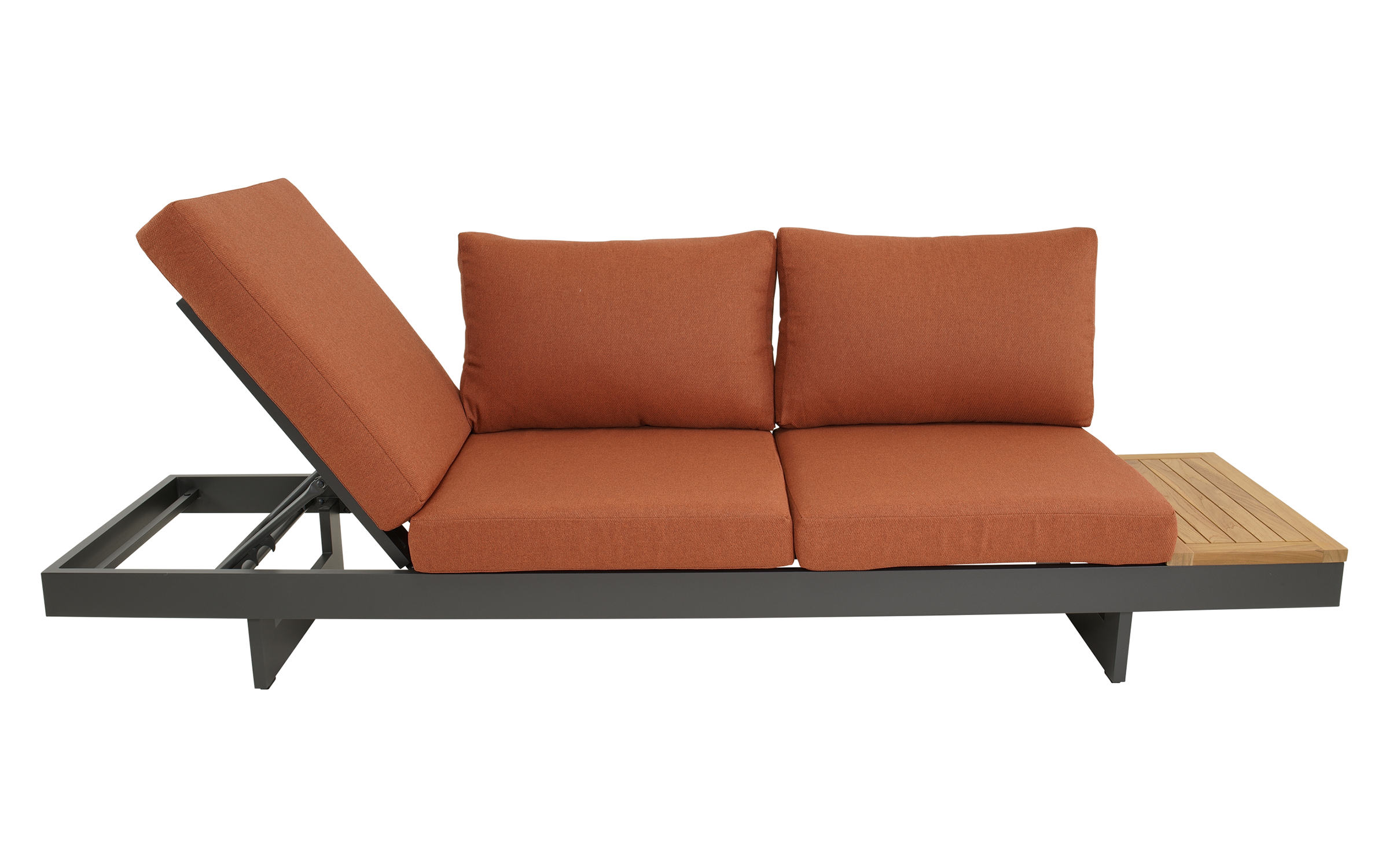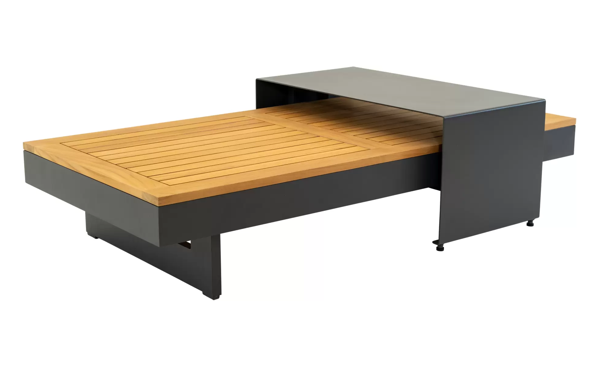 W komplecie stolik z pasującym do stolików bocznych sof blatem z drewna teakowego. W zestawie także dodatkowy metalowy stolik (nadstawka) w kolorze grafitowym. Każda z sof posiada podnoszone siedzisko z jednej strony.