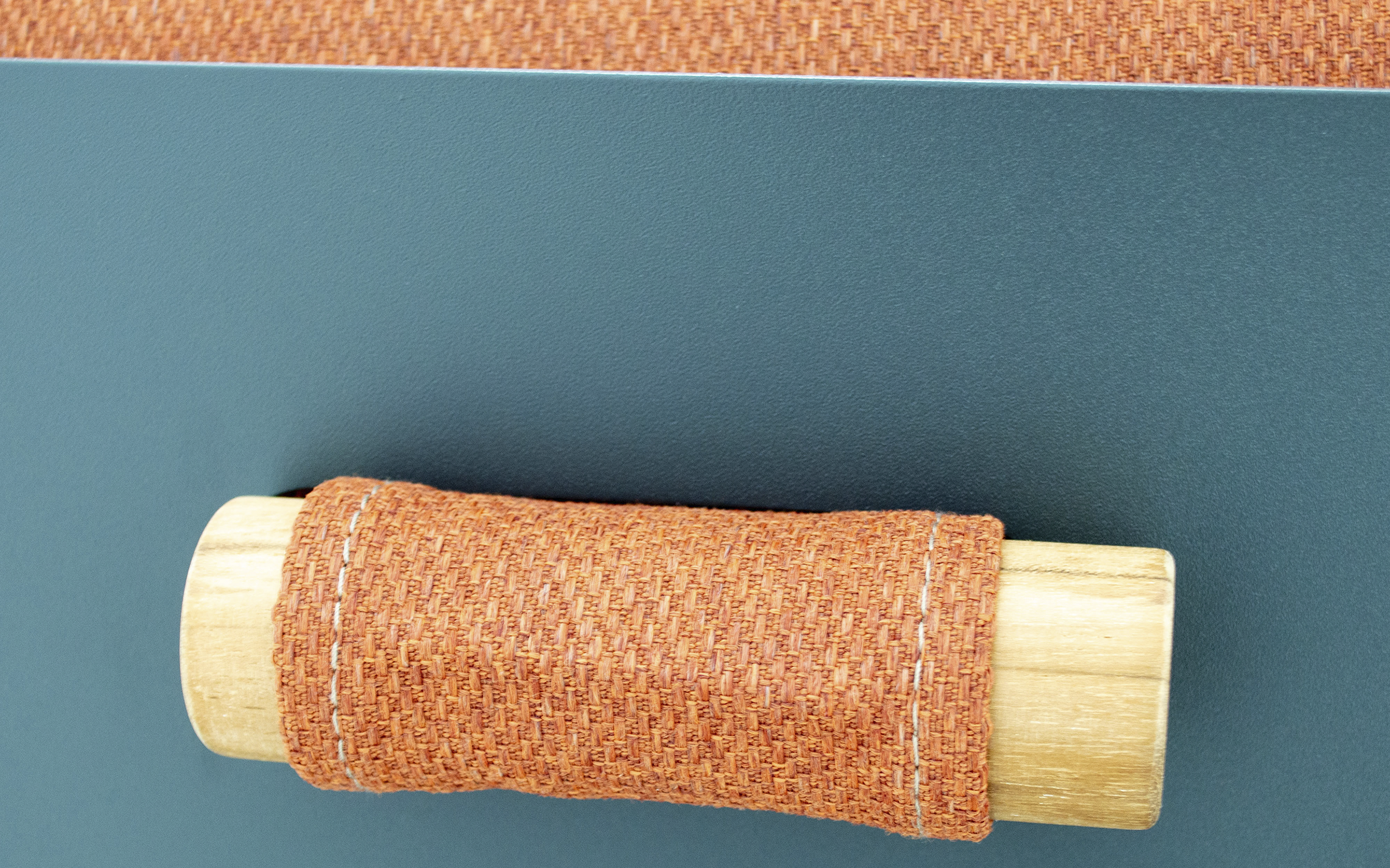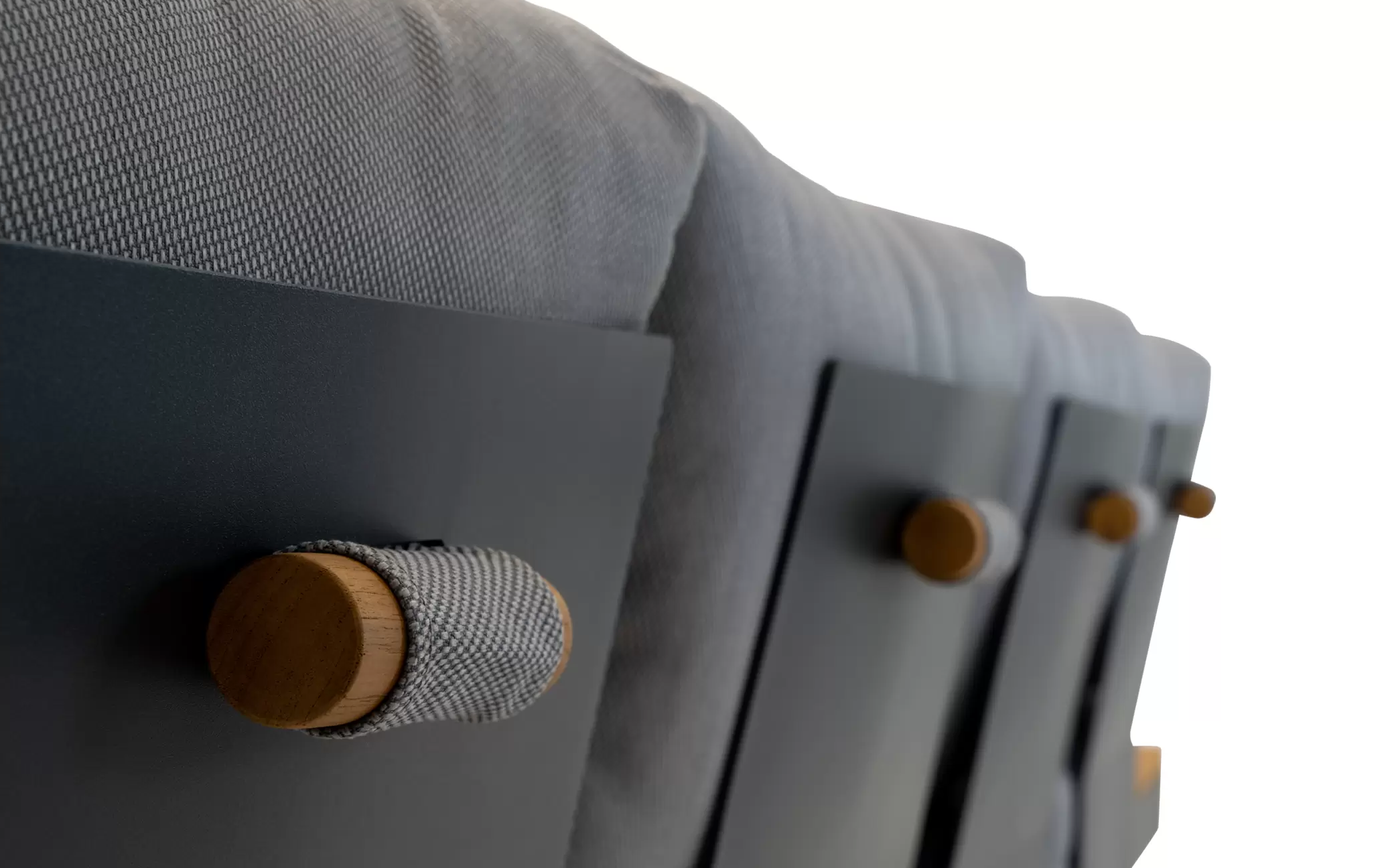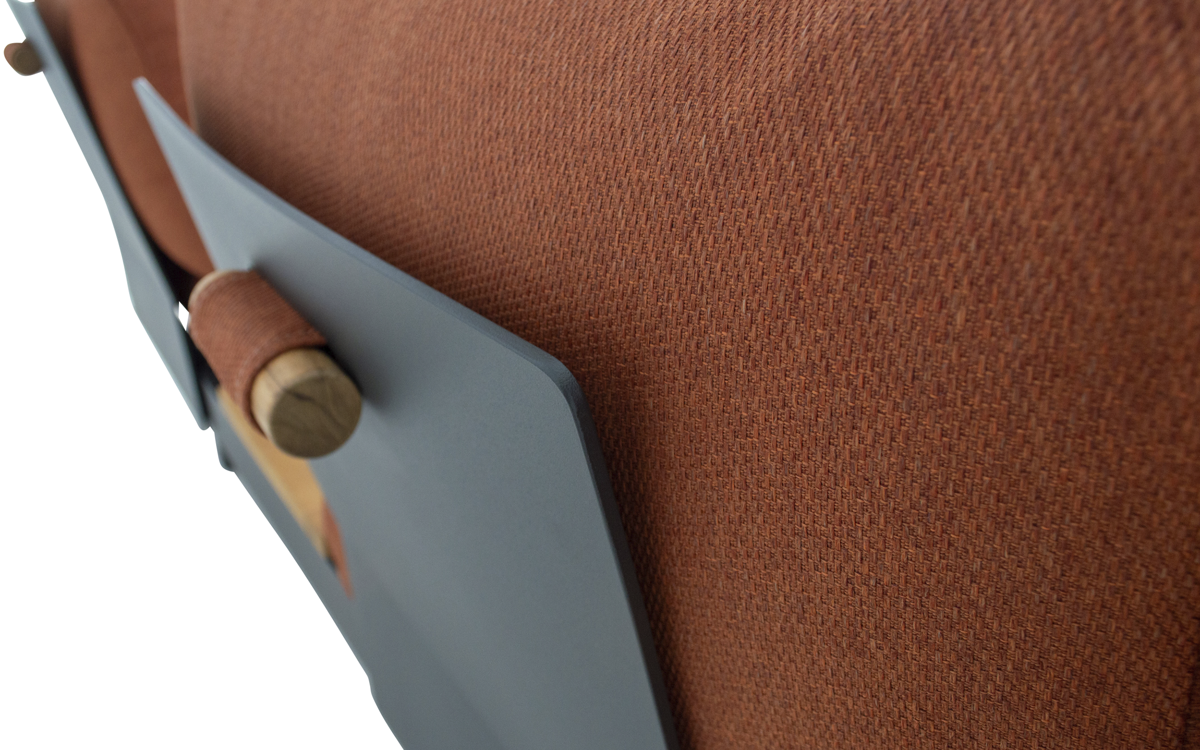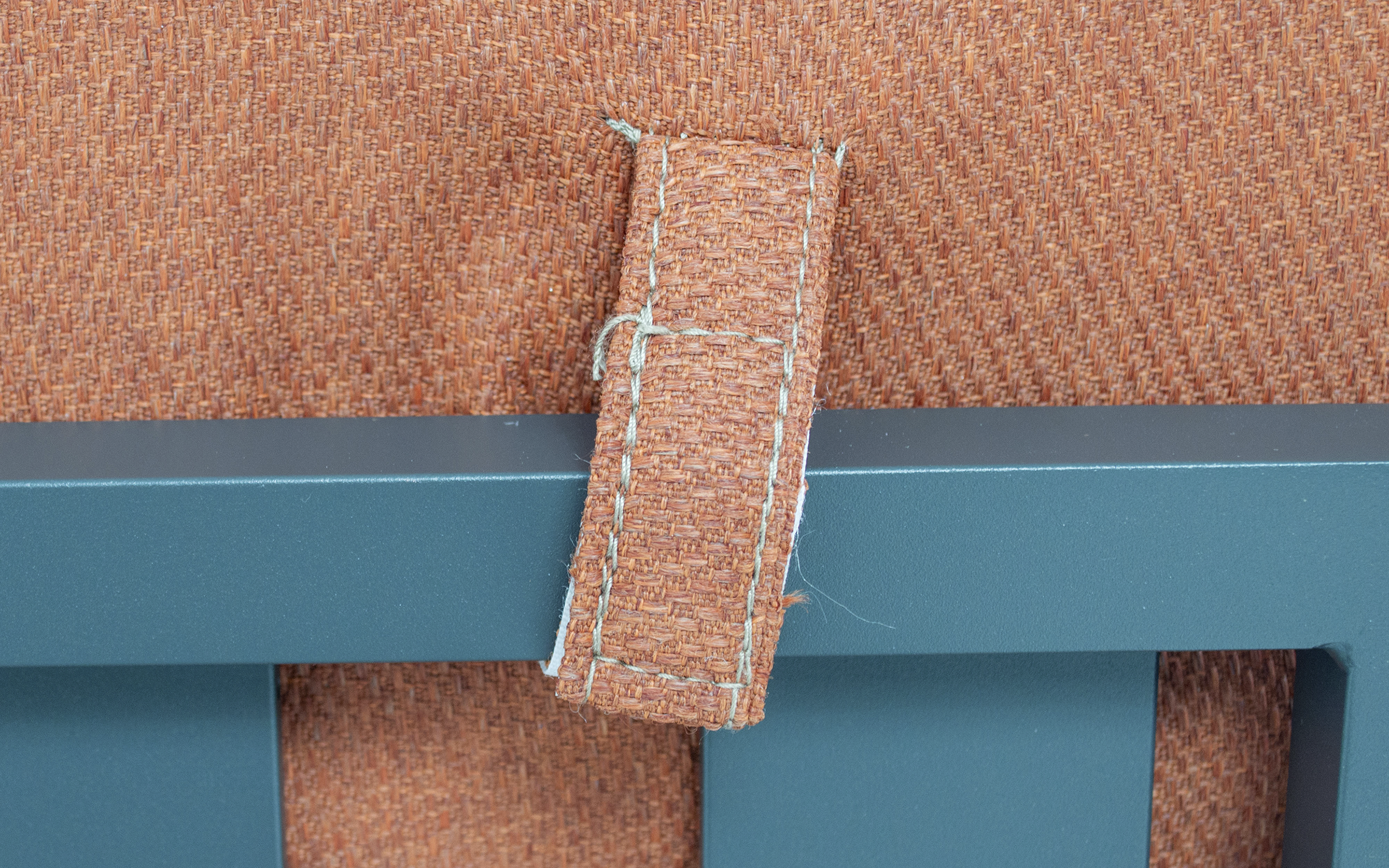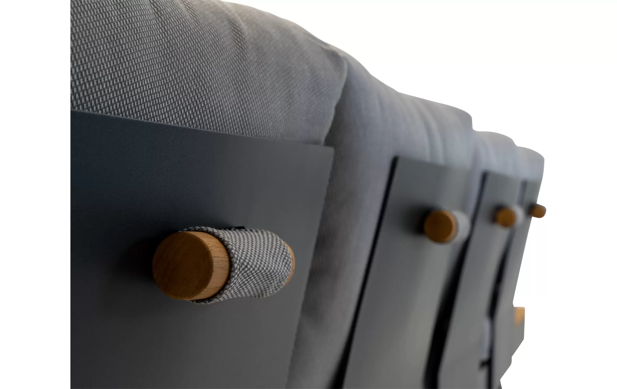 Poduszki są trwale przymocowane do oparcia za pomocą elementu poduszki przełożonego przez oparcie i eleganckich kołków z drewna.