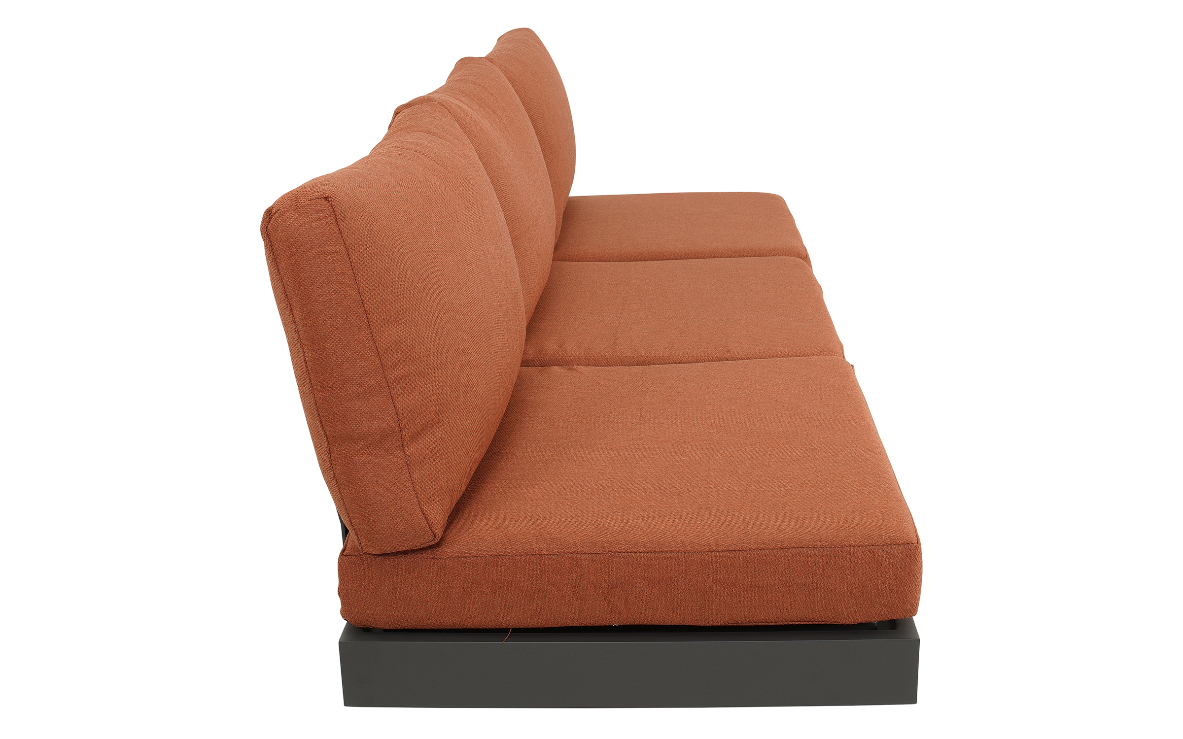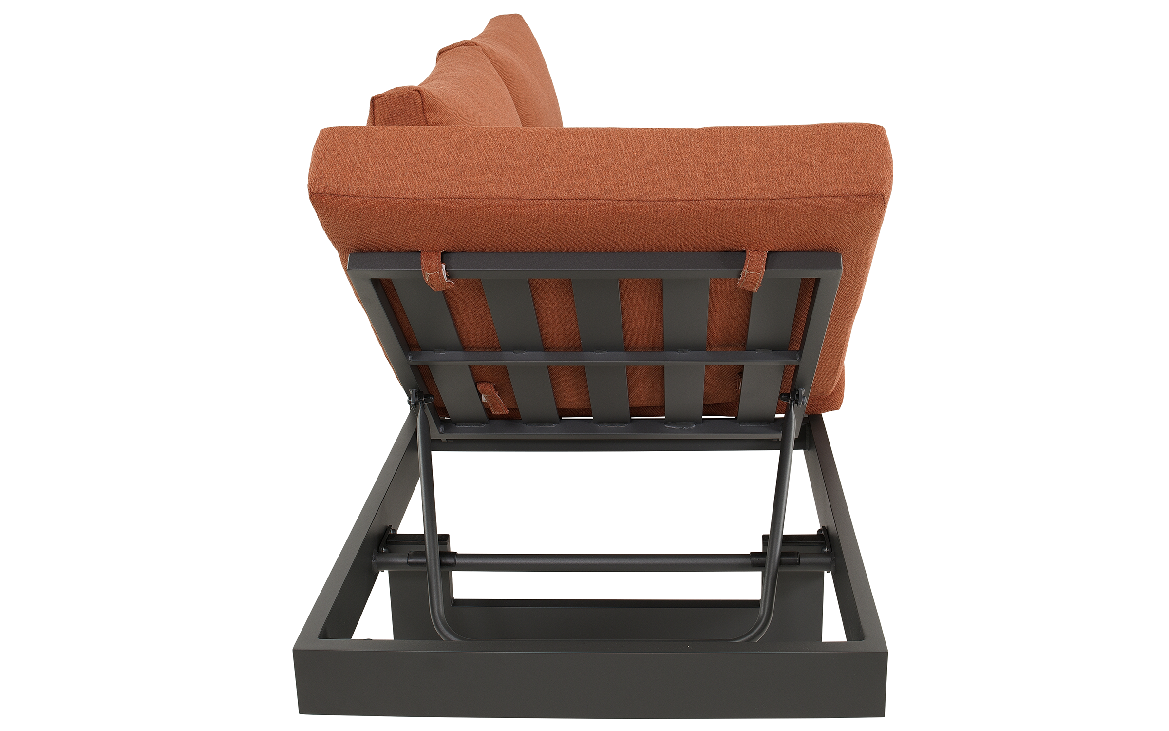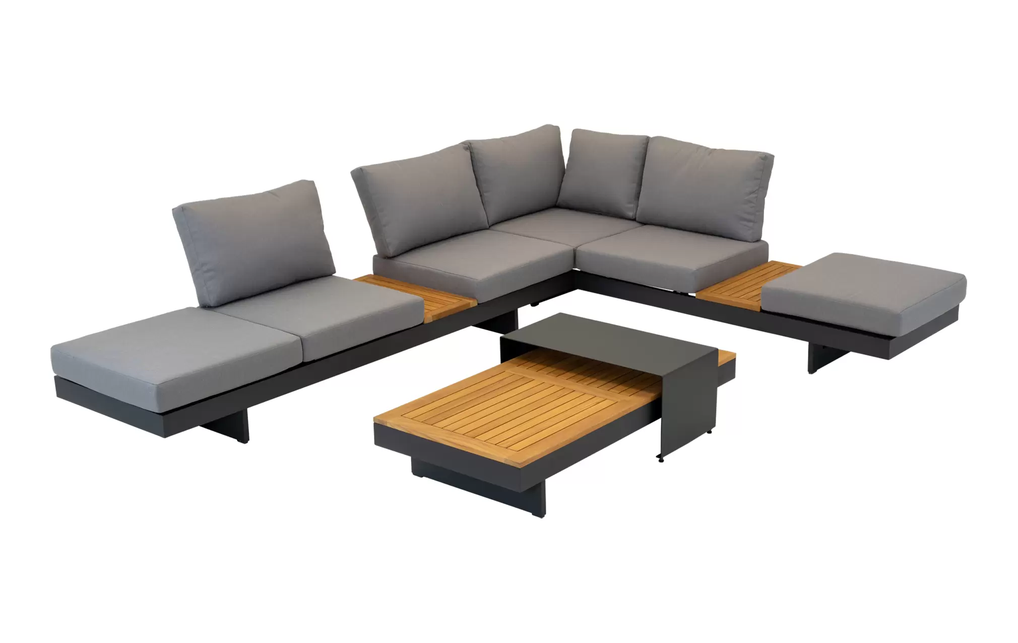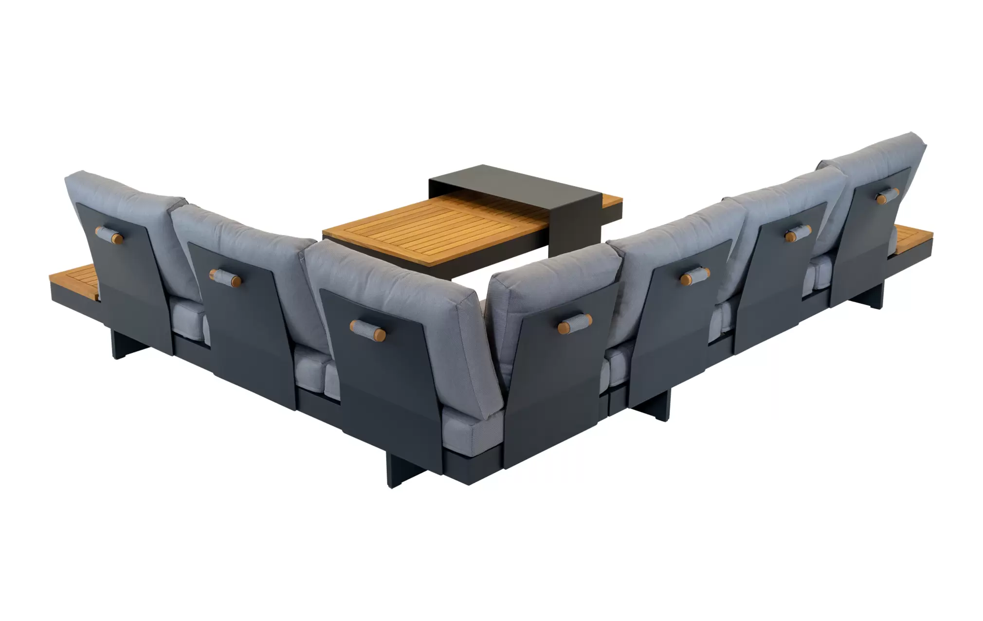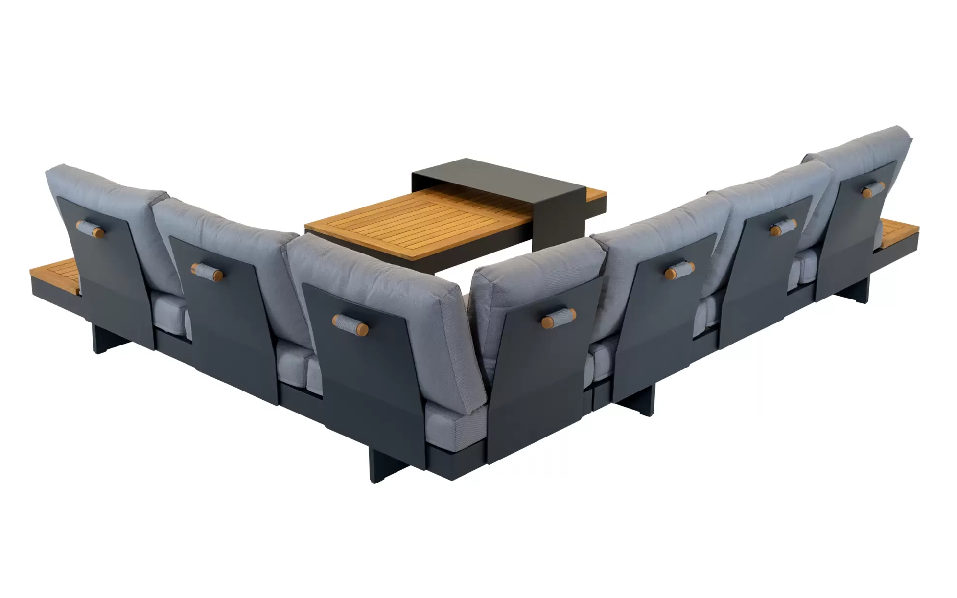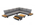 Nowoczesny narożnik ogrodowy wypoczynkowy aluminiowy grafitowy. Zestaw może być także ustawiony jako osobne 2 sofy. Oparcia można zainstalować w kilku miejscach do wyboru co pozwala na dodatkowe warianty ustawienia kompletu.