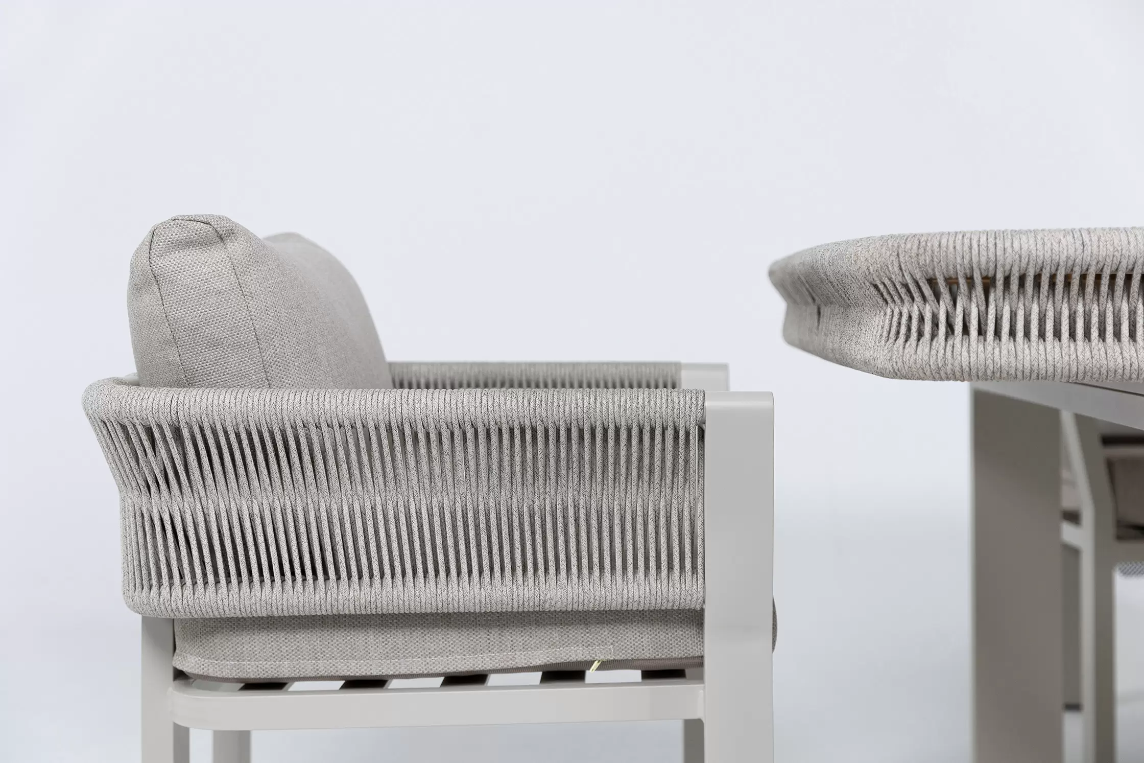 Kolekcja BORROMEO to połączenie prostoty konstrukcji aluminiowej z plecionką z liny polipropylenowej i wygodnych poduszek. Mieszanka konwencjonalnego wzornictwa z przyjemną nostalgią! Blaty z drewna teakowego.