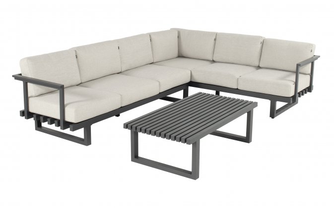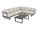 Sofa narożna ogrodowa wykonana jest z aluminium w kolorze antracytowym. Meble są prawie bezobsługowe i spełnią w 100% wszystko, czego oczekujesz od takiego zestawu ogrodowego.