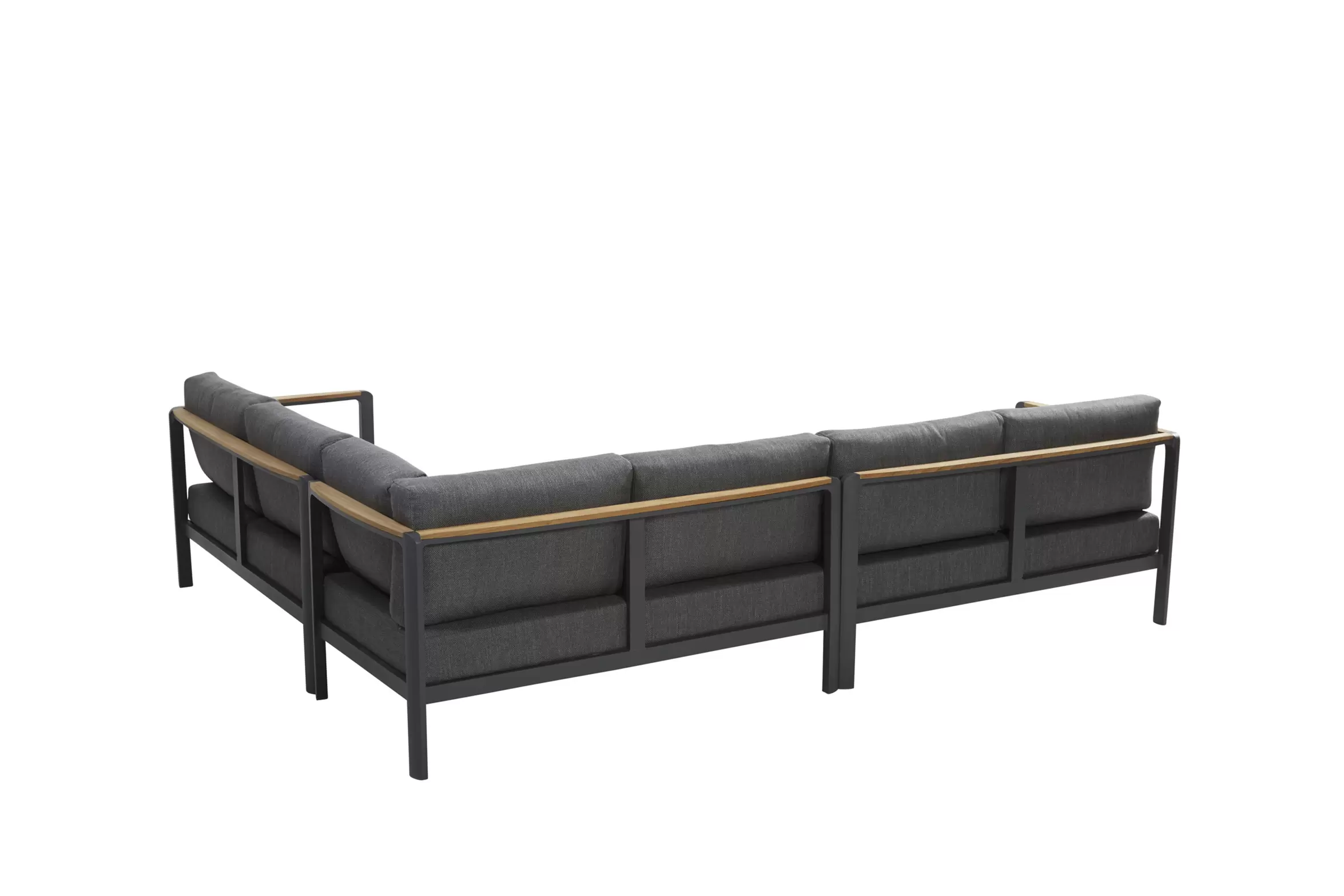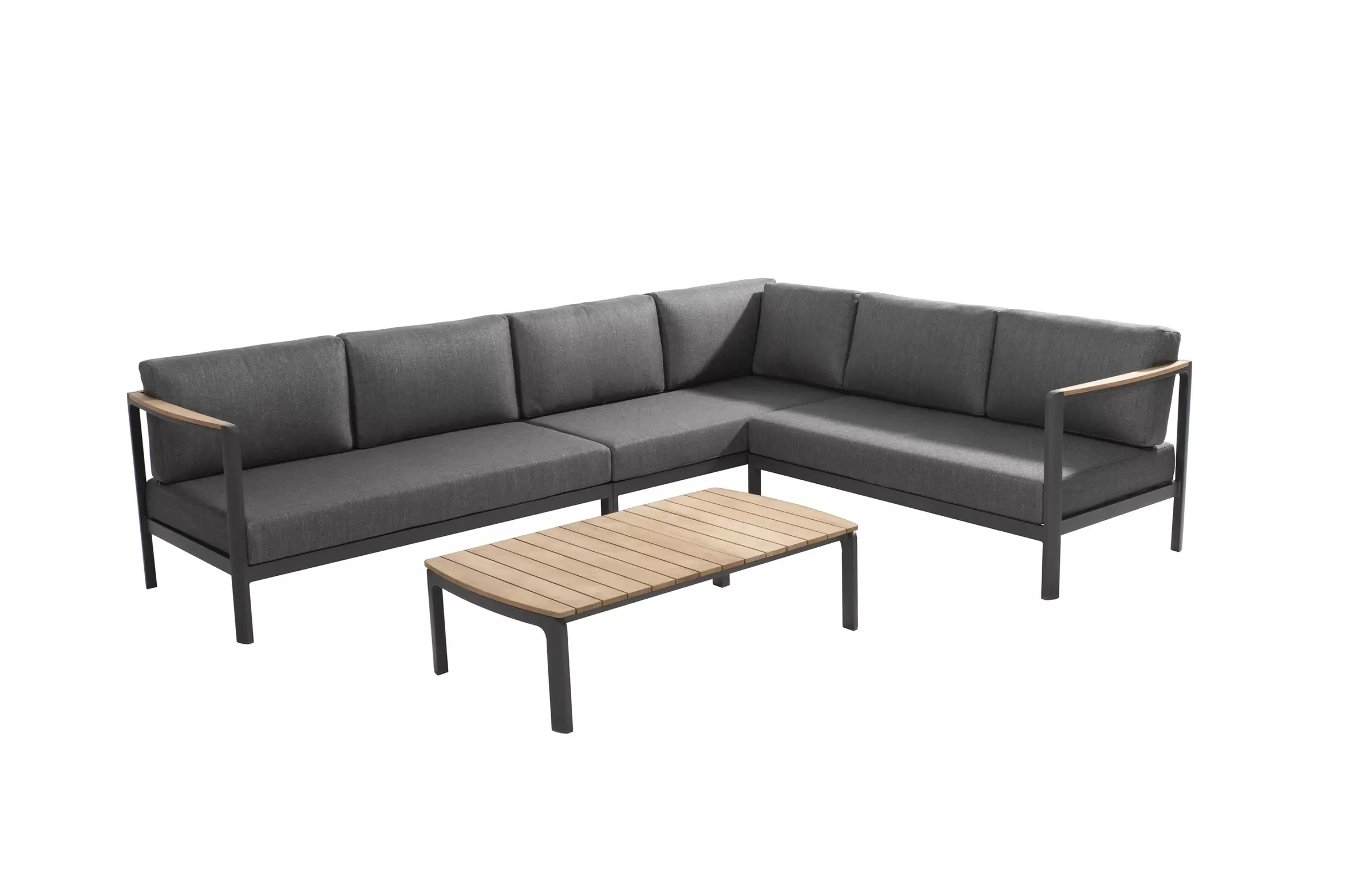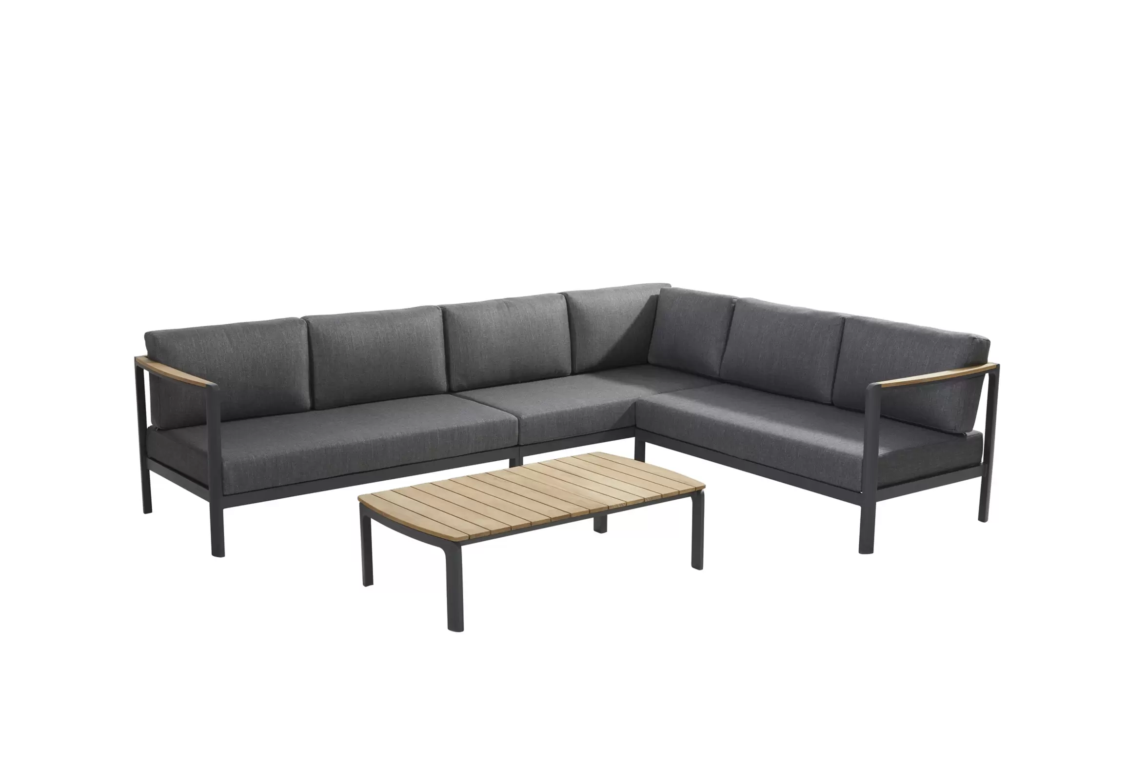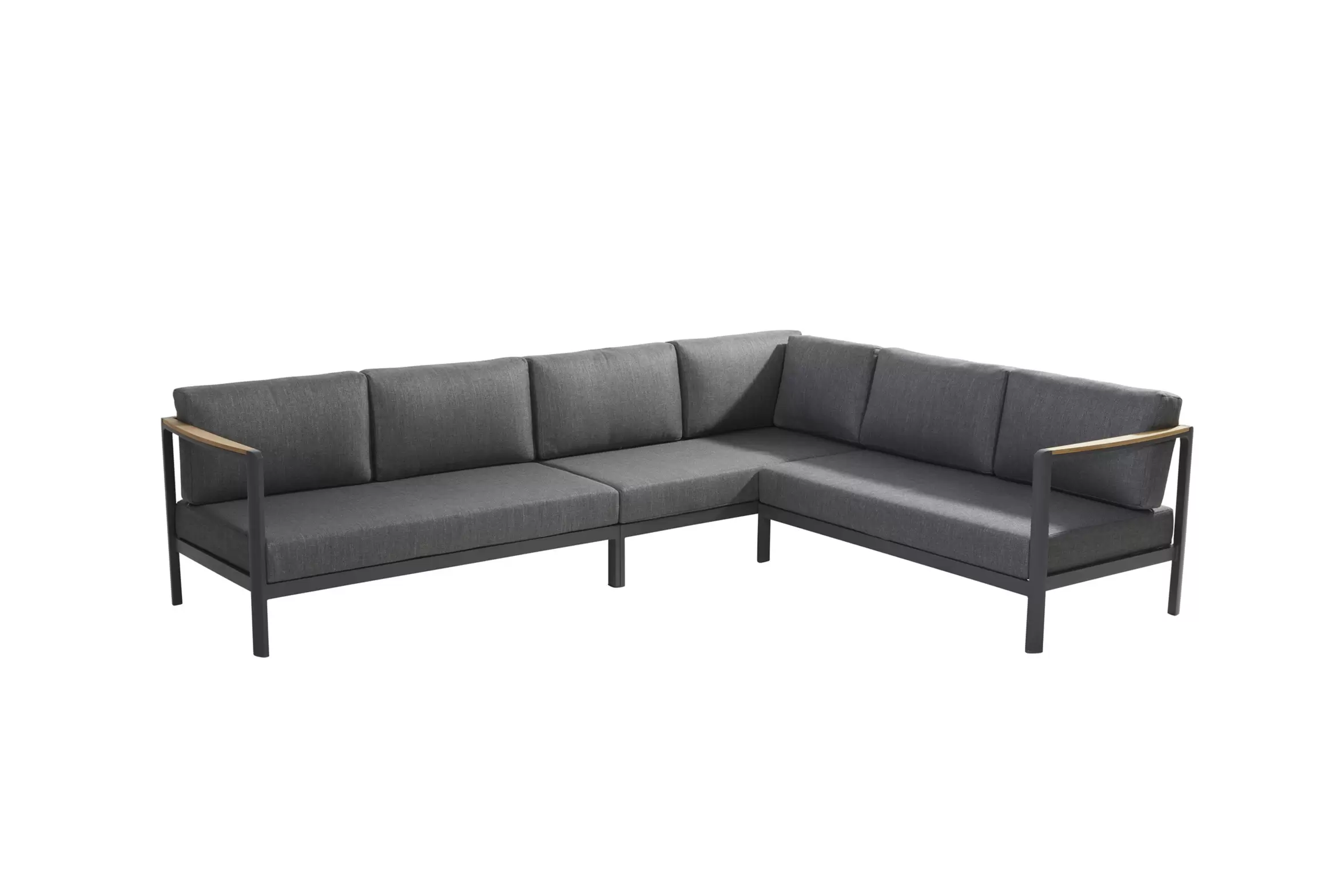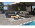 Zestaw wypoczynkowy Cortina od Taste 4SO to modułowa sofa narożna, która wyróżnia się subtelnymi akcentami teaku i eleganckimi krzywiznami. Cortina jest wykonana z malowanego proszkowo aluminium, dzięki czemu jest odporna na warunki atmosferyczne i nie wymaga konserwacji. Narożnik Cortina jest wykończony ekologicznym drewnem tekowym na podłokietnikach, nadając dzięki zestawowi Cortina luksusowy wygląd Twojemu tarasowi.