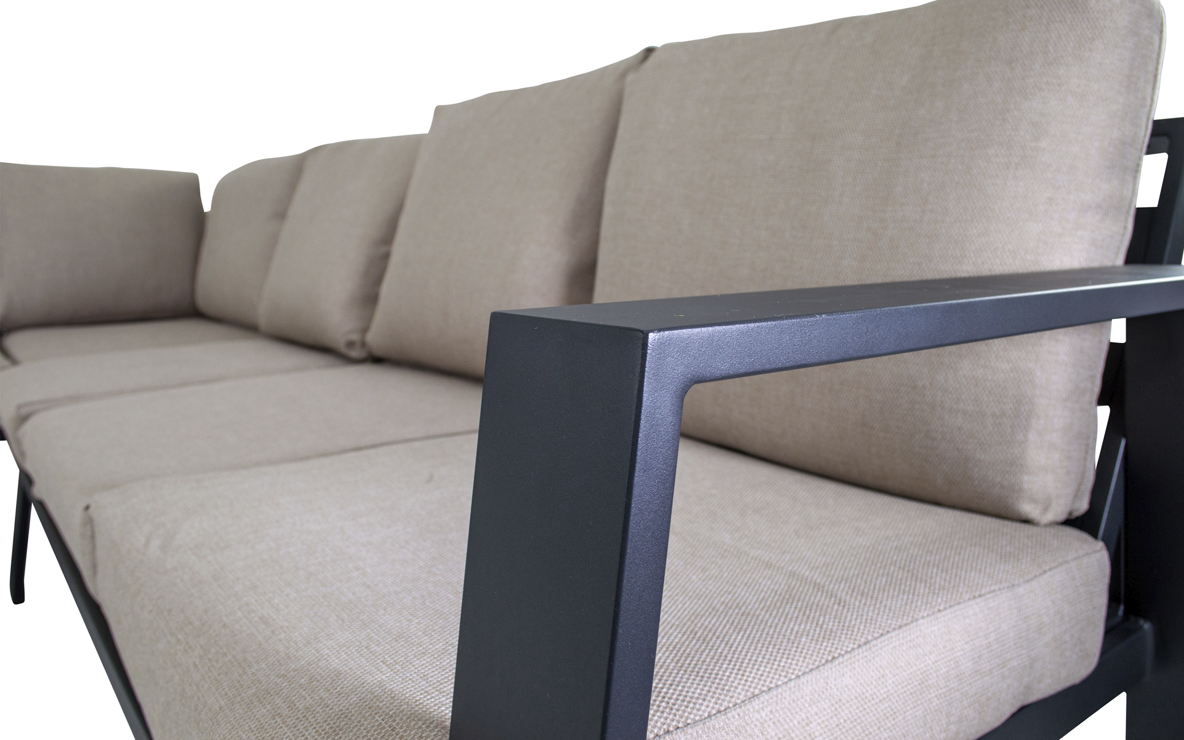 Narożnik ogrodowy ESTORIL marki LesliLiving to funkcjonalny zestaw wypoczynkowy przeznaczony do użytku na tarasie nawet w formie zestawu obiadowego dzięki stosunkowo wysokiemu siedzisku. Składa się z dwóch sof: 3‑osobowej narożnej oraz 3‑osobowej z jednym podłokietnikiem. Konstrukcja wykonana z aluminium malowanego proszkowo w kolorze matowego antracytu zapewnia trwałość i odporność na warunki atmosferyczne. Poduszki w kolorze beżowym wykonane są z tkaniny Olefin o gramaturze 240 g/m², odpornej na wilgoć, promieniowanie UV i zabrudzenia. Dzięki temu narożnik ESTORIL łączy komfort użytkowania z nowoczesnym designem i łatwą pielęgnacją.