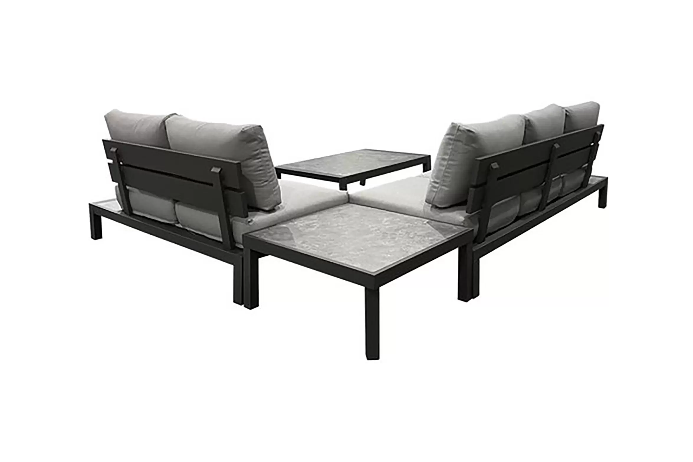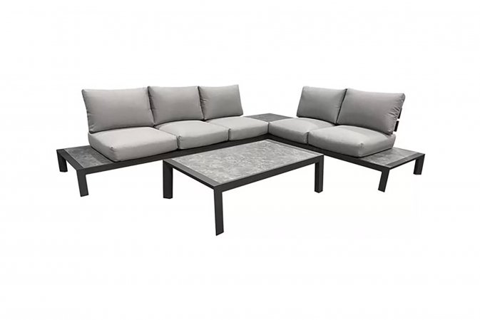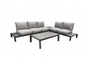 Wysokiej jakości zestaw wypoczynkowy z matową aluminiową ramą z jasnoszarą tapicerką. Grube poduszki i najnowocześniejsza stylizacja dla Twojego domu.