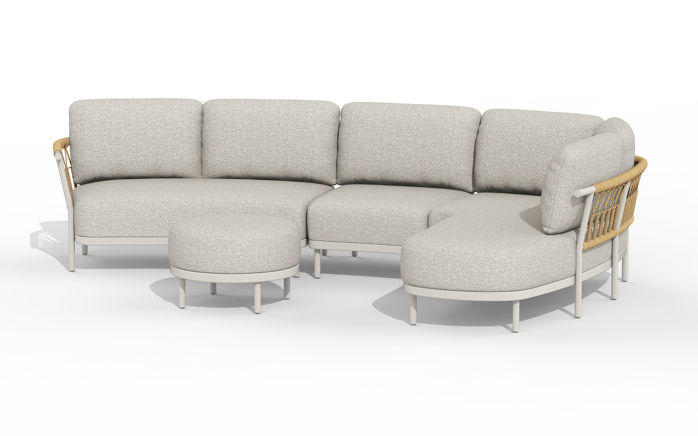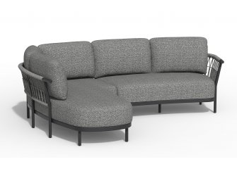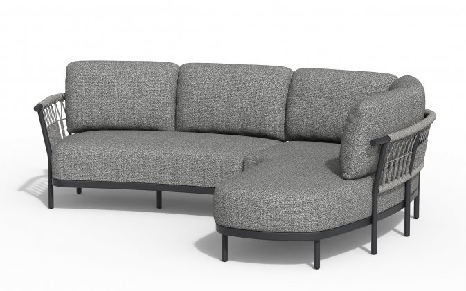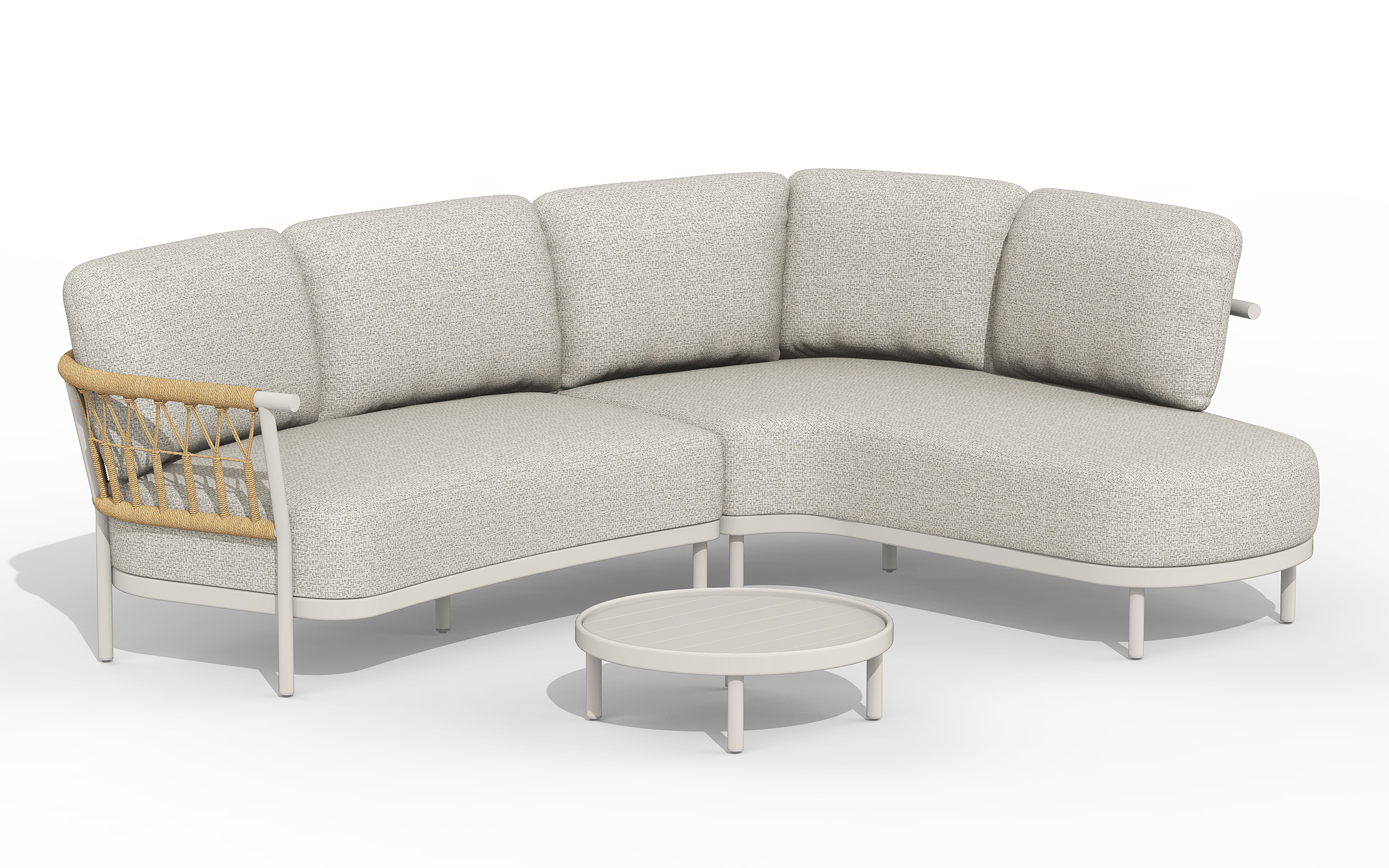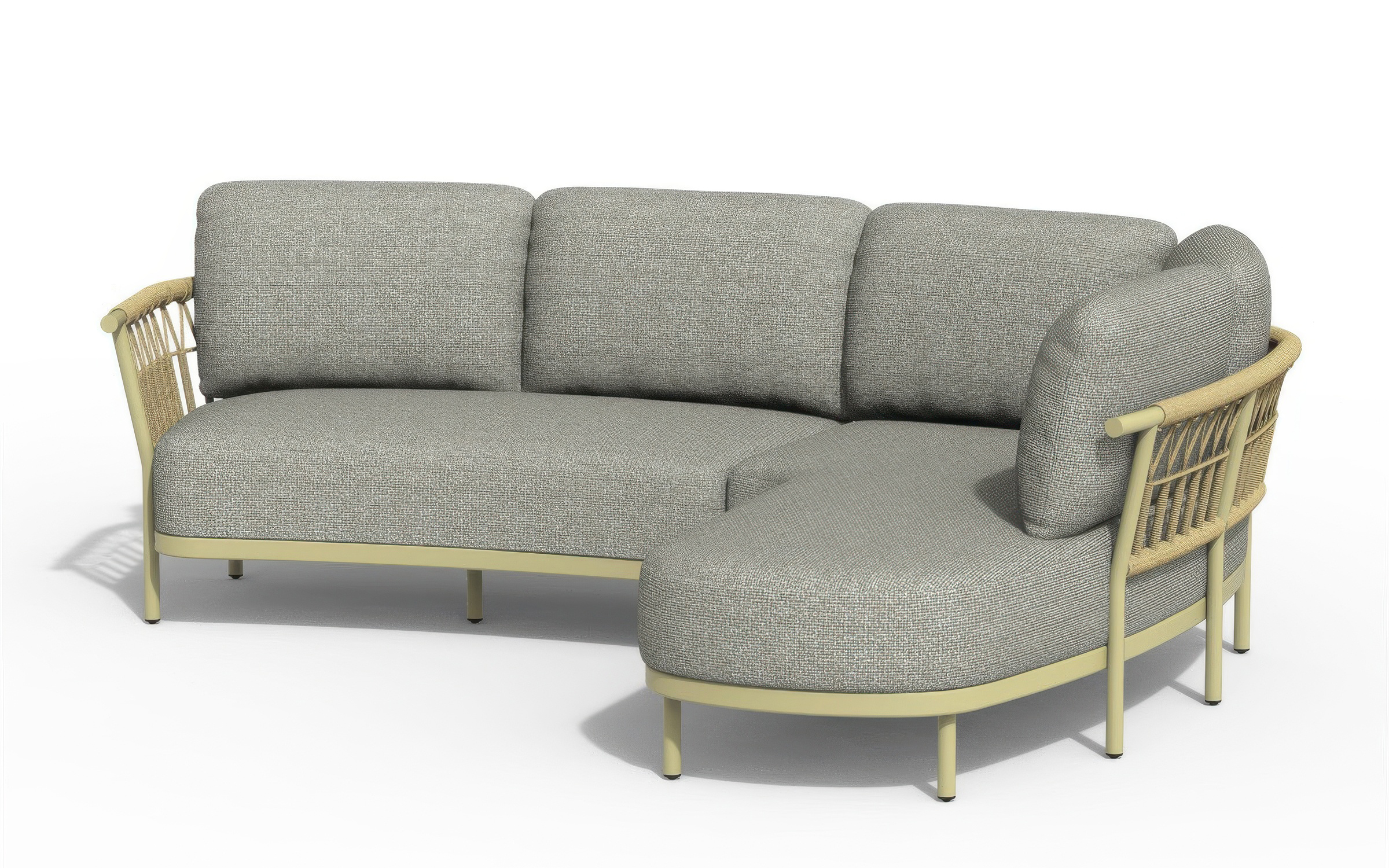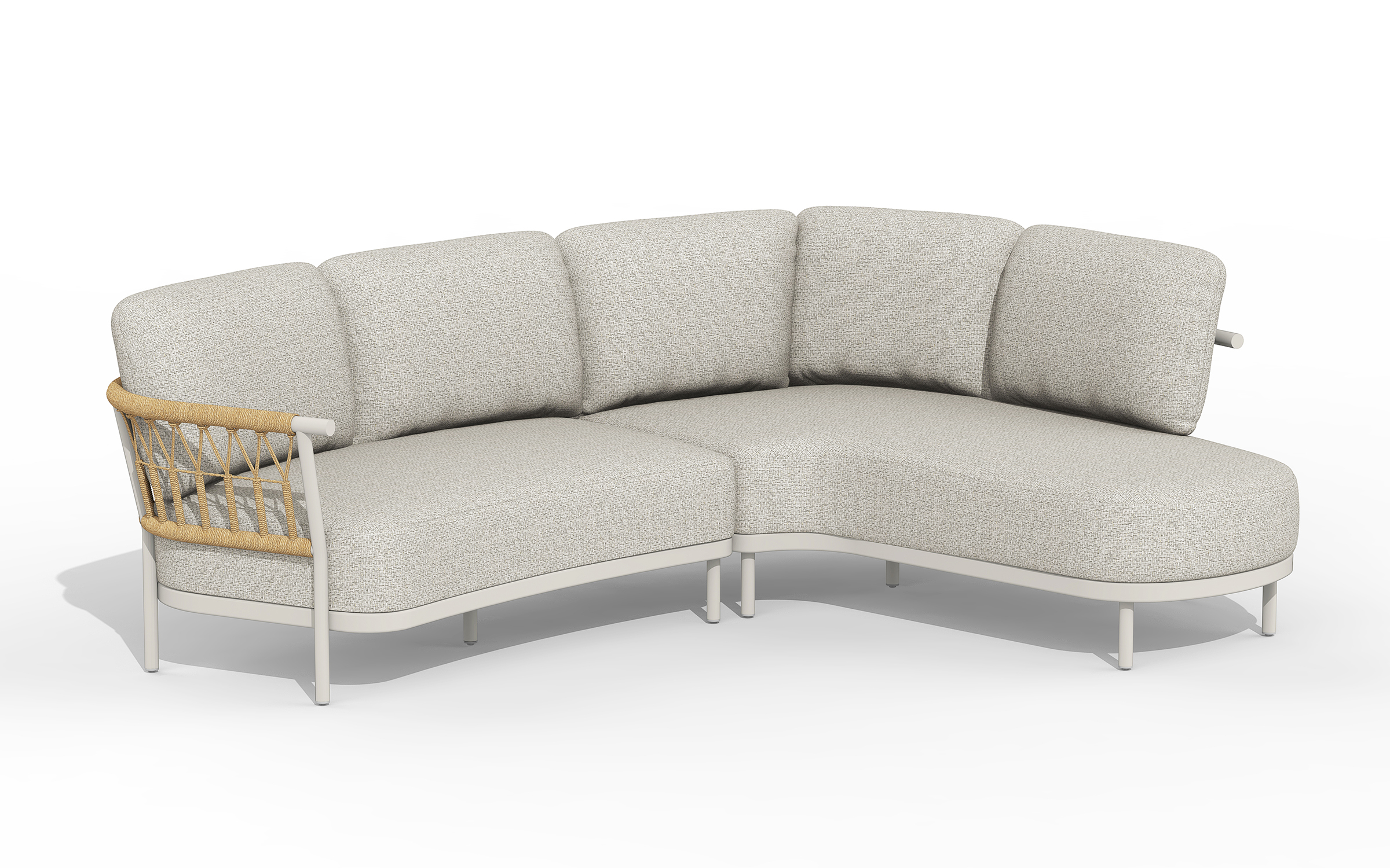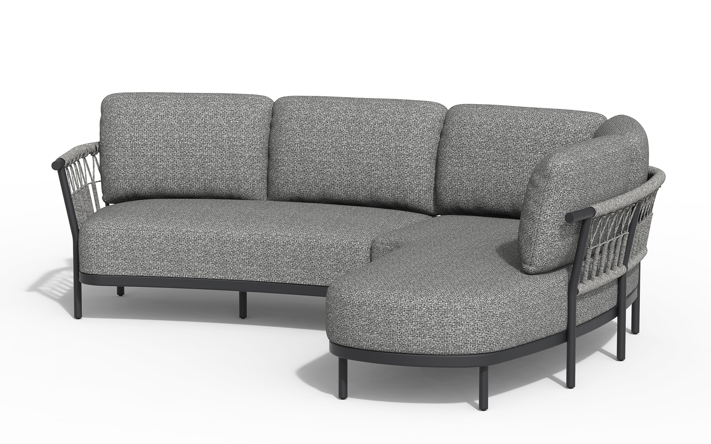 Zestaw wypoczynkowy Fresca Organic Prawy to prawdziwa perełka na tarasie dzięki swoim okrągłym, organicznym kształtom. Nowoczesna kanapa wypoczynkowa z szezlongiem od Tierra Outdoor składa się z aluminiowej ramy i jest wyposażona w grube, wygodne poduszki. Poduszki wykonane są z tkaniny Swiss Fabric Olefin, która rewelacyjnie znosi deszcz.