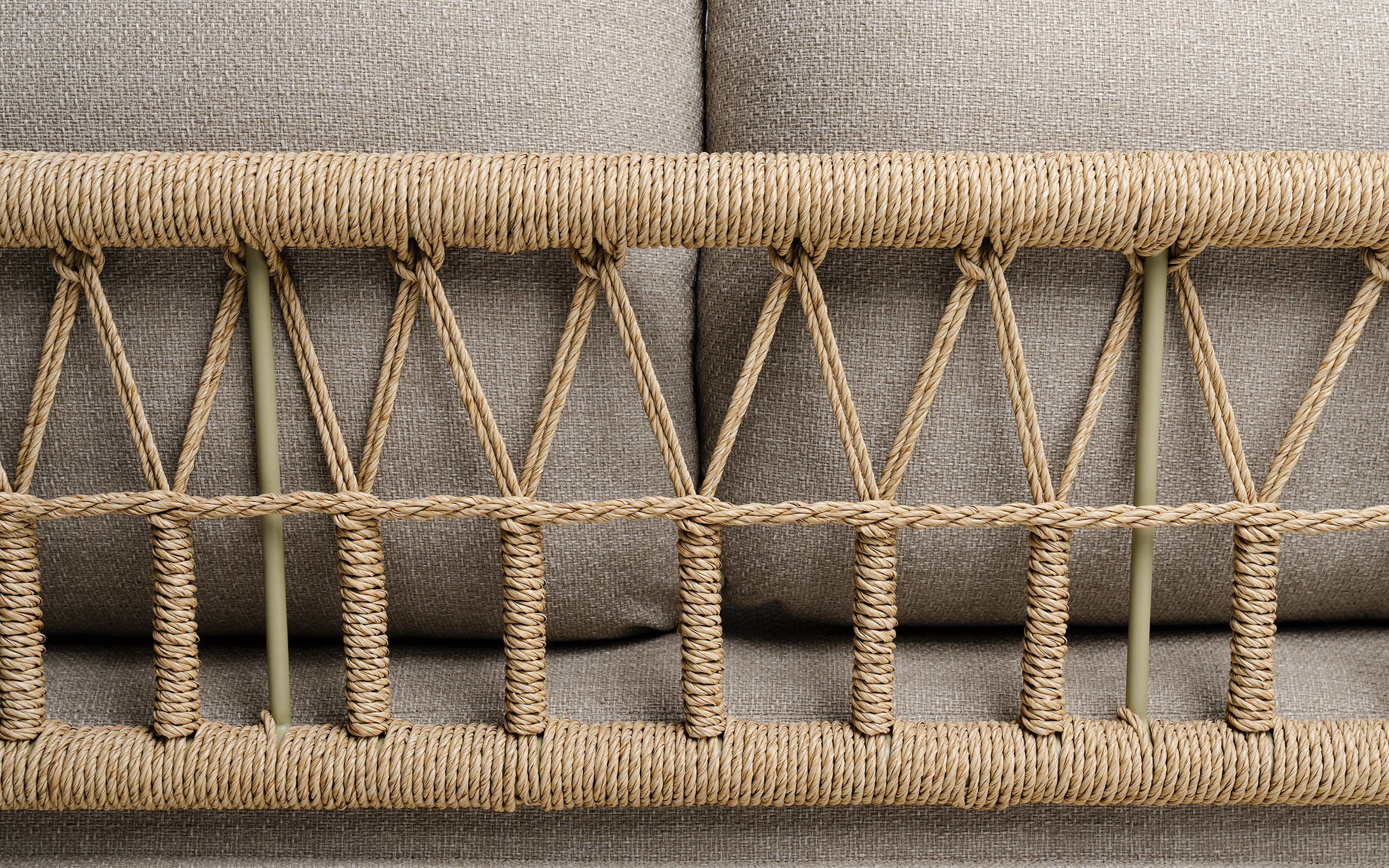 Boki i oparcie oplecione technorattanem zwijanym imitacja liści bananowca, wodoodporne i odporne na uv.
