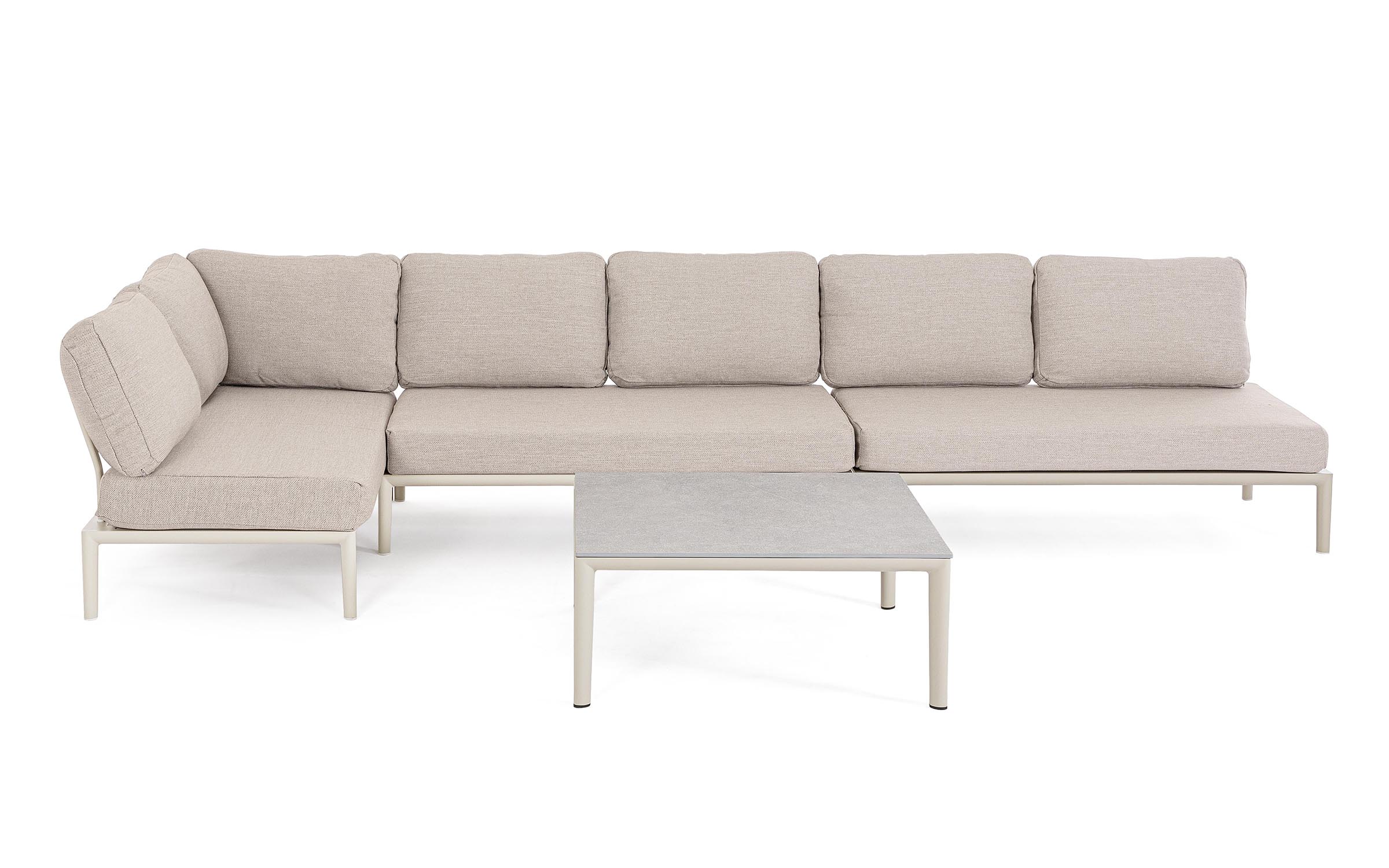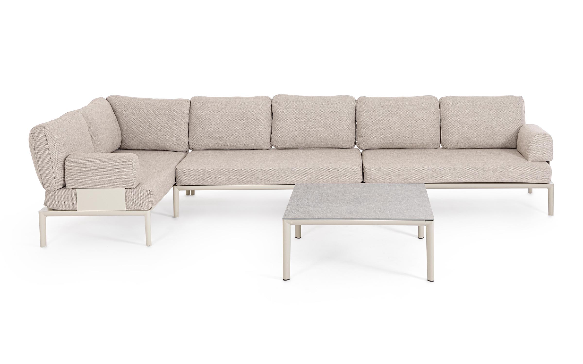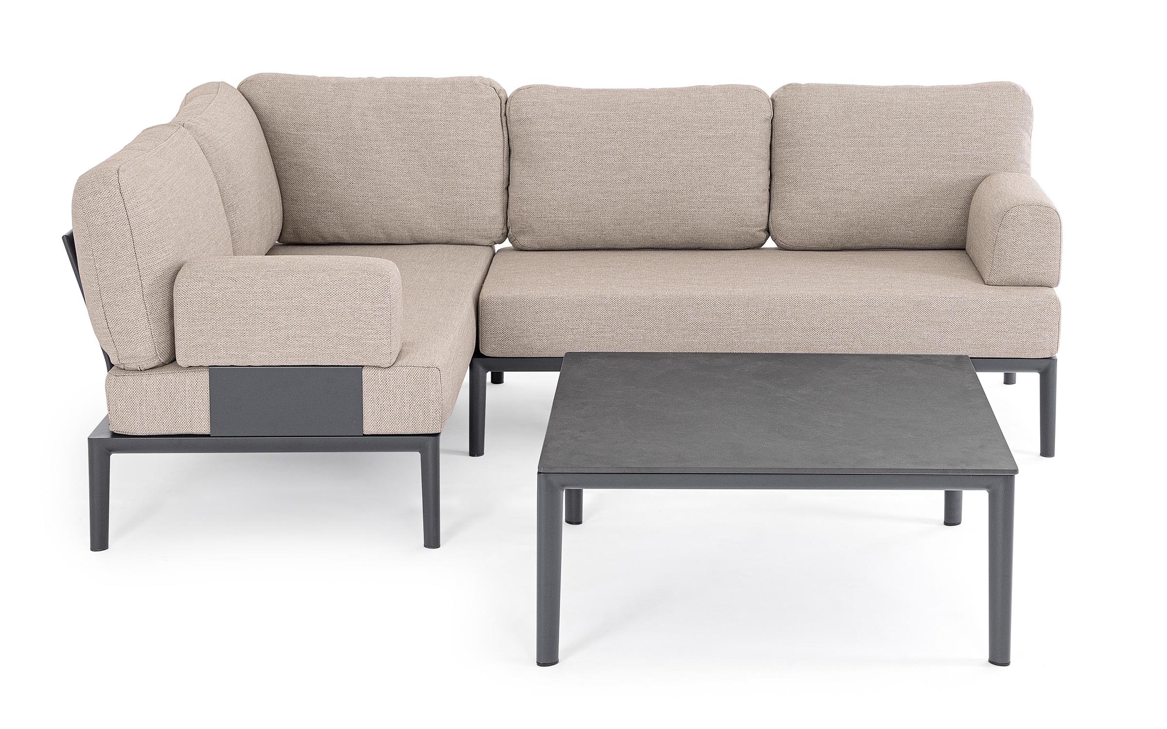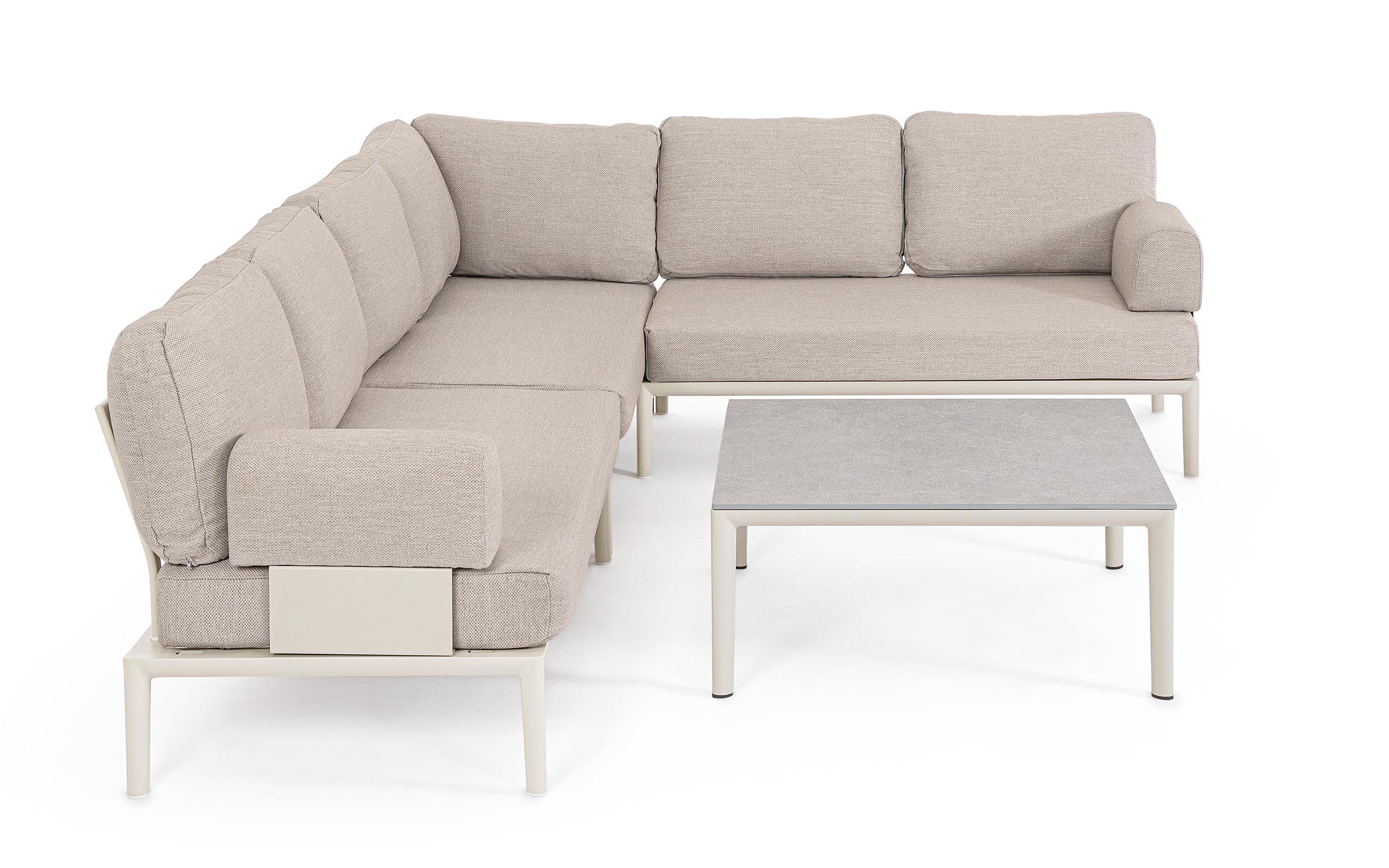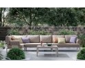 Kolekcja elementów, z których można tworzyć dowolne kompozycje mebli ogrodowych: narożników, sofy czy zestawów wypoczynkowych. Lekka konstrukcja i grube poduszki szarobeżowe z obiciem z materiału Olefin. Stolik z blatem ze spiekanego kamienia.