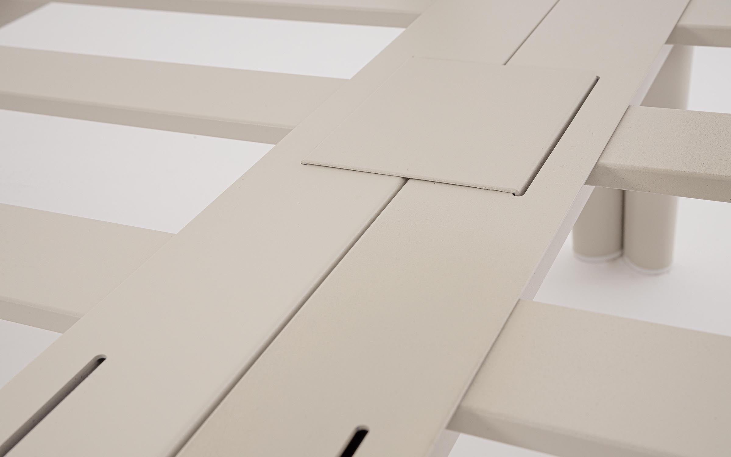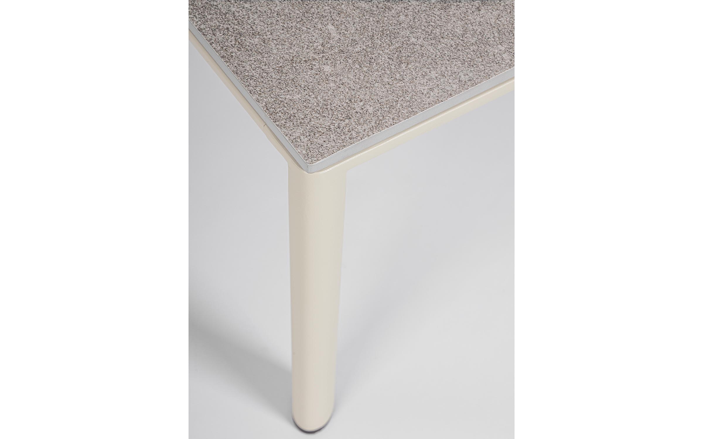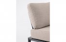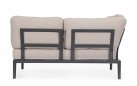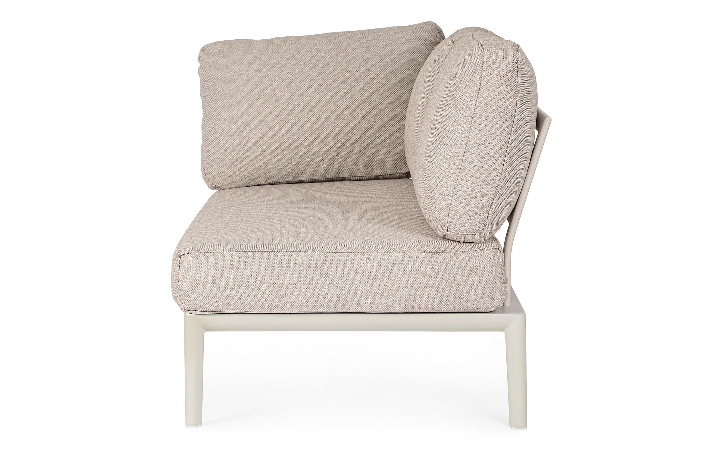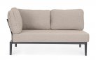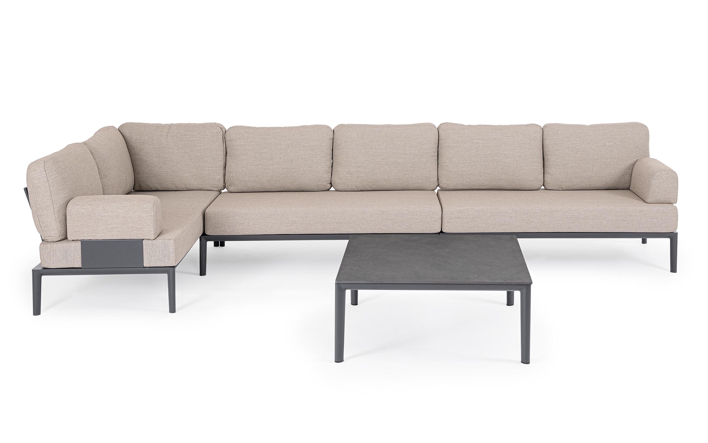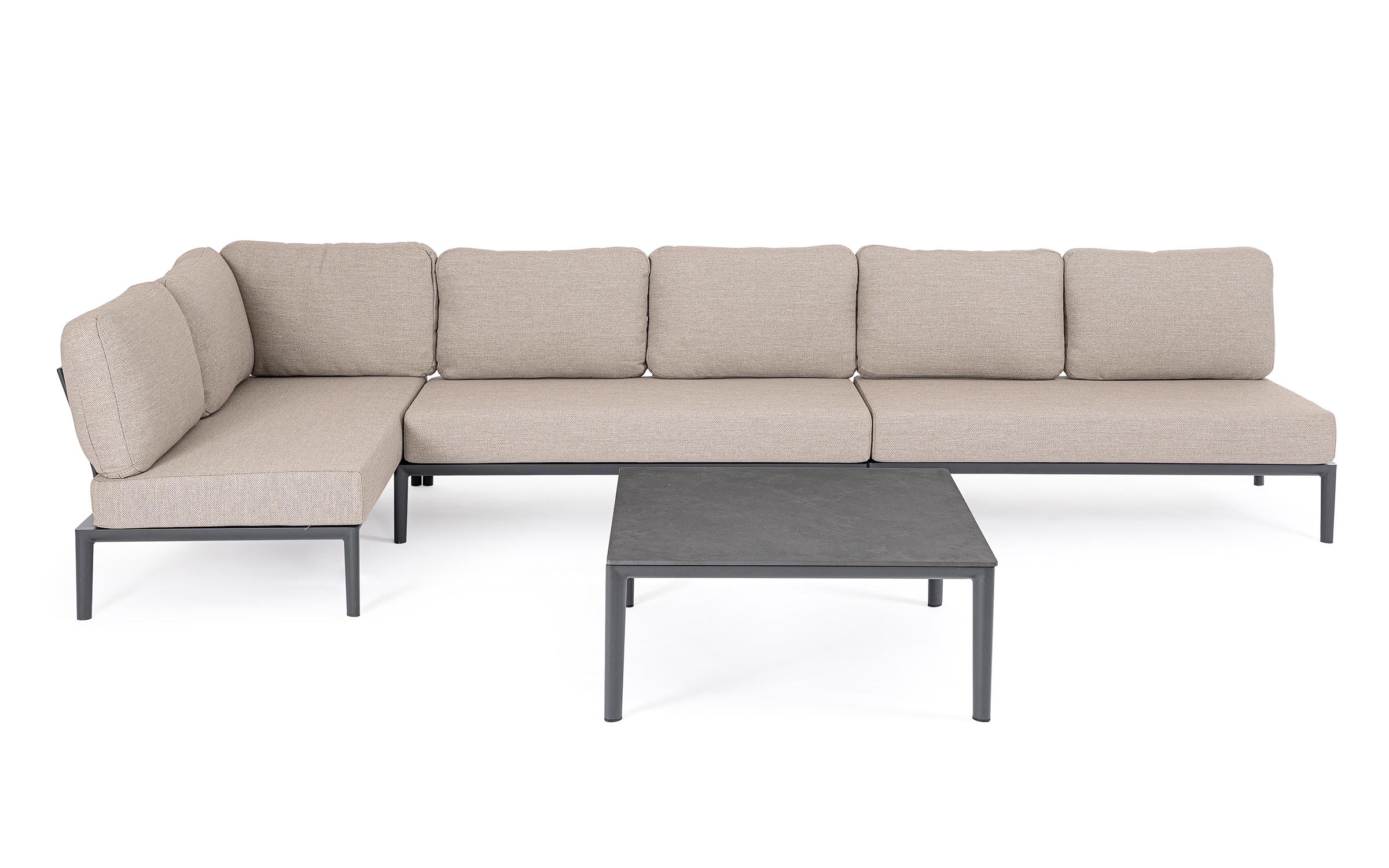 Kolekcja elementów, z których można tworzyć dowolne kompozycje mebli ogrodowych: narożników, sofy czy zestawów wypoczynkowych. Lekka konstrukcja i grube poduszki szarobeżowe z obiciem z materiału Olefin. Stolik z blatem ze spiekanego kamienia.