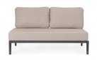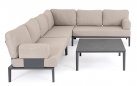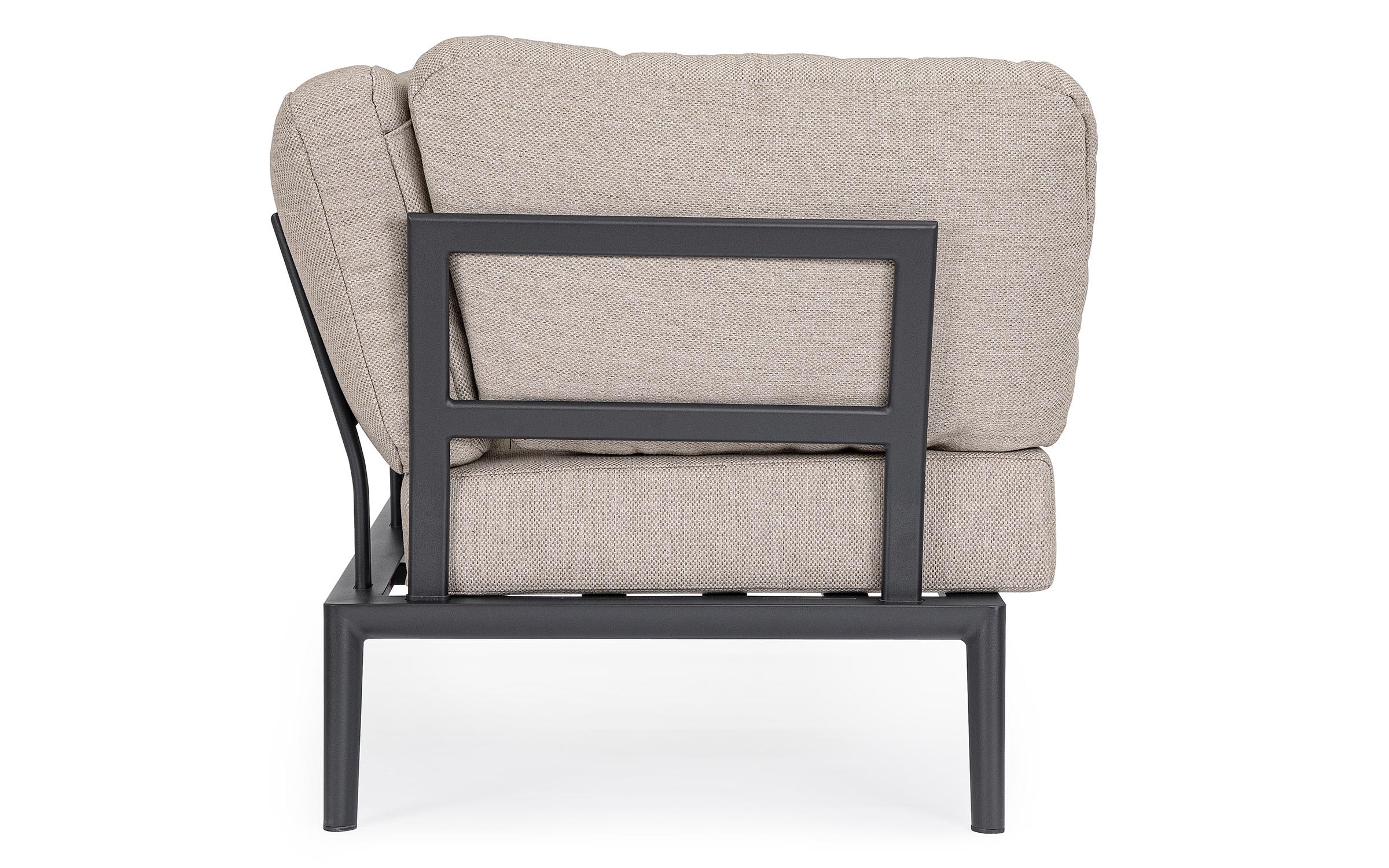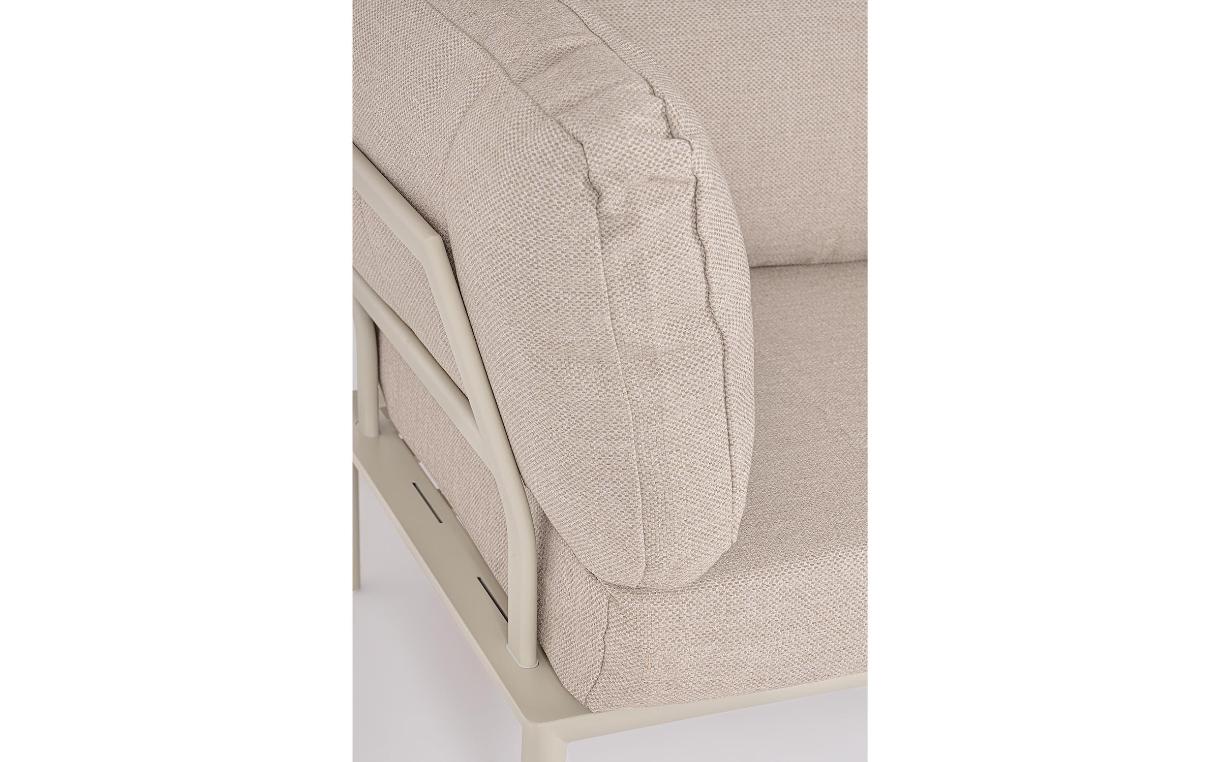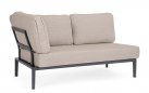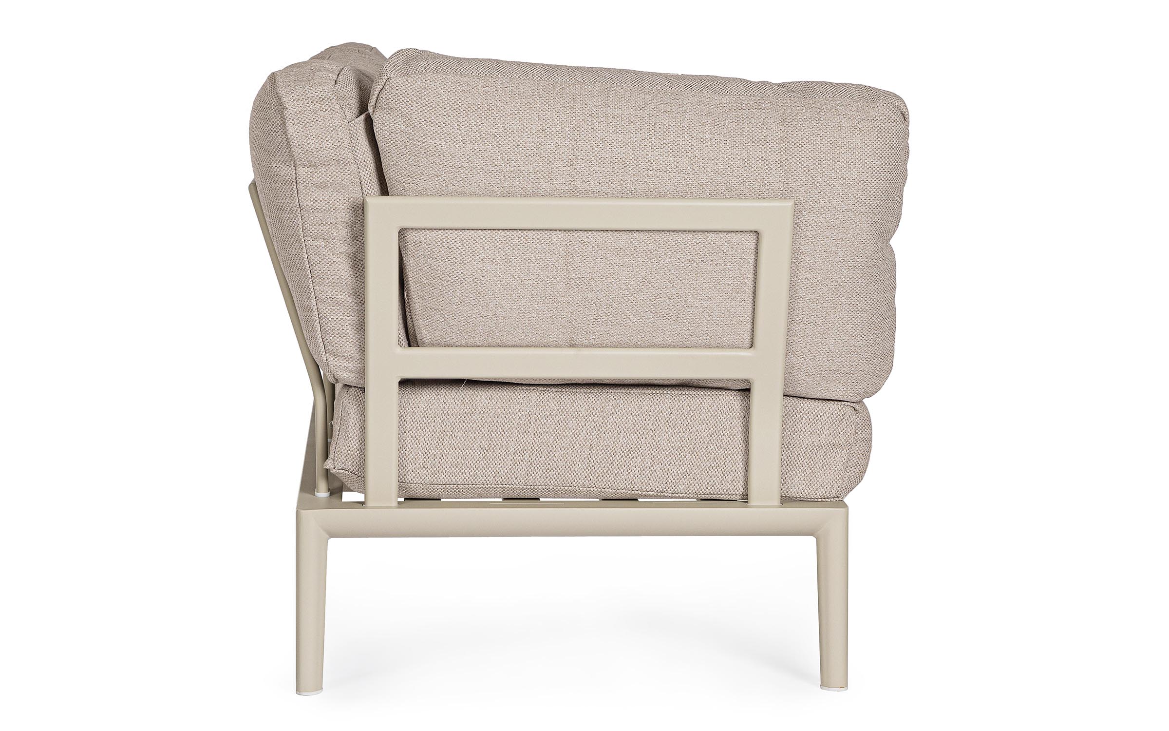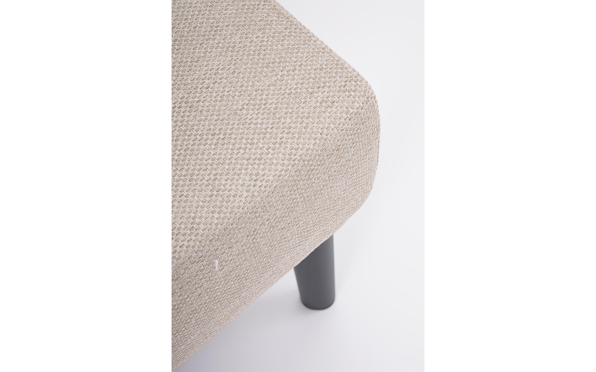Kolekcja elementów, z których można tworzyć dowolne kompozycje mebli ogrodowych: narożników, sofy czy zestawów wypoczynkowych. Lekka konstrukcja i grube poduszki szarobeżowe z obiciem z materiału Olefin. Stolik z blatem ze spiekanego kamienia.