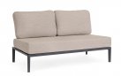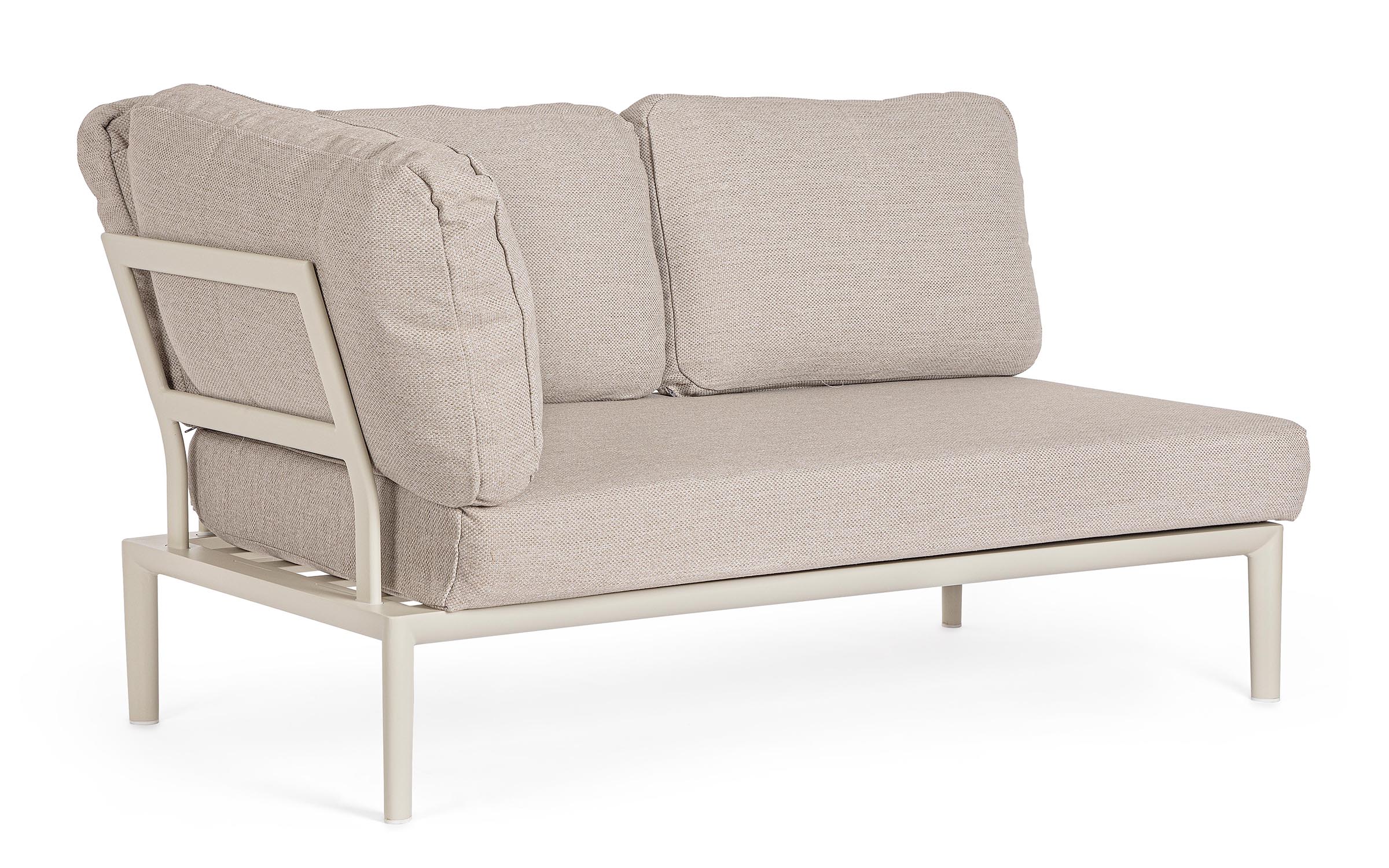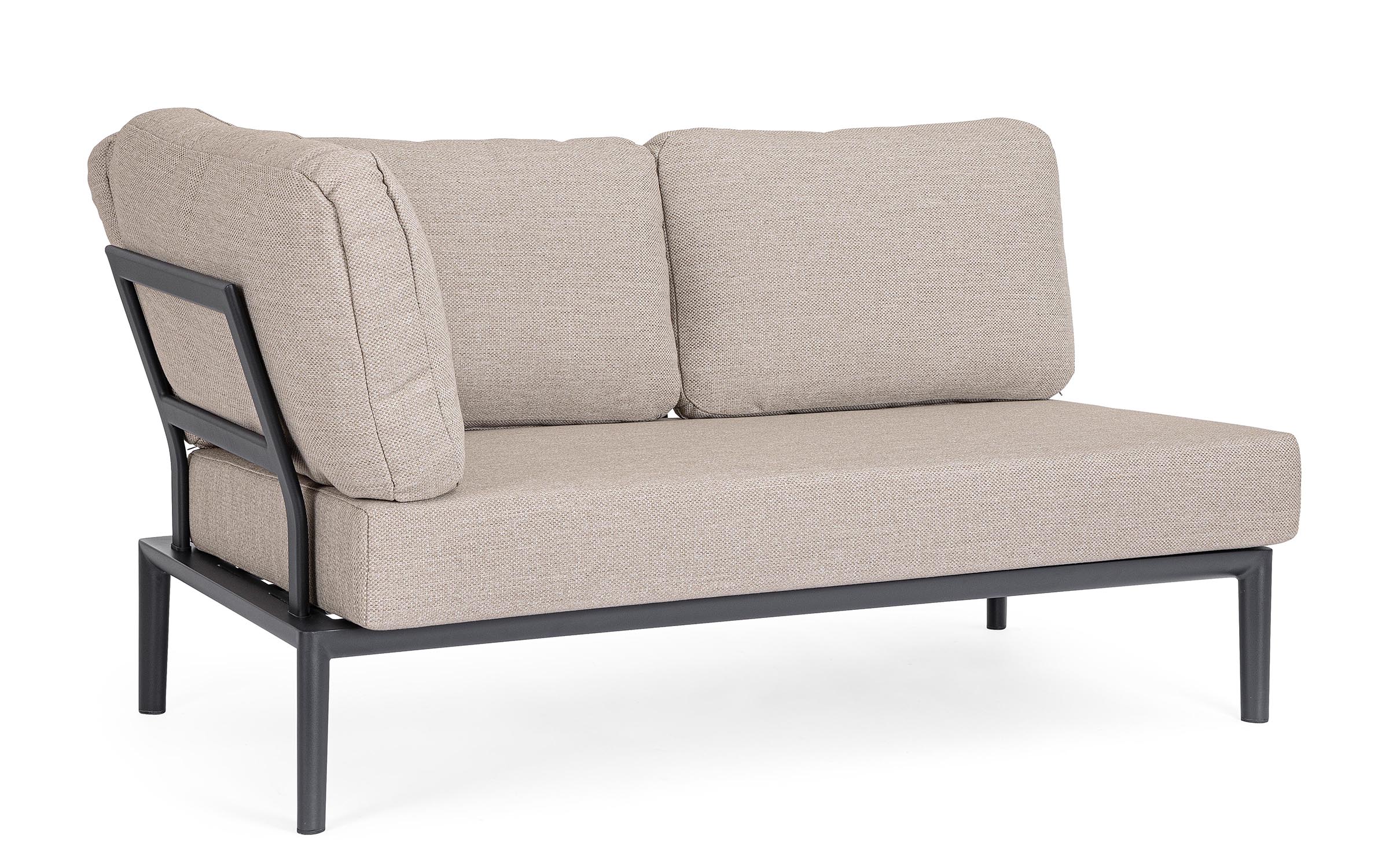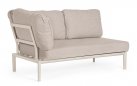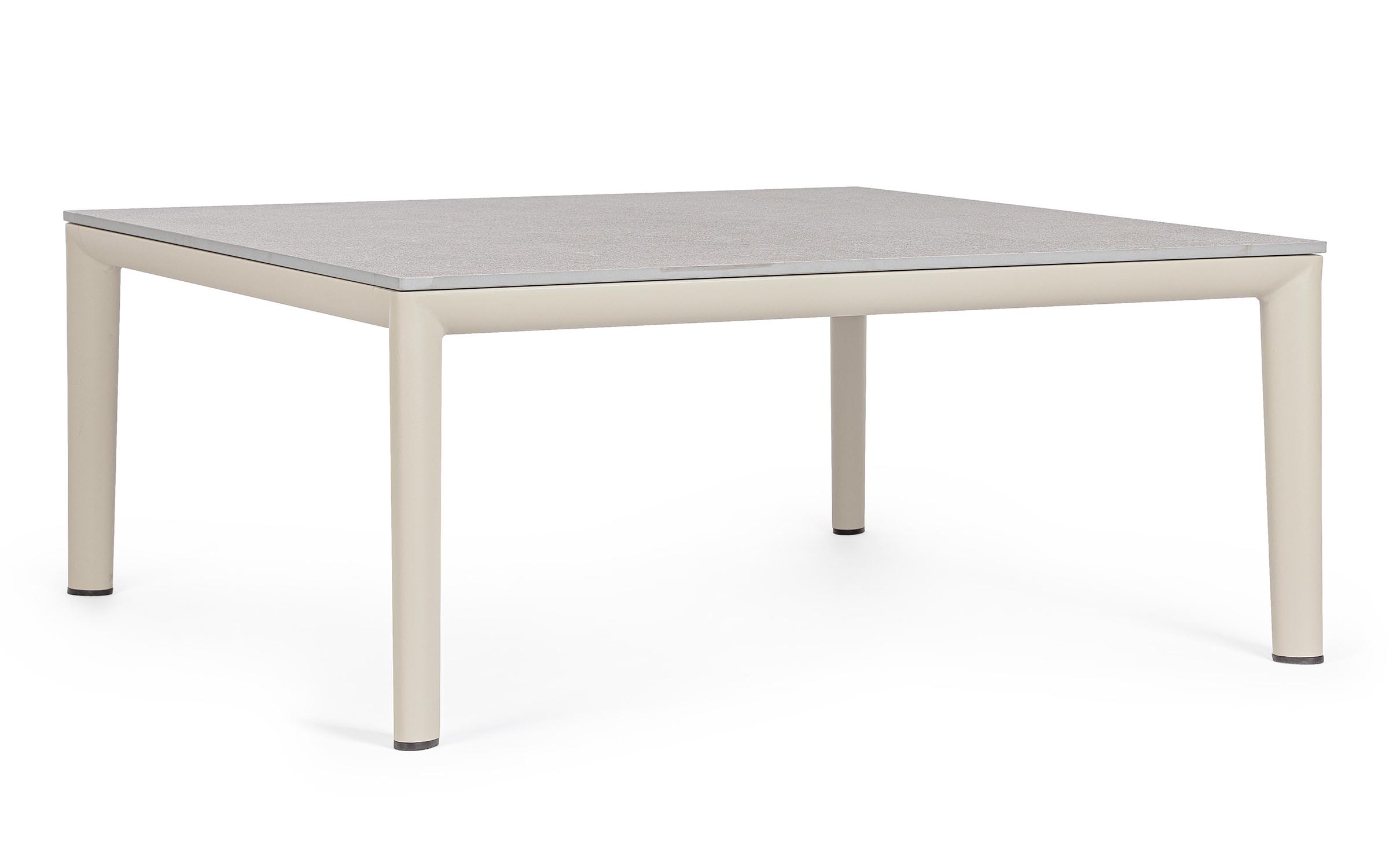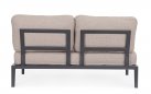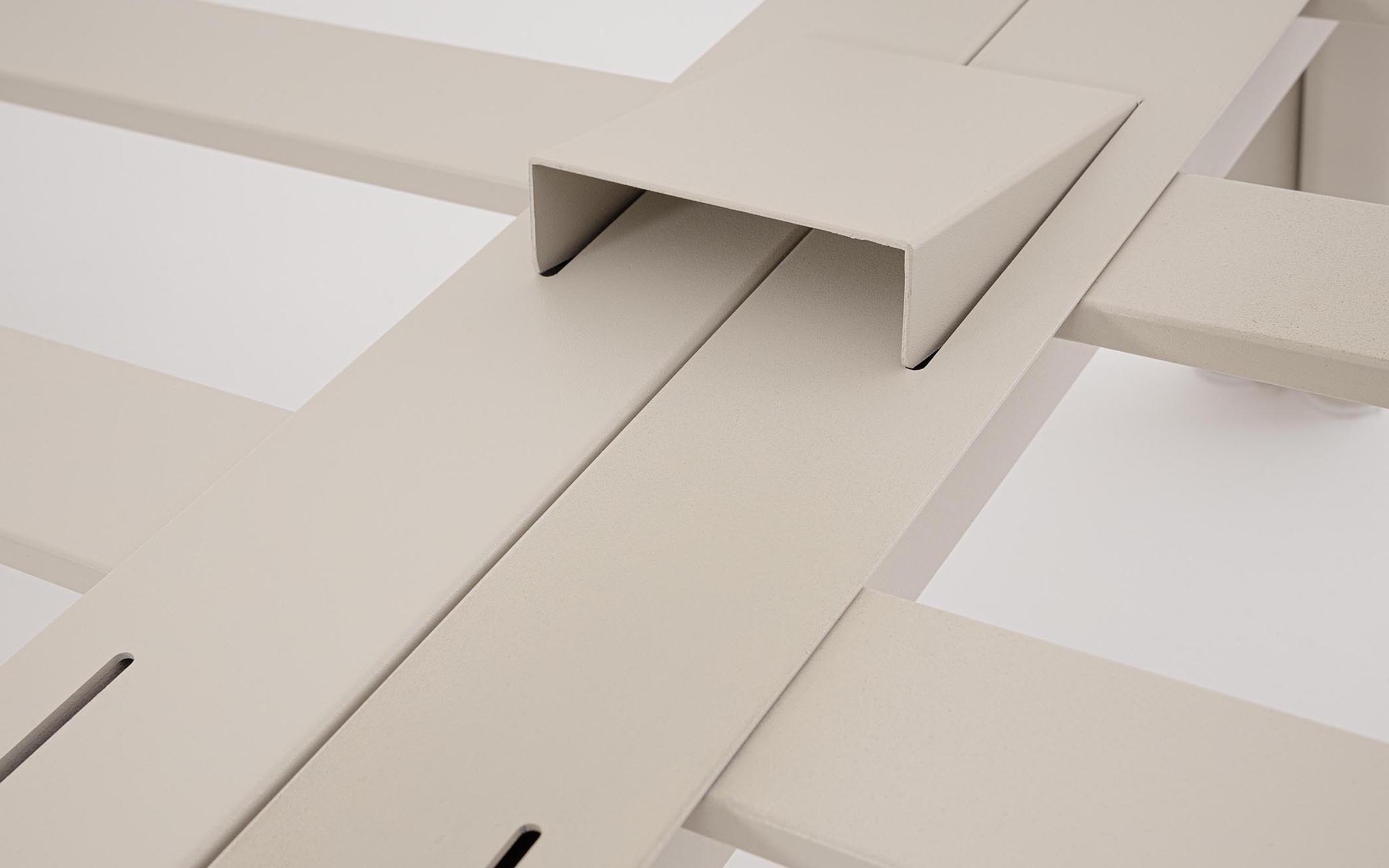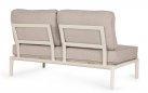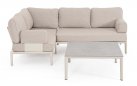 Kolekcja elementów, z których można tworzyć dowolne kompozycje mebli ogrodowych: narożników, sofy czy zestawów wypoczynkowych. Lekka konstrukcja i grube poduszki szarobeżowe z obiciem z materiału Olefin. Stolik z blatem ze spiekanego kamienia.