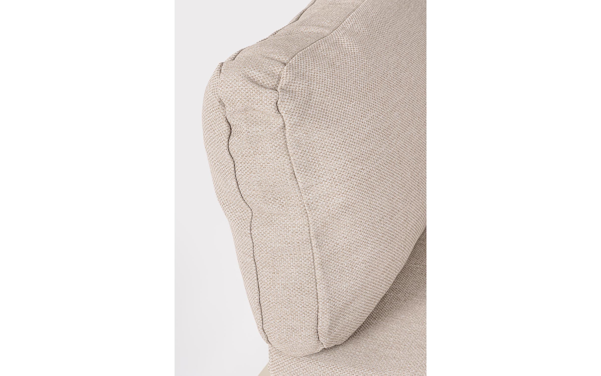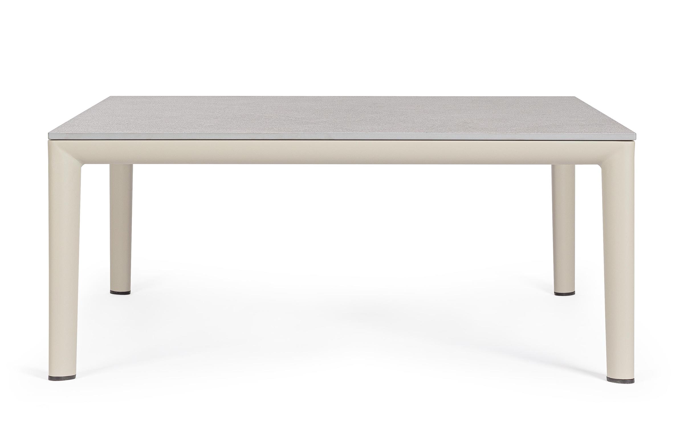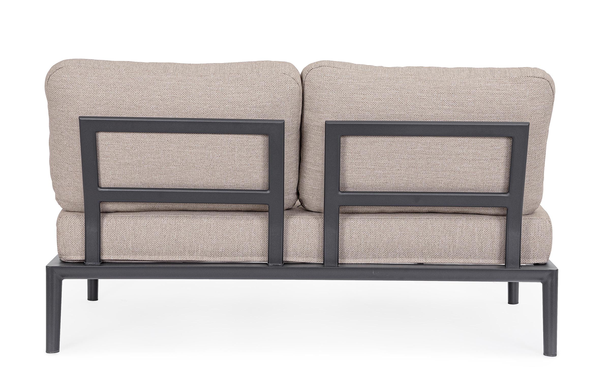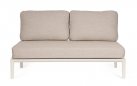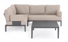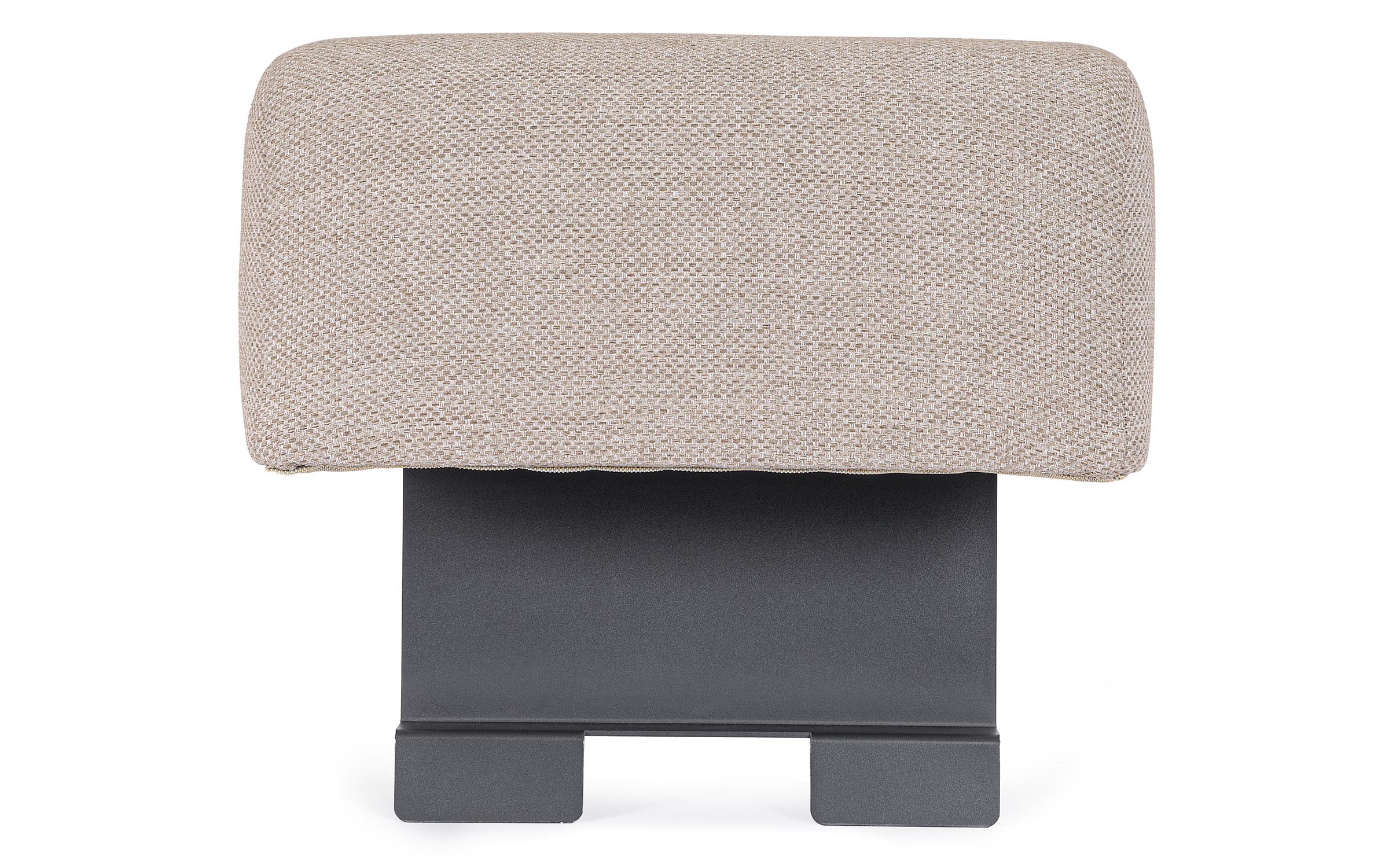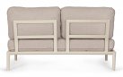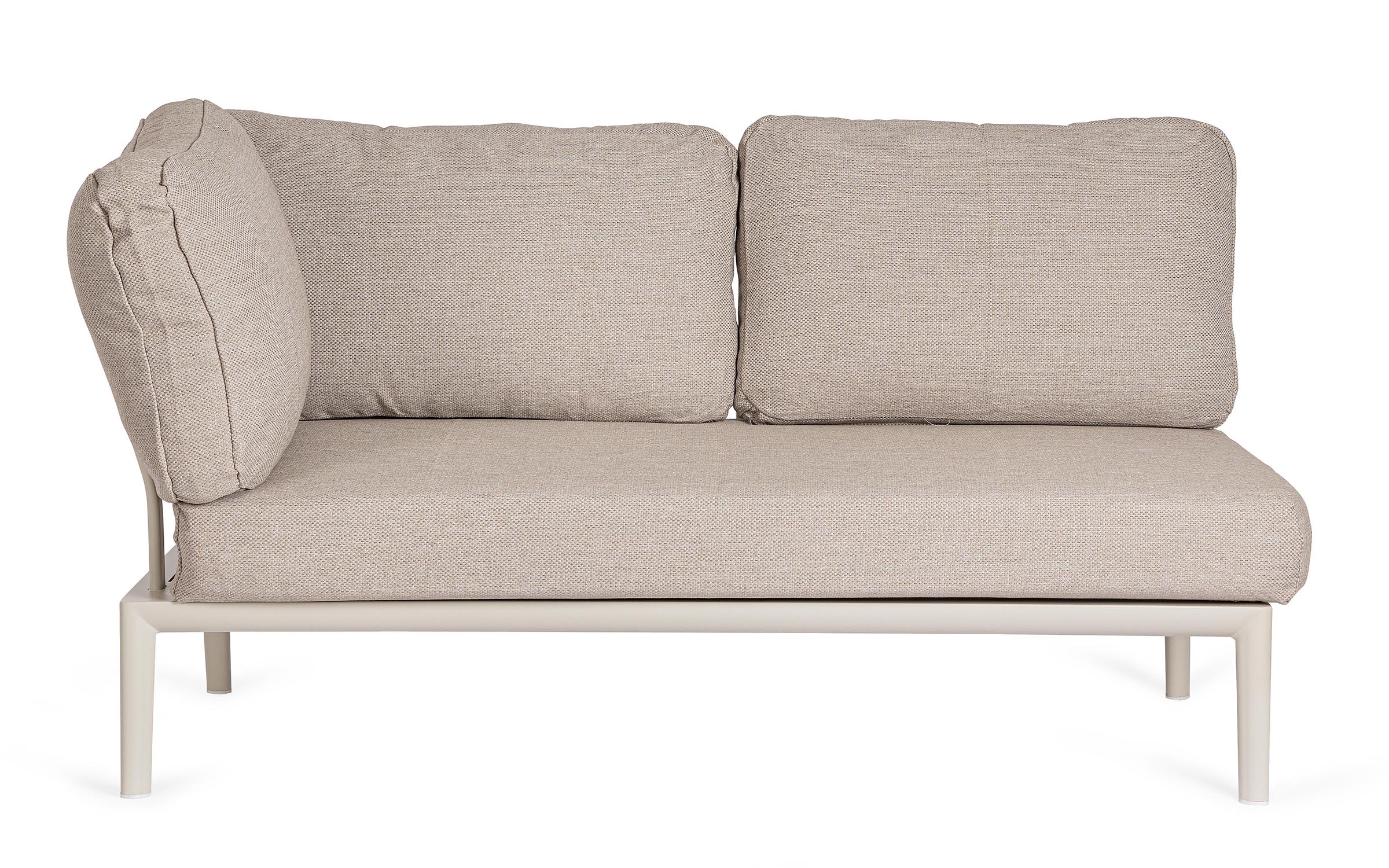 Kolekcja elementów, z których można tworzyć dowolne kompozycje mebli ogrodowych: narożników, sofy czy zestawów wypoczynkowych. Lekka konstrukcja i grube poduszki szarobeżowe z obiciem z materiału Olefin. Stolik z blatem ze spiekanego kamienia.
