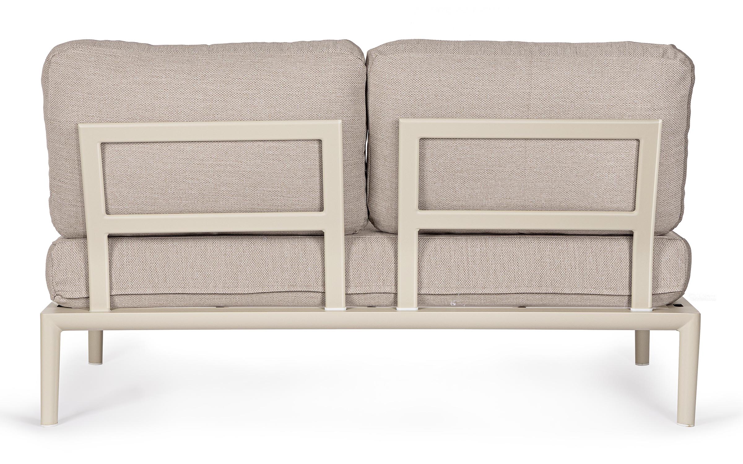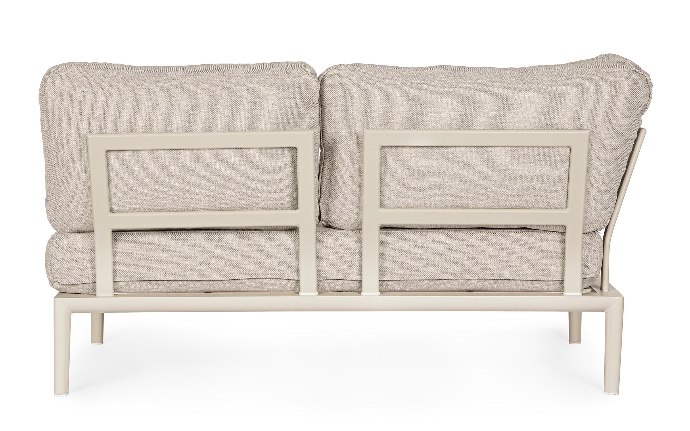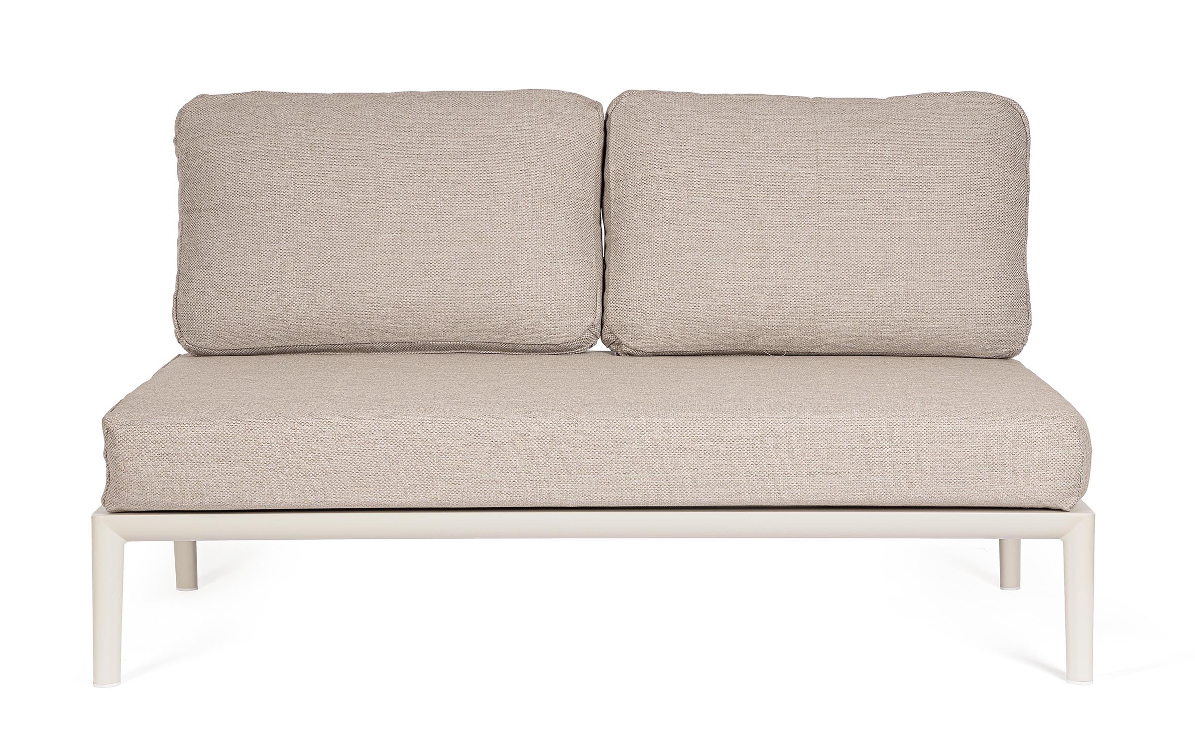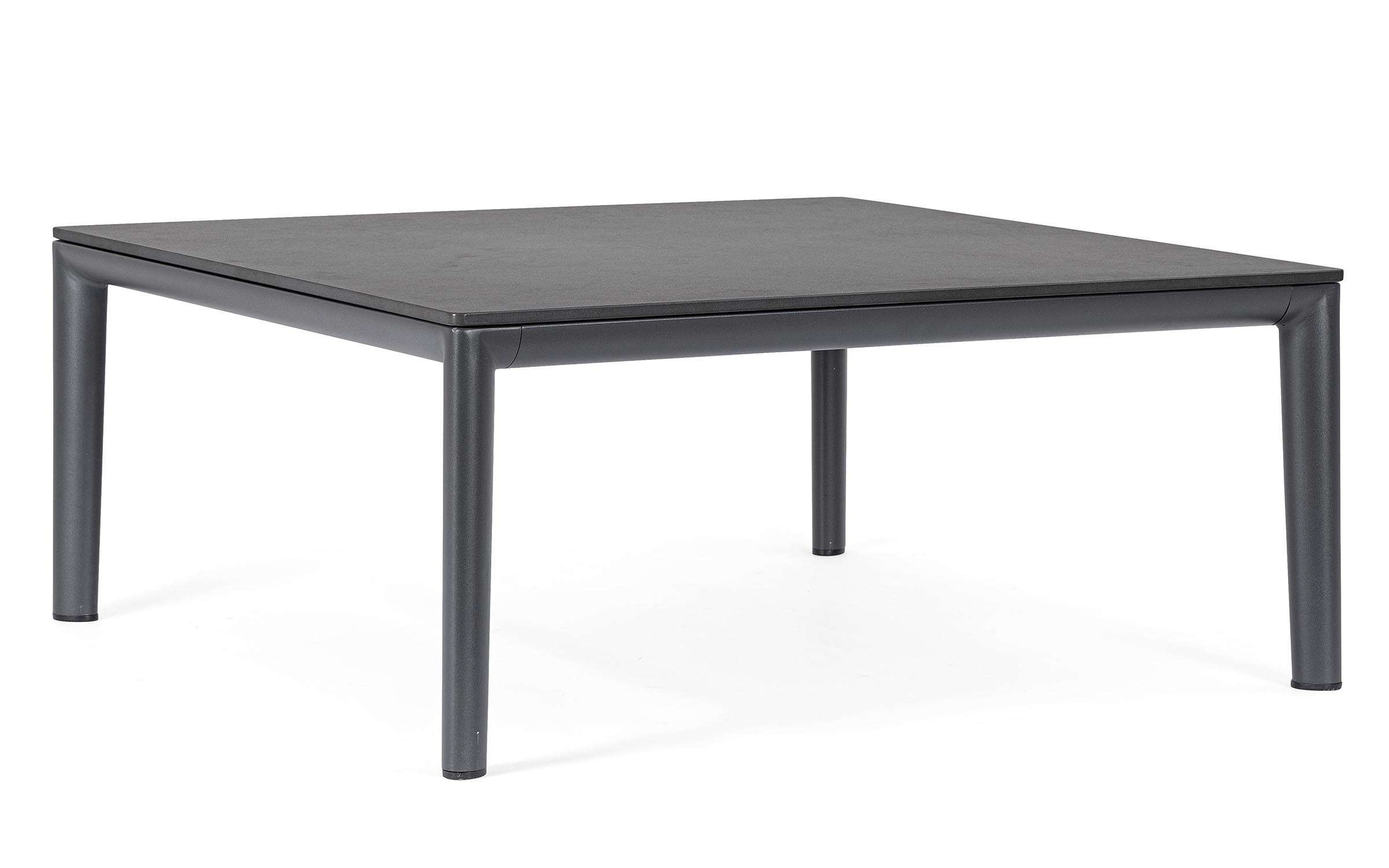 Kolekcja elementów, z których można tworzyć dowolne kompozycje mebli ogrodowych: narożników, sofy czy zestawów wypoczynkowych. Lekka konstrukcja i grube poduszki szarobeżowe z obiciem z materiału Olefin. Stolik z blatem ze spiekanego kamienia.
