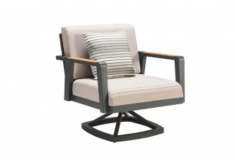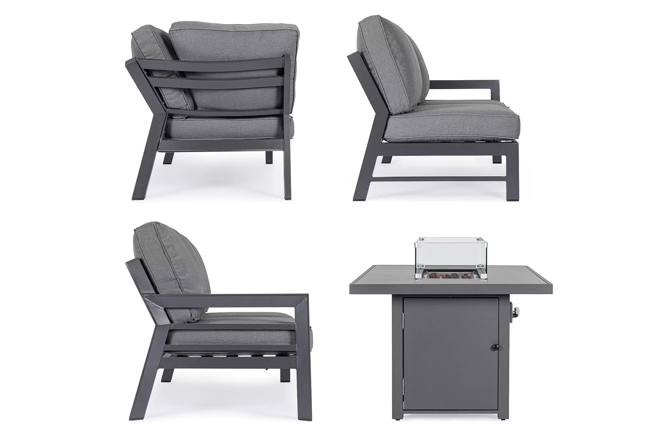 Atrakcją tego zestawu jest wysoki stolik z wbudowanym kominkiem gazowym umożliwiającym wypoczynek na tarasie w chłodniejsze wieczory.