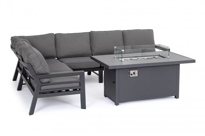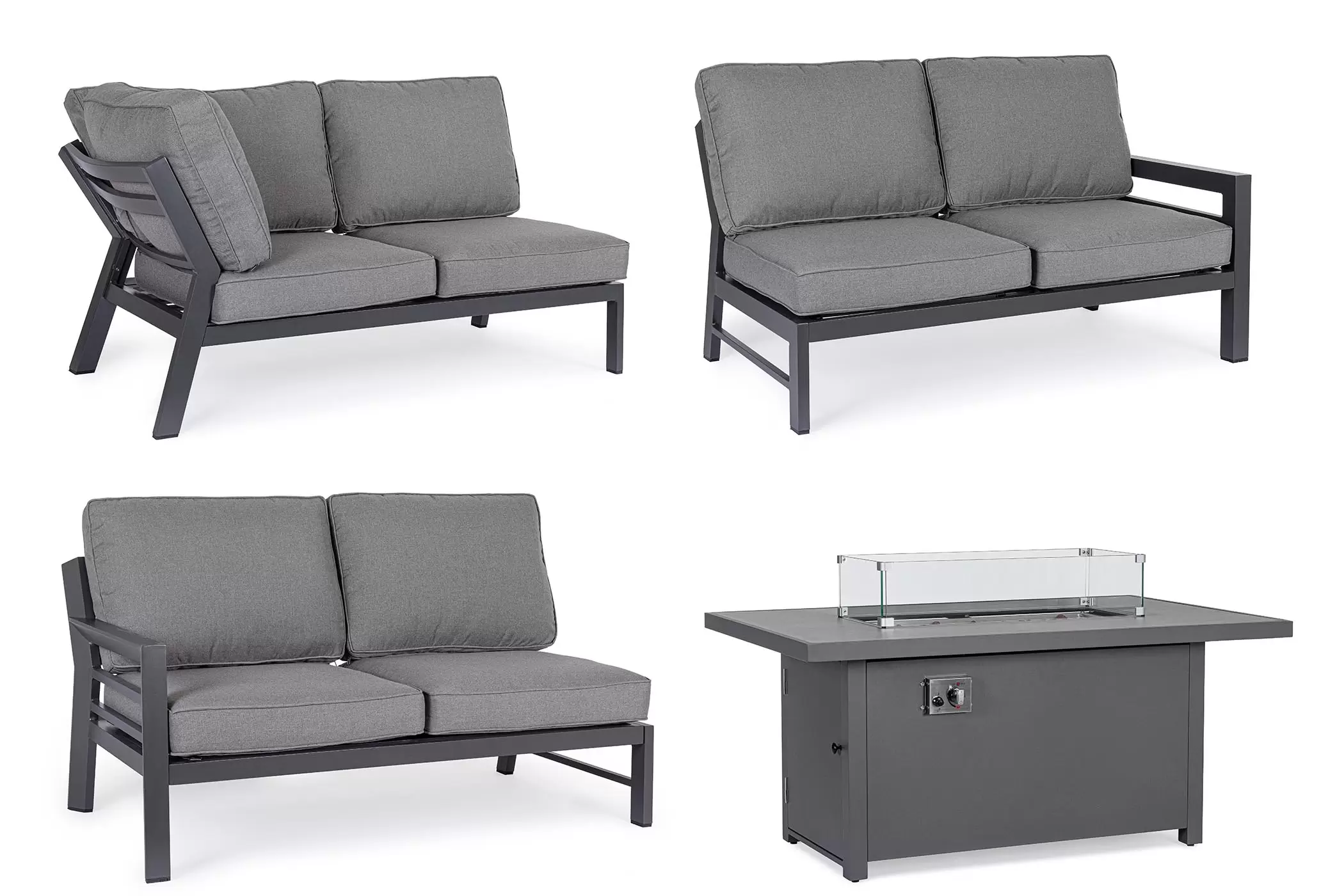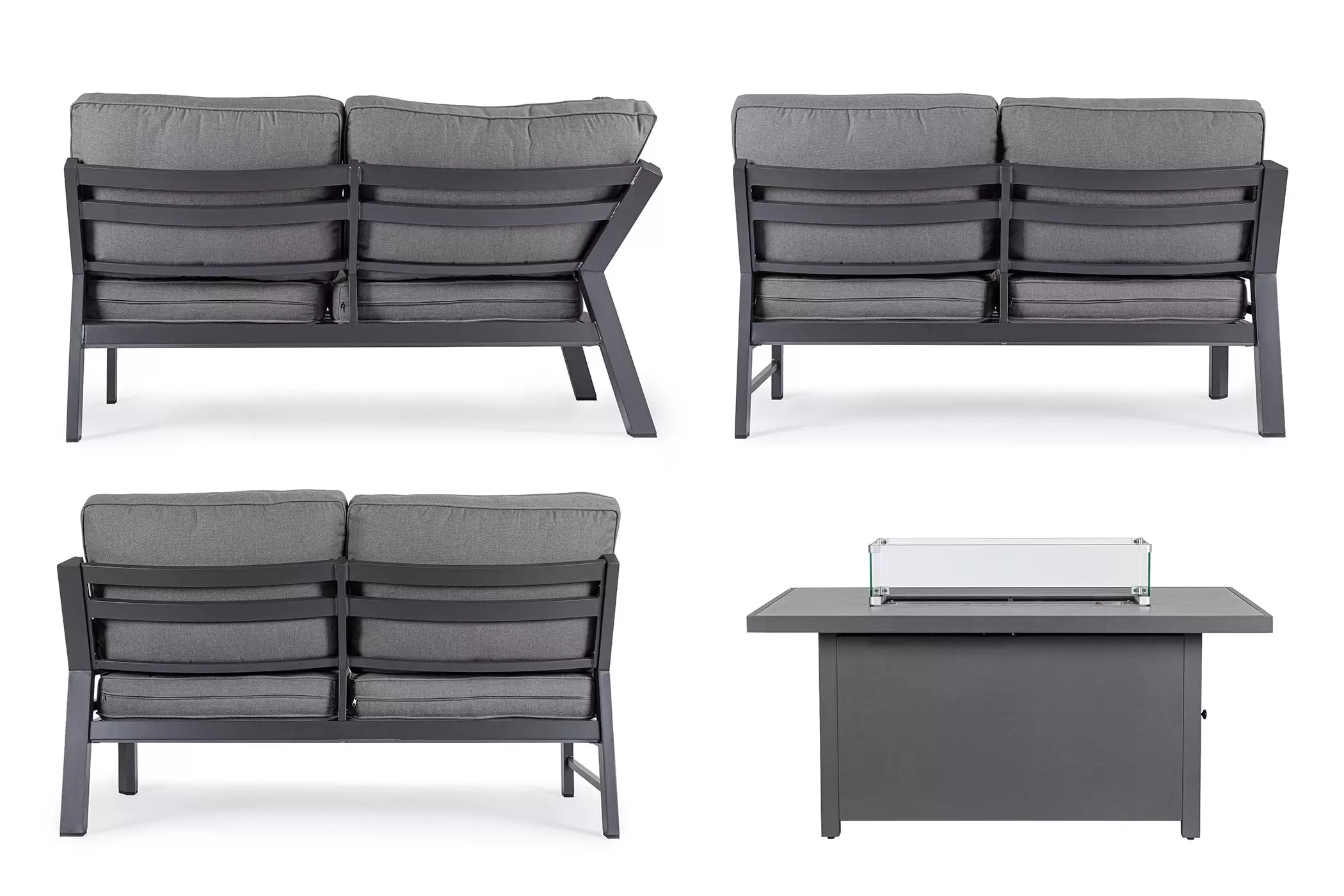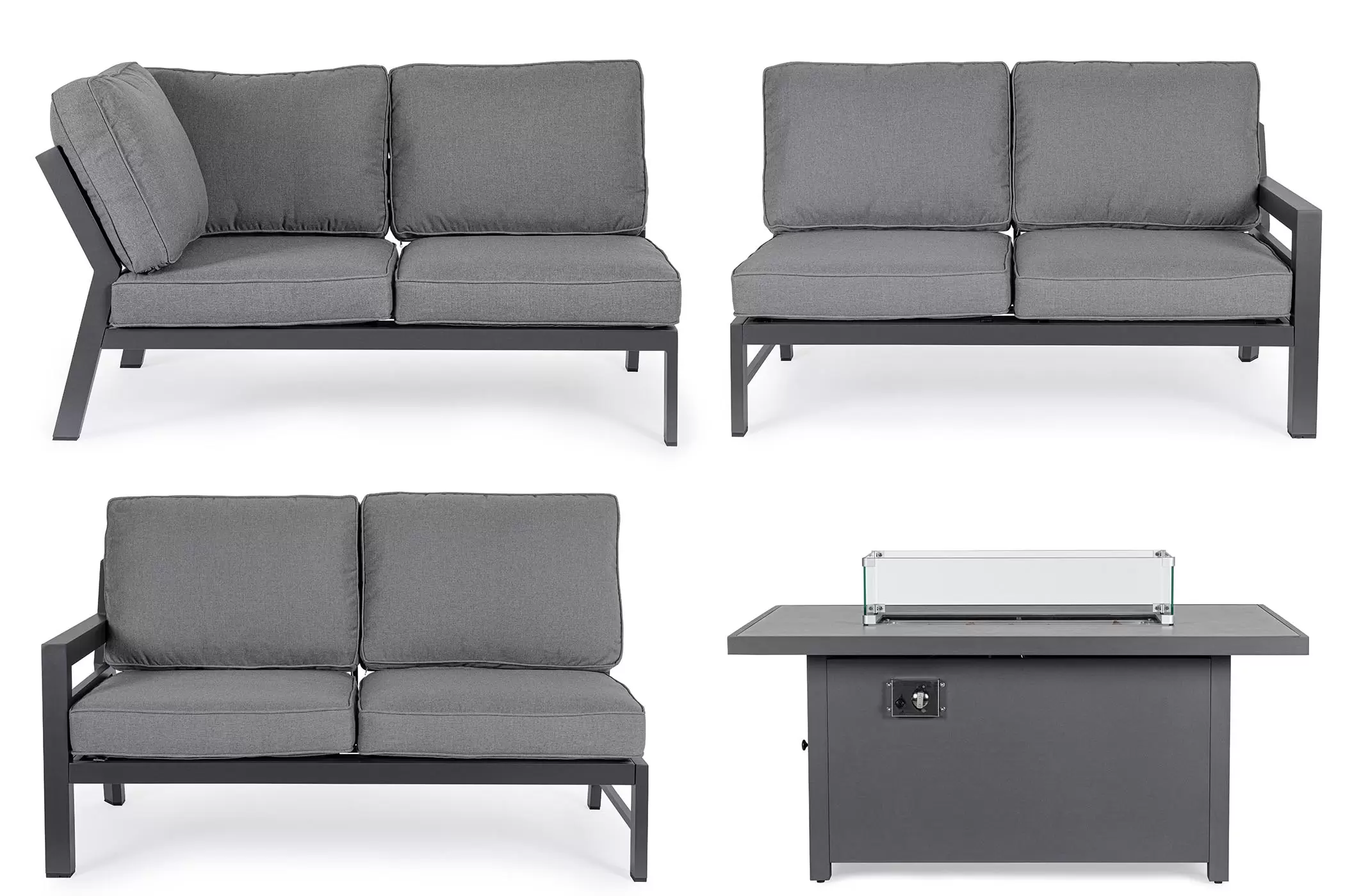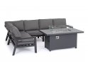 Nowoczesny narożnik ogrodowy, wykonany w całości z aluminium ze stolikiem wysokim z wbudowanym kominkiem gazowym z osłonami ze szkła hartowanego.