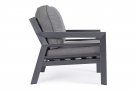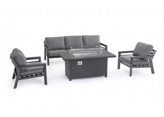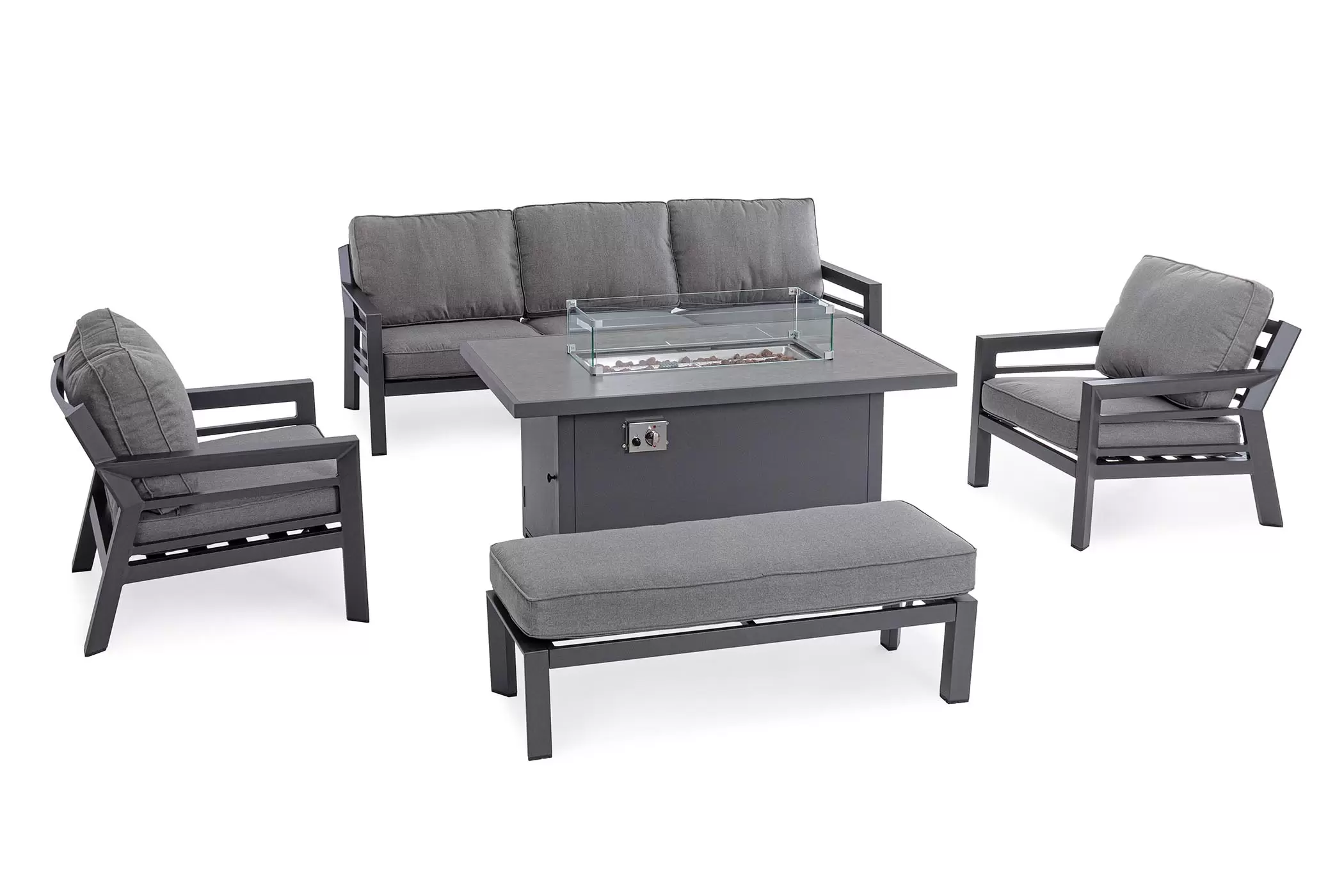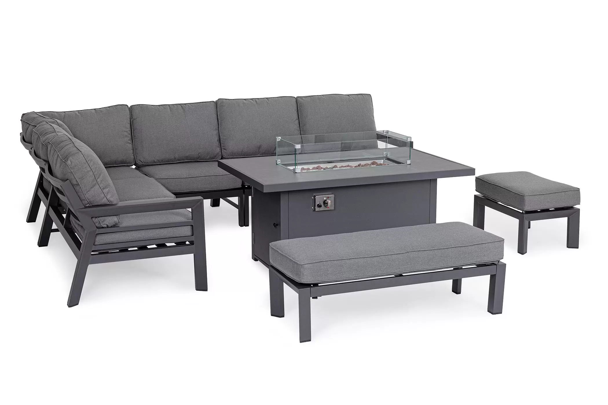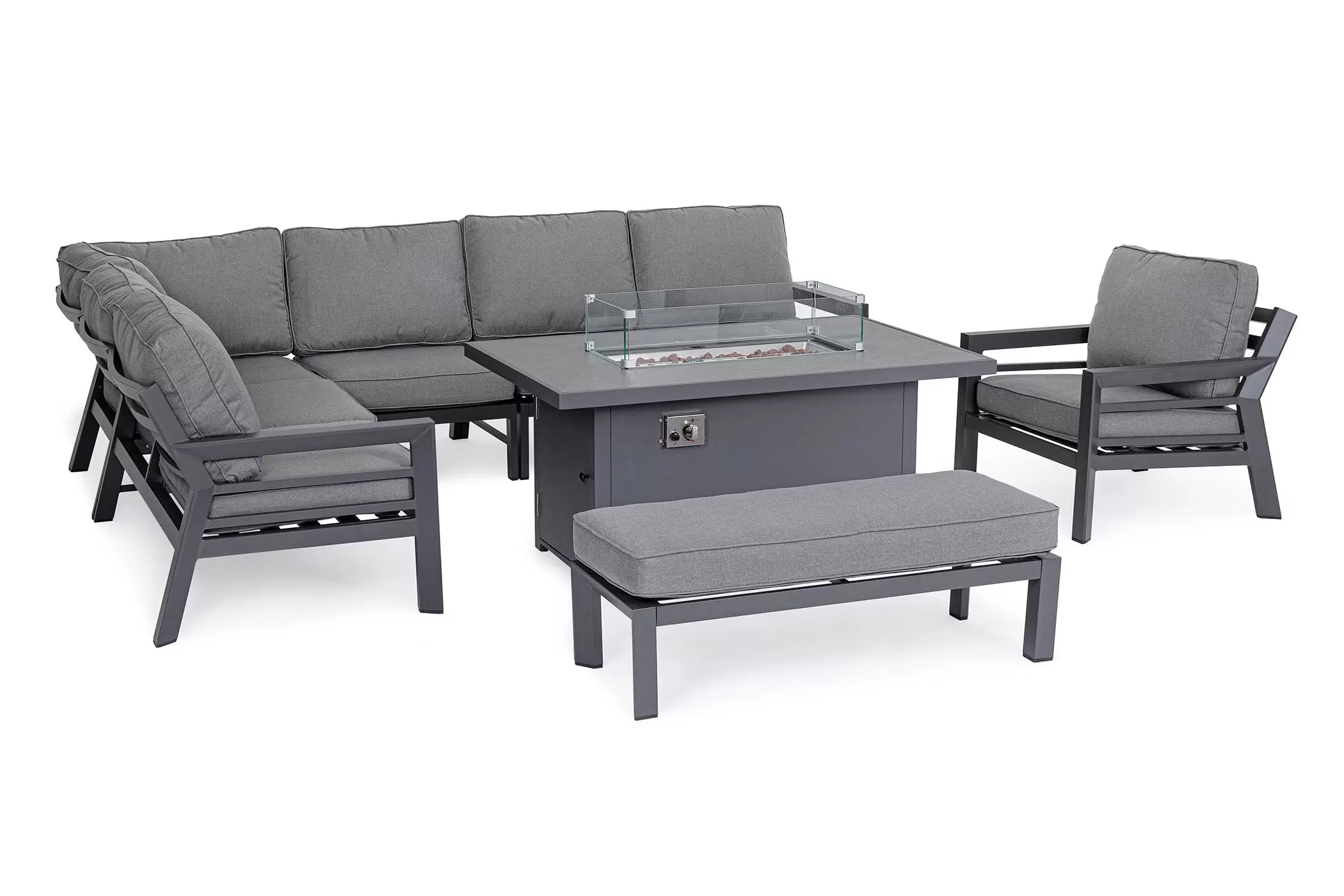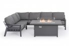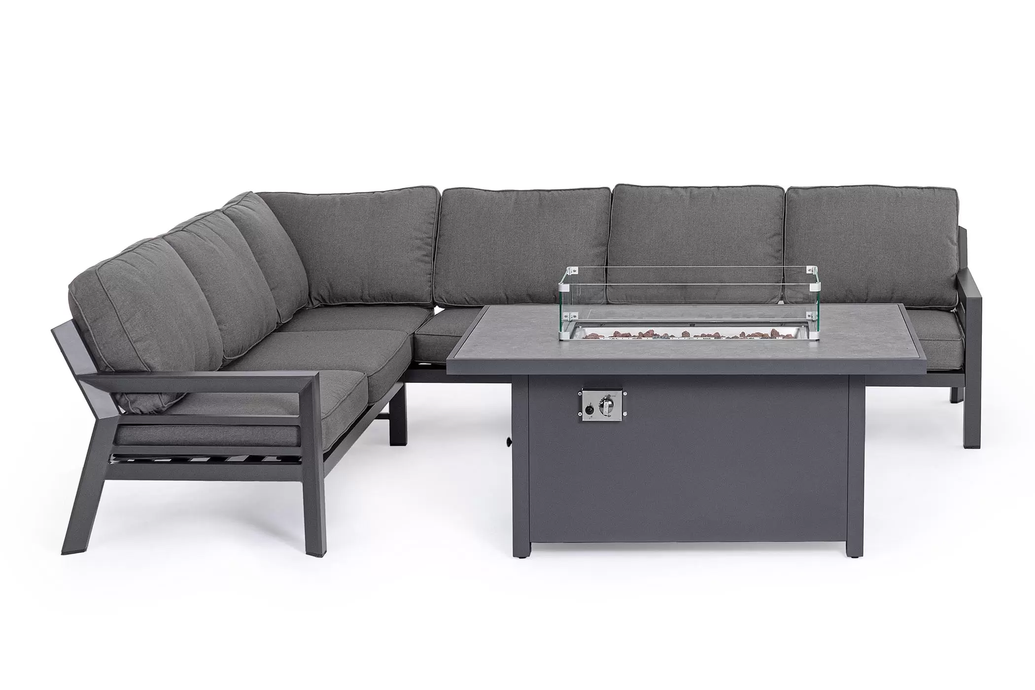 Nowoczesny narożnik ogrodowy, wykonany w całości z aluminium ze stolikiem wysokim z wbudowanym kominkiem gazowym z osłonami ze szkła hartowanego.
