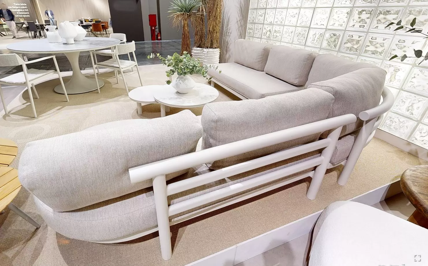 Nowoczesny narożnik na taras wykonany w całości z aluminium, z zakończeniem wyspowym na jednym z ramion. Cechą charakterystyczną tego modelu to okrągłe profile konstrukcji i oraz zaokrąglone krawędzie. Także część narożna narożnika ogrodowego jest zaokrąglona.