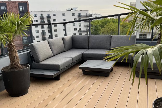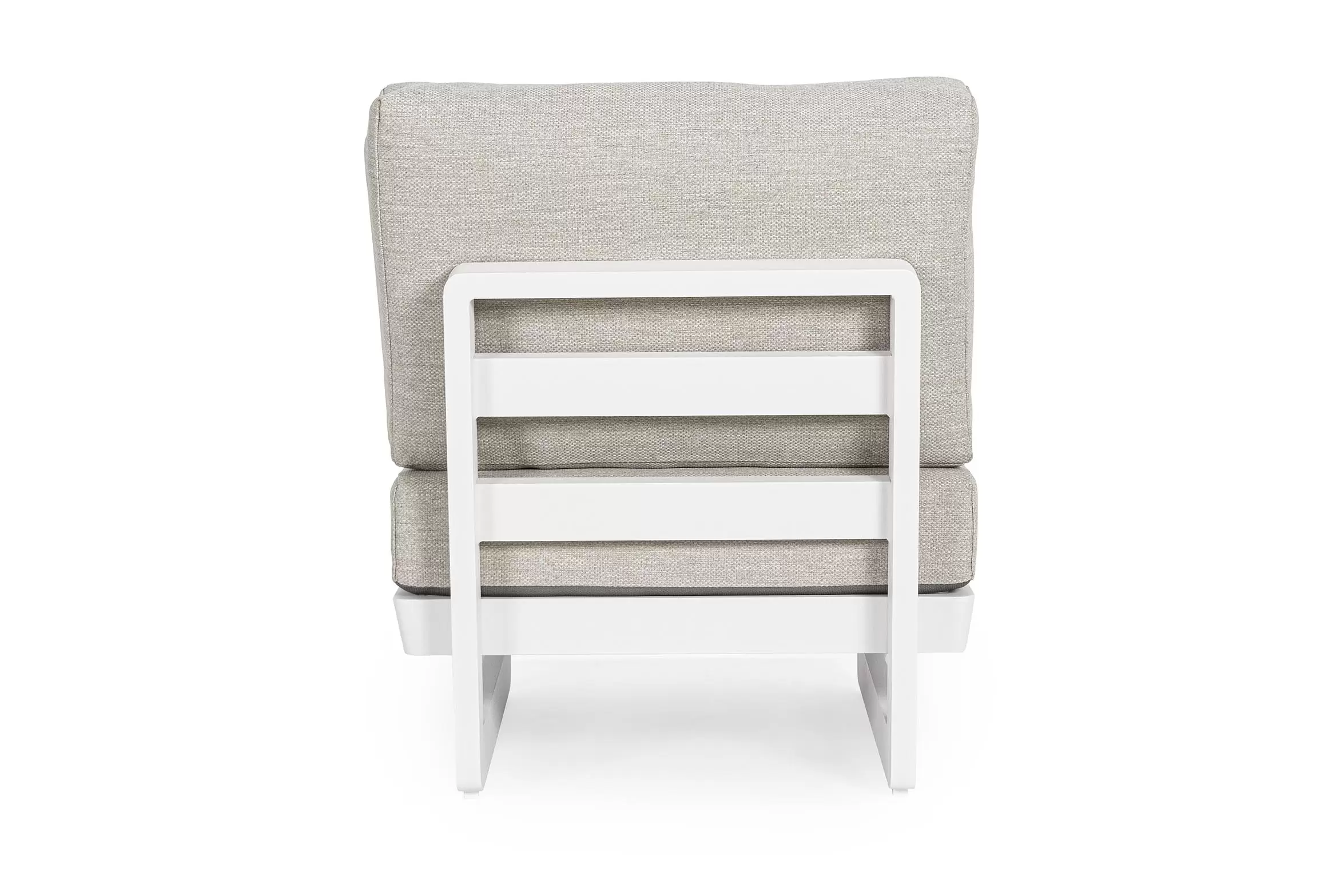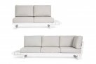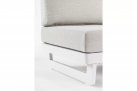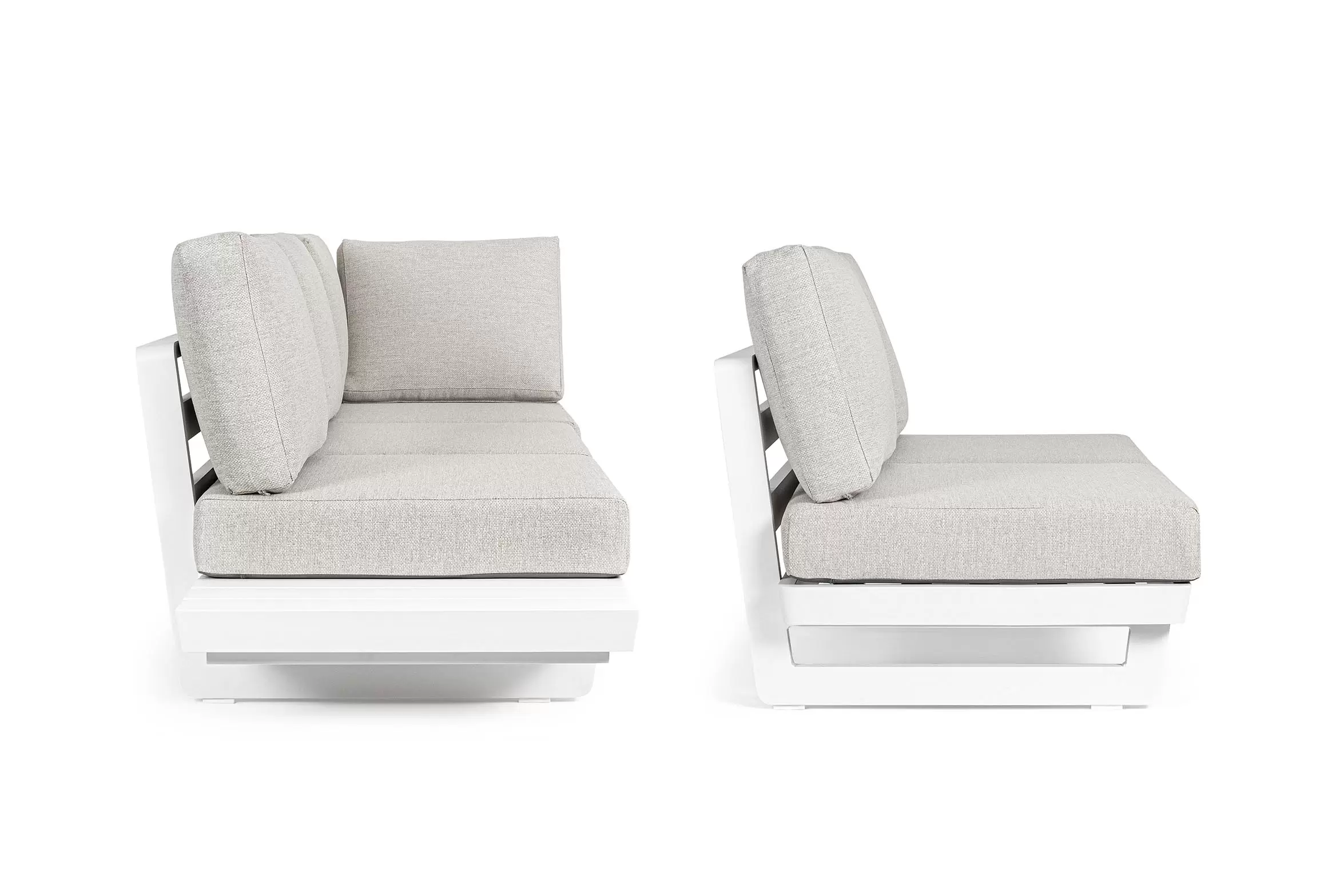 Nowoczesny narożnik modułowy, wykonany w całości z aluminium, ze stolikami bocznymi na końcach ramion.