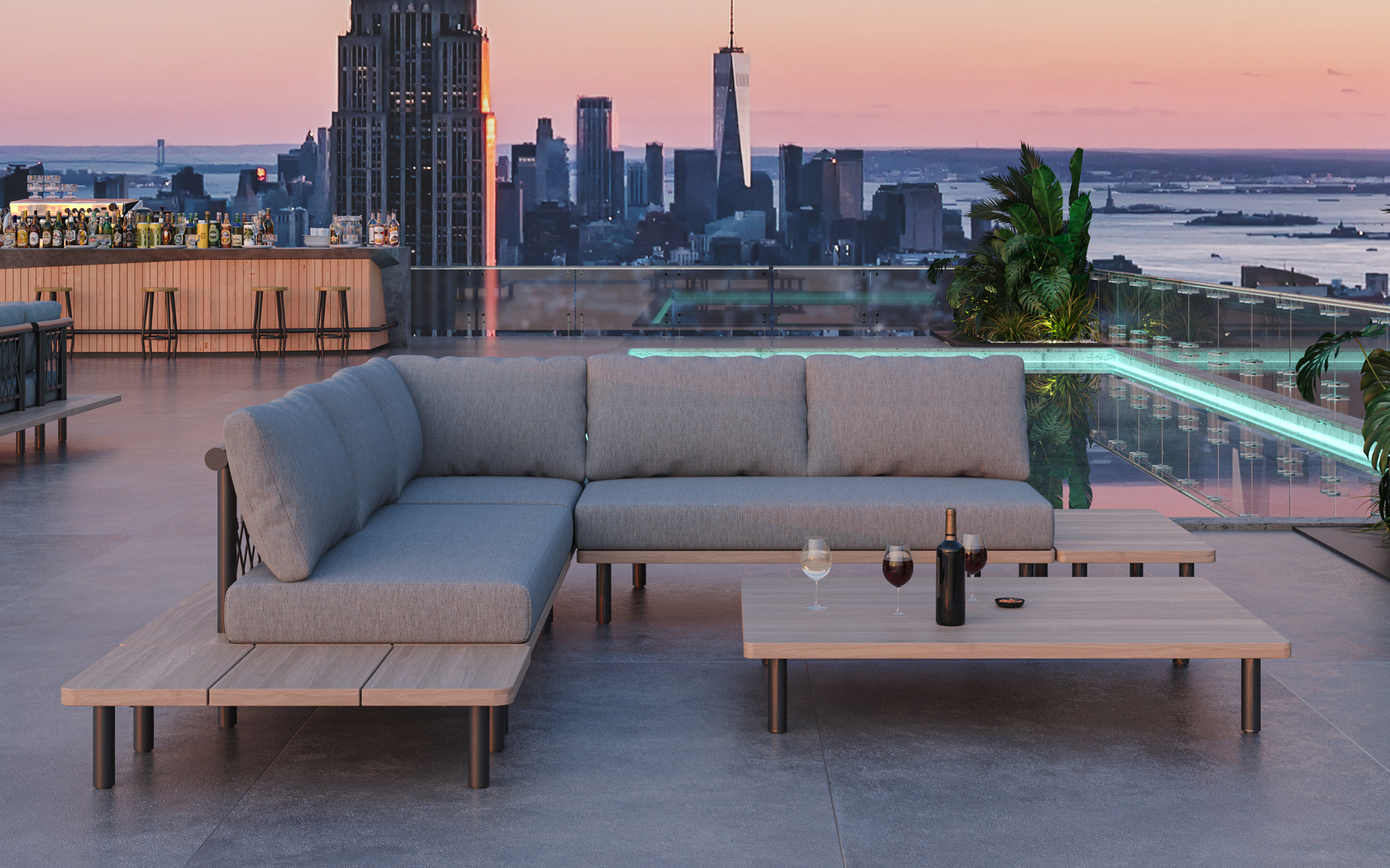 Modułowa konstrukcja pozwala na kilka opcji ustawienia: od szerokiej sofy z lub bez podłokietników poprzez rózne narożniki o róznej długości po zbudowanie ogromnego zestawu w kształcie litery U.