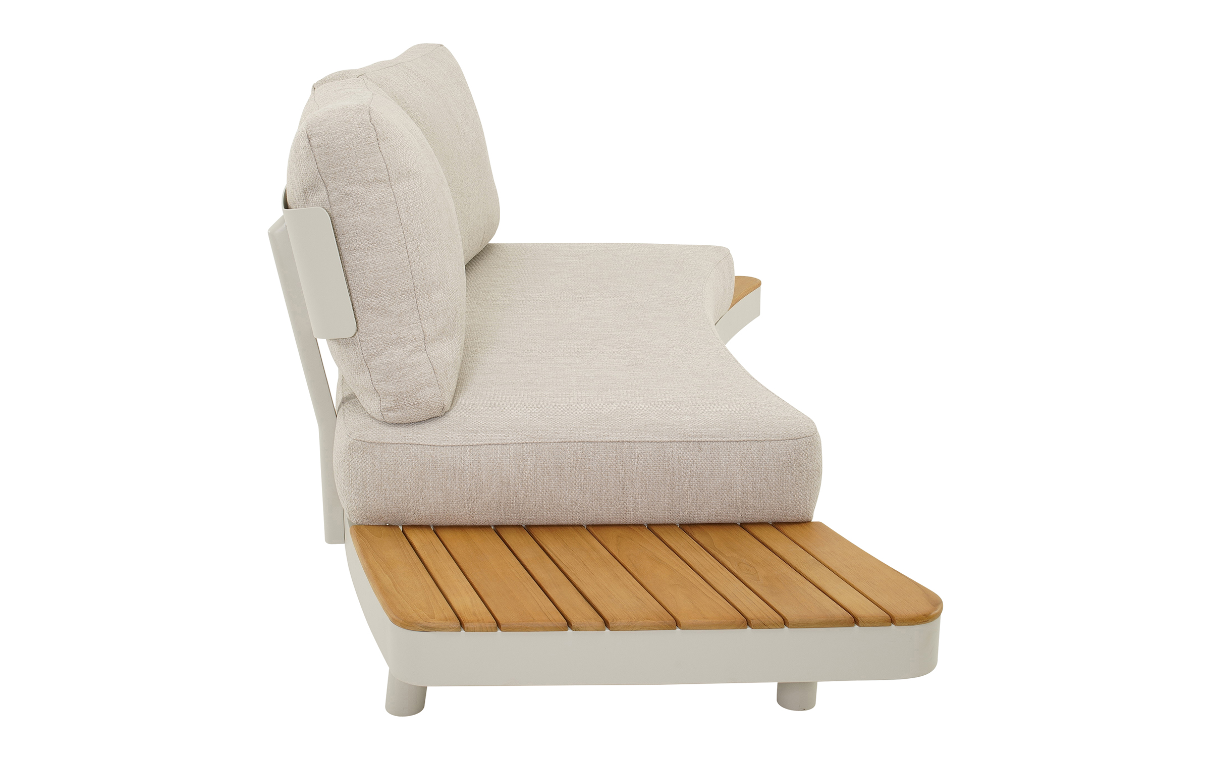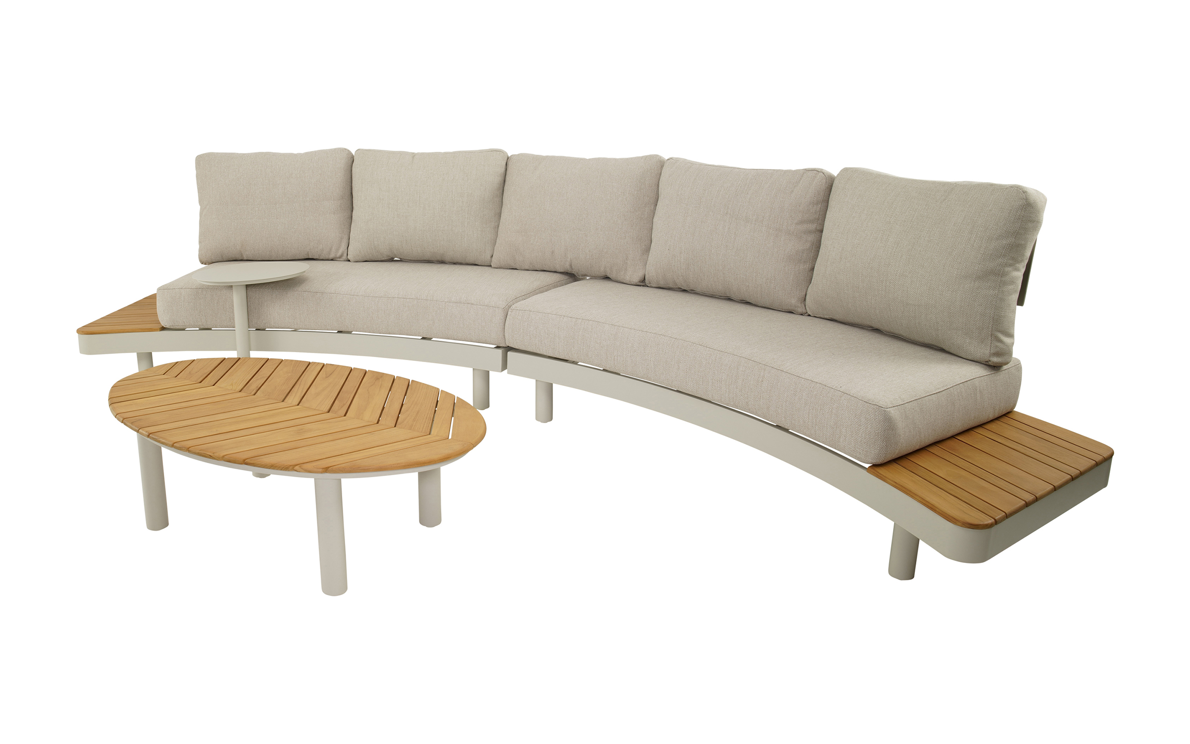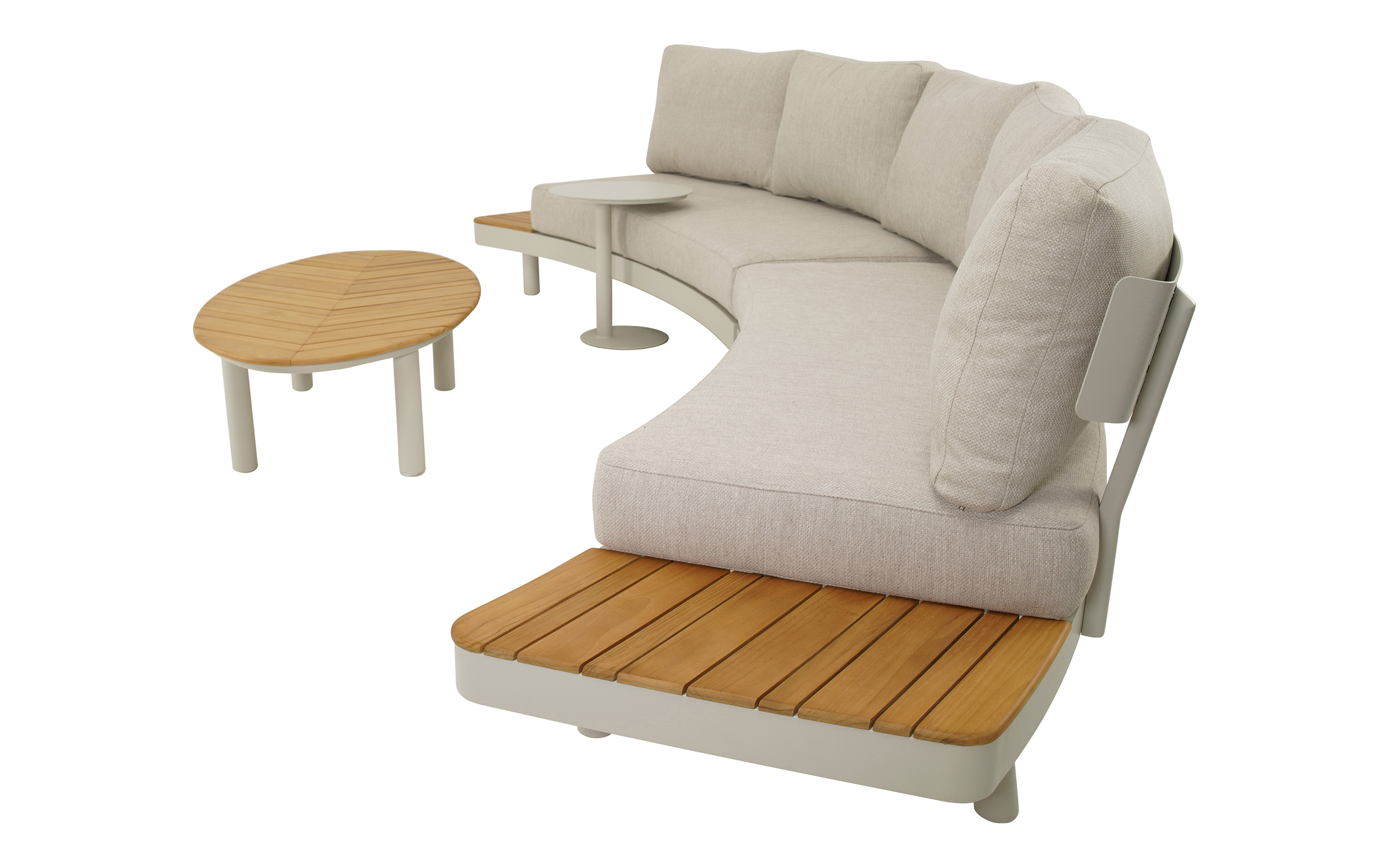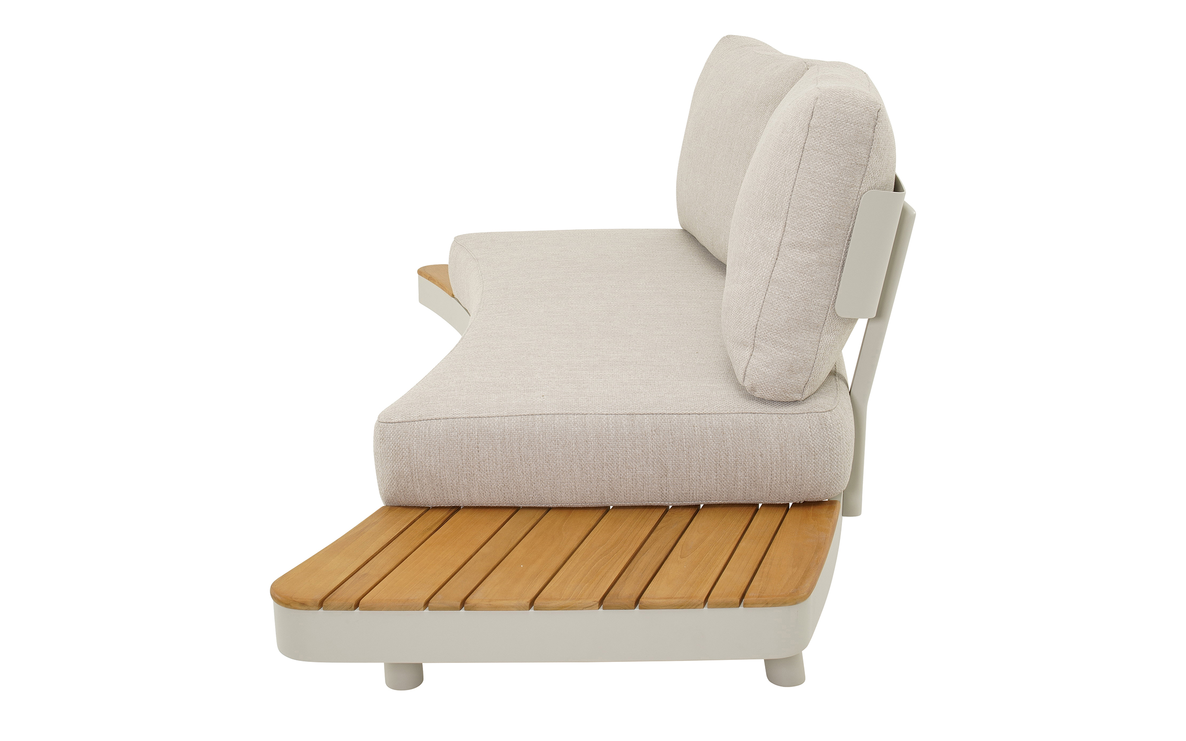 Poduszki wykonane są z tkaniny Olefin o gramaturze 370 g/m², odpornej na wilgoć, promieniowanie UV i zabrudzenia. Blaty stolików oraz boczne panele sof wykonano z naturalnego drewna teakowego, które nadaje całości ciepły, szlachetny wygląd. Układ modułowy pozwala na elastyczne dopasowanie zestawu do przestrzeni i potrzeb użytkownika.