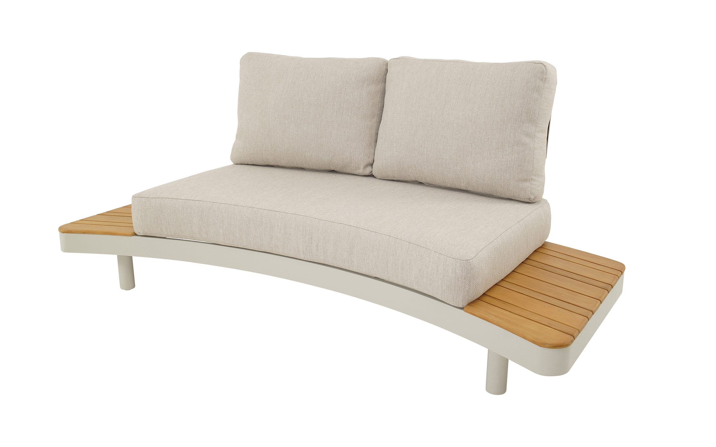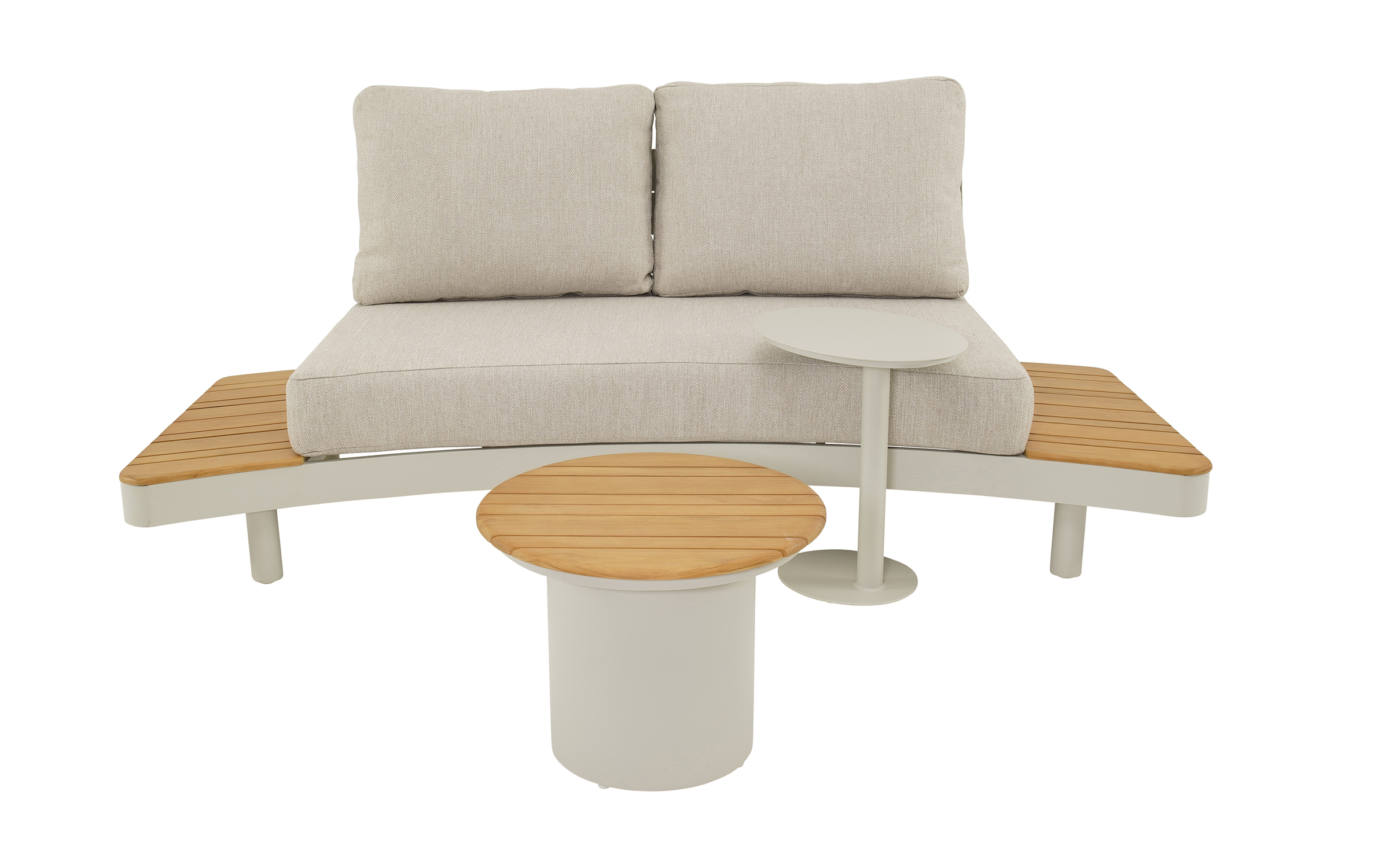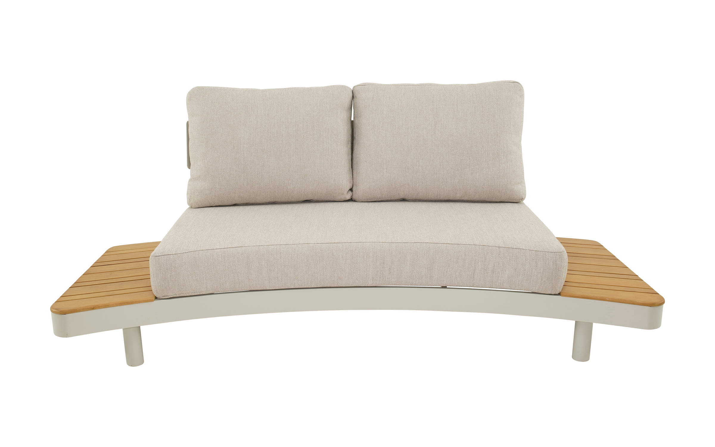 Poduszki wykonane są z tkaniny Olefin o gramaturze 370 g/m², odpornej na wilgoć, promieniowanie UV i zabrudzenia. Blaty stolików oraz boczne panele sof wykonano z naturalnego drewna teakowego, które nadaje całości ciepły, szlachetny wygląd. Układ modułowy pozwala na elastyczne dopasowanie zestawu do przestrzeni i potrzeb użytkownika.
