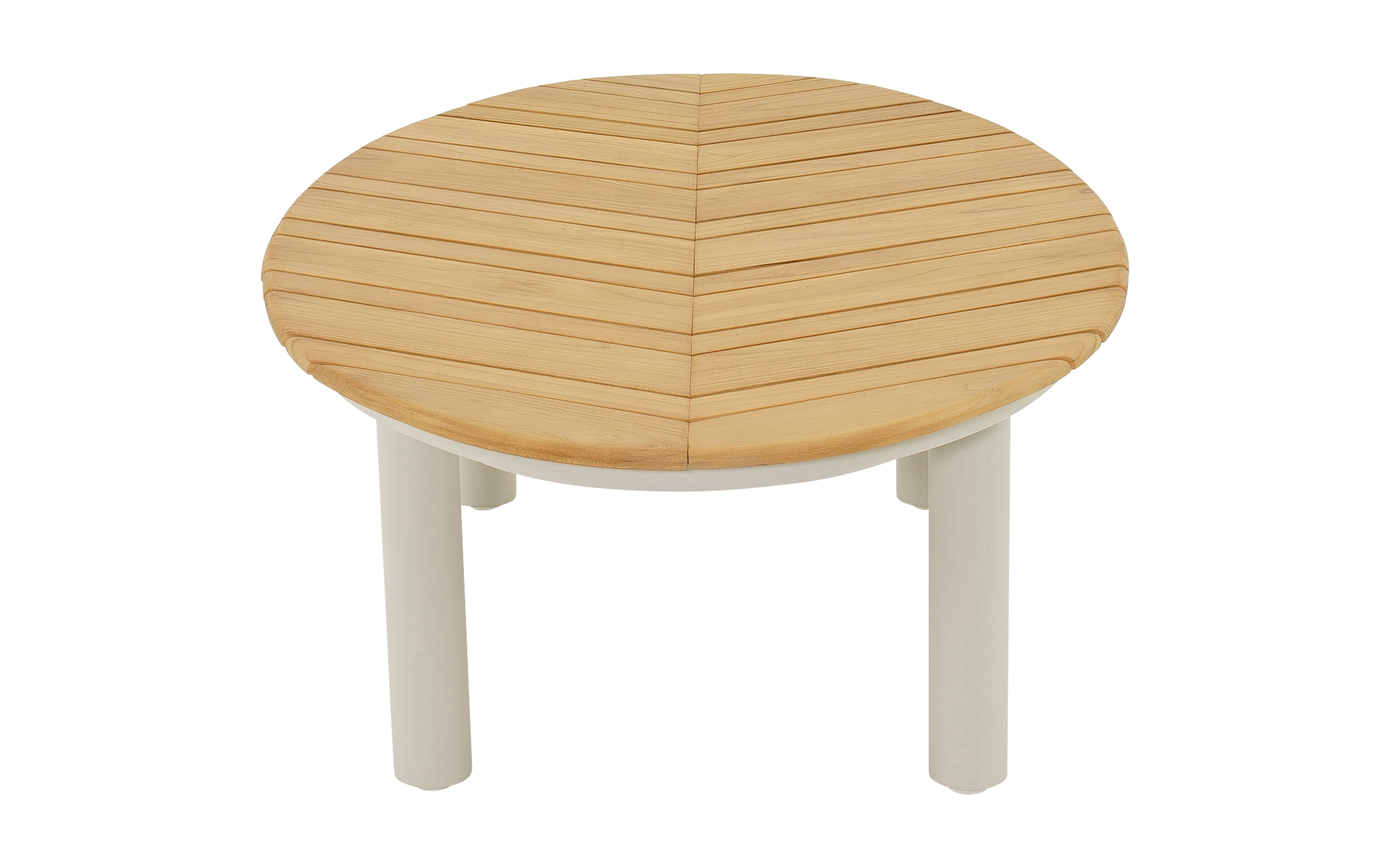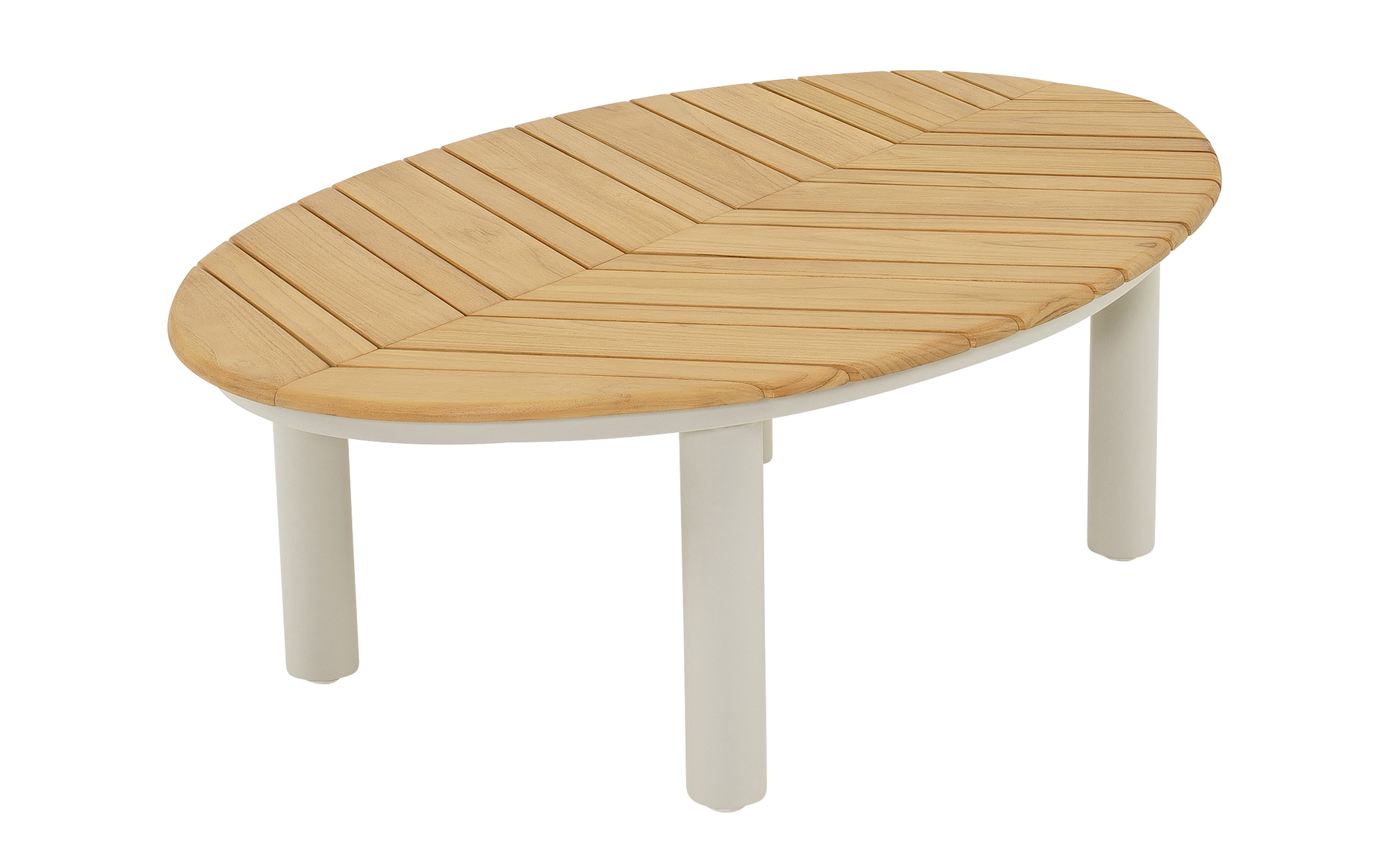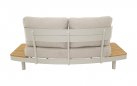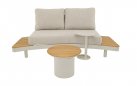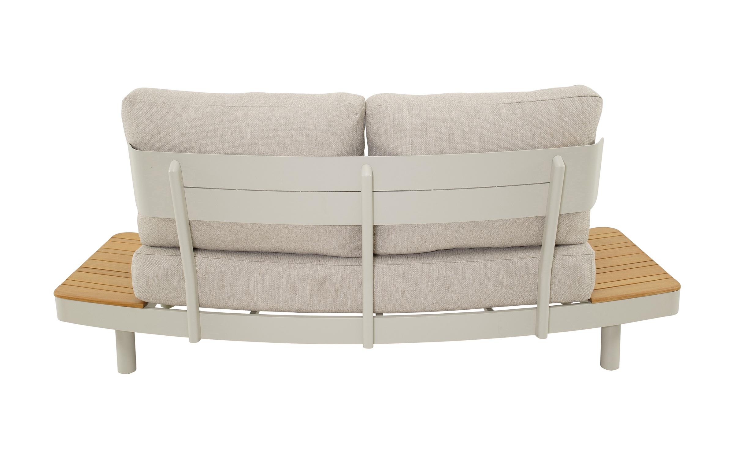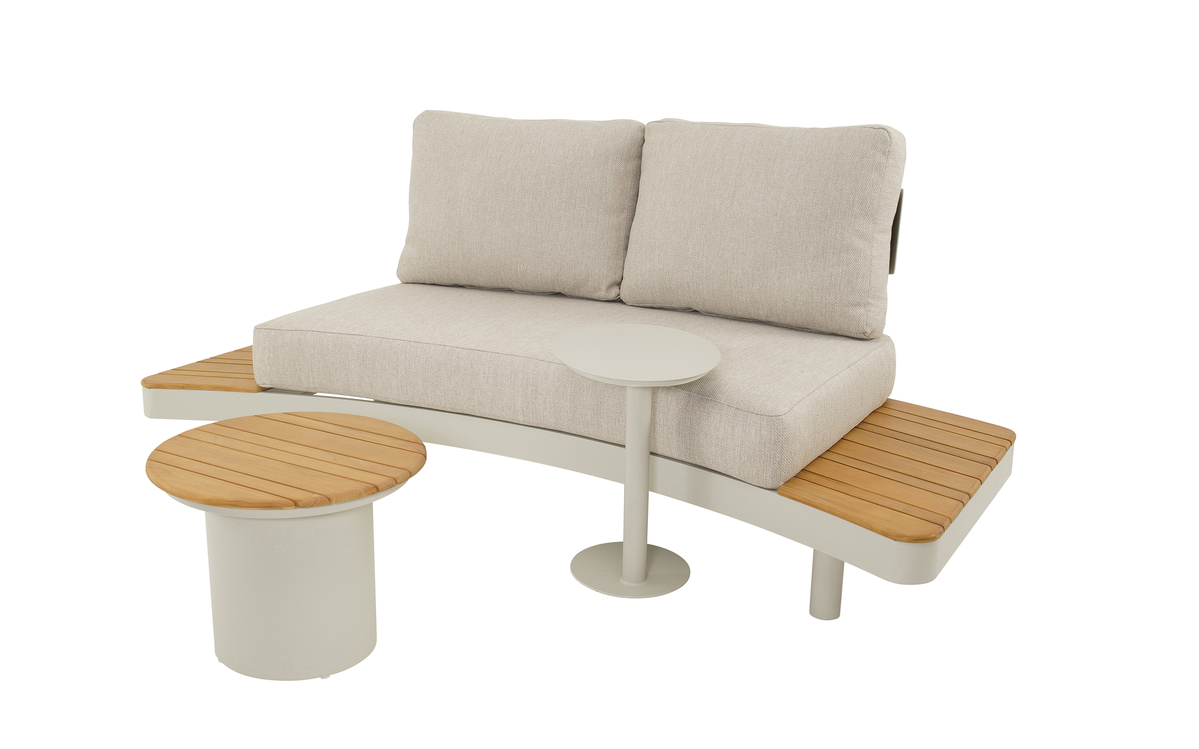 Poduszki wykonane są z tkaniny Olefin o gramaturze 370 g/m², odpornej na wilgoć, promieniowanie UV i zabrudzenia. Blaty stolików oraz boczne panele sof wykonano z naturalnego drewna teakowego, które nadaje całości ciepły, szlachetny wygląd. Układ modułowy pozwala na elastyczne dopasowanie zestawu do przestrzeni i potrzeb użytkownika.