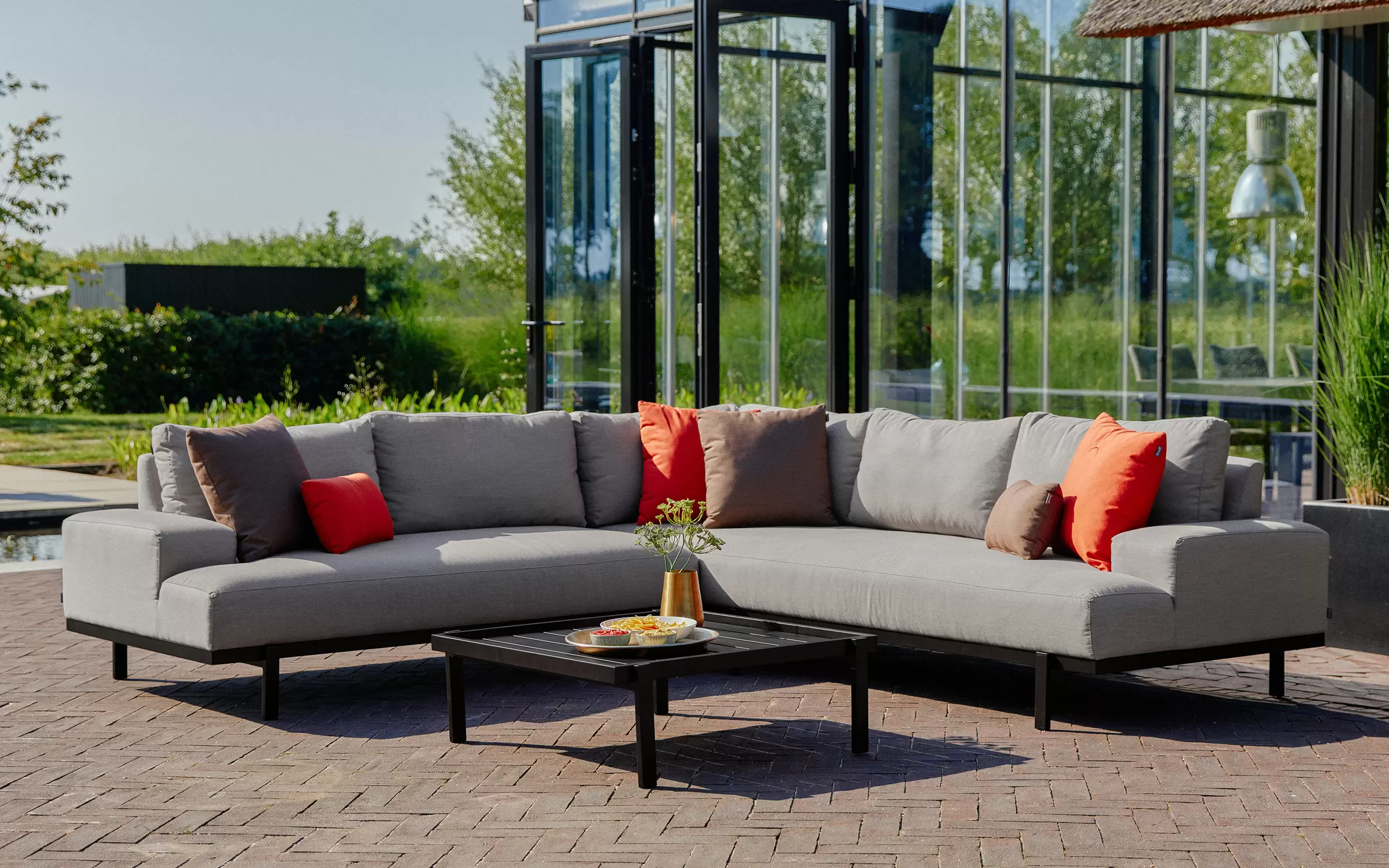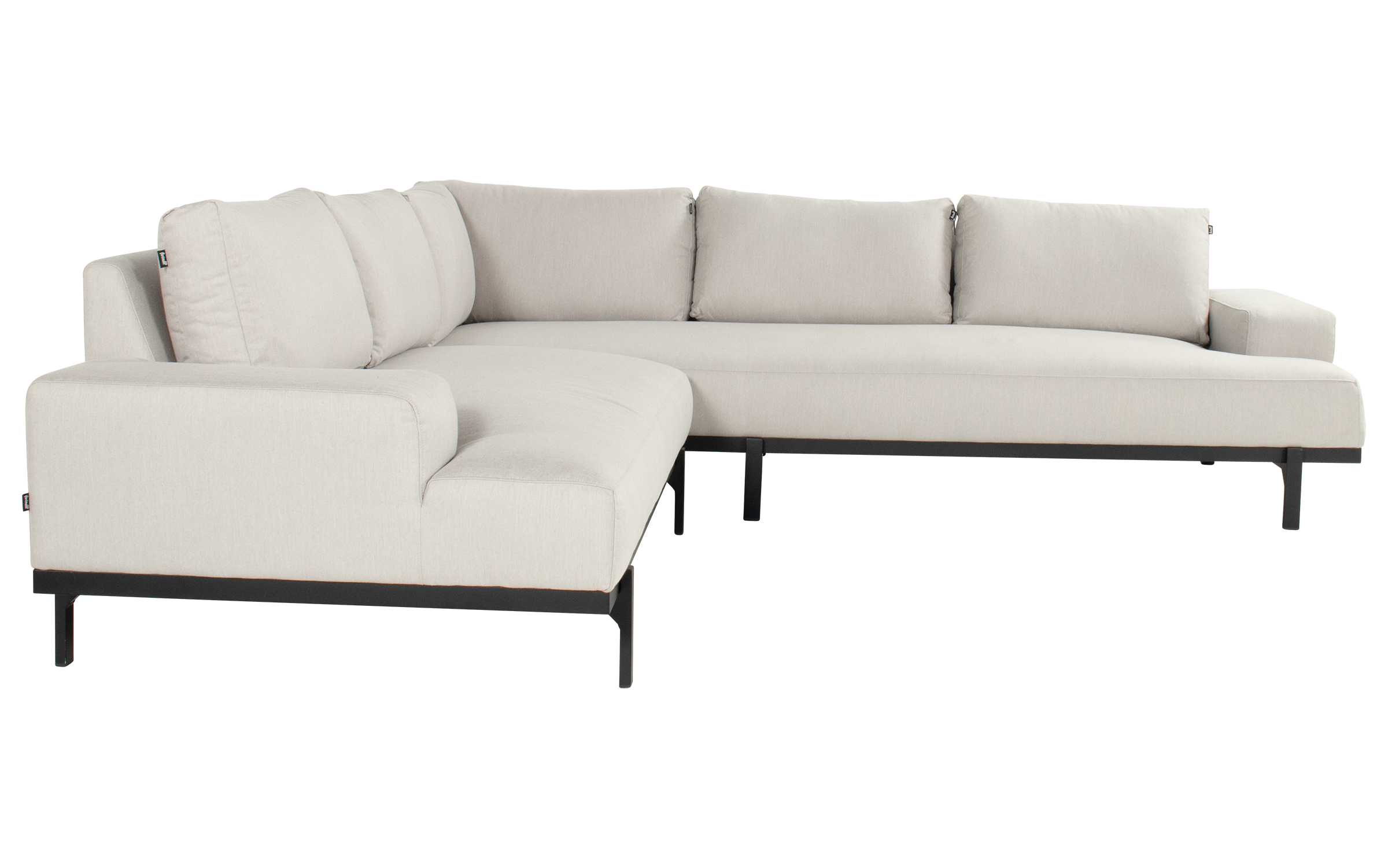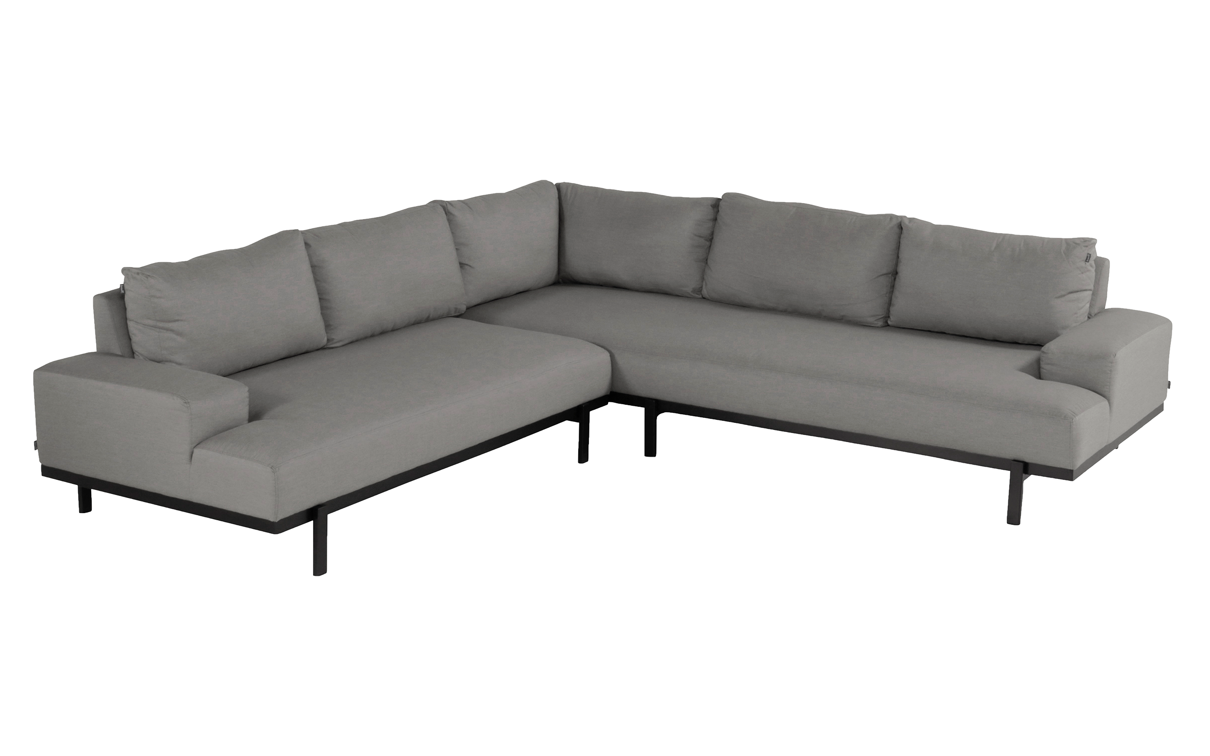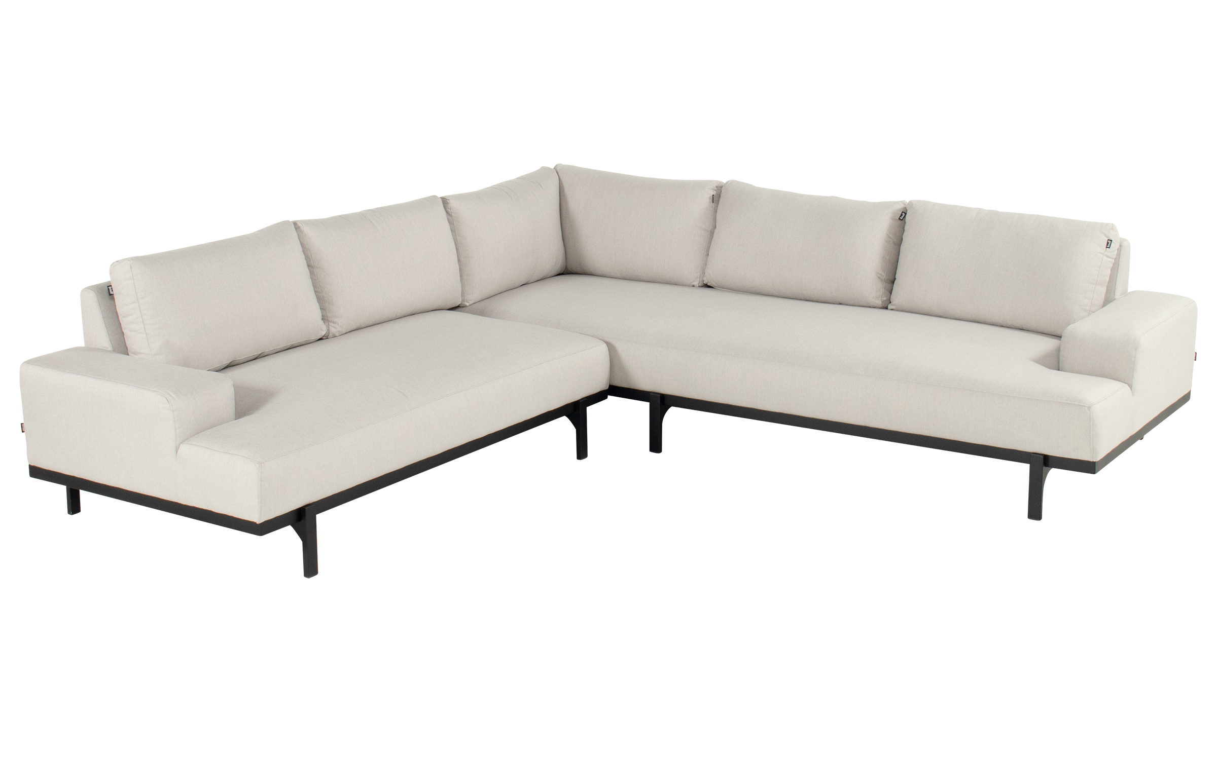 Narożnik posiada podstawę wykonaną z malowanego proszkowo aluminium oraz tapicerkę z wysokiej jakości materiału Sunbrella, w kilku kolorach do wyboru. Połączenie tych materiałów zapewnia narożnikowi wyjątkowy i nowoczesny wygląd, jednocześnie pozwalając na pozostawienie narożnika na zewnątrz przez cały rok,. Narożnik składa się z sofy 3-osobowej o wymiarach około 260 x 96 x 68 cm oraz sofy 2-osobowej z jednym podłokietnikiem o wymiarach około 166 x 96 x 68 cm. Meble można ustawiać pojedynczo lub łączyć, tworząc elegancki narożnik.