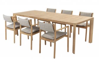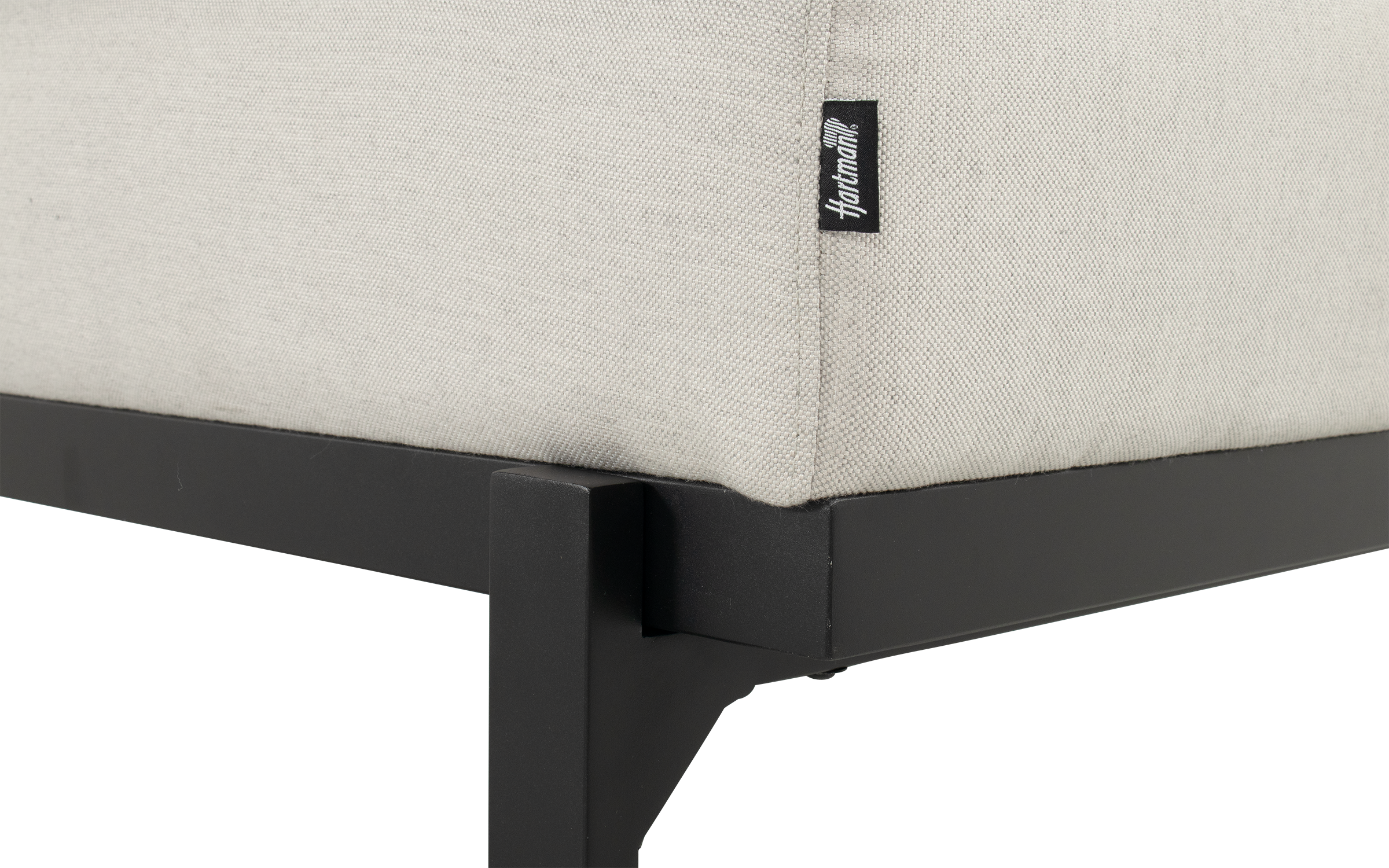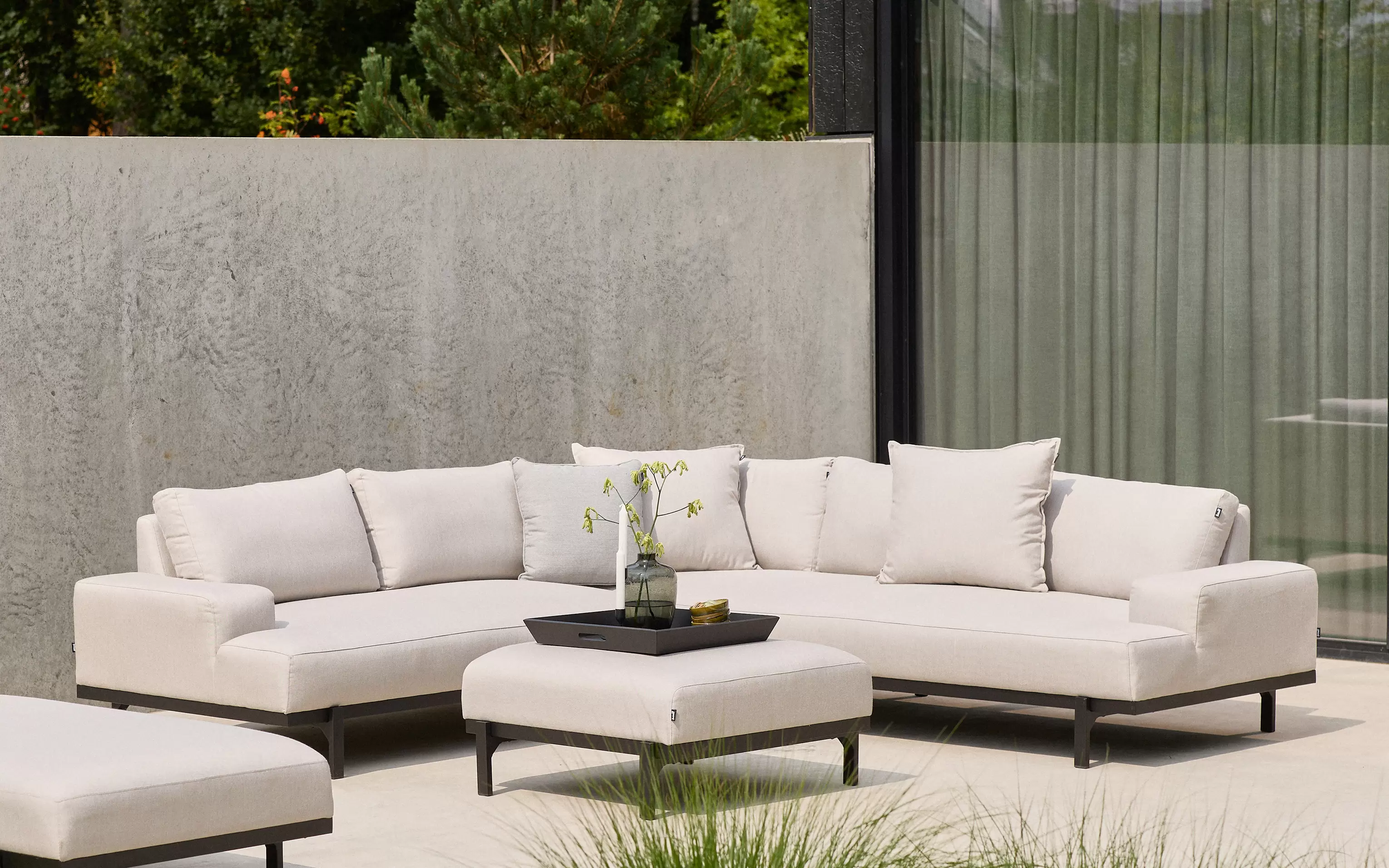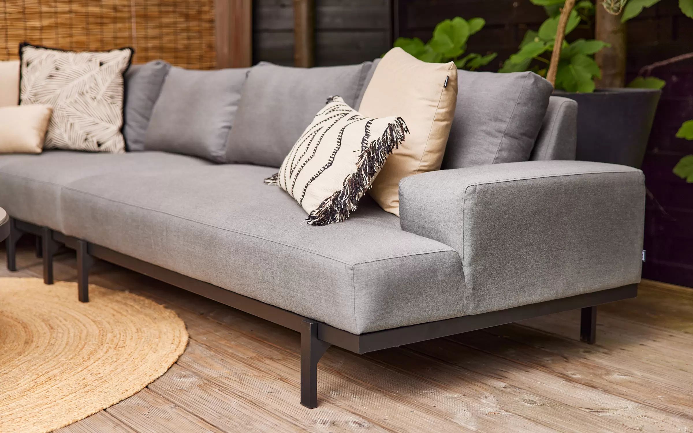 Narożnik posiada podstawę wykonaną z malowanego proszkowo aluminium oraz tapicerkę z wysokiej jakości materiału Sunbrella, w kilku kolorach do wyboru. Połączenie tych materiałów zapewnia narożnikowi wyjątkowy i nowoczesny wygląd, jednocześnie pozwalając na pozostawienie narożnika na zewnątrz przez cały rok,. Narożnik składa się z sofy 3-osobowej o wymiarach około 260 x 96 x 68 cm oraz sofy 2-osobowej z jednym podłokietnikiem o wymiarach około 166 x 96 x 68 cm. Meble można ustawiać pojedynczo lub łączyć, tworząc elegancki narożnik.