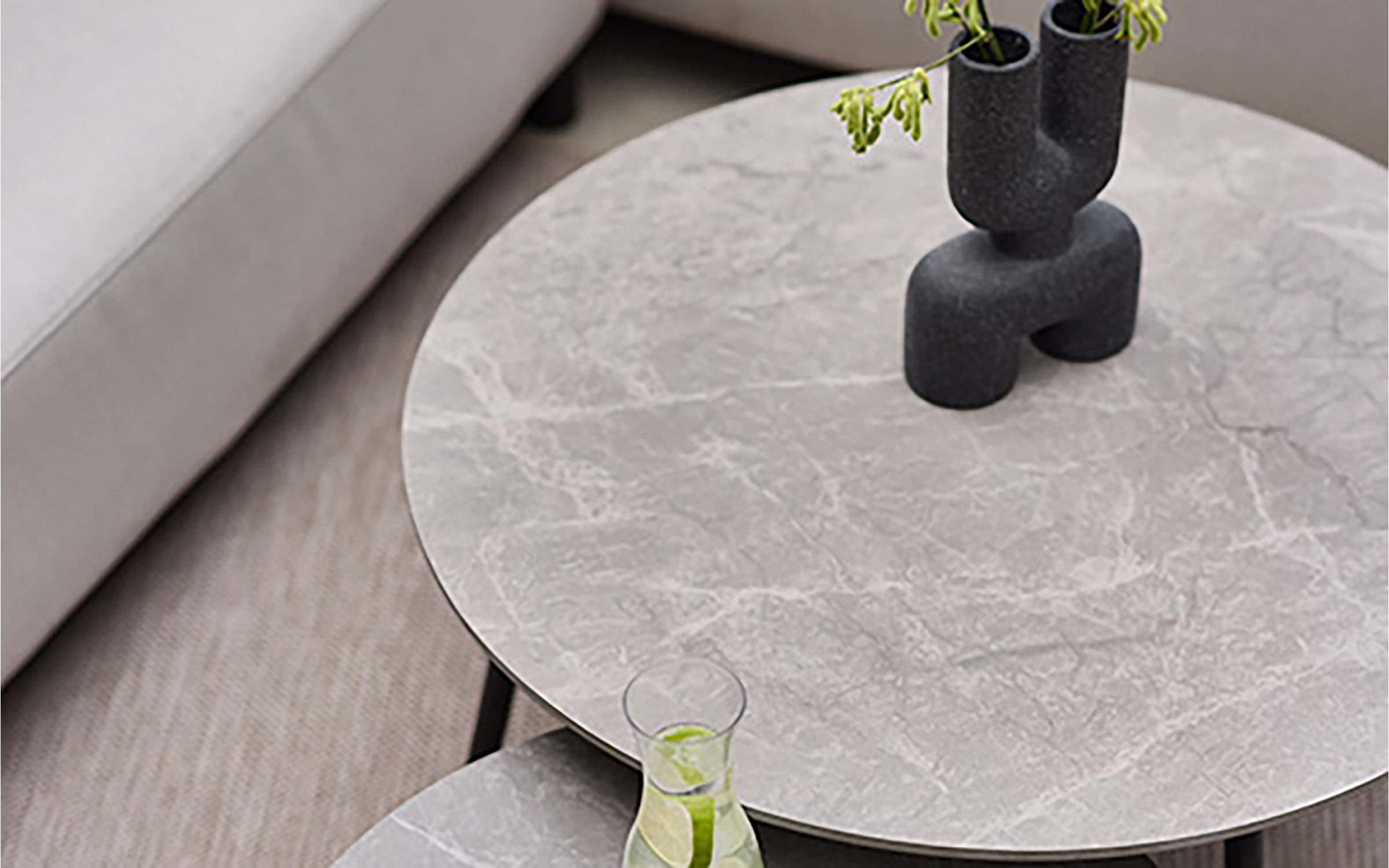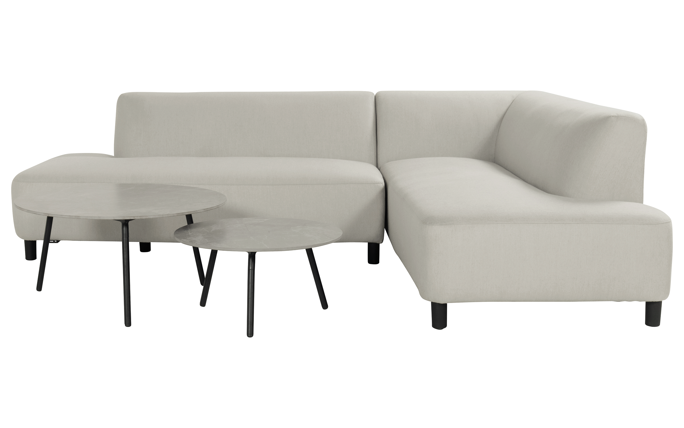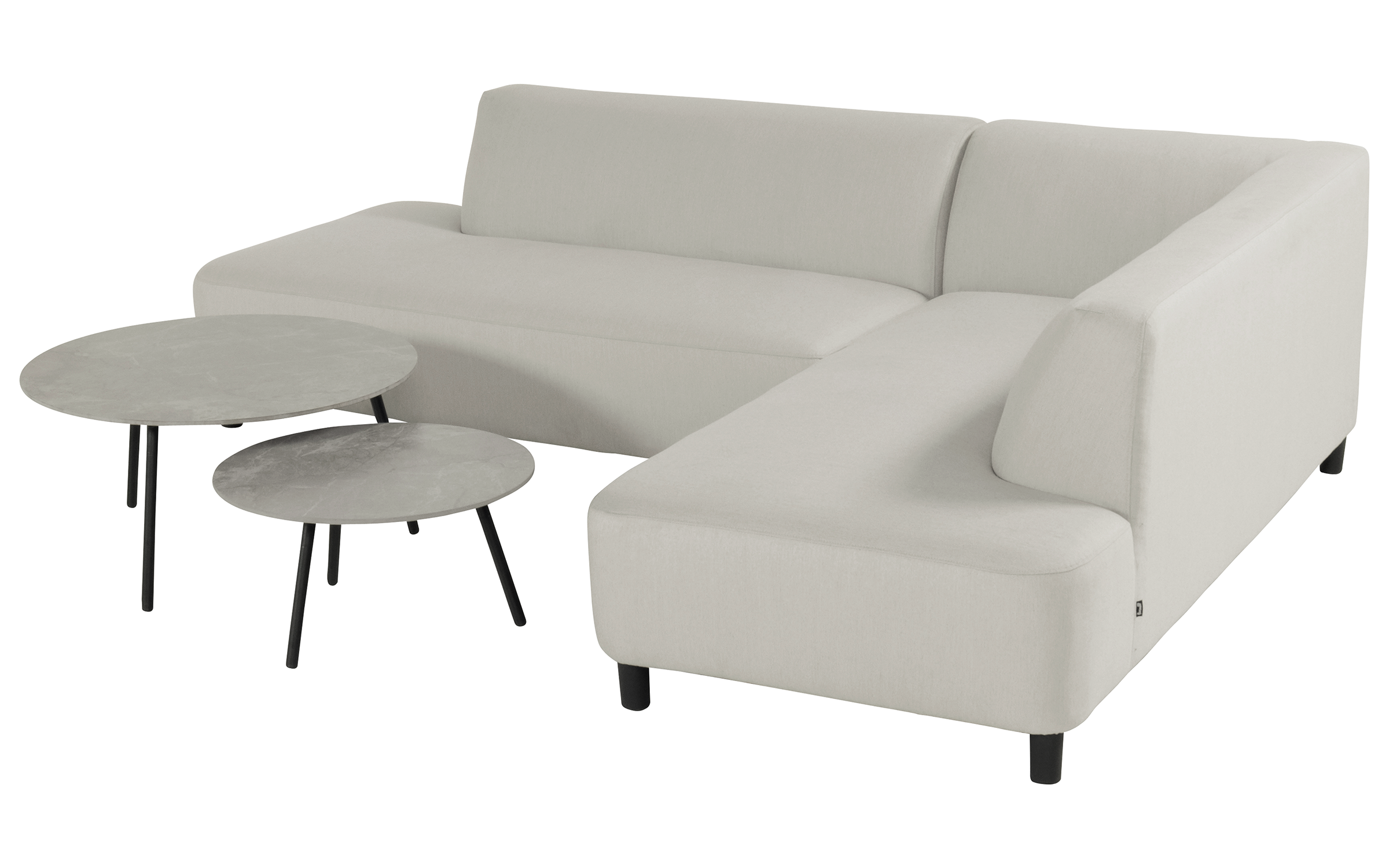 Opcjonalne stoliki na aluminiowych nogach z ceramicznymi blatami można nabyć osobno. Zalety podgrzewanej narożnej sofy Hartman Monaco Sunbrella (Sit & Heat)