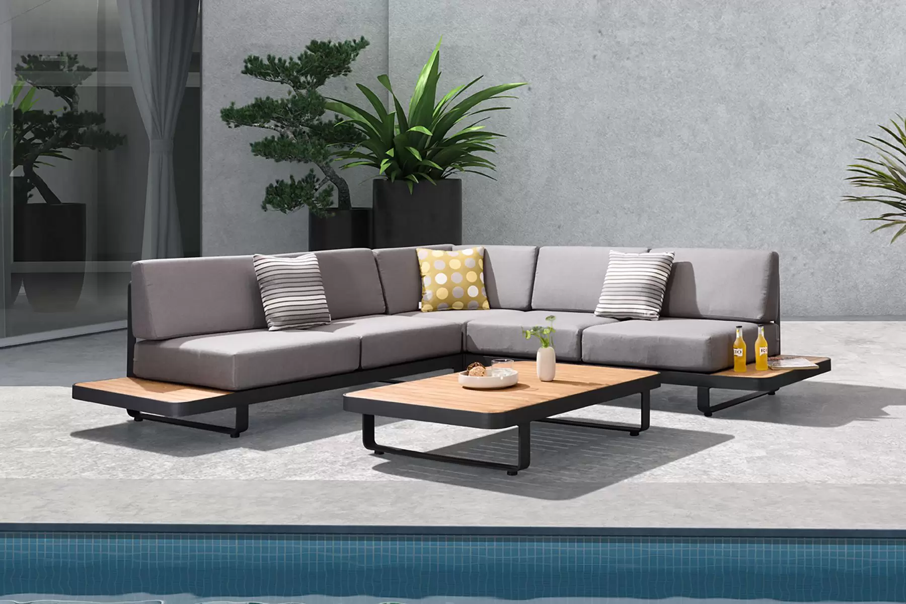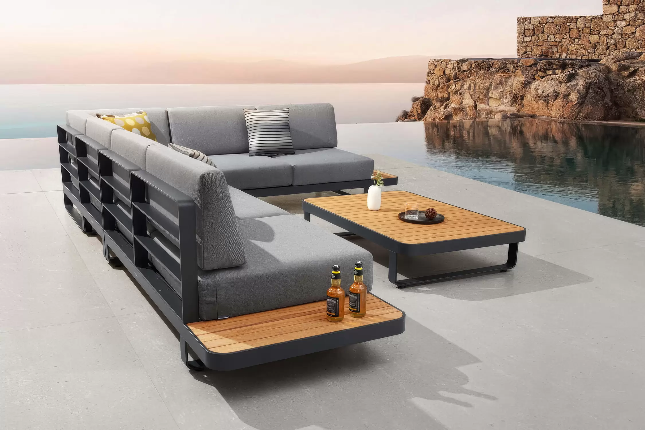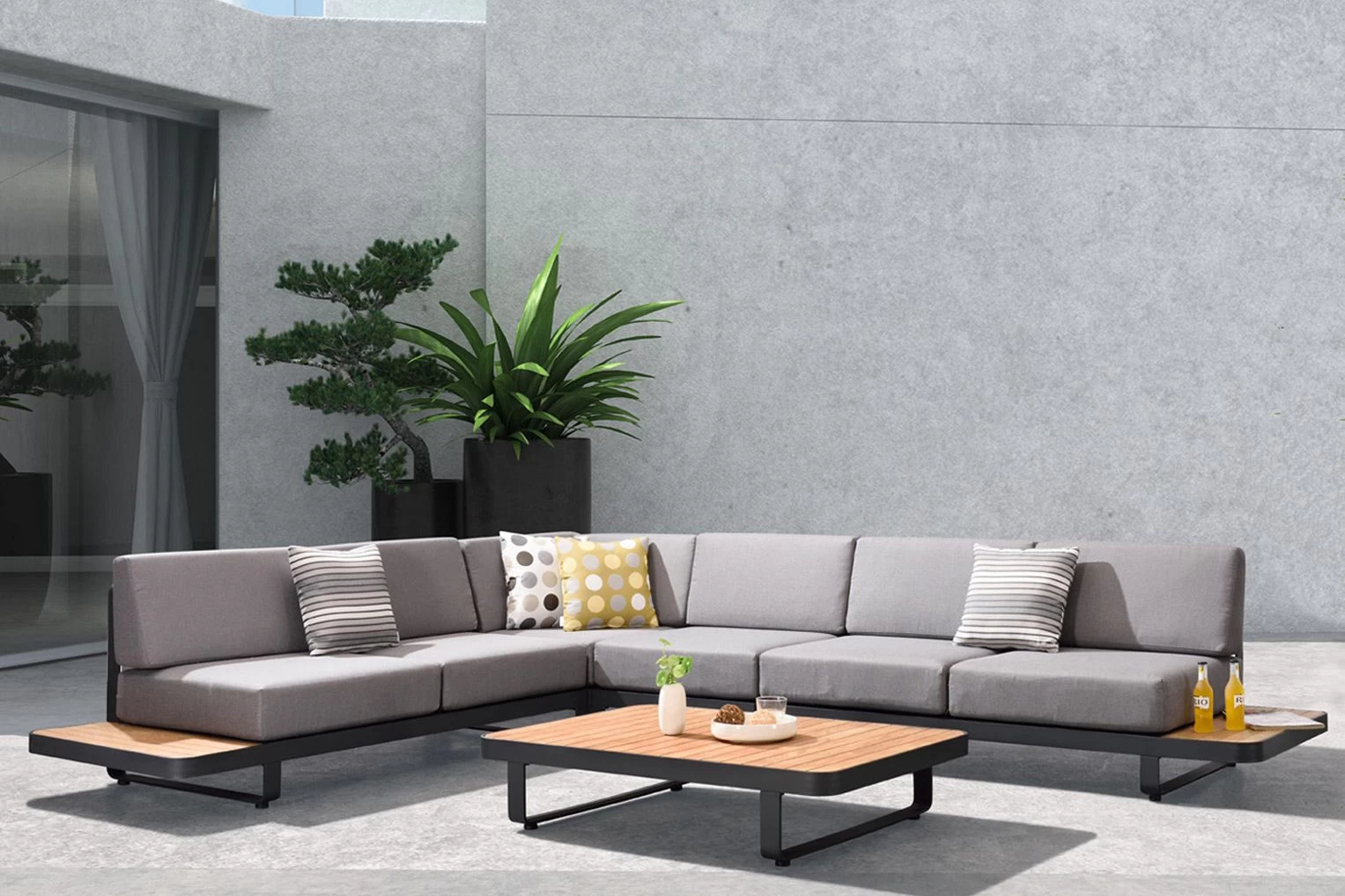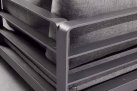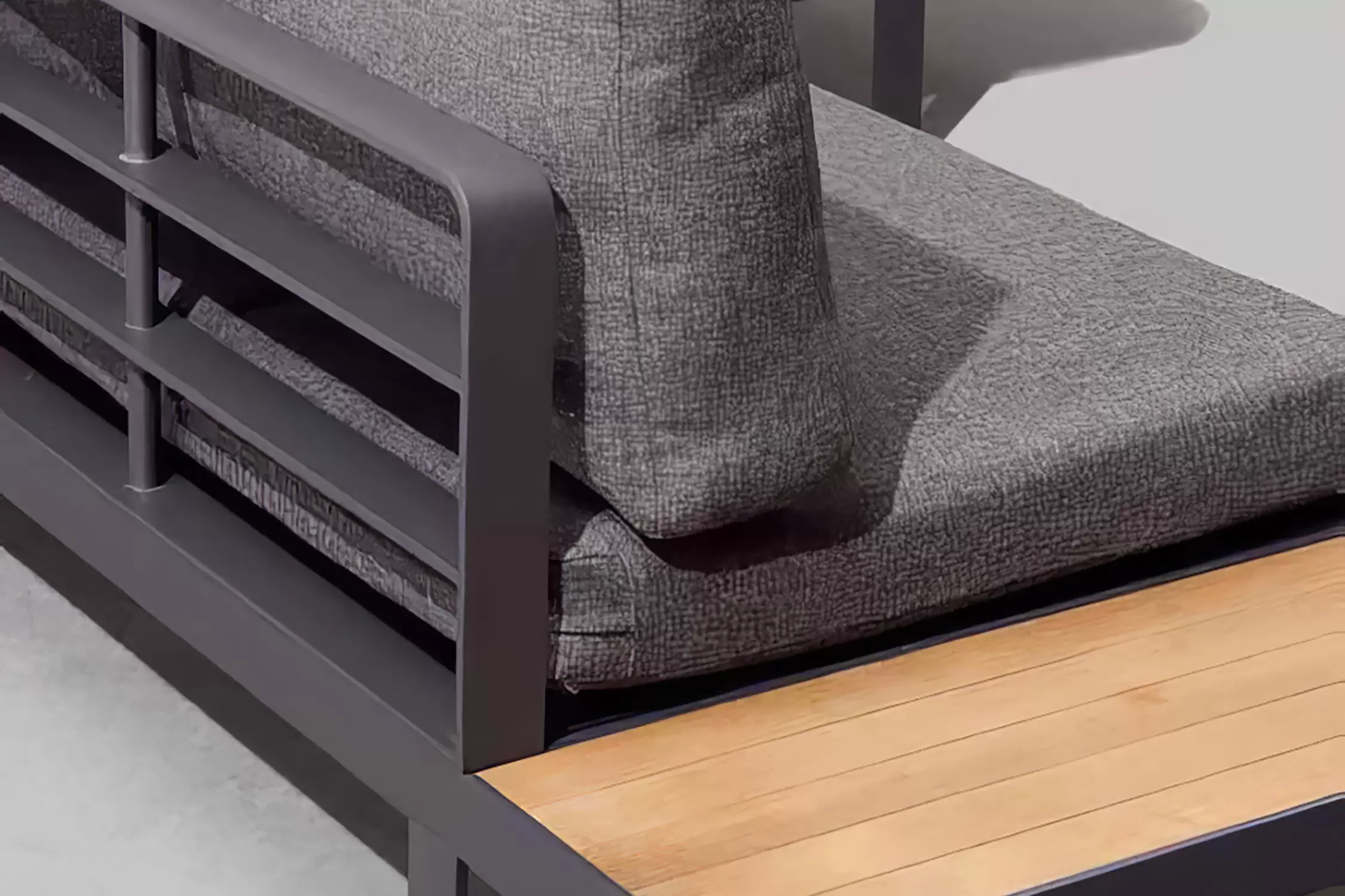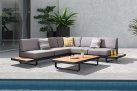 Aluminiowy modułowy narożnik ogrodowy na taras firmy HIGOLD w nowoczesnym stylu. Konstrukcja opiera się na spawanej ramie aluminiowej malowanej proszkowo, elementach dekoracyjnych z teaku i wygodnych poduszek z obiciami z materiału Olefin. Poduszki położone na opinającej siedzisko tekstylinie.