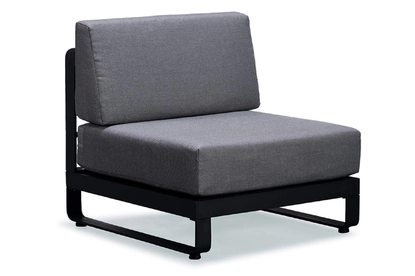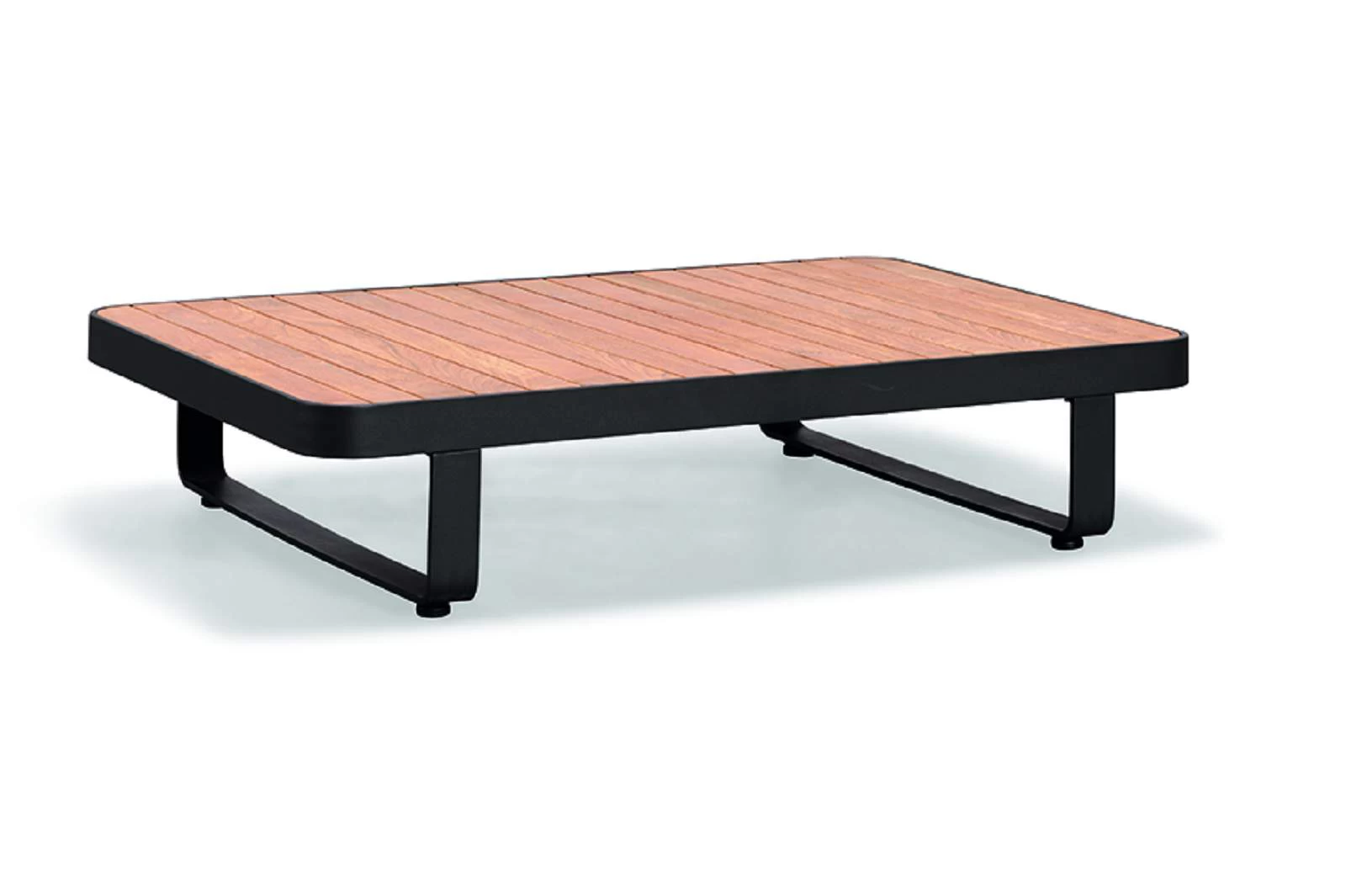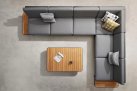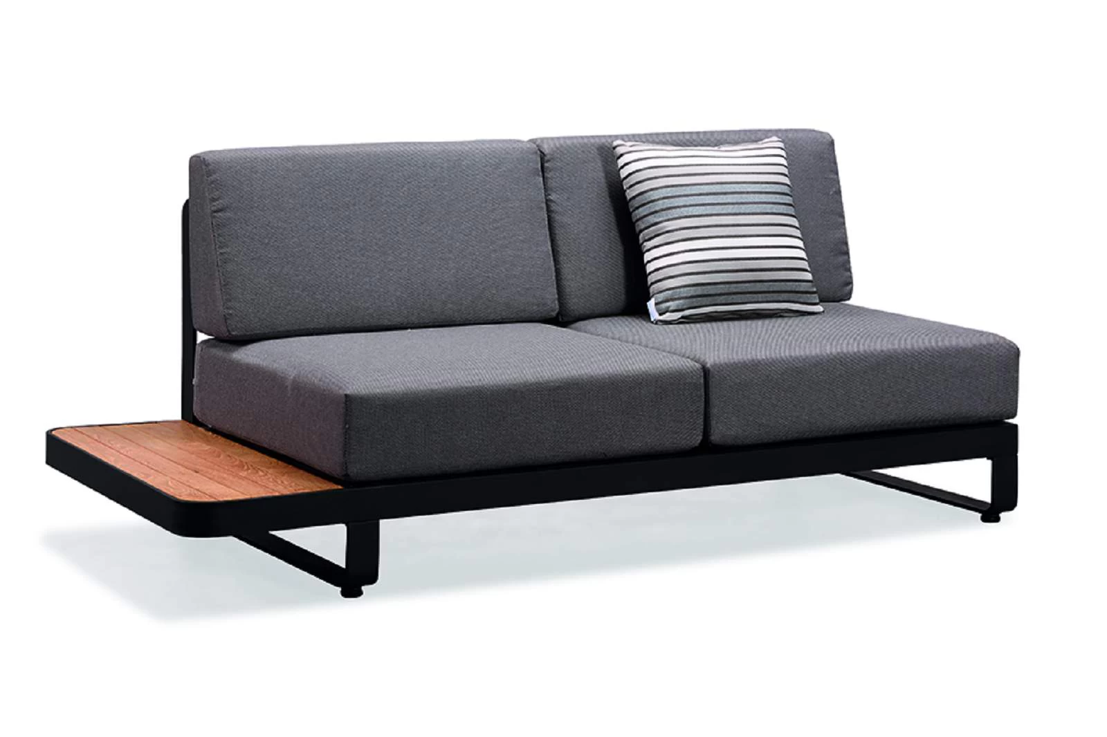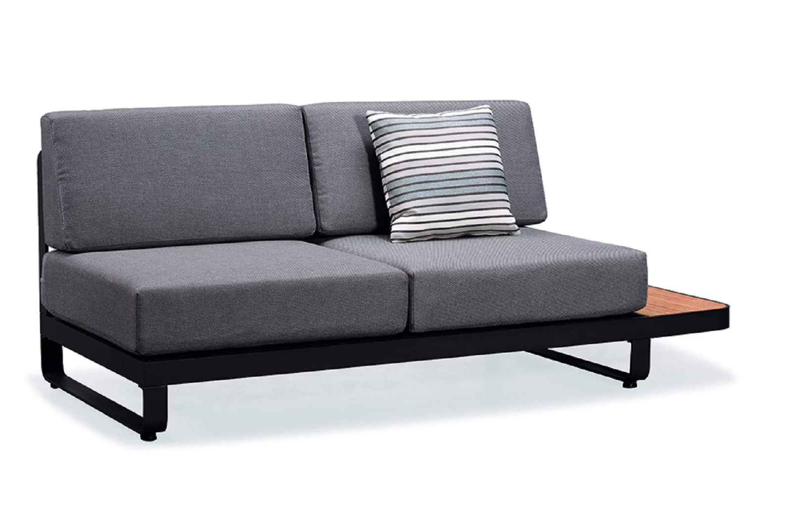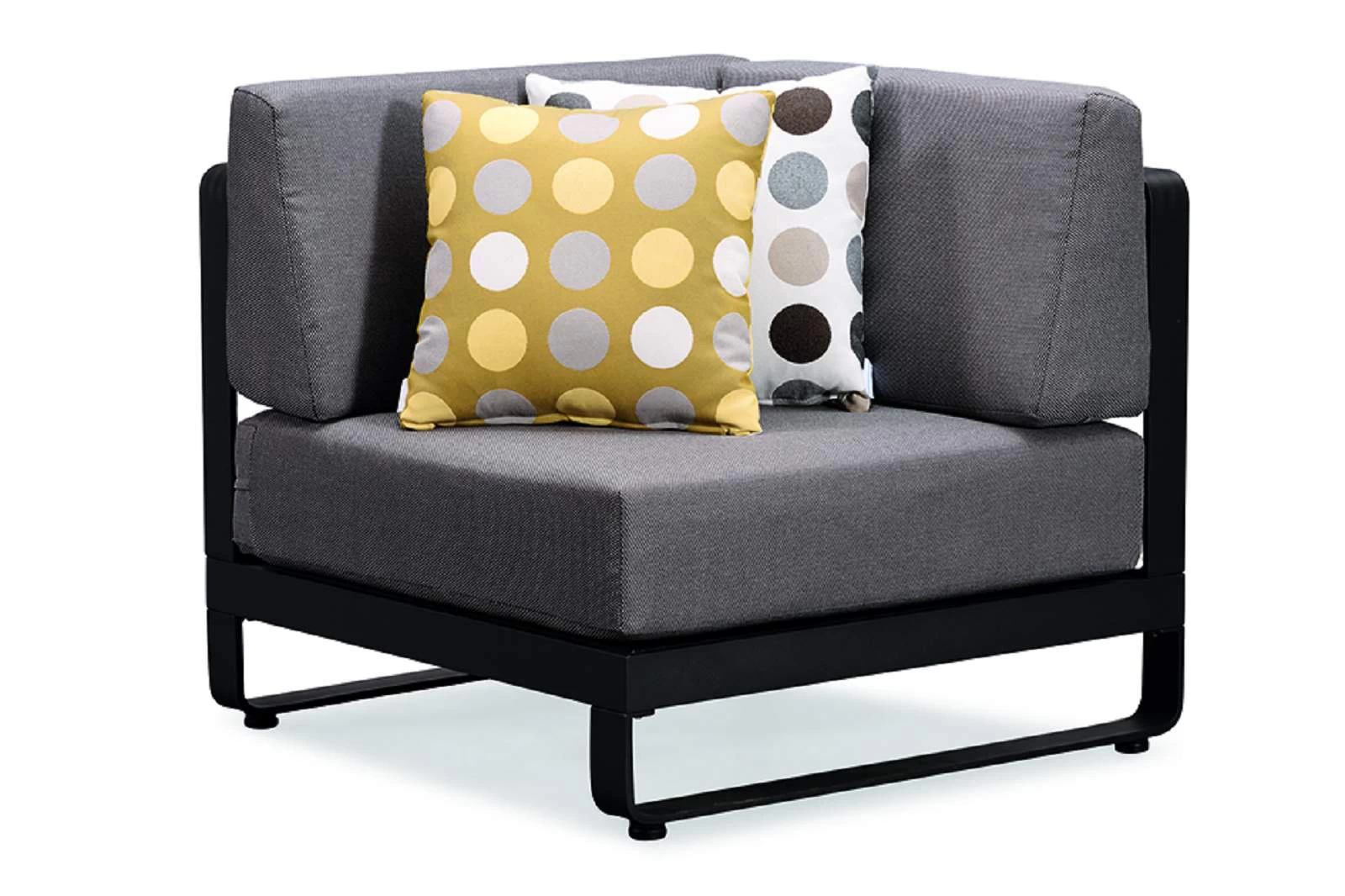 Aluminiowy modułowy narożnik ogrodowy na taras firmy HIGOLD w nowoczesnym stylu. Konstrukcja opiera się na spawanej ramie aluminiowej malowanej proszkowo, elementach dekoracyjnych z teaku i wygodnych poduszek z obiciami z materiału Olefin. Poduszki położone na opinającej siedzisko tekstylinie.