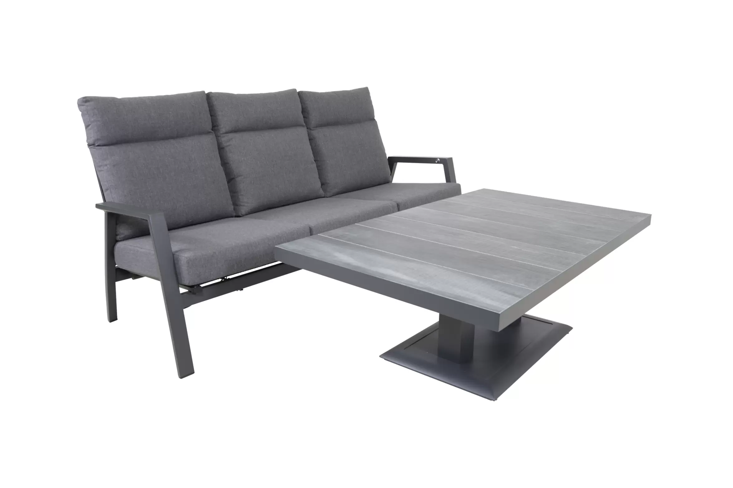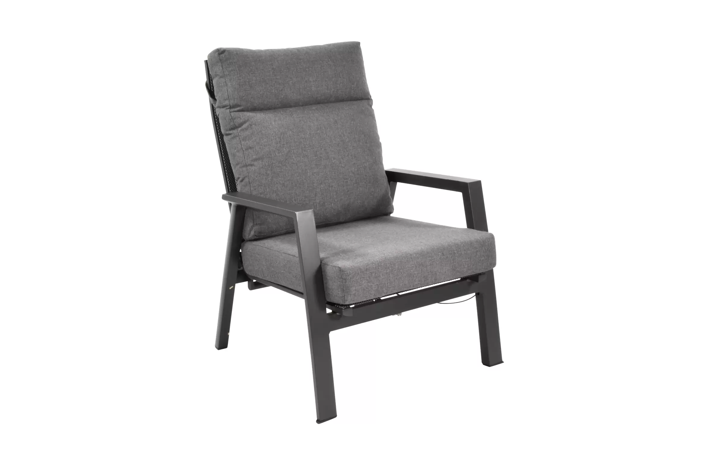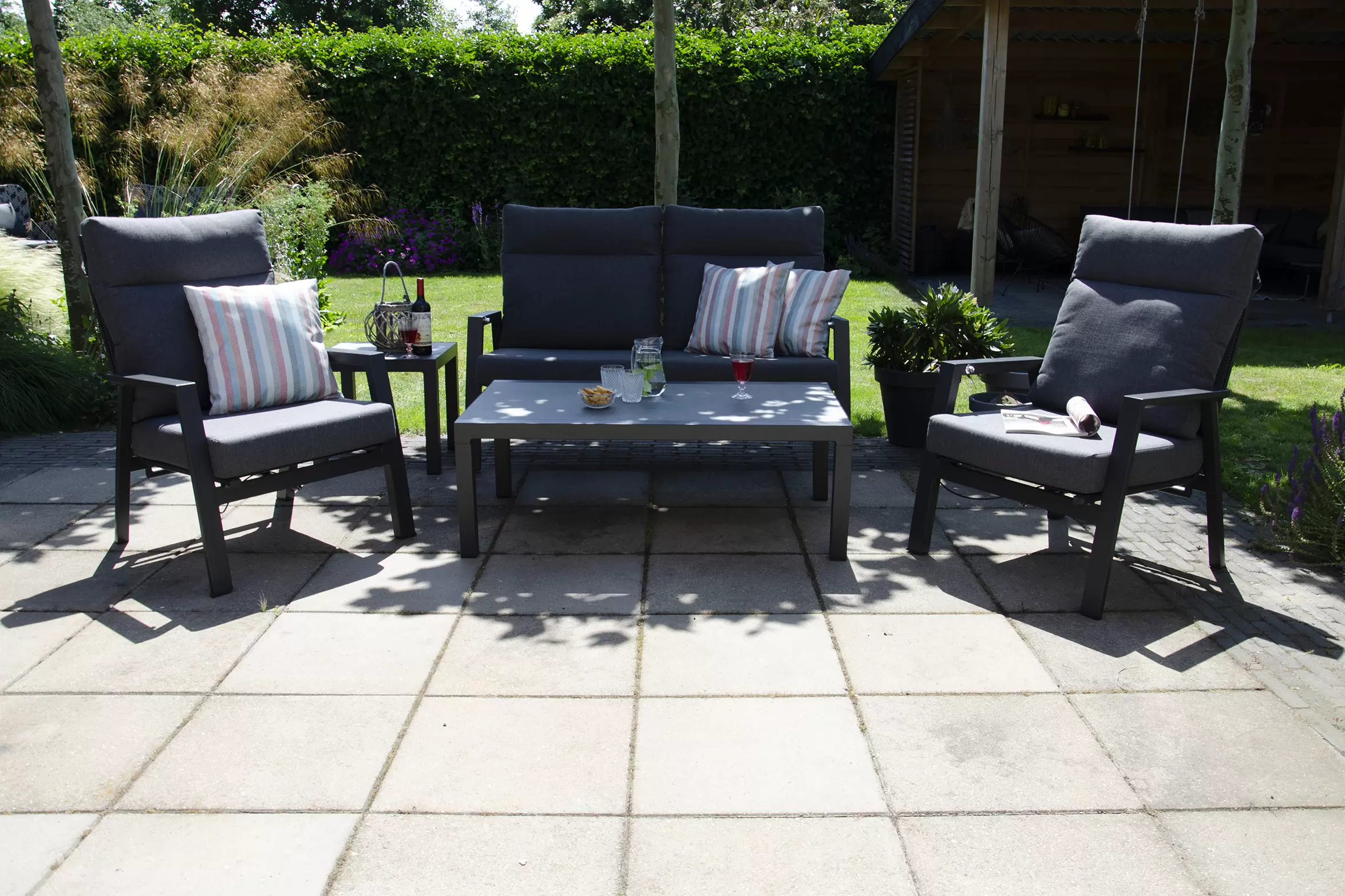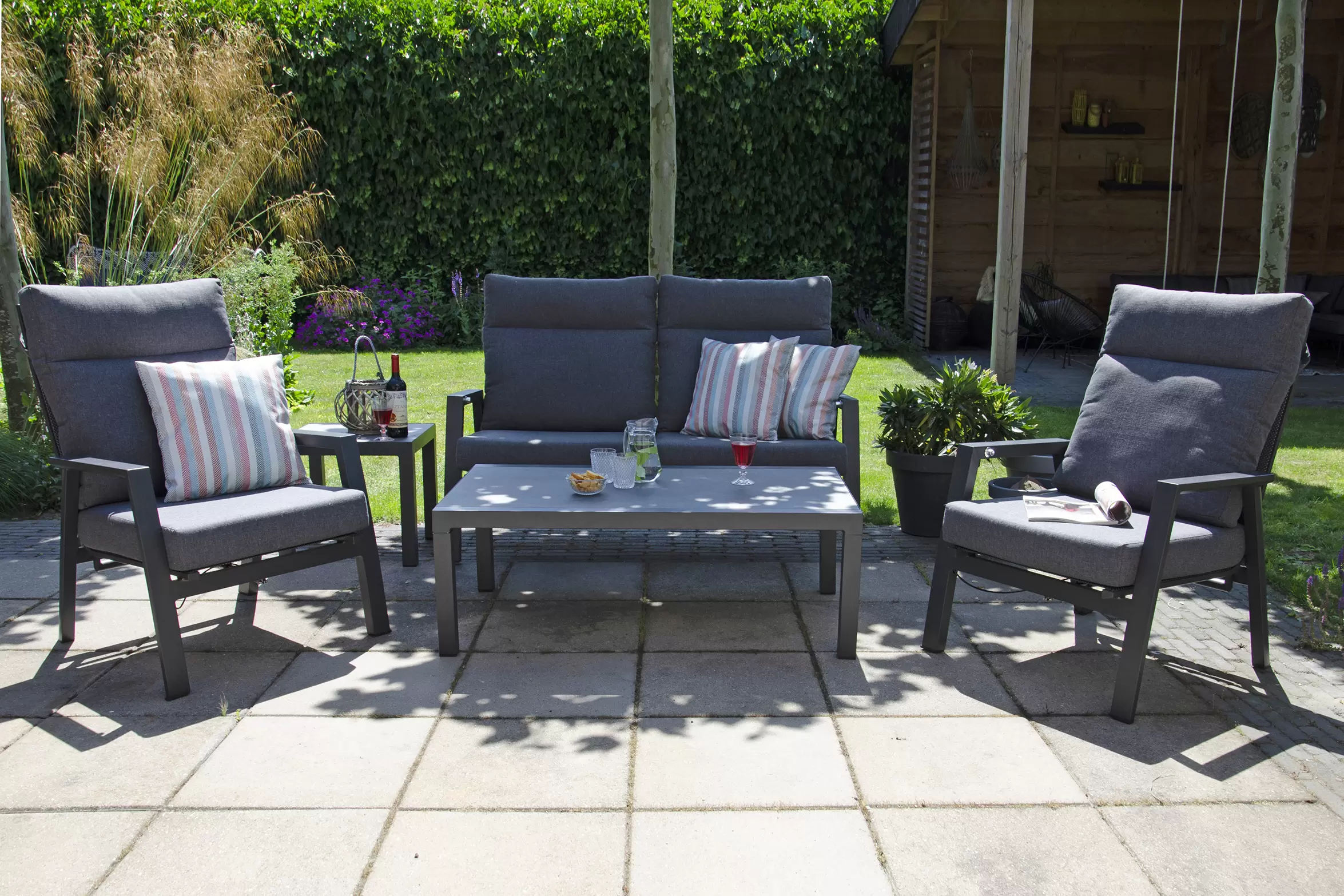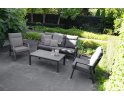 Kolekcja modułowych mebli ogrodowych wypoczynkowych aluminiowych w kolorze ciemnoszarym z wysokimi i pochylanymi(!) oparciami.