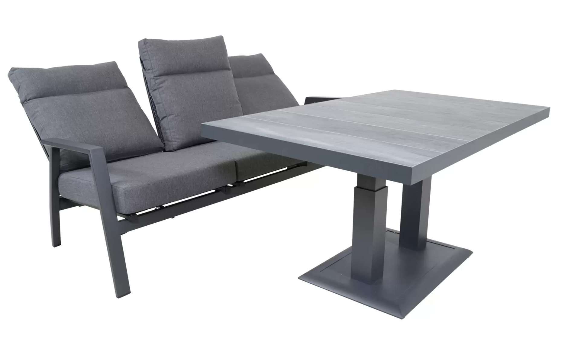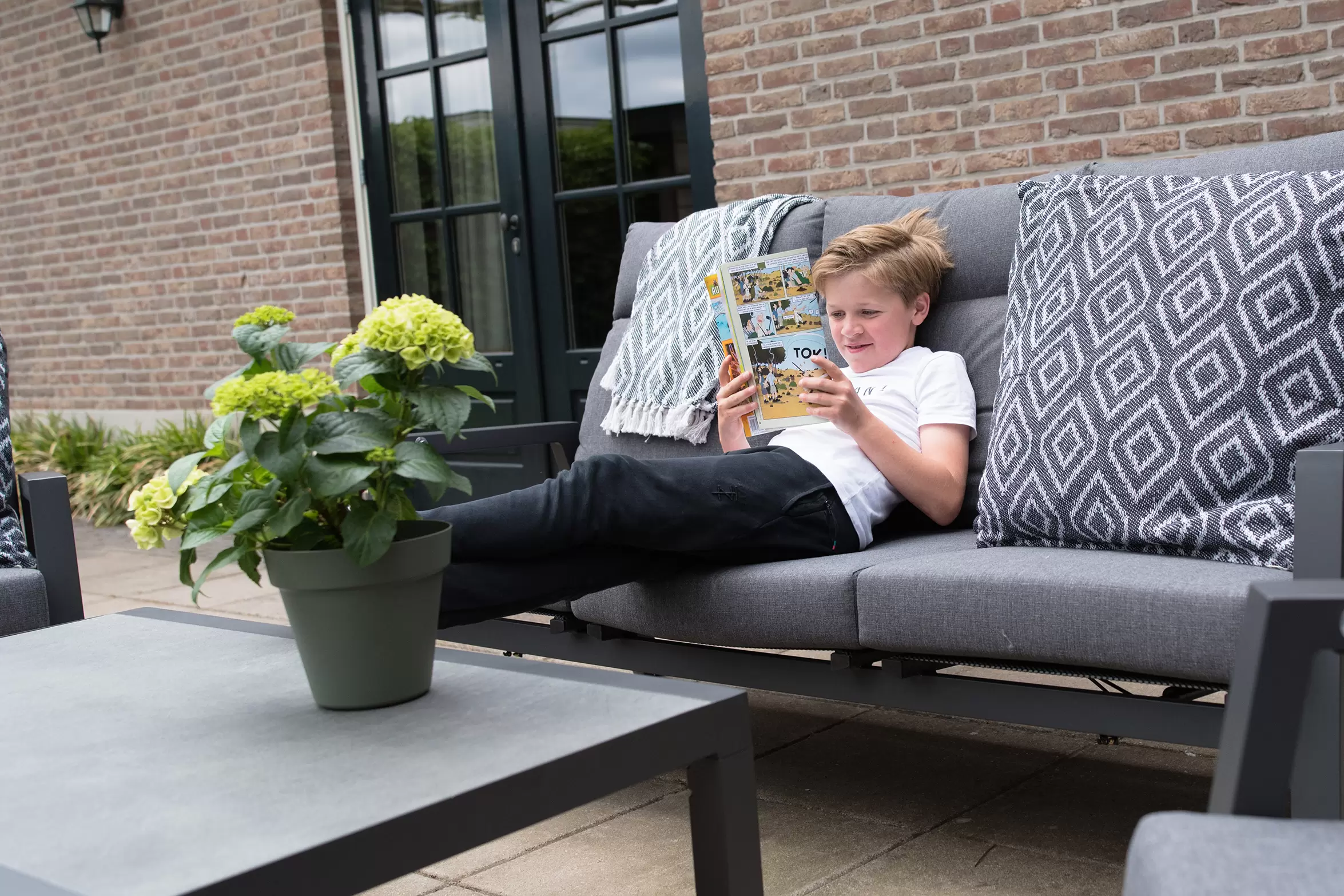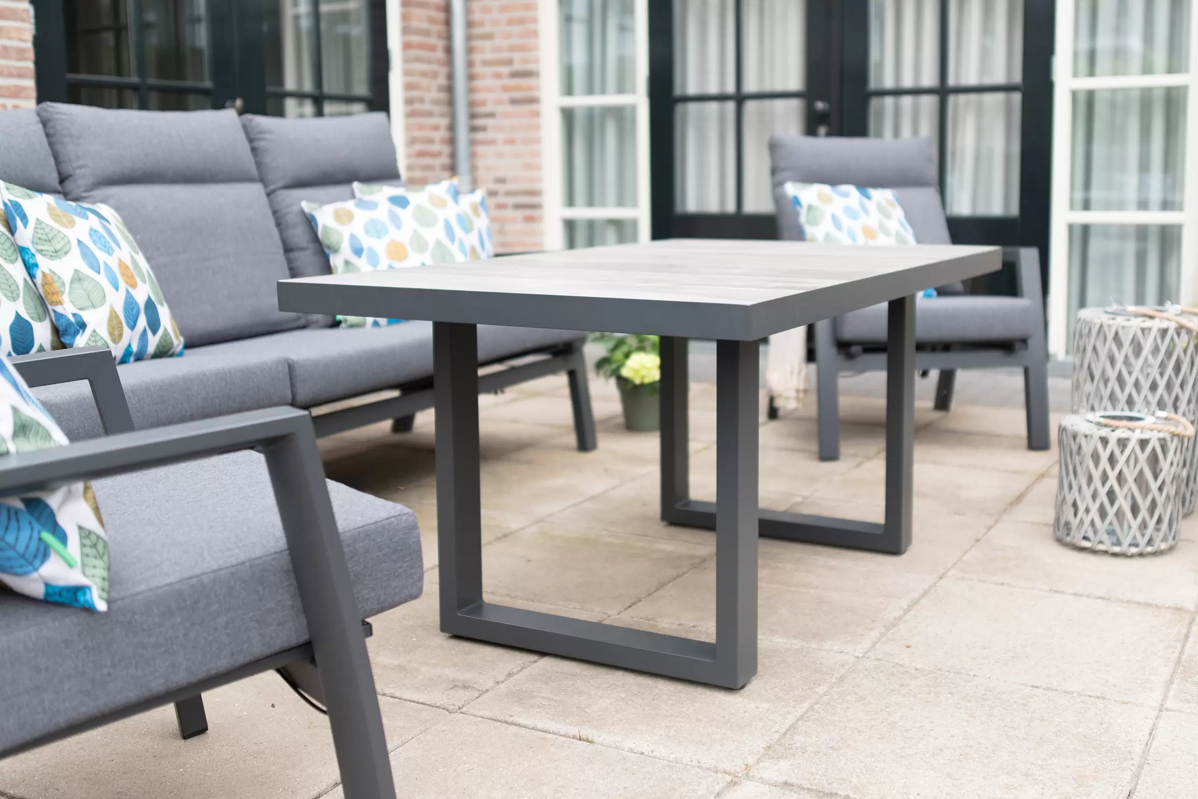 Kolekcja modułowych mebli ogrodowych wypoczynkowych aluminiowych w kolorze ciemnoszarym z wysokimi i pochylanymi(!) oparciami.