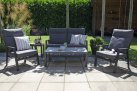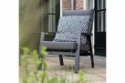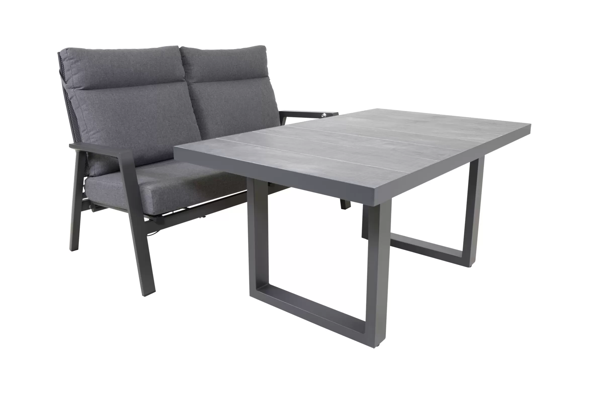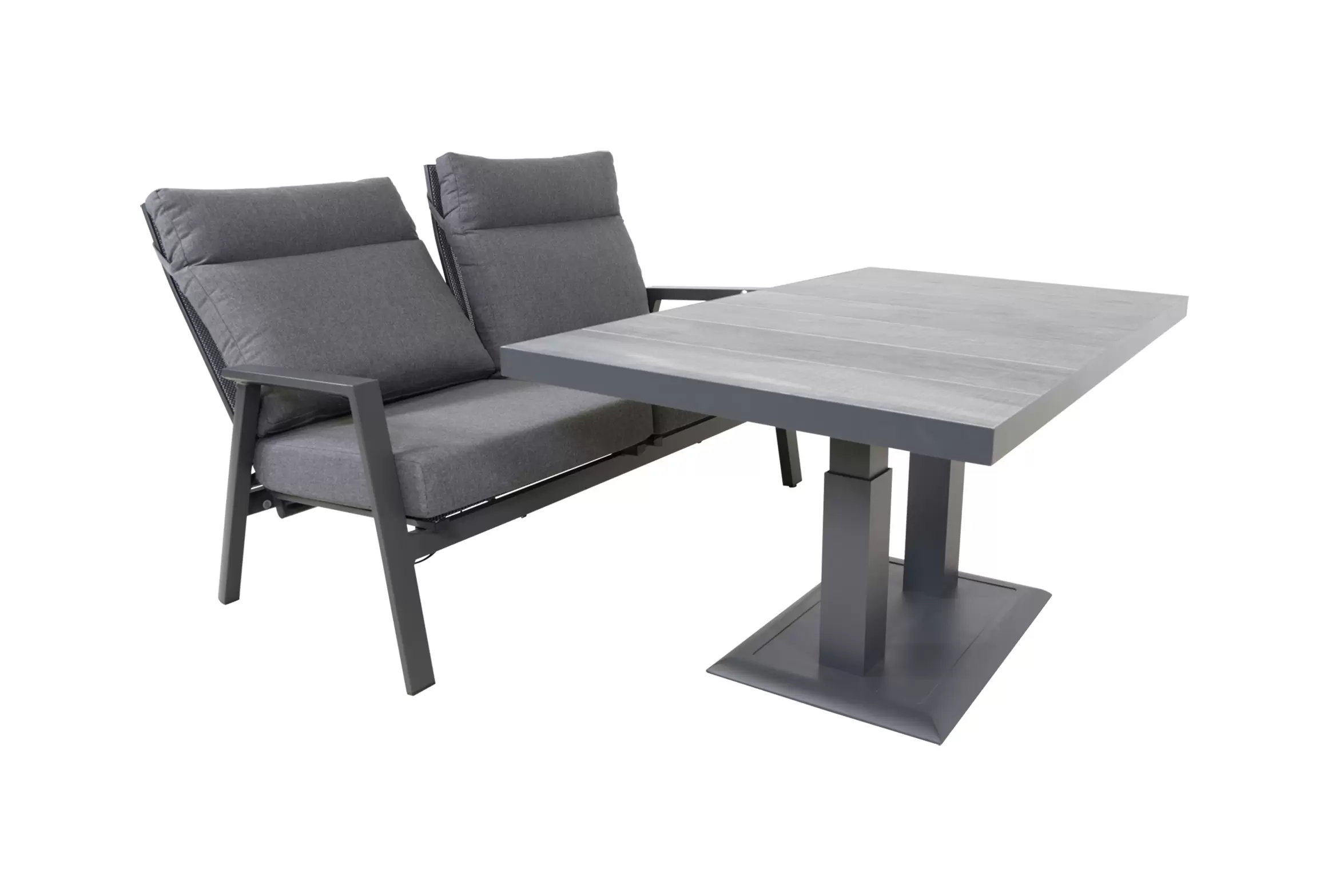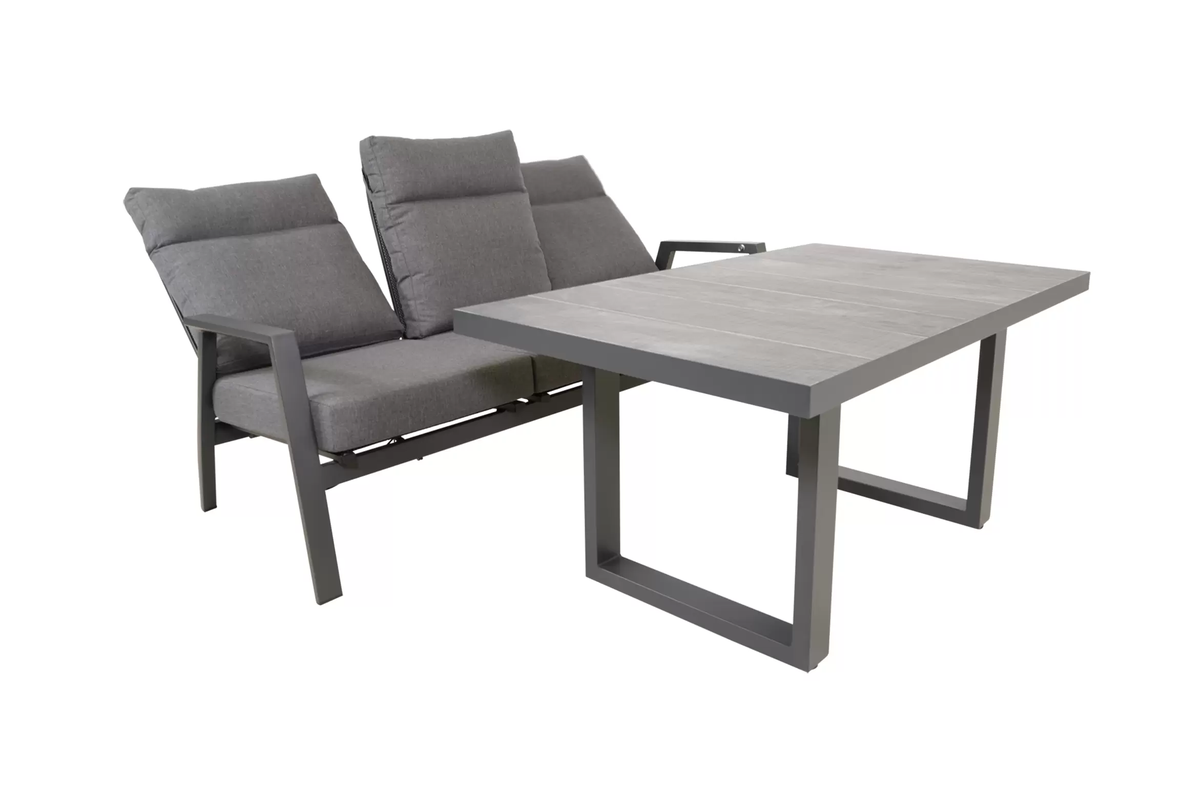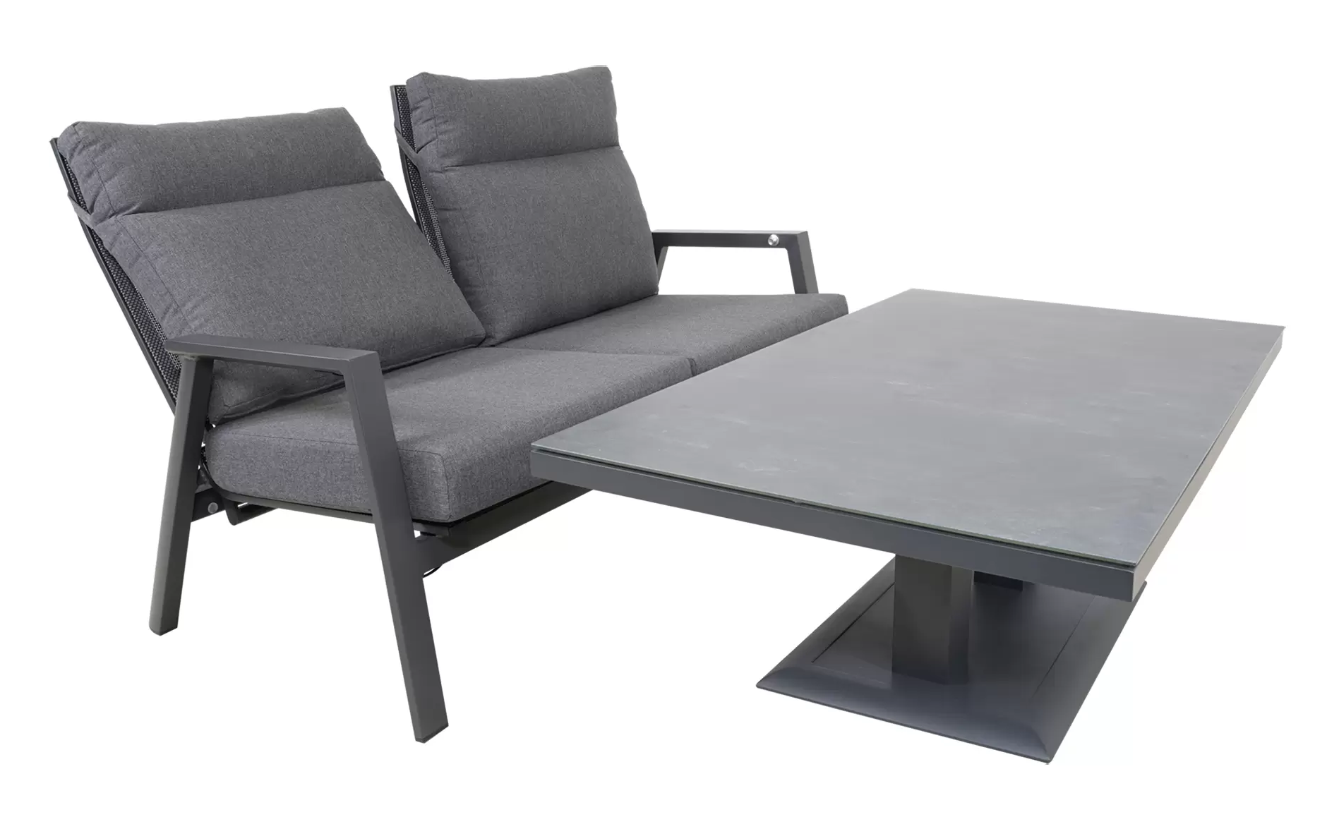 Kolekcja modułowych mebli ogrodowych wypoczynkowych aluminiowych w kolorze ciemnoszarym z wysokimi i pochylanymi(!) oparciami.